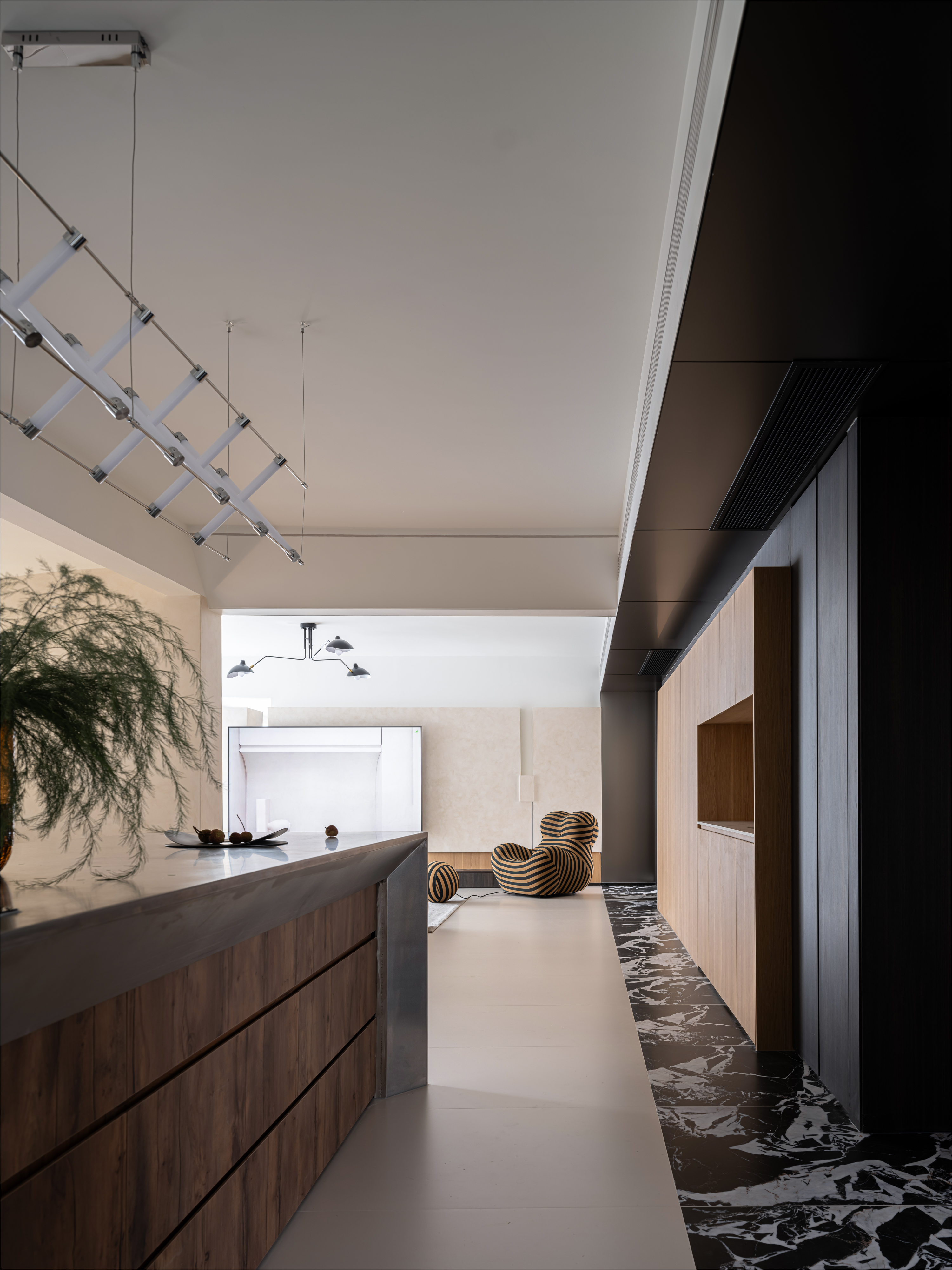 空间布局:在前一个设计师的方案基础上调整了主卧的格局,增加了衣帽间和一个较大的开放式书房,优化了上一位设计师遗留的施工难题,相对应的调整了各个空间的比例。从立面入手调整了整体的设计手法。加强了图底关系,运用一些反差较大的材质或者颜色去强化整体的空间感受,通过不同的家具摆放方式,增加了客户家人之间的互动性。