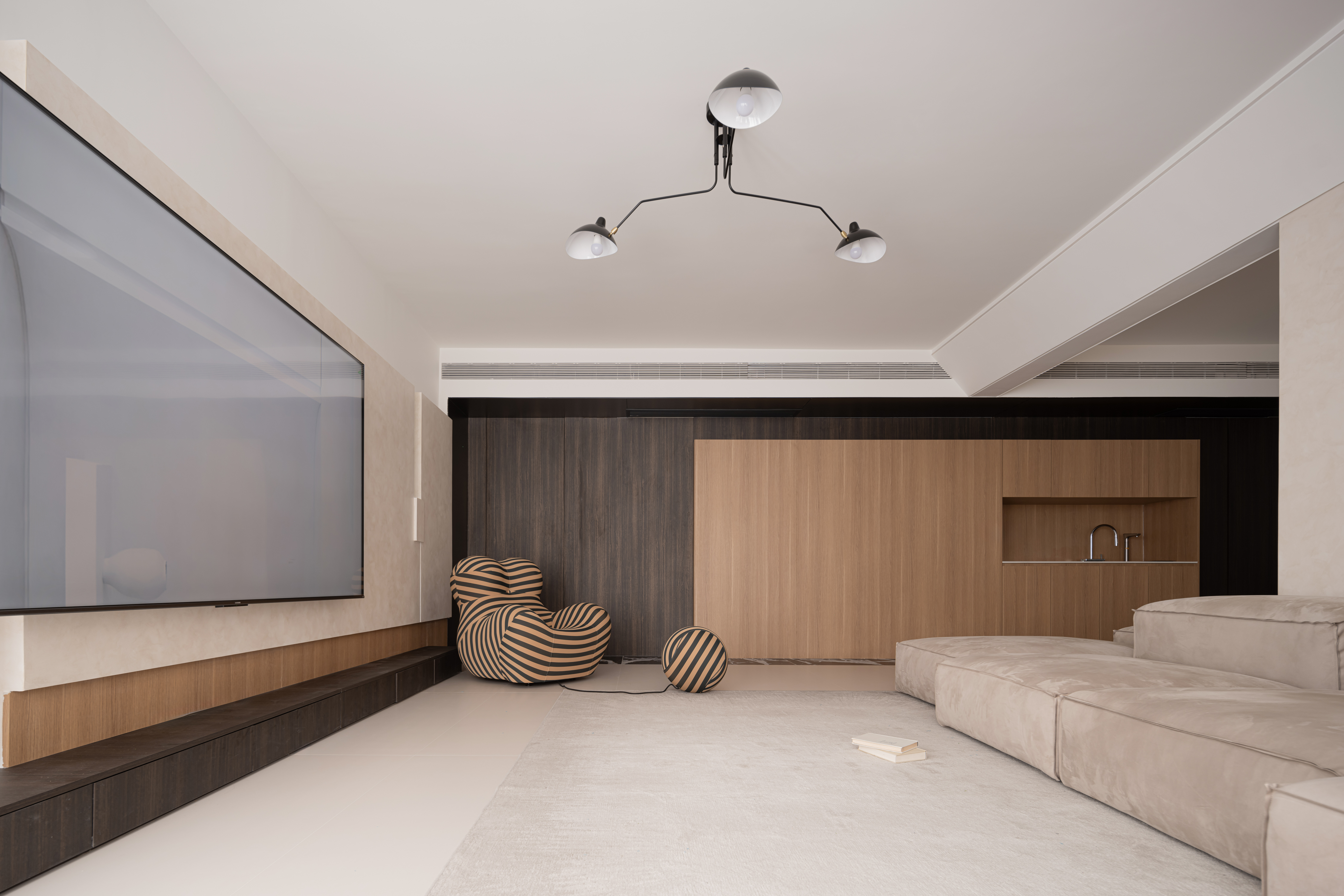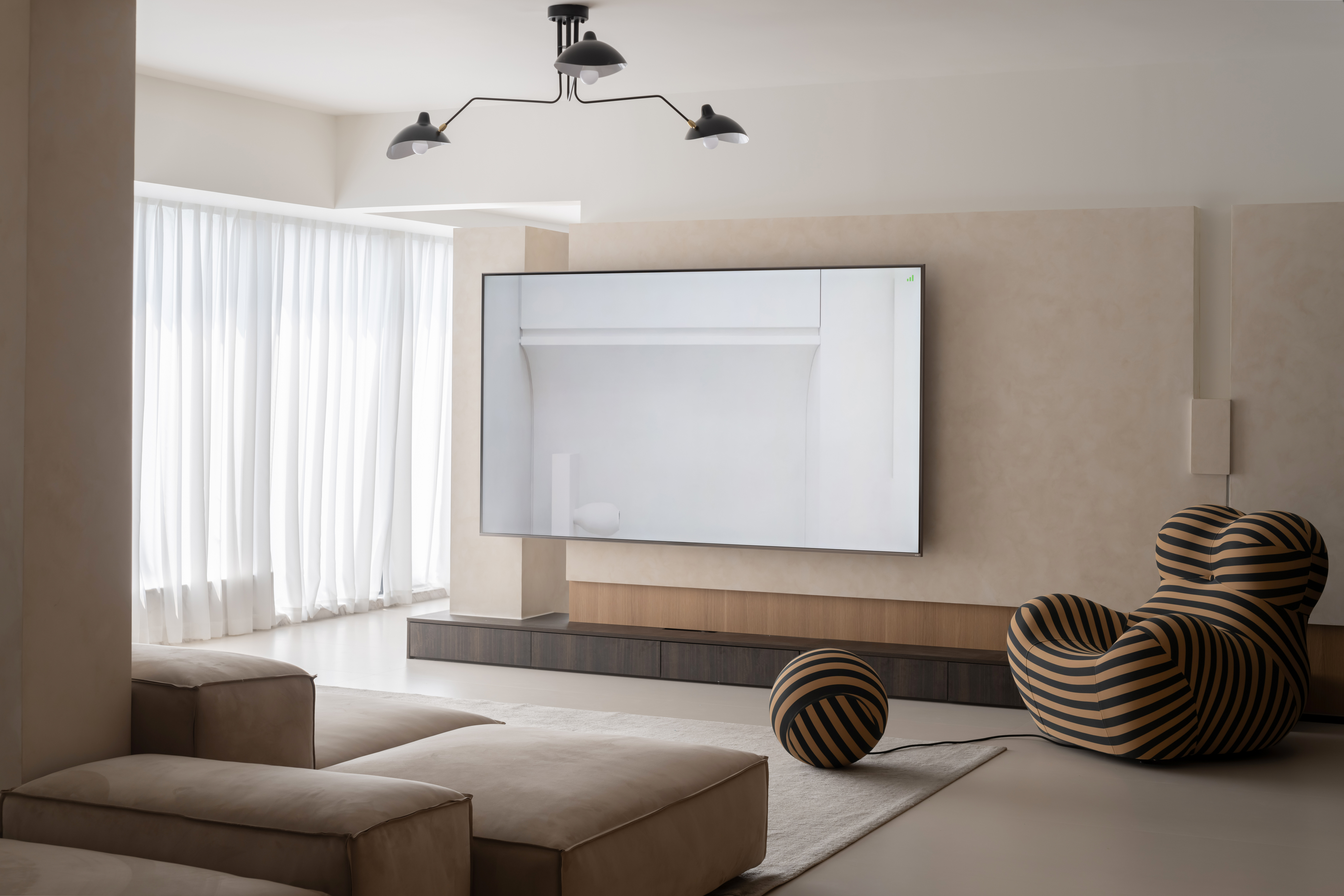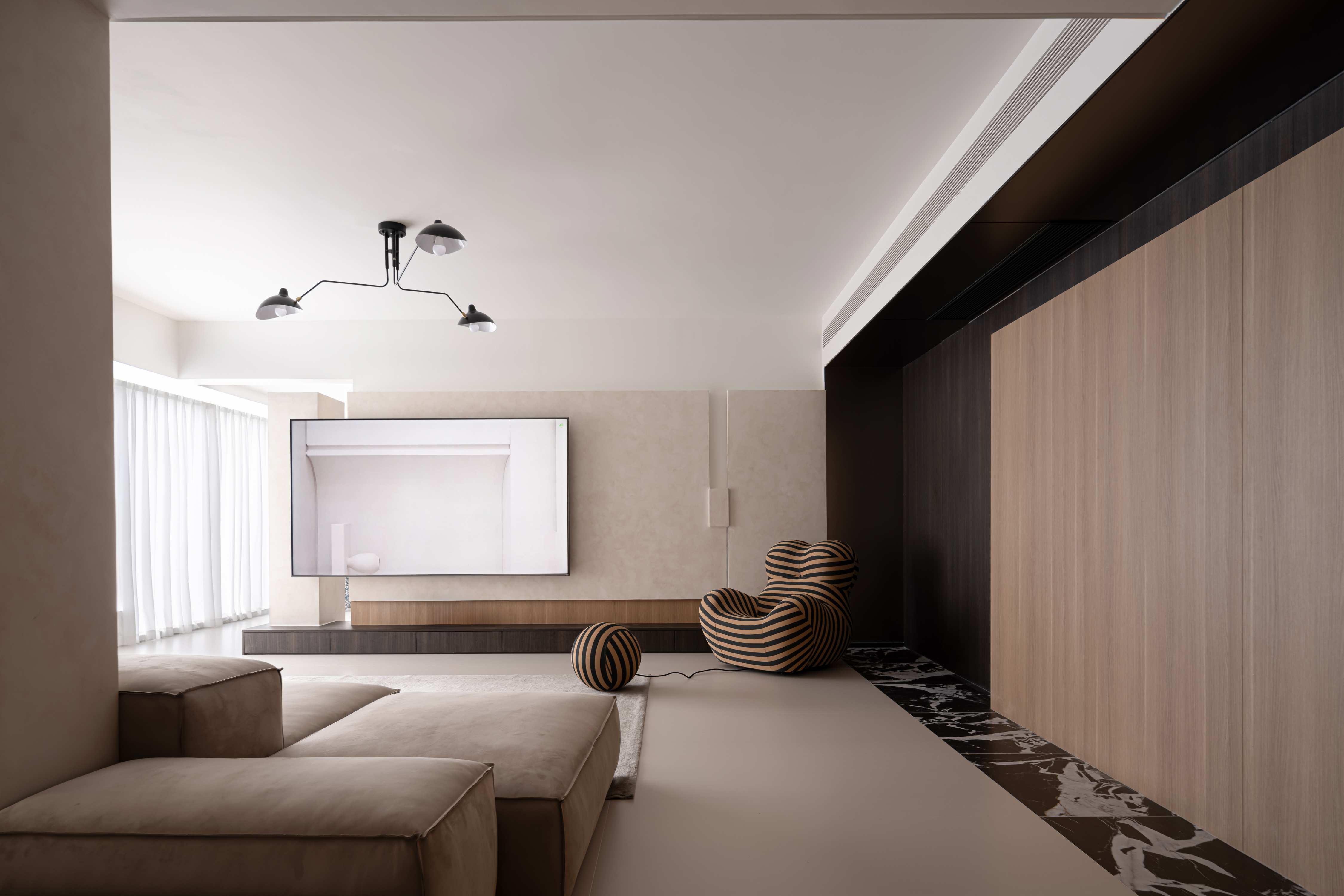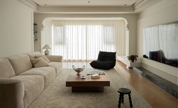 电视墙右侧摆放了一张"妈妈的怀抱"沙发,是家里的两个小朋友最爱的“大玩具”,它独特的造型为客厅增添了一抹趣味性。