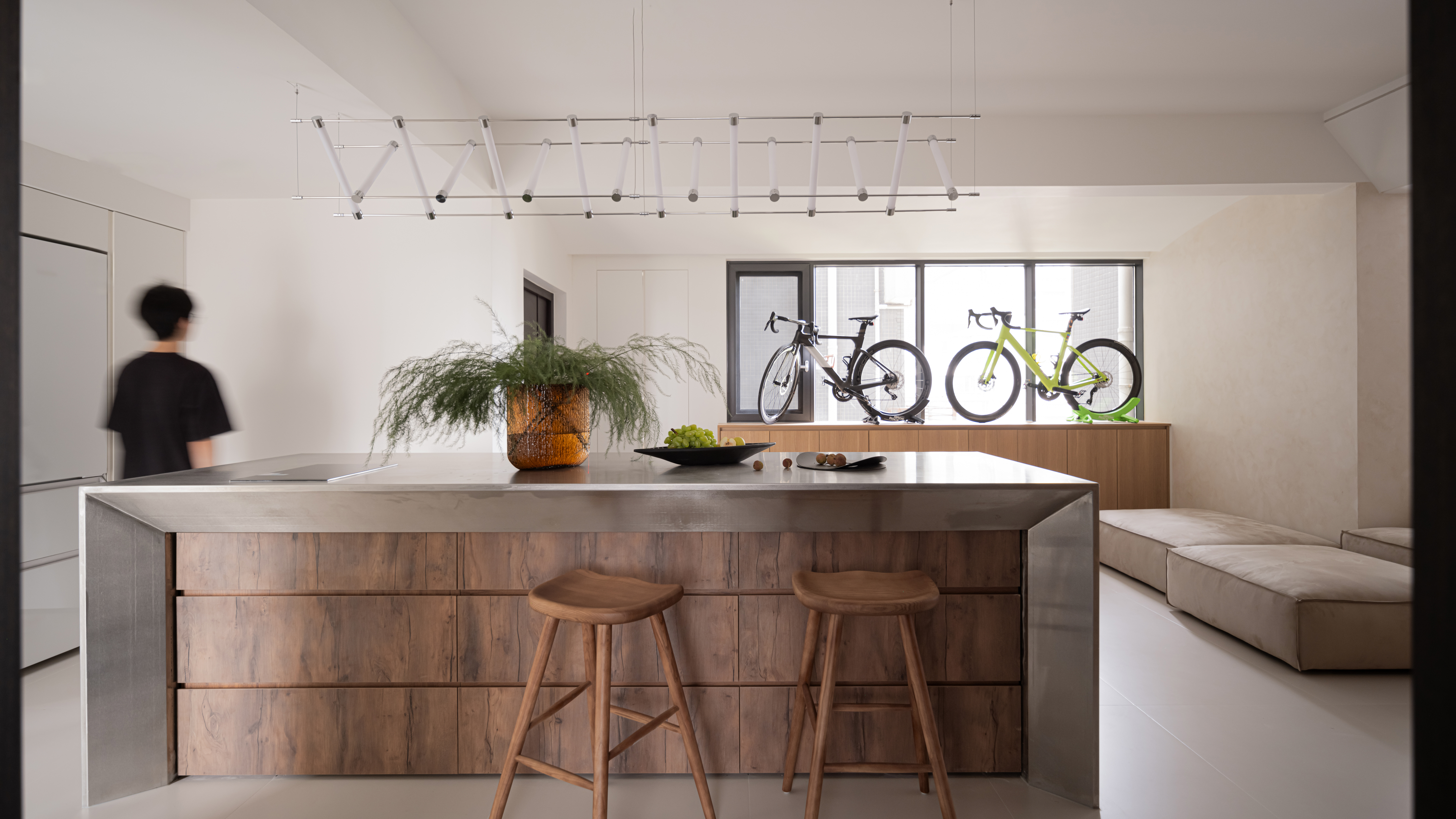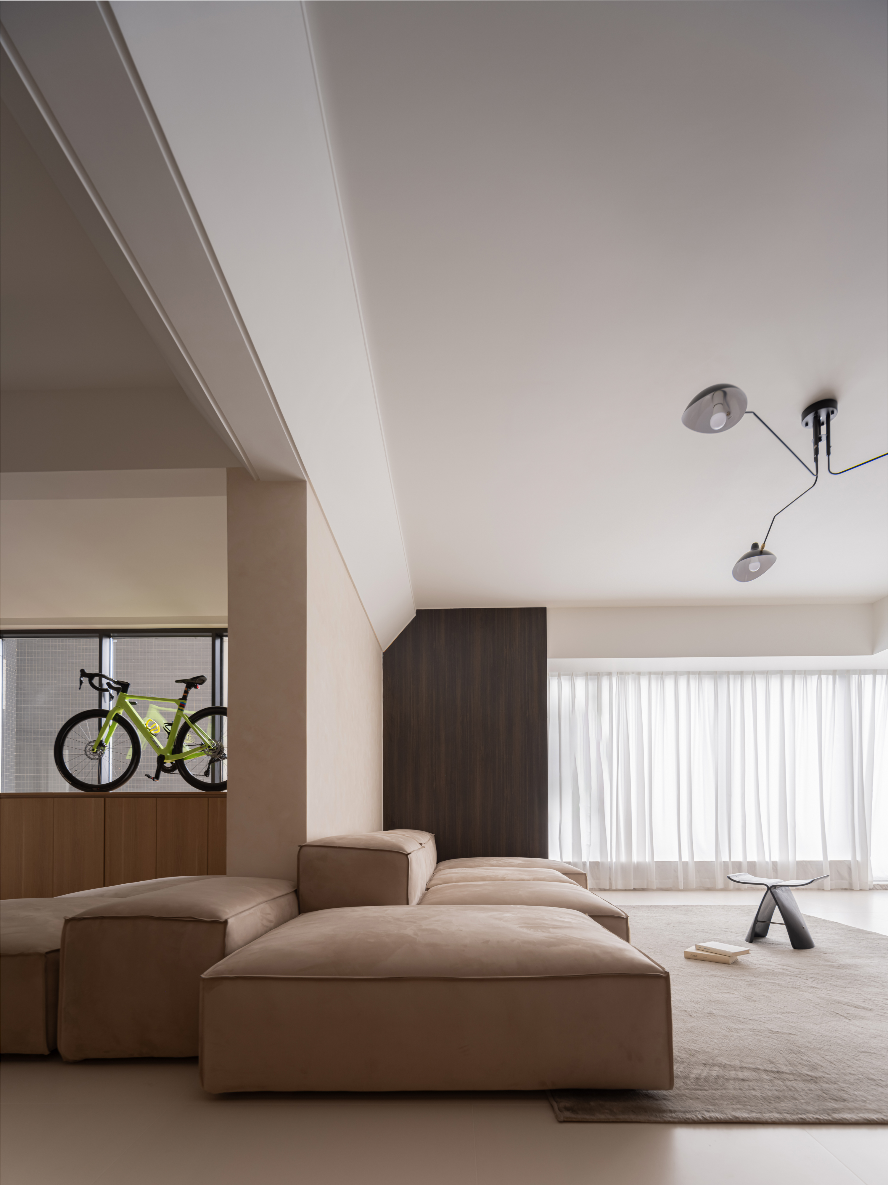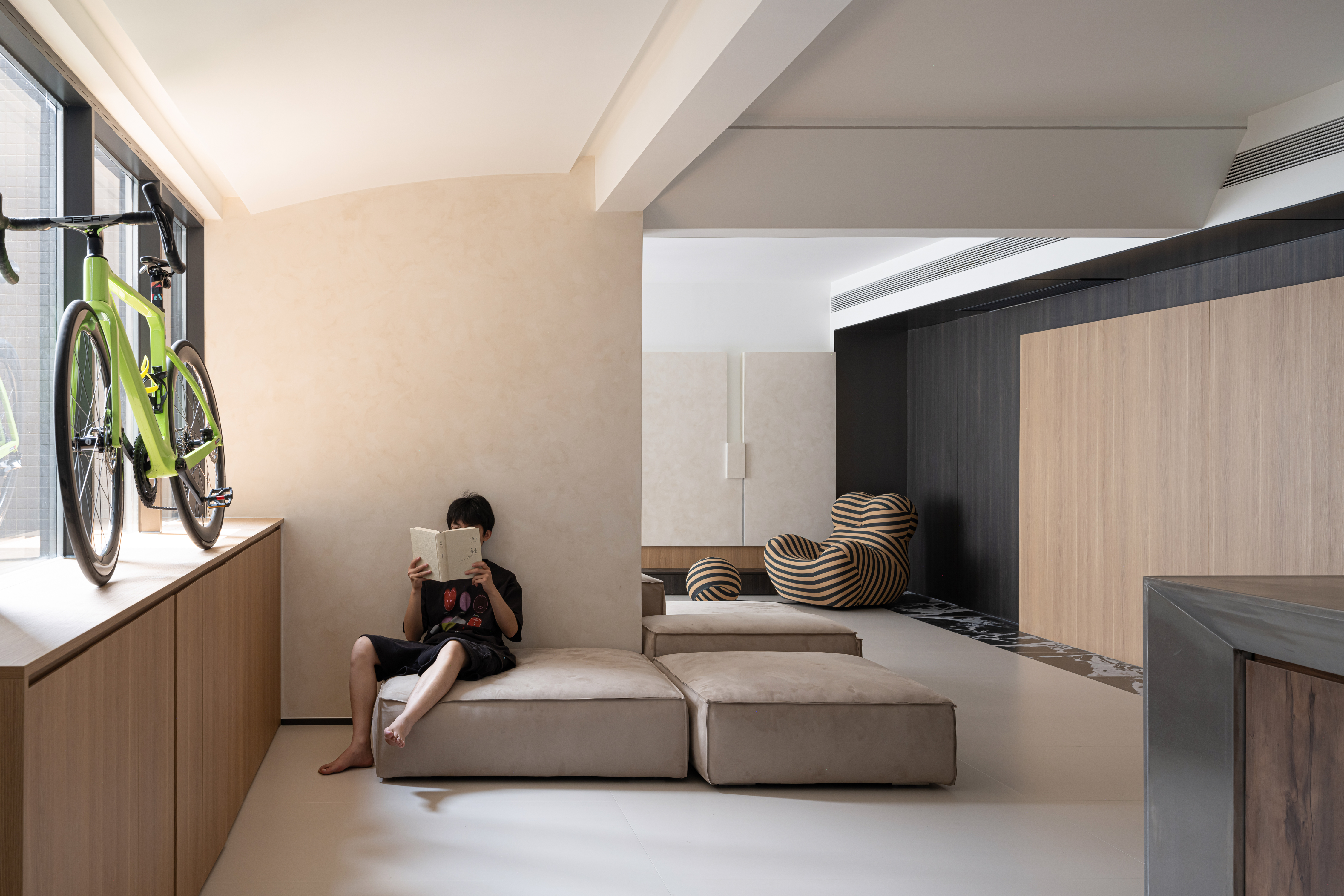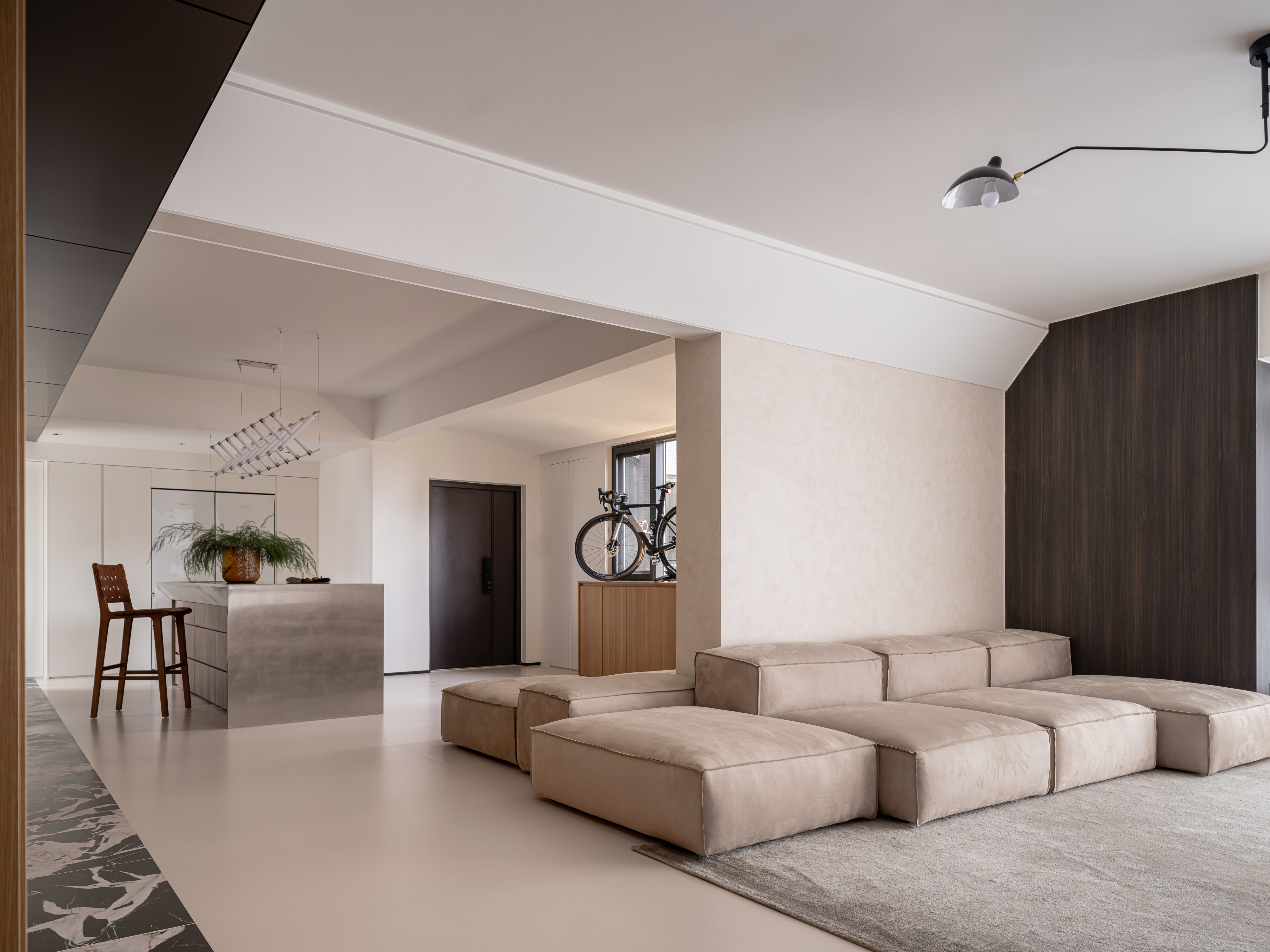 玄关靠墙放一横排鞋柜,1.2m的高度,刚好上面可以摆放屋主的自行车,模块沙发同时还能用作换鞋凳。
