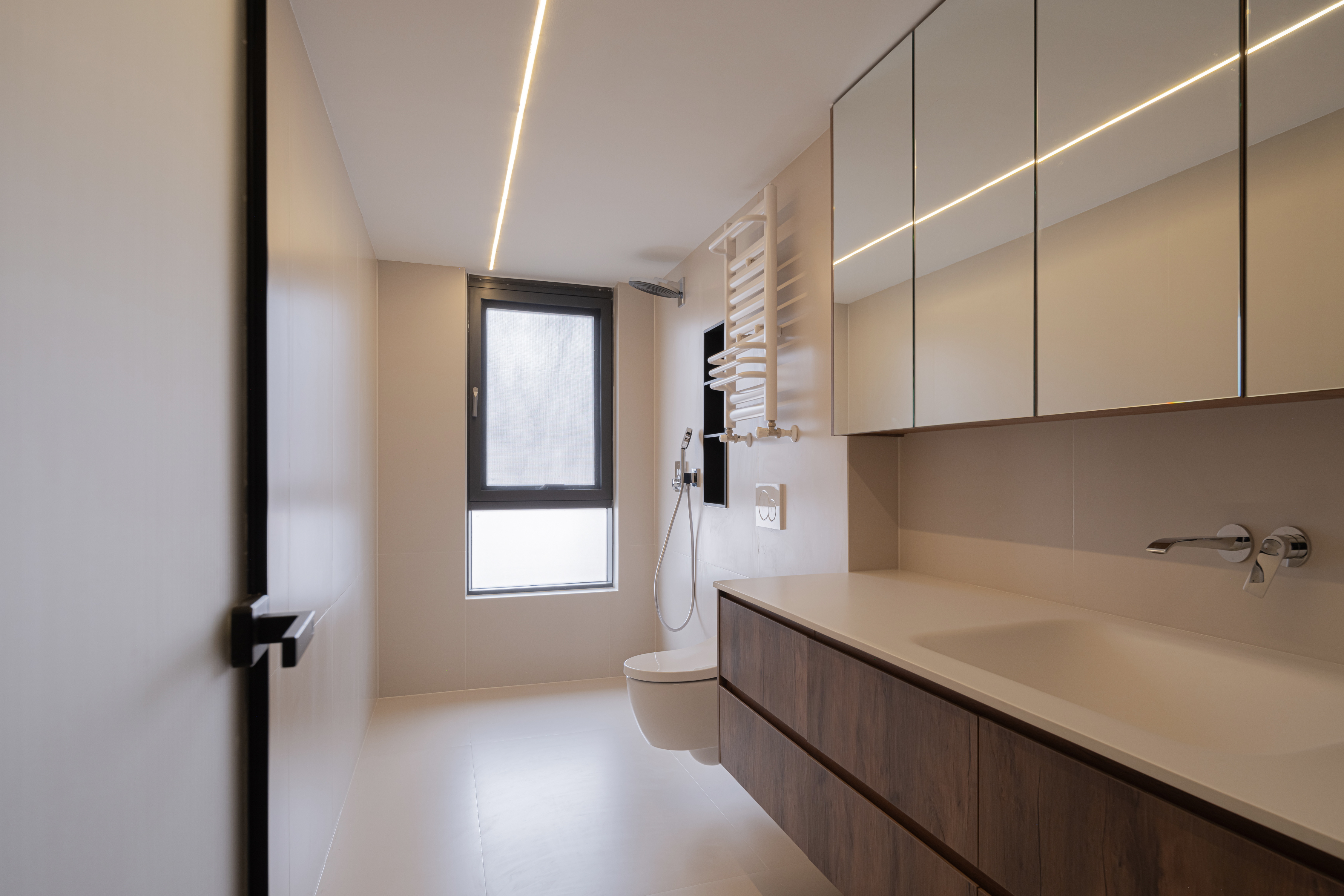 卫生间巧妙利用了原本的过道空间,经过空间优化,将主卧卫生间扩大,更在日常生活中为屋主增添了一份幸福感和便捷性。 原木色的浴室柜与镜柜组合,呈现出一种质感又优雅的氛围。镜面和顶面的灯光设计,为日常的洗簌和化妆提供了充足的光线。