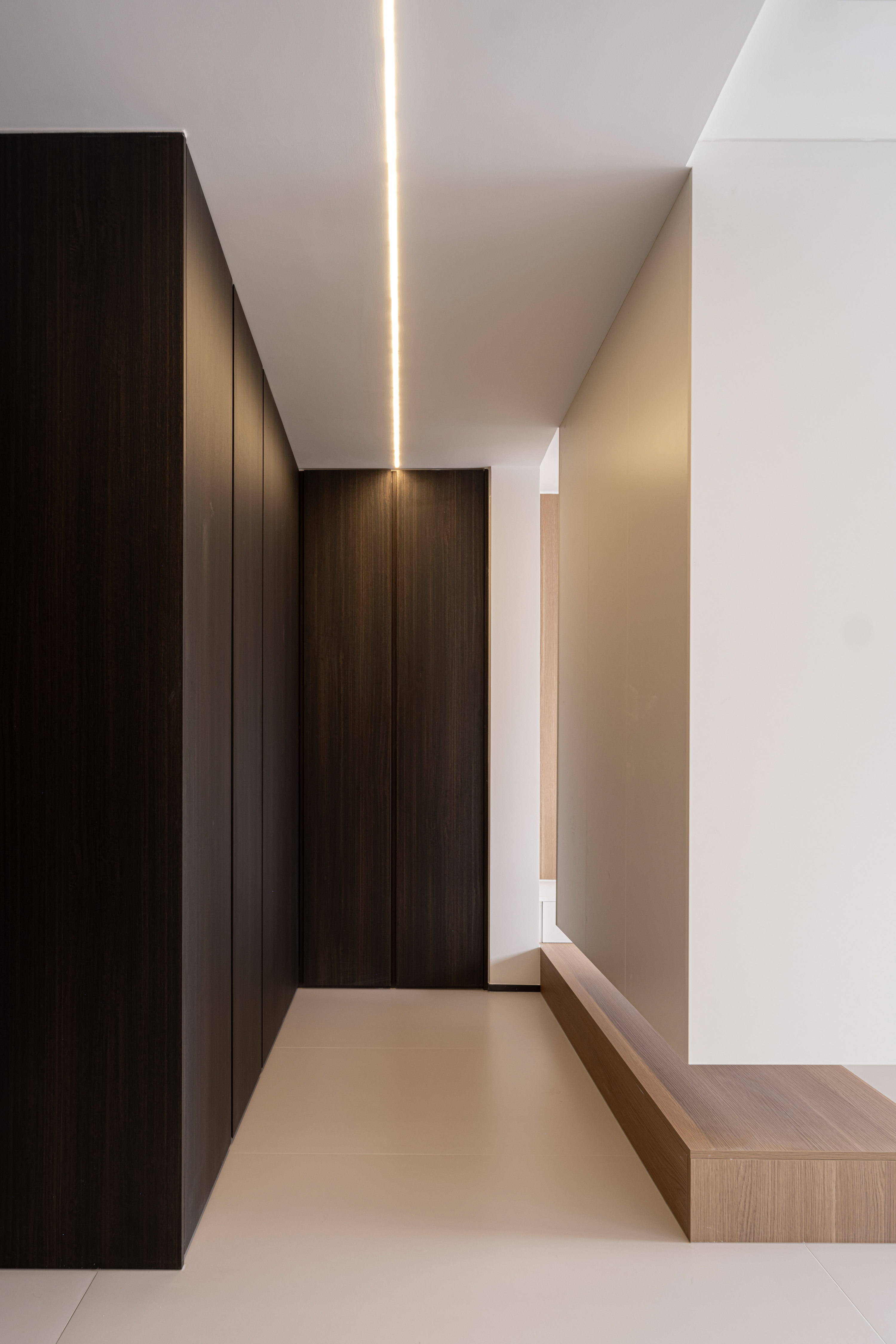 "U"型衣帽间采用了白色与深棕色的配色,营造出一种低调又富有内涵的氛围。