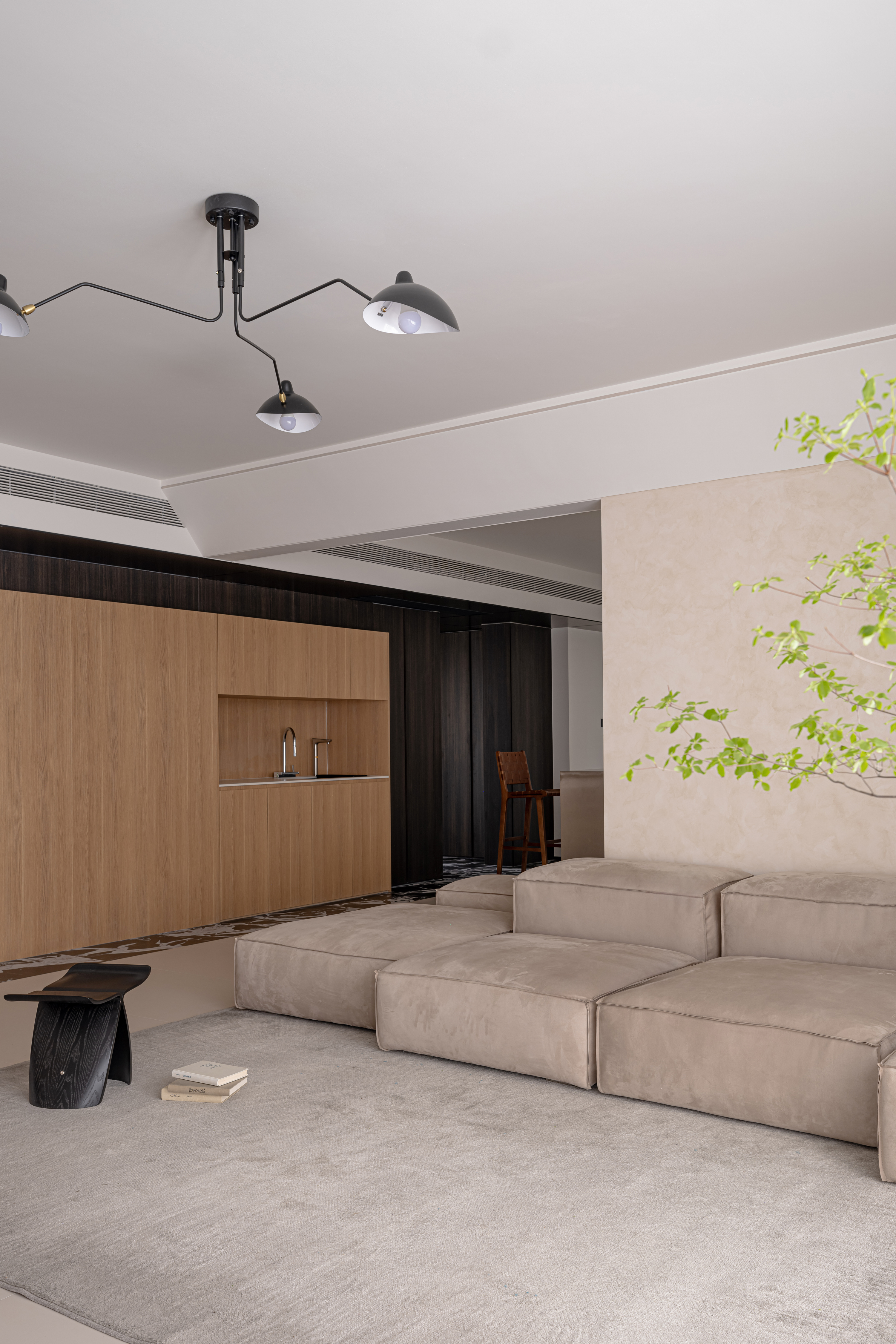 浅咖色的沙发搭配灰色地毯,浅色系的组合营造出一种自然舒适的居家氛围,一推开家门就能感受到家的温馨与宁静。