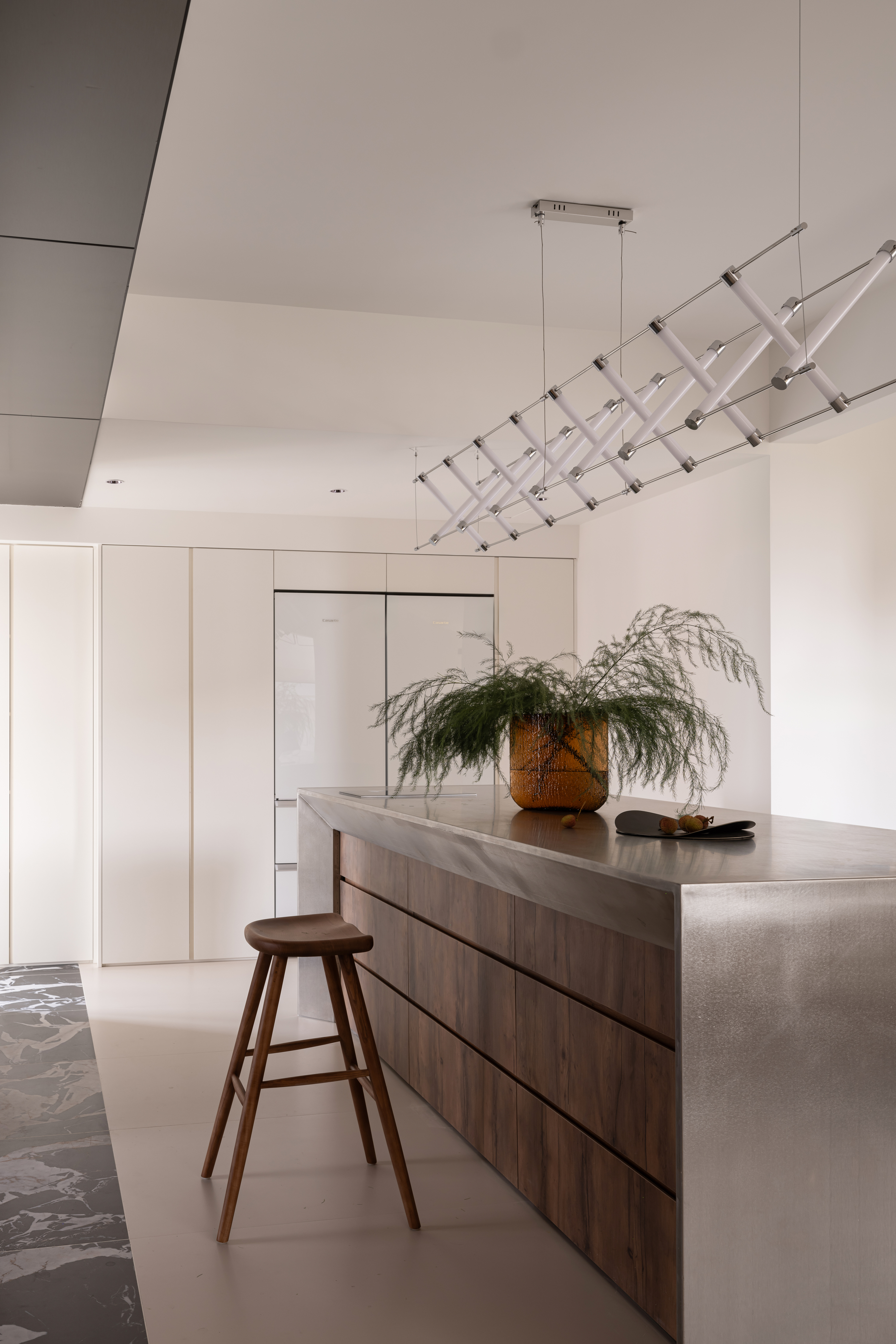 餐厅巧妙地利用了原来厨房的位置,扩大了空间,才有一个大气而低调的就餐环境。岛台下方设有储物柜,极大地增强了餐厅的收纳功能,兼具美观与实用性。