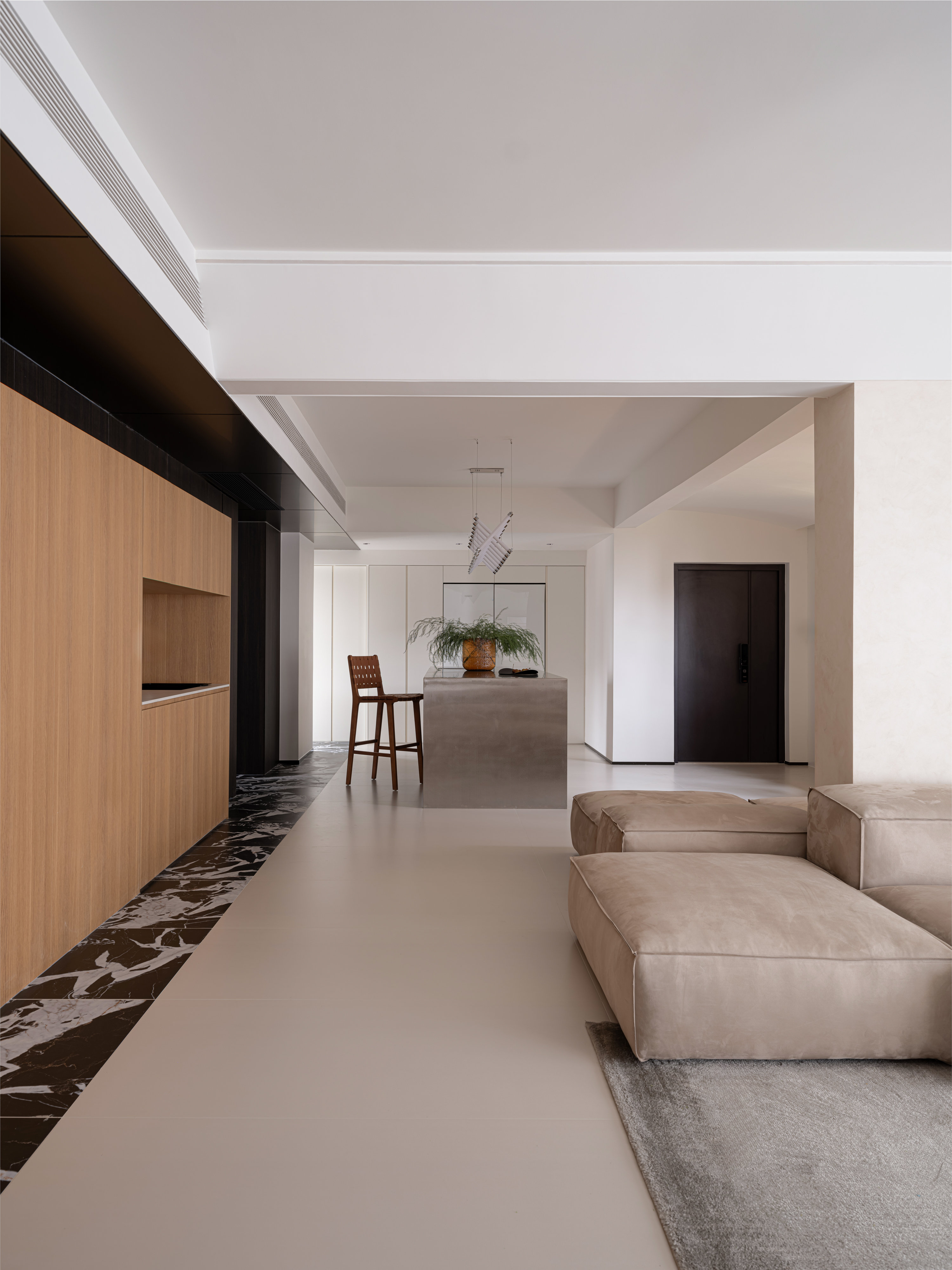 客厅做了半墙设计,巧妙地将客厅与玄关区域分隔开来,既保持了空间的开放性,又实现了功能区域的划分。沙发采用环绕式布局,选择模块化设计,有了灵活多变的组合方式,还增强空间的连续性。