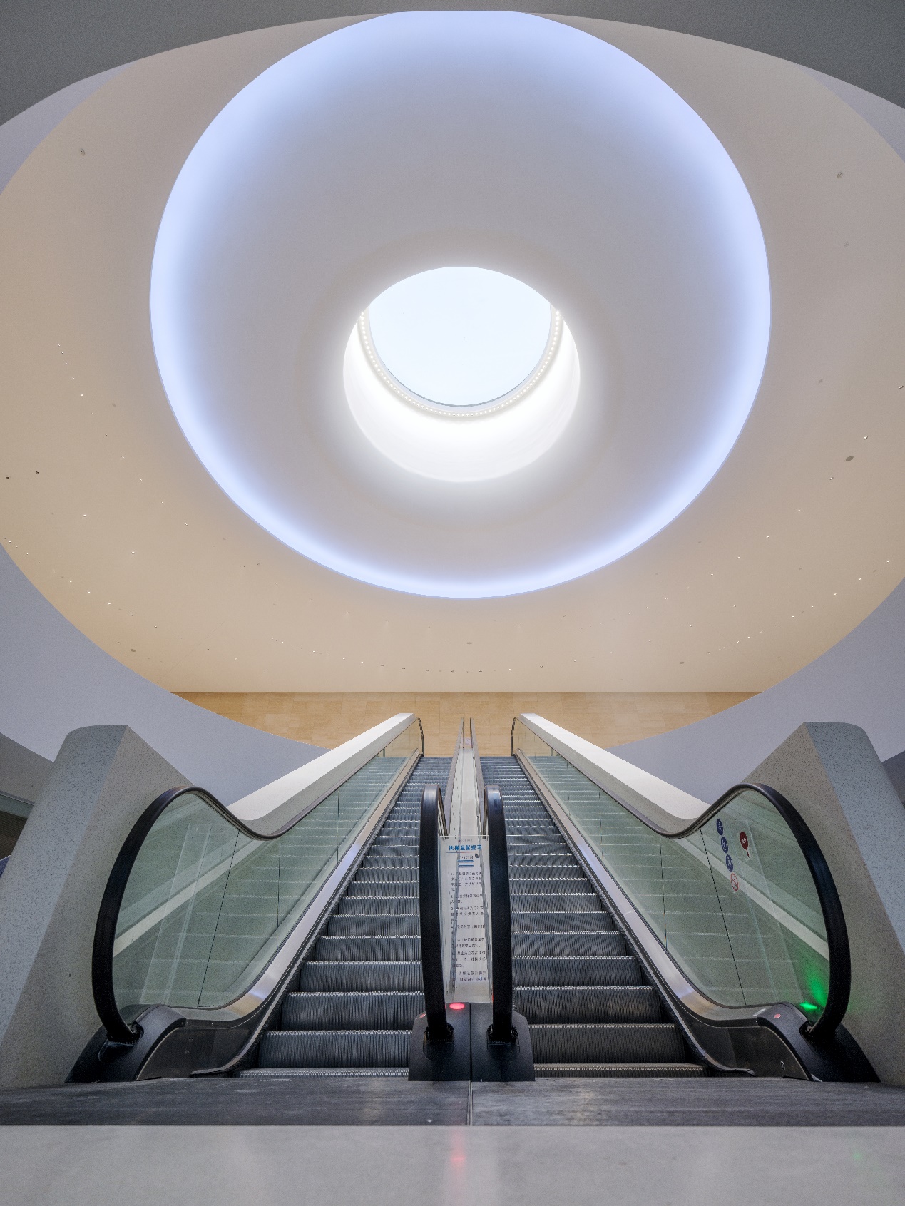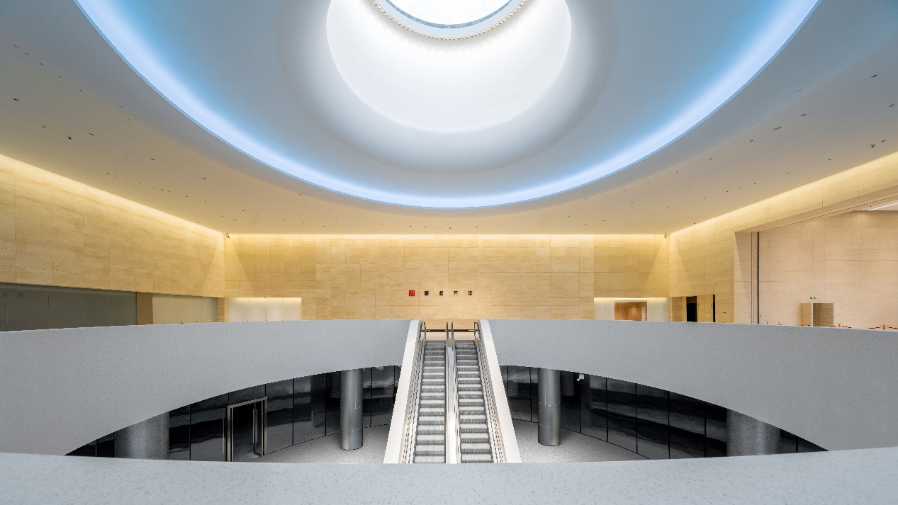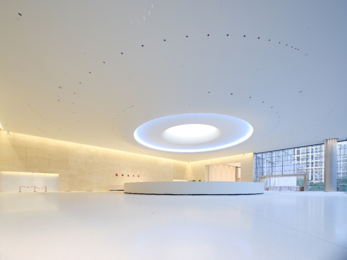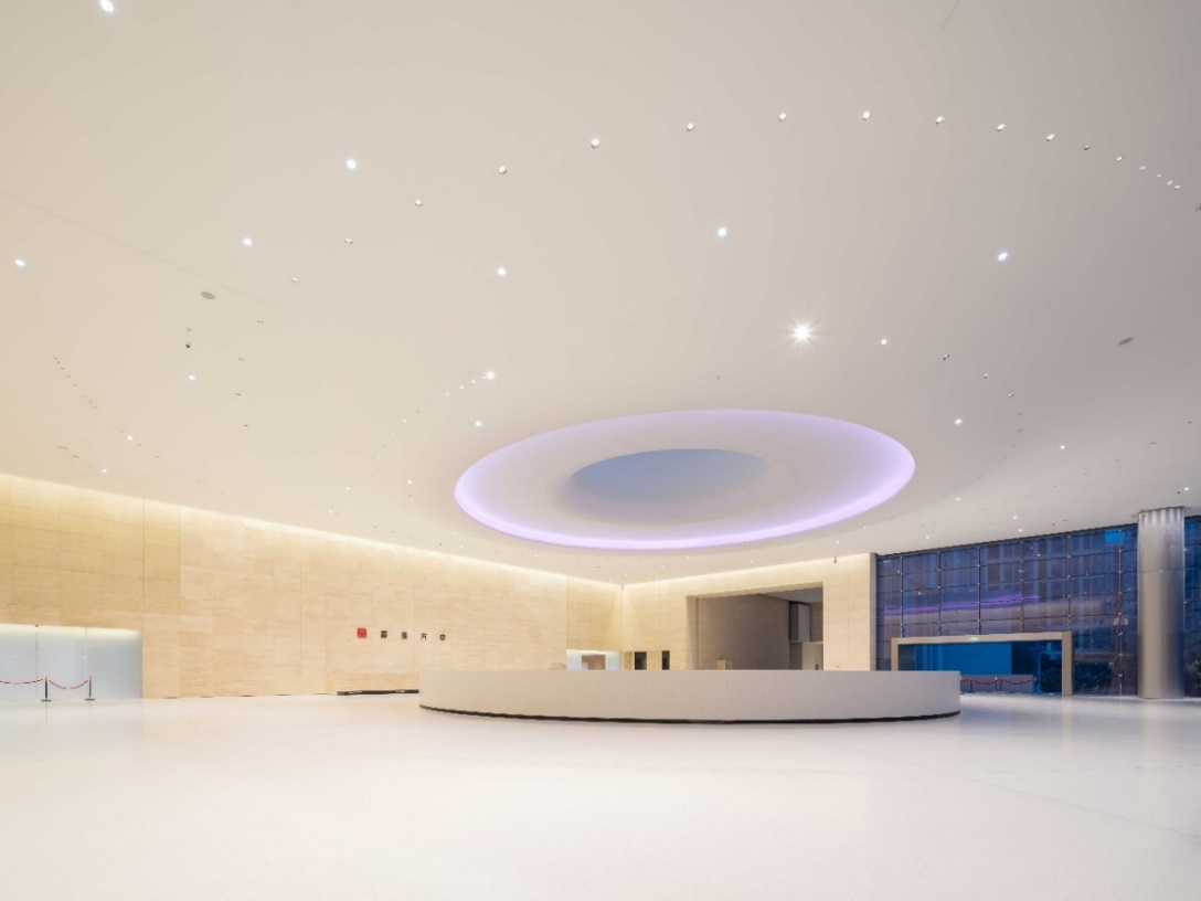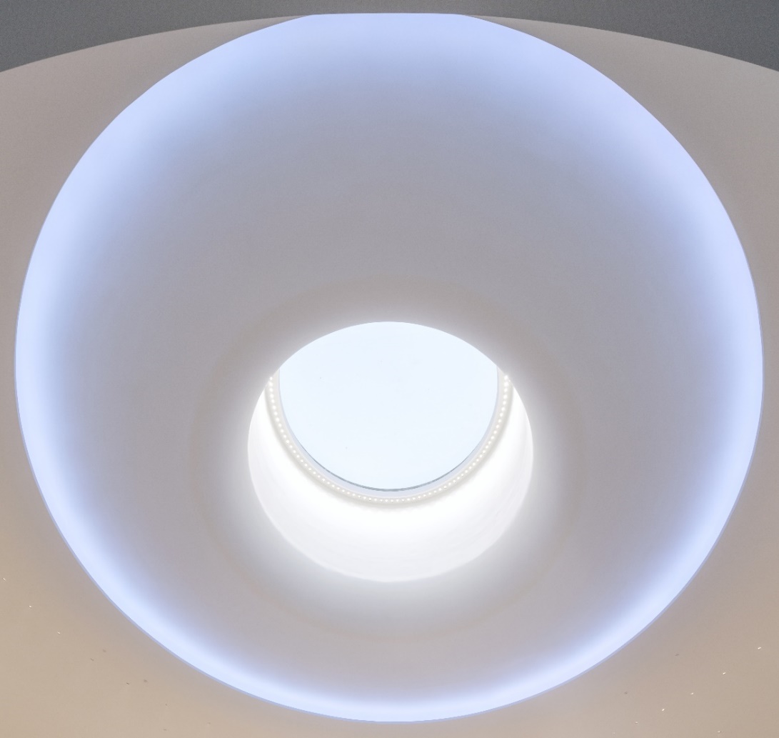 其中接待大堂的设计是最大的亮点之一。我们与建筑师深入探讨灯光方案,了解建筑师对灯光效果的构想与期望。我们在顶部设计了直径7M的极简采光圆洞,设计灵感来源于罗马万神殿的穹顶圆洞OCULUS,同时与大堂方正的空间形态,形成具有中国传统文化中“天圆地方”的格局, 体现出企业对文化兼容并包含对设计不断追求的企业精神。洞口上部覆盖16cm厚的超透亚克力作为大堂屋顶天窗材料,亚克力顶部同时作为浅水池,成为办公总部空中景观中重要组成部分。在天气晴朗时,阳光透过洞和水形成水纹光斑洒向室内,伴随着太阳的移动,波光盈盈,自然界的光影开始游走于大厅之中,形成独具建筑神性场域,带来了一种明亮而静谧的空间氛围。再结合“天圆地方”的设计理念,形成别具一格的照明设计想法衍生——璀璨星辰的轨迹、地球外部的大气层,蕴含着宇宙观、自然界中的思维启发,也承载着公司的企业文化精神和对人居环境美好生活的向往。我们称它为光的形态,它将唤起使用者的情感。“璀璨星辰耀明月,天圆地方定乾坤”,让人仿佛置身于宇宙,天地之间仰望日月同辉、星辰甩尾之奇观,感受自然界中的光色变化,基准红、火星橙、大气蓝…