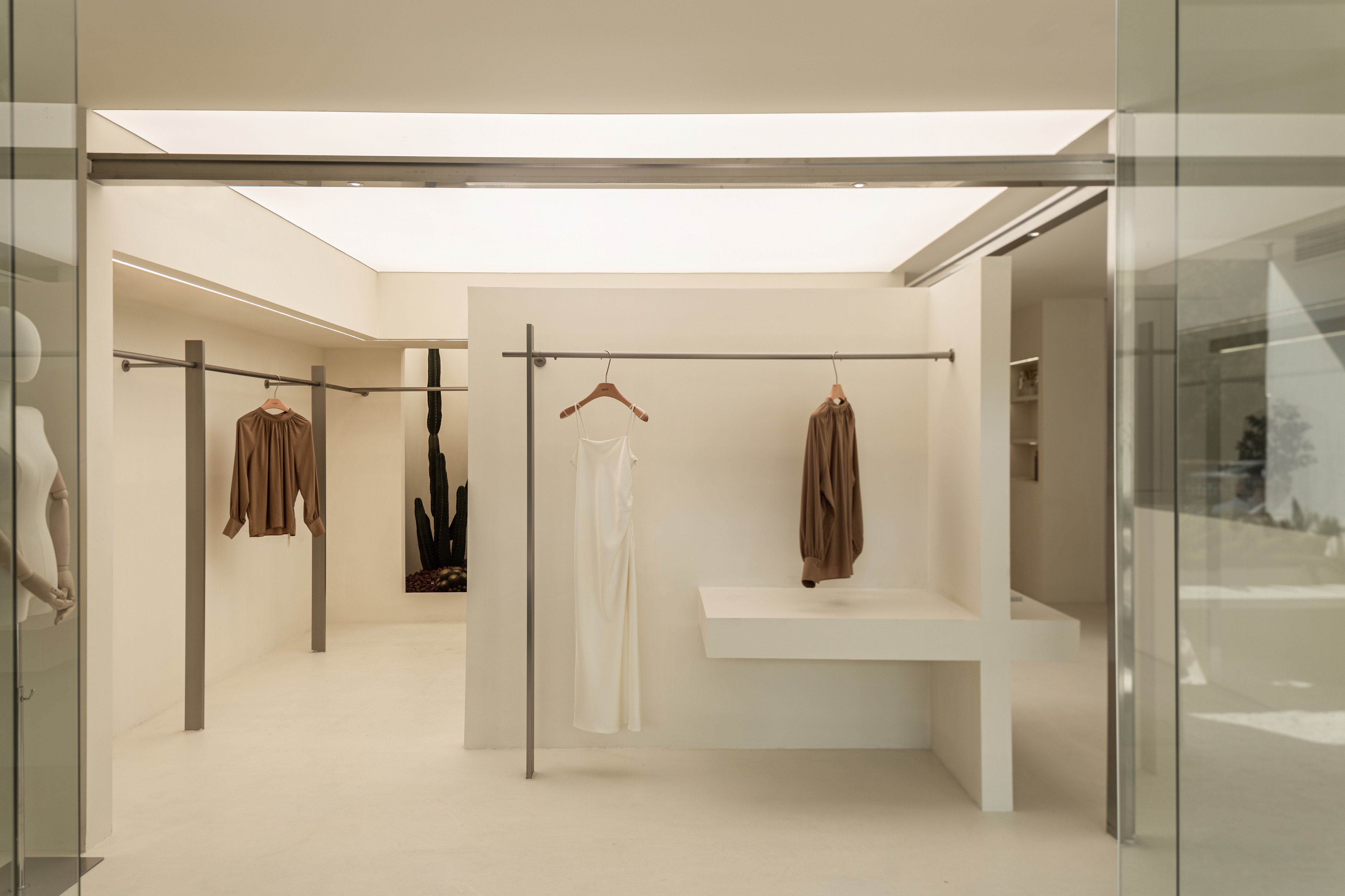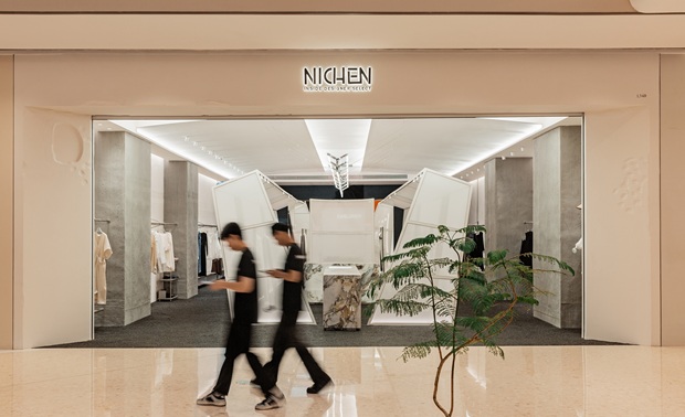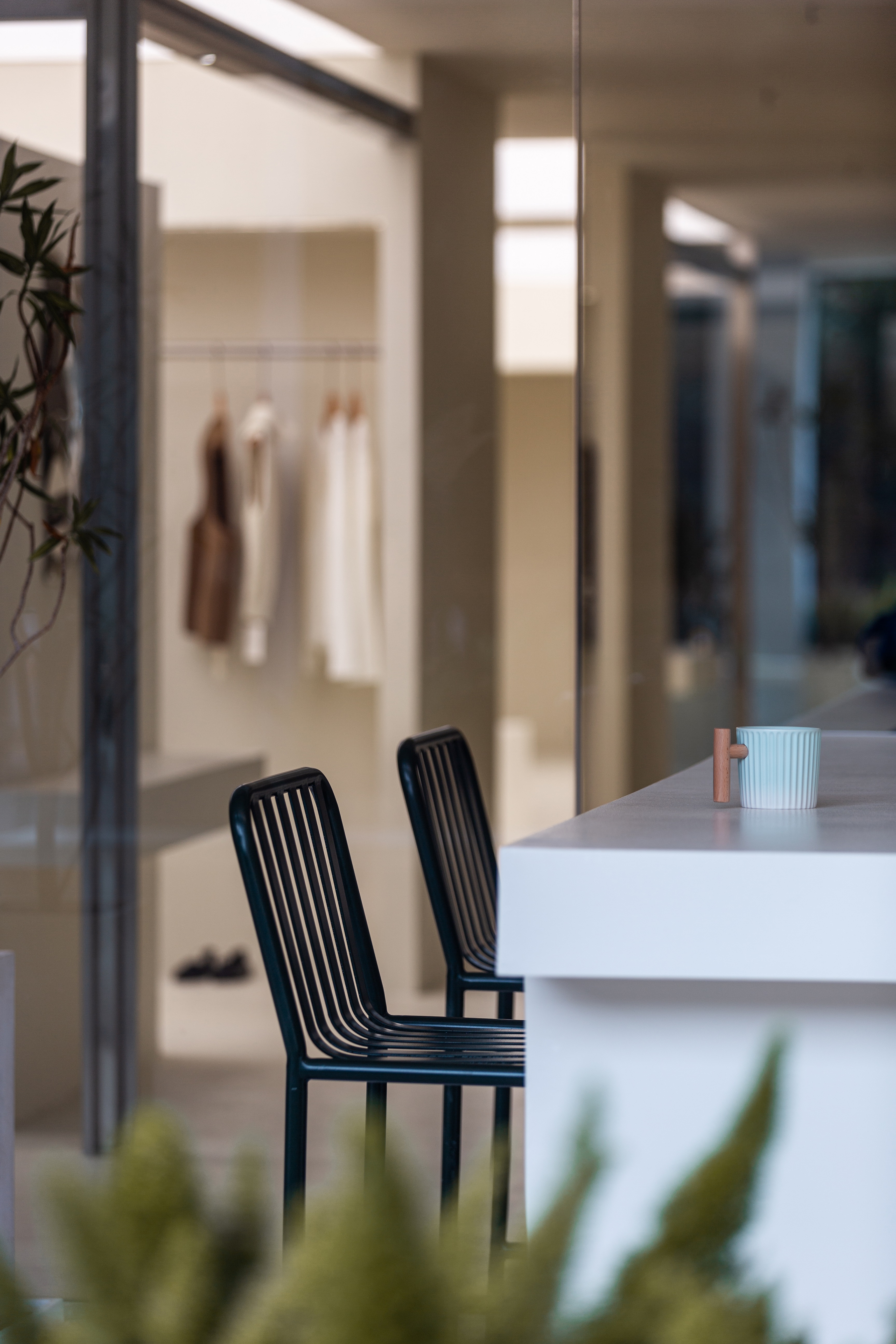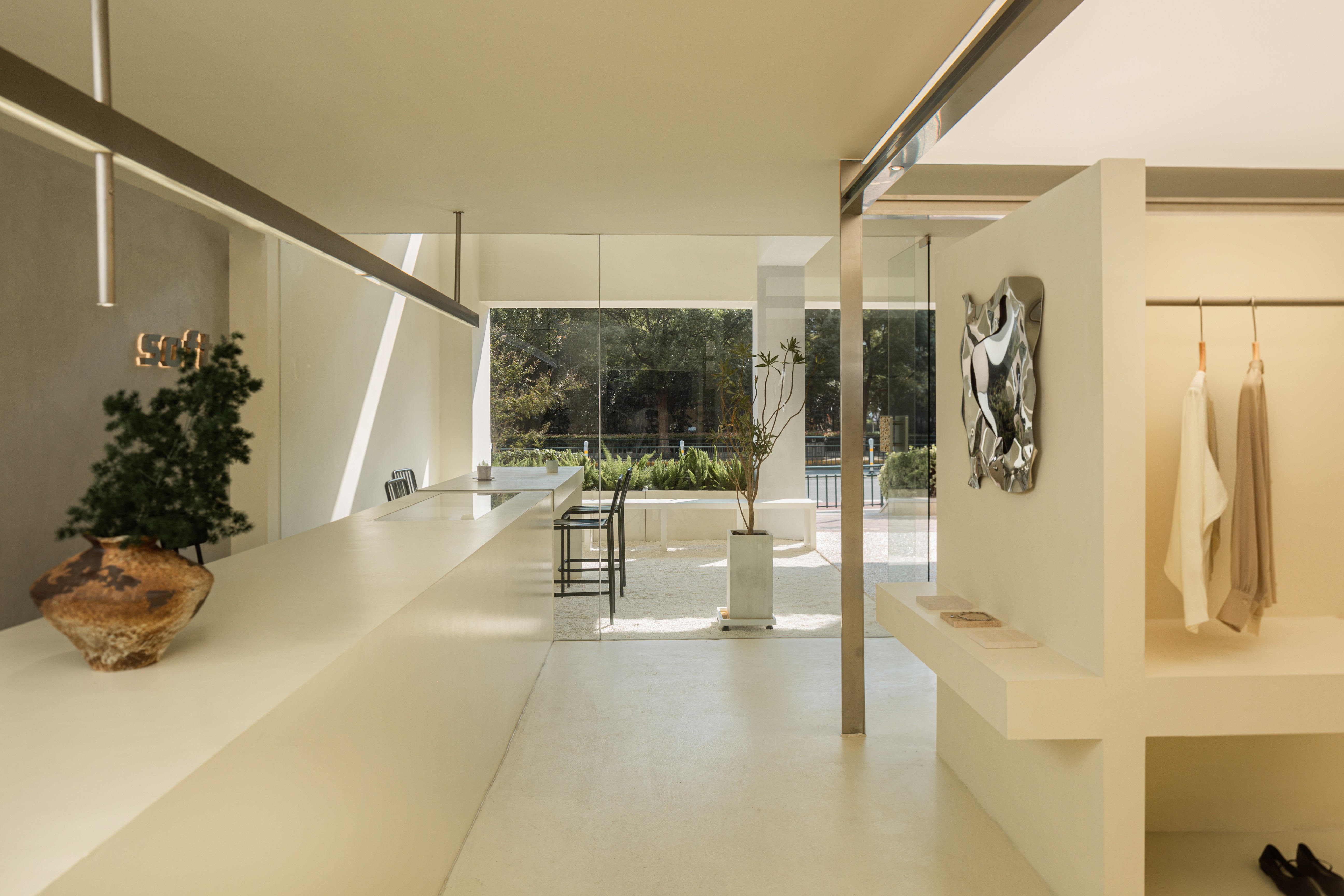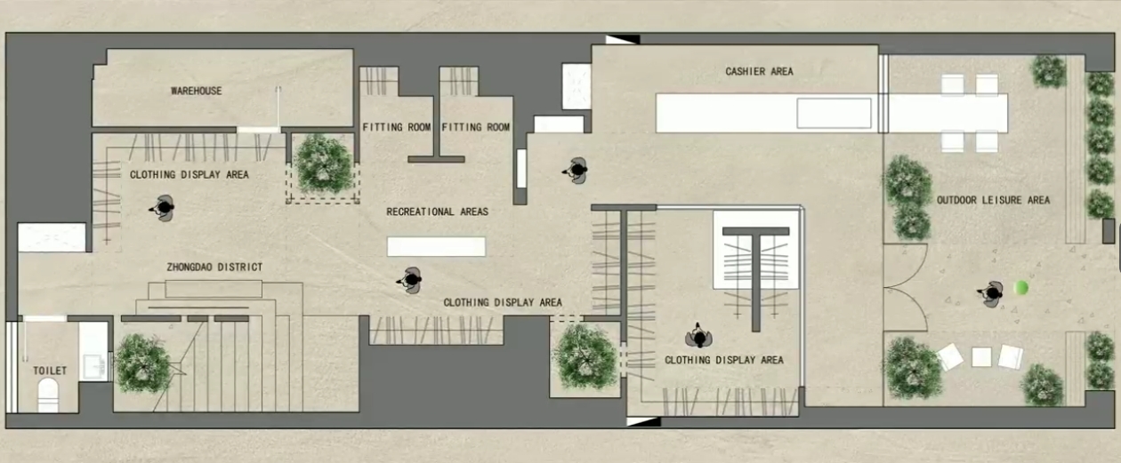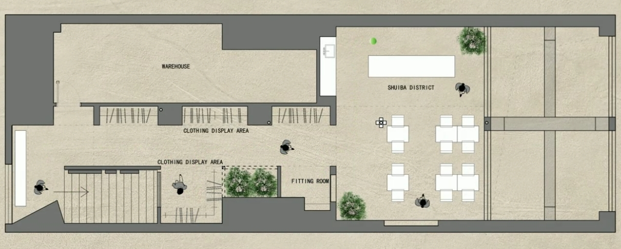 空间布局:将原有外墙内退,采用玻璃分隔内外的方式,既保证了视觉通透性又模糊了室内外的边界感,吧台从室外延伸至室内,集收银、打包与户外休闲功能于一体,绿植以点状式分布在室内外,引入自然,深化与自然共生的理念,客户的动线虽缩短,但在此增加了选衣搭配的趣味性,肌理漆由室外延伸至室内,使空间在色调与质感上更加整体。