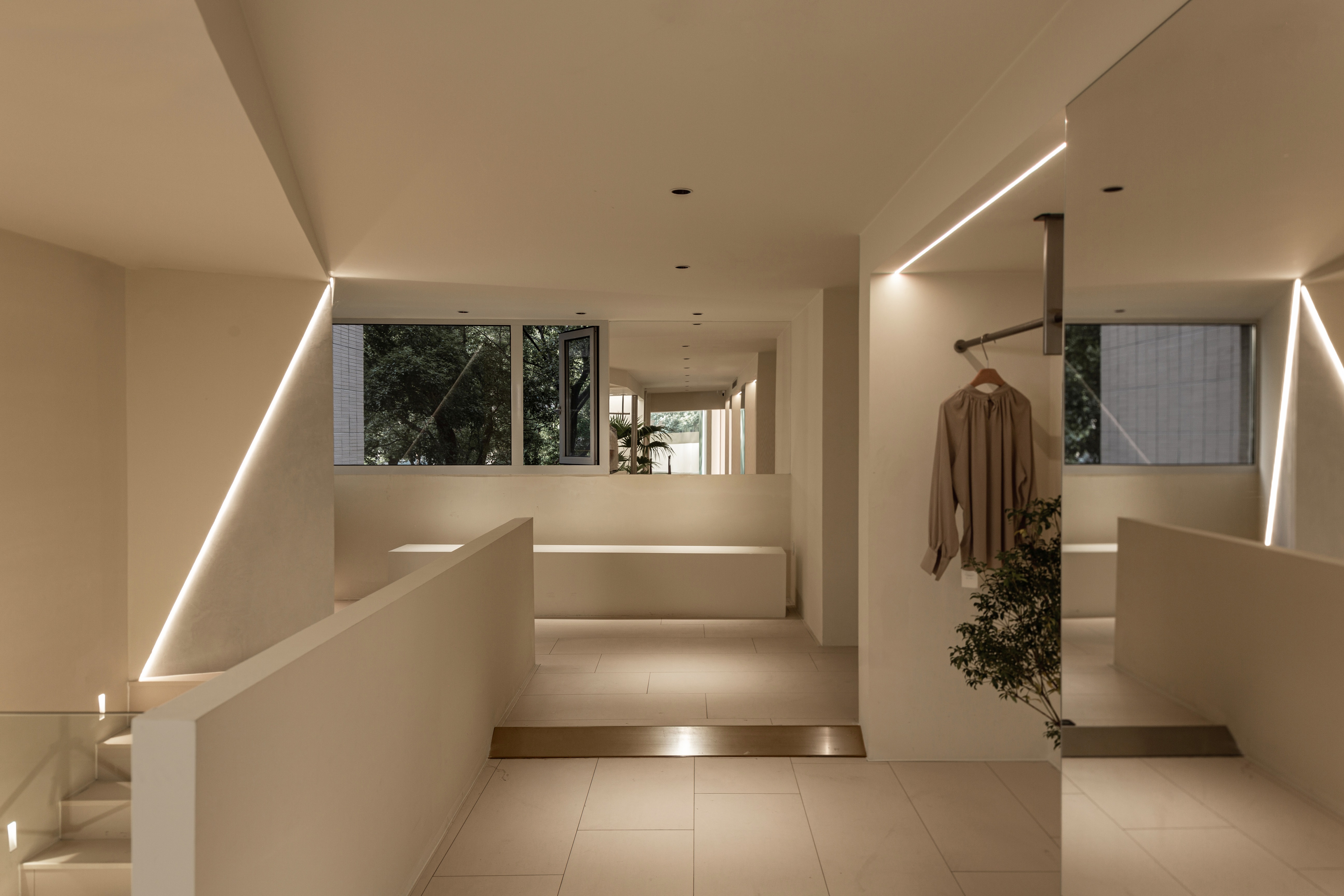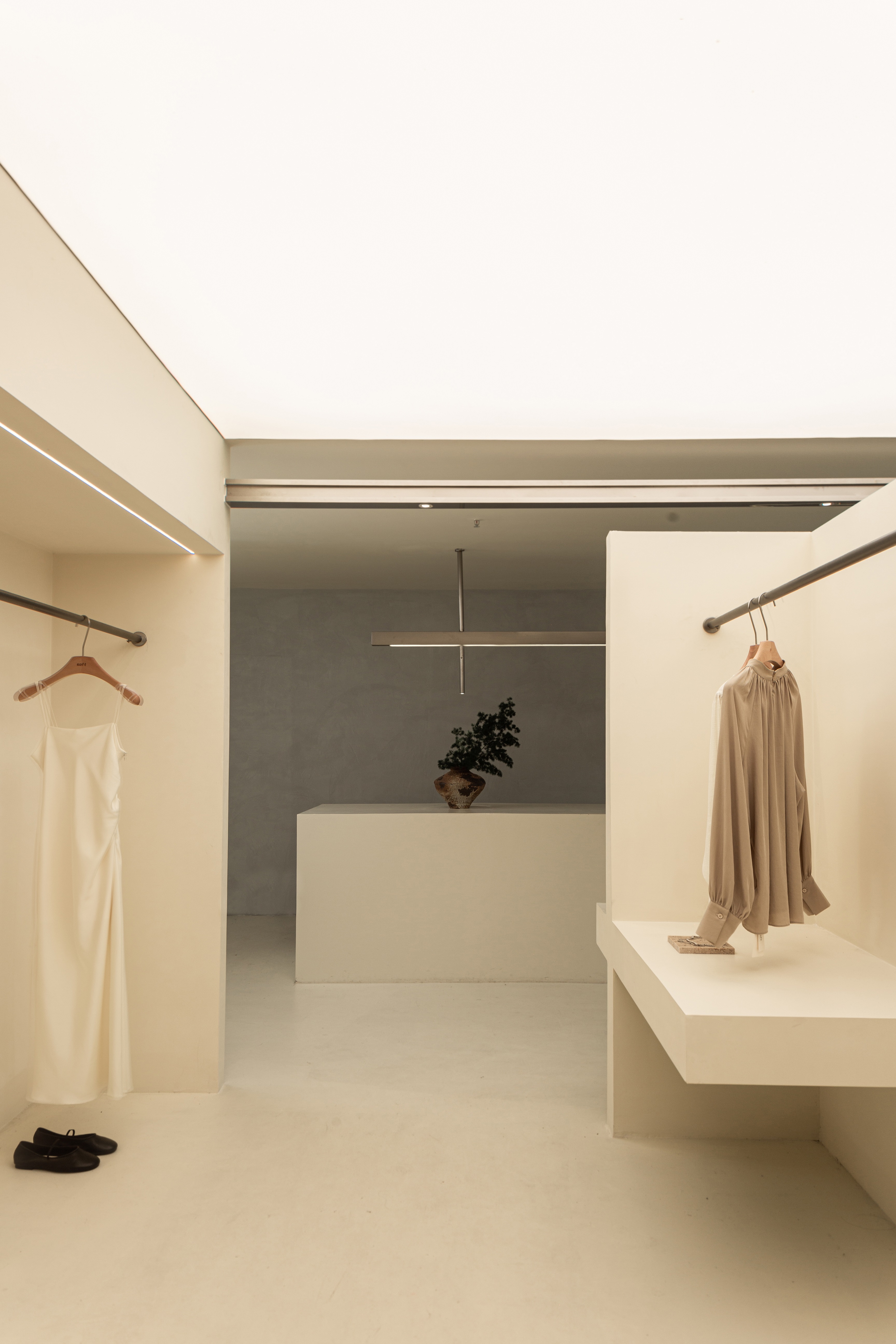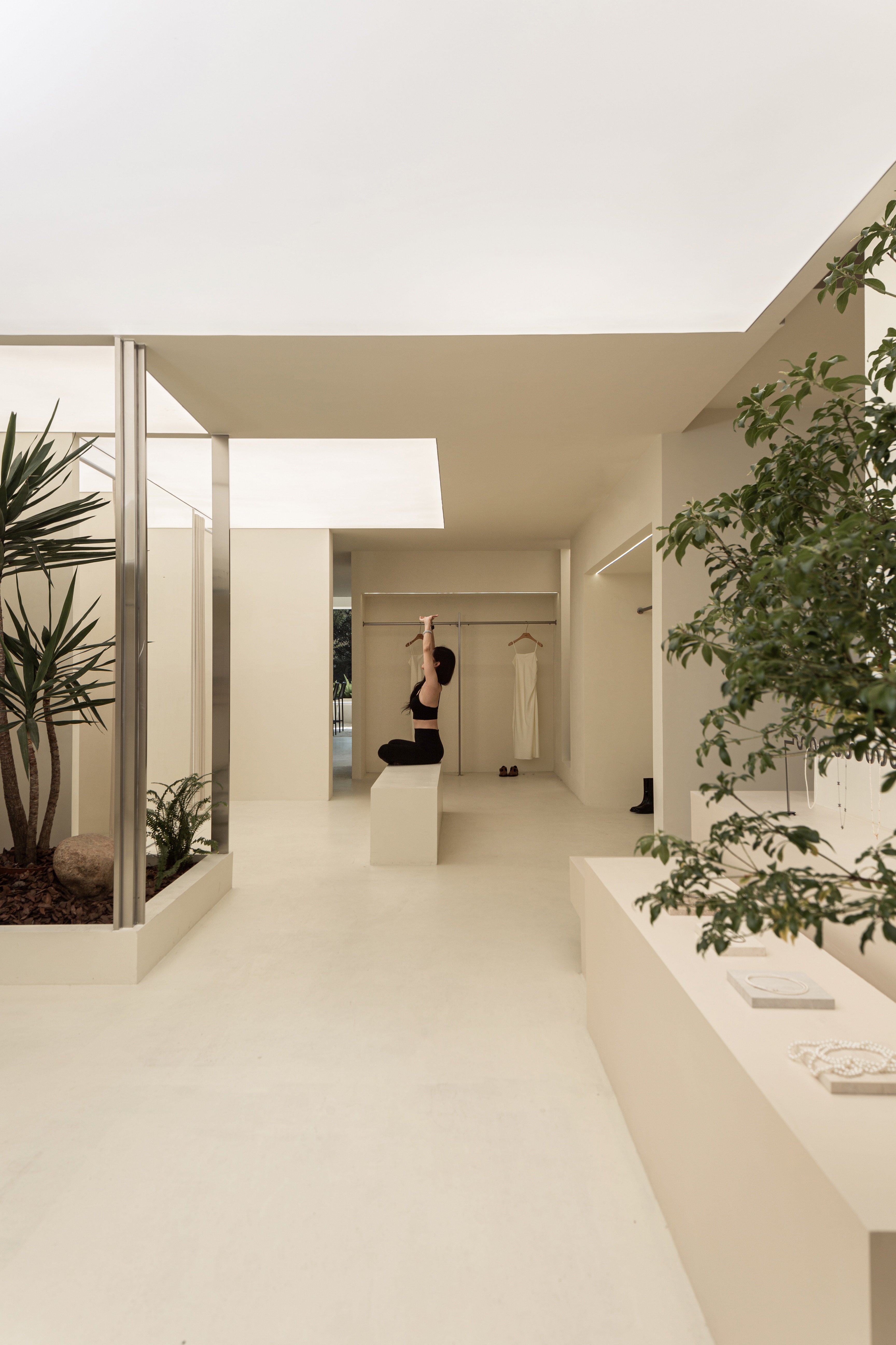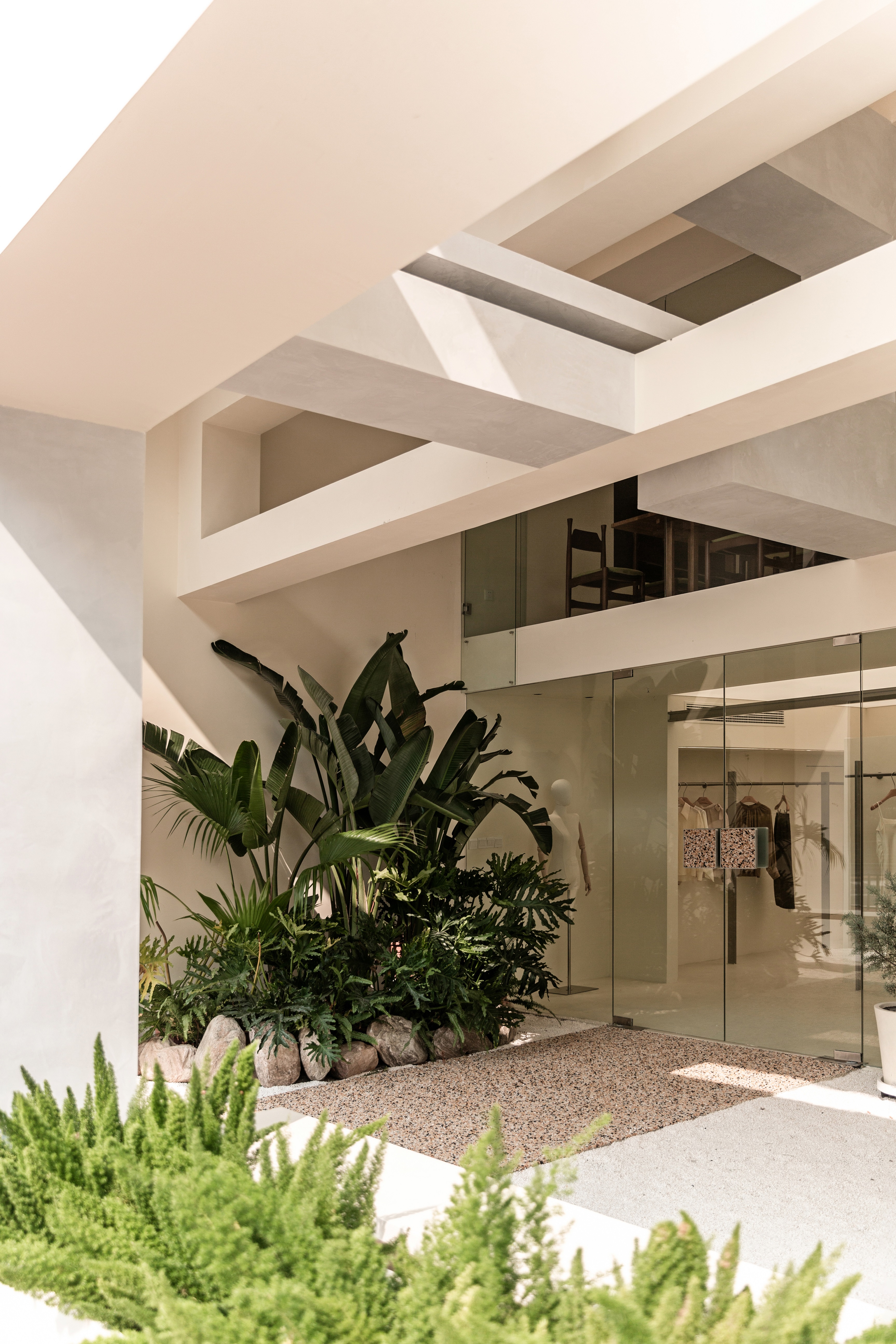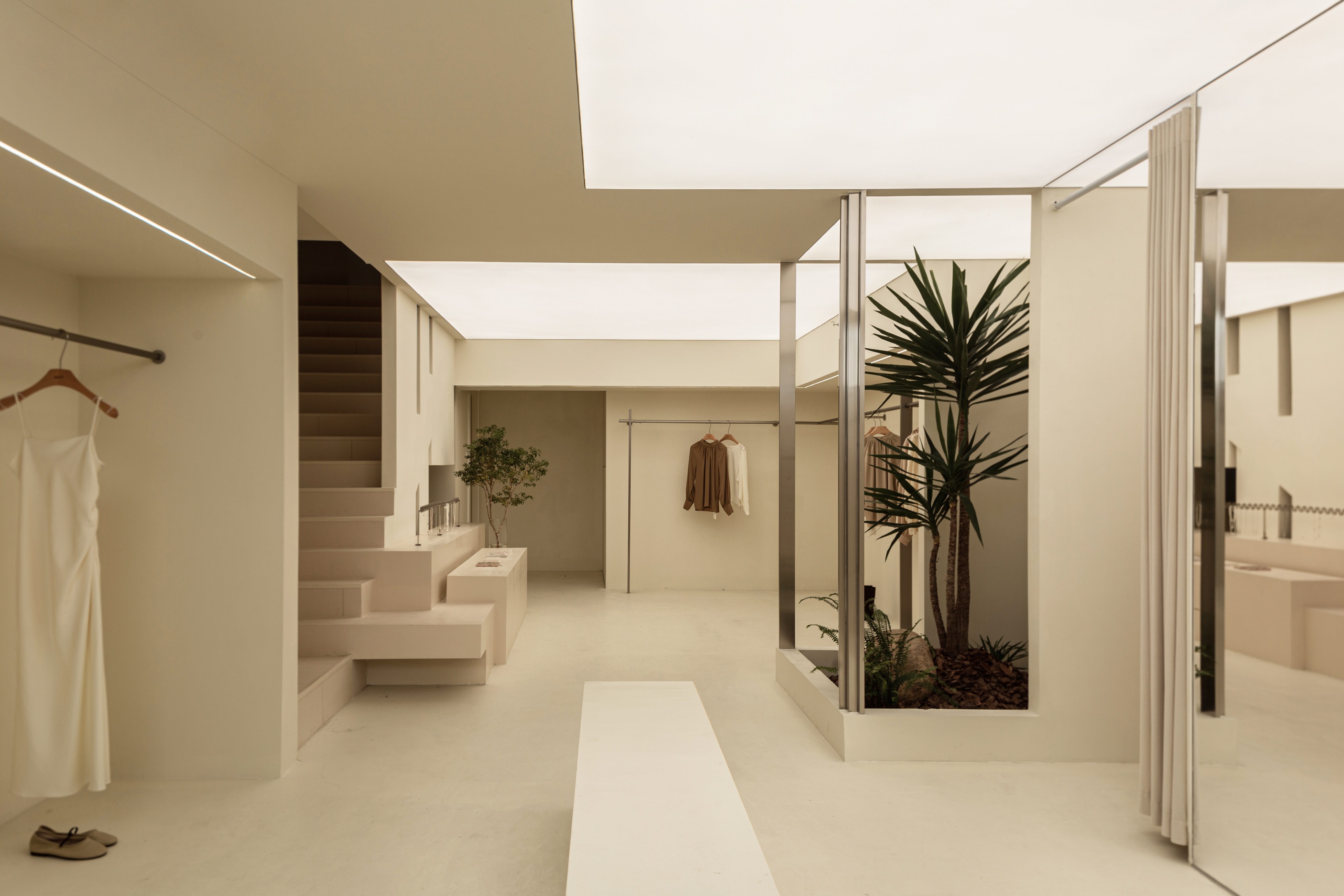 空间布局:将原有外墙内退,采用玻璃分隔内外的方式,既保证了视觉通透性又模糊了室内外的边界感,吧台从室外延伸至室内,集收银、打包与户外休闲功能于一体,绿植以点状式分布在室内外,引入自然,深化与自然共生的理念,客户的动线虽缩短,但在此增加了选衣搭配的趣味性,肌理漆由室外延伸至室内,使空间在色调与质感上更加整体。