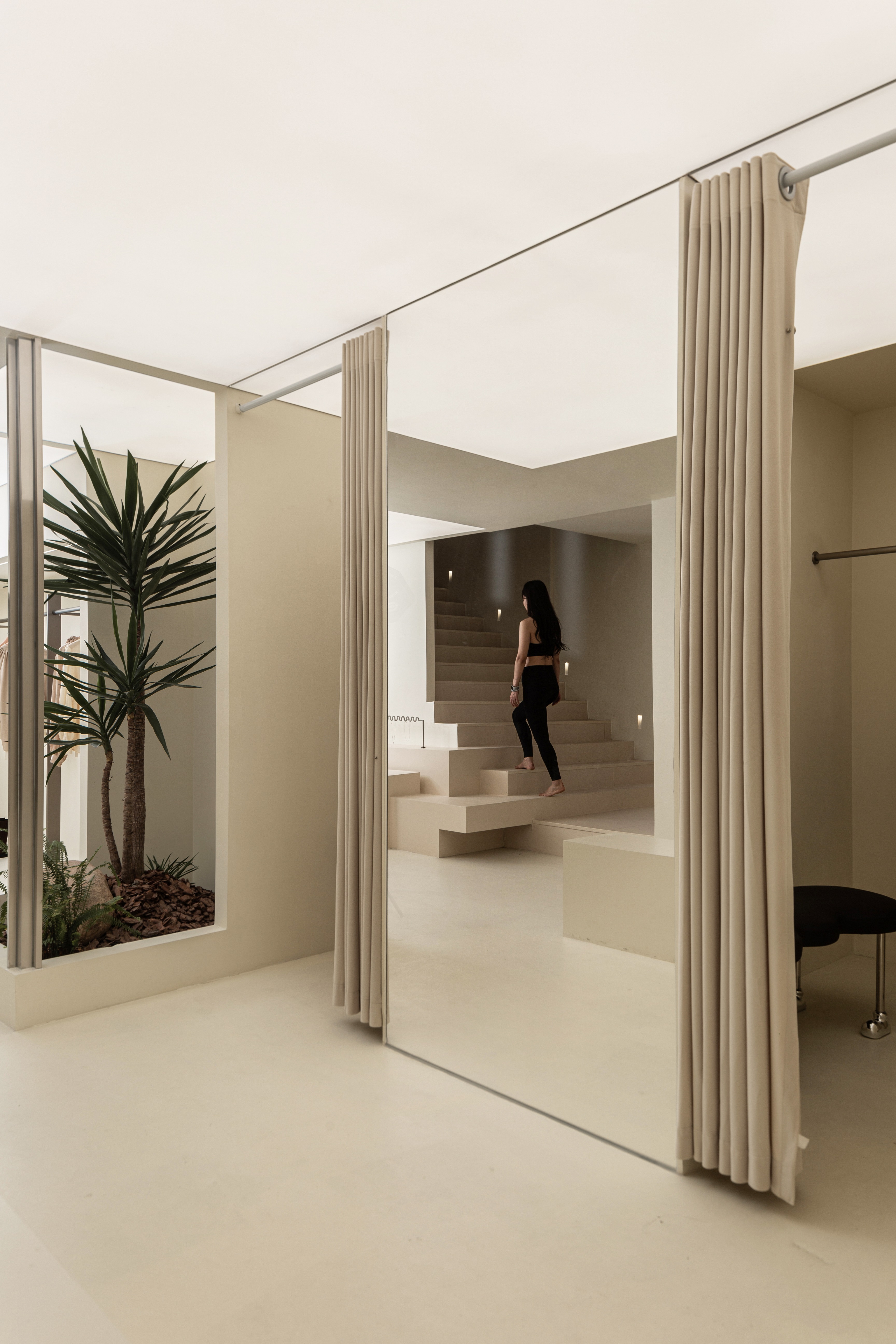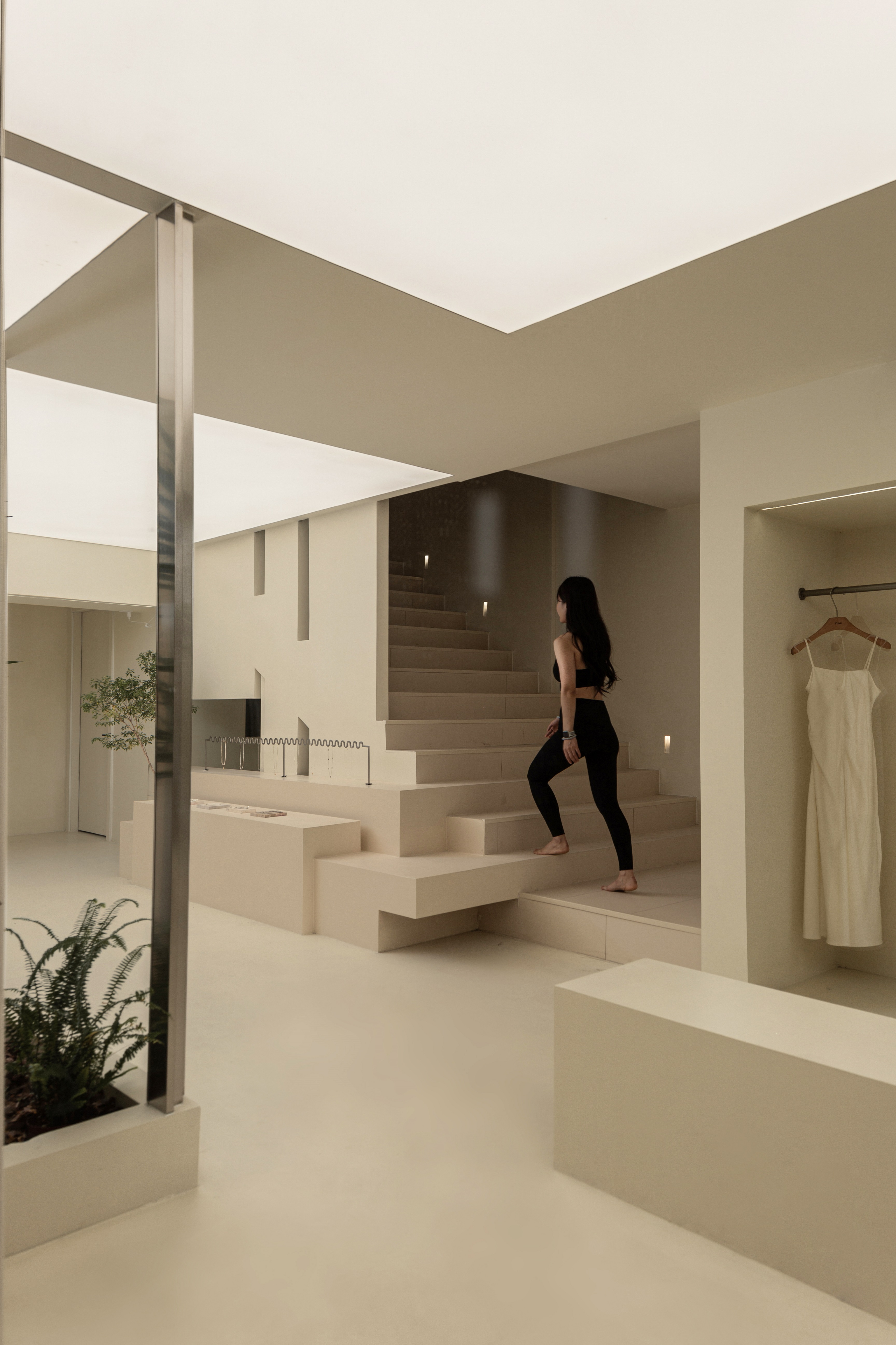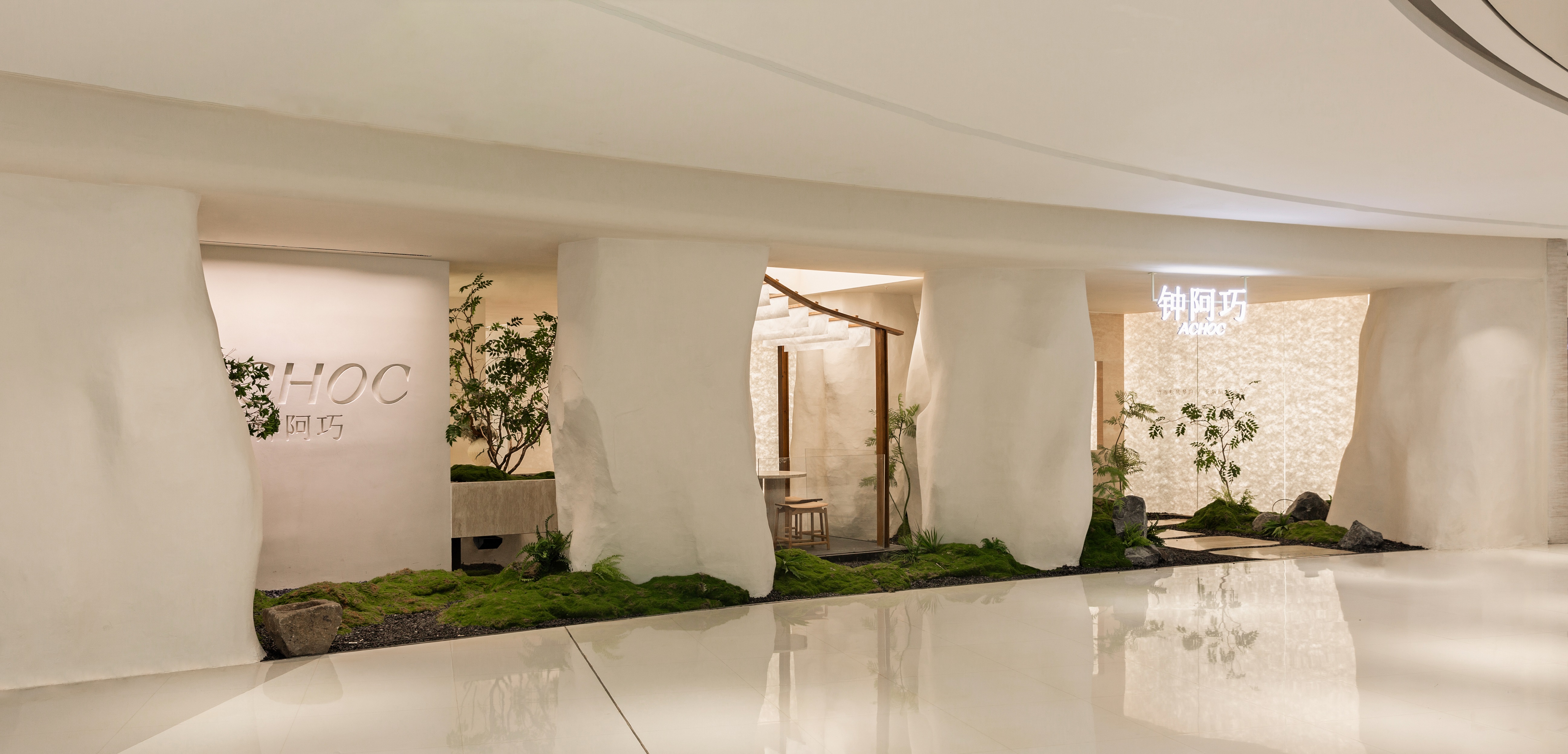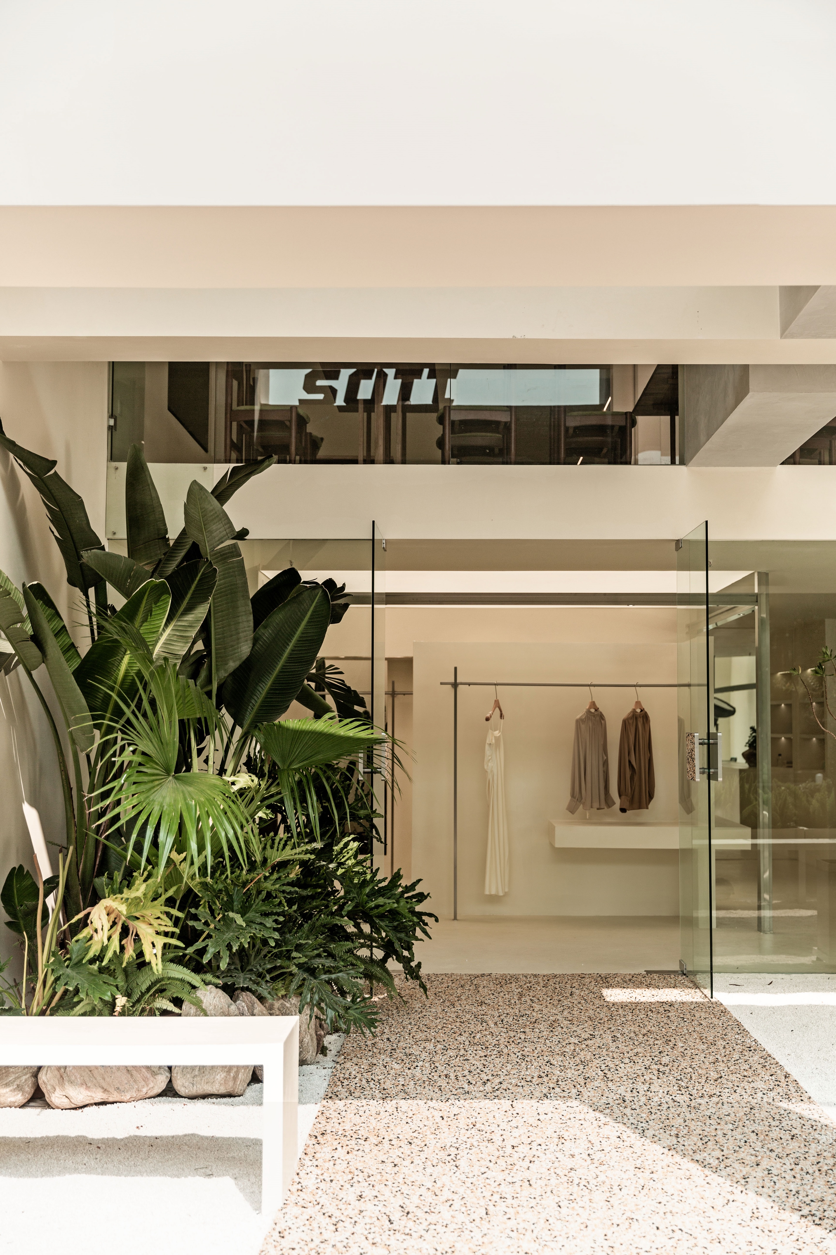 空间布局:将原有外墙内退,采用玻璃分隔内外的方式,既保证了视觉通透性又模糊了室内外的边界感,吧台从室外延伸至室内,集收银、打包与户外休闲功能于一体,绿植以点状式分布在室内外,引入自然,深化与自然共生的理念,客户的动线虽缩短,但在此增加了选衣搭配的趣味性,肌理漆由室外延伸至室内,使空间在色调与质感上更加整体。
