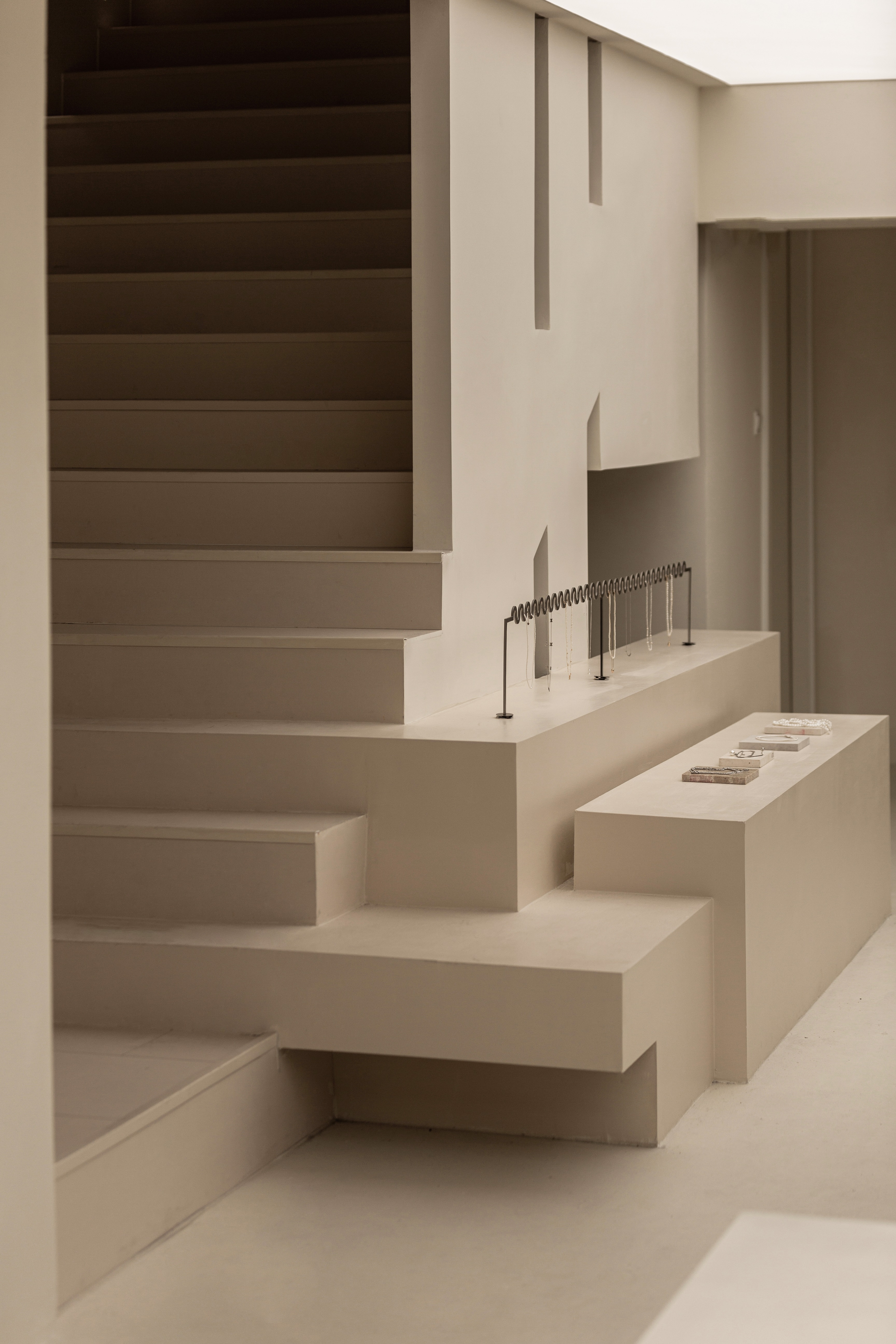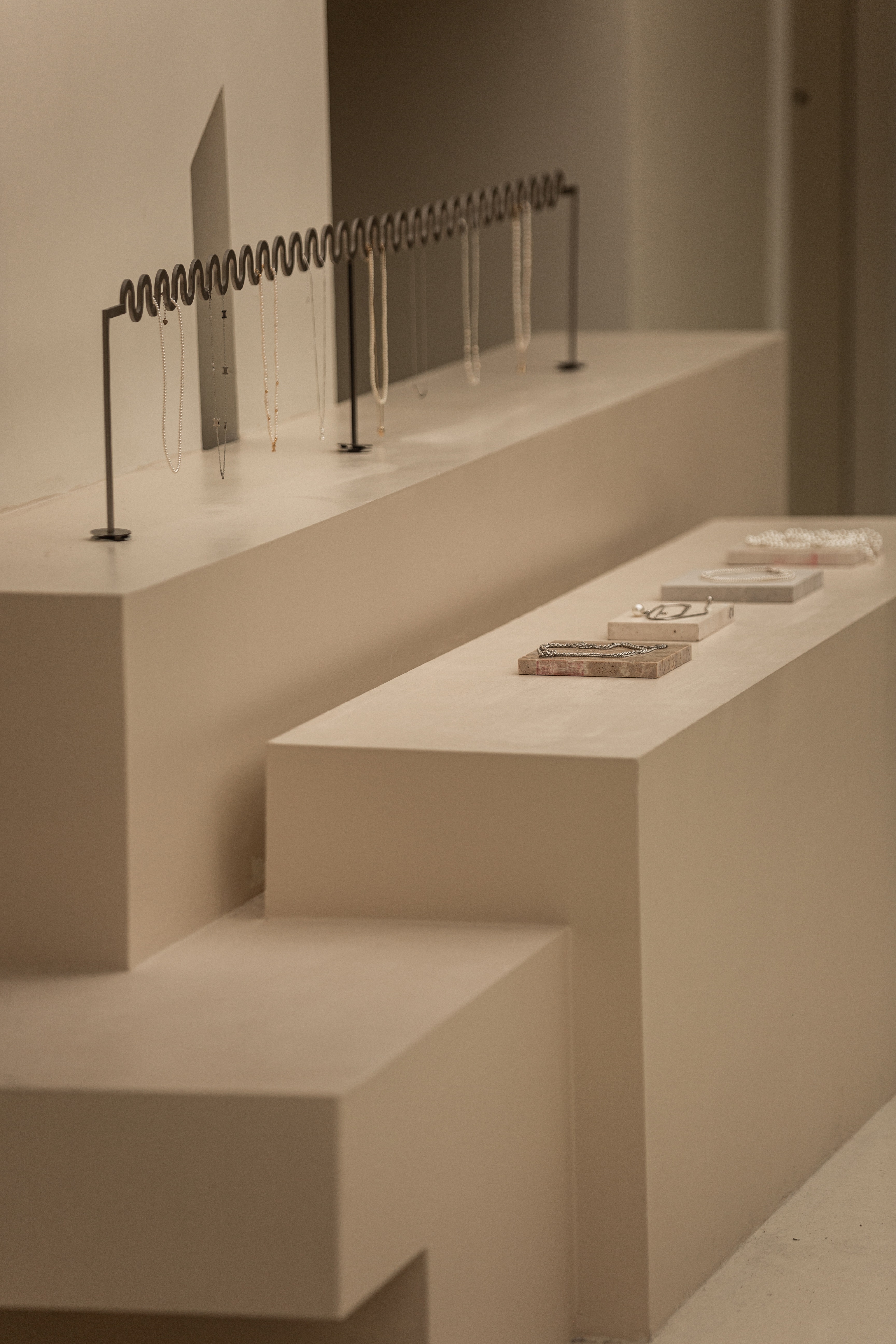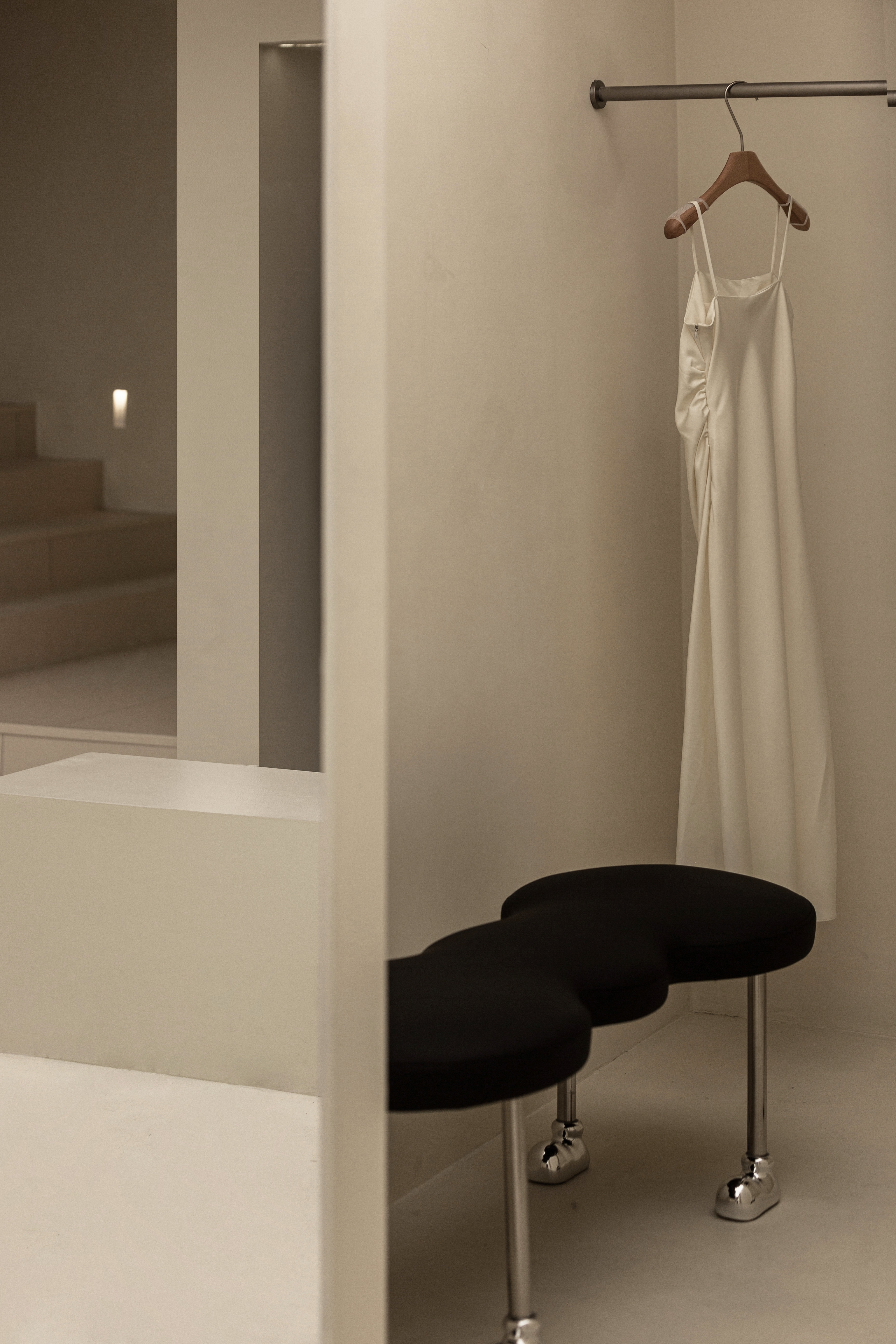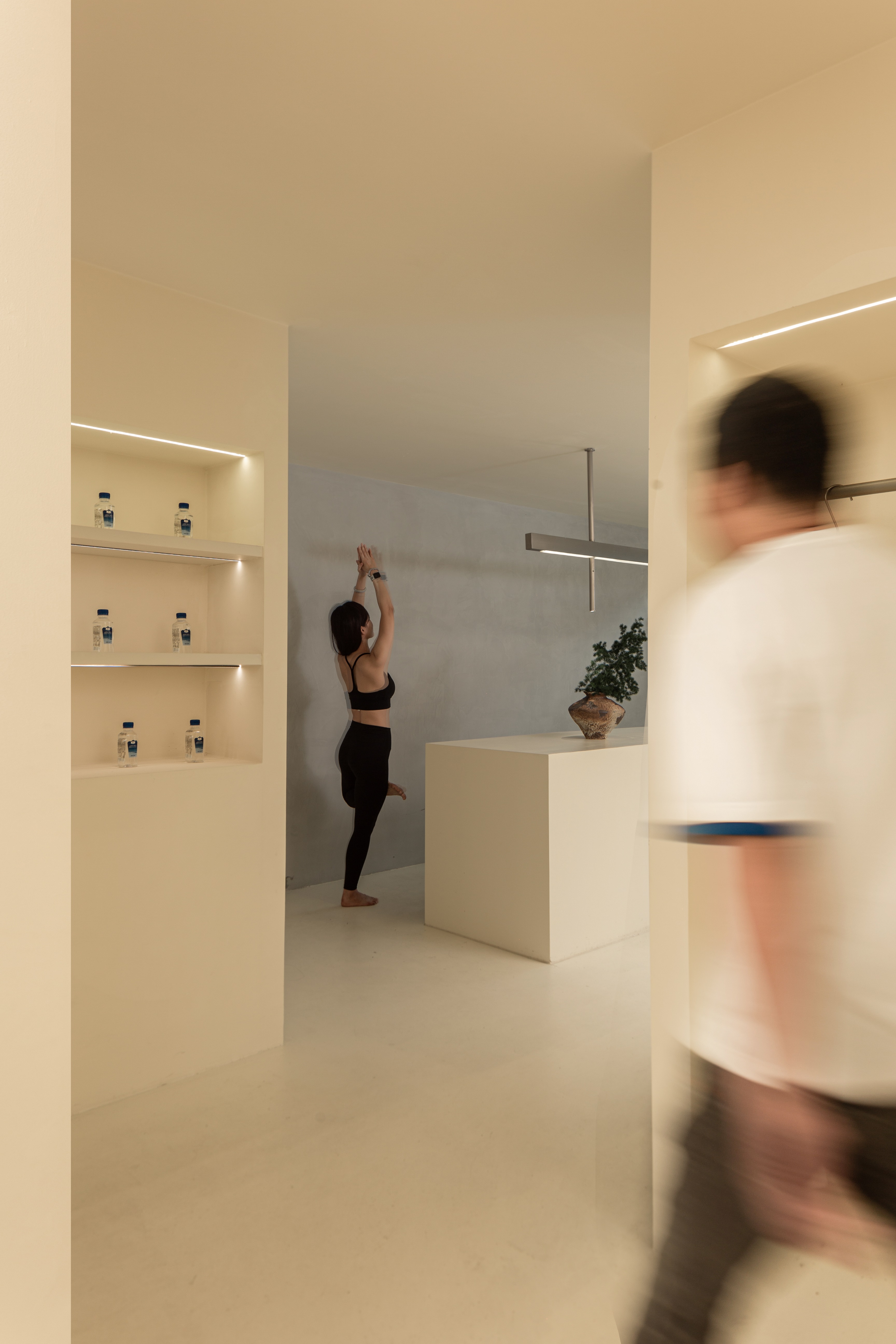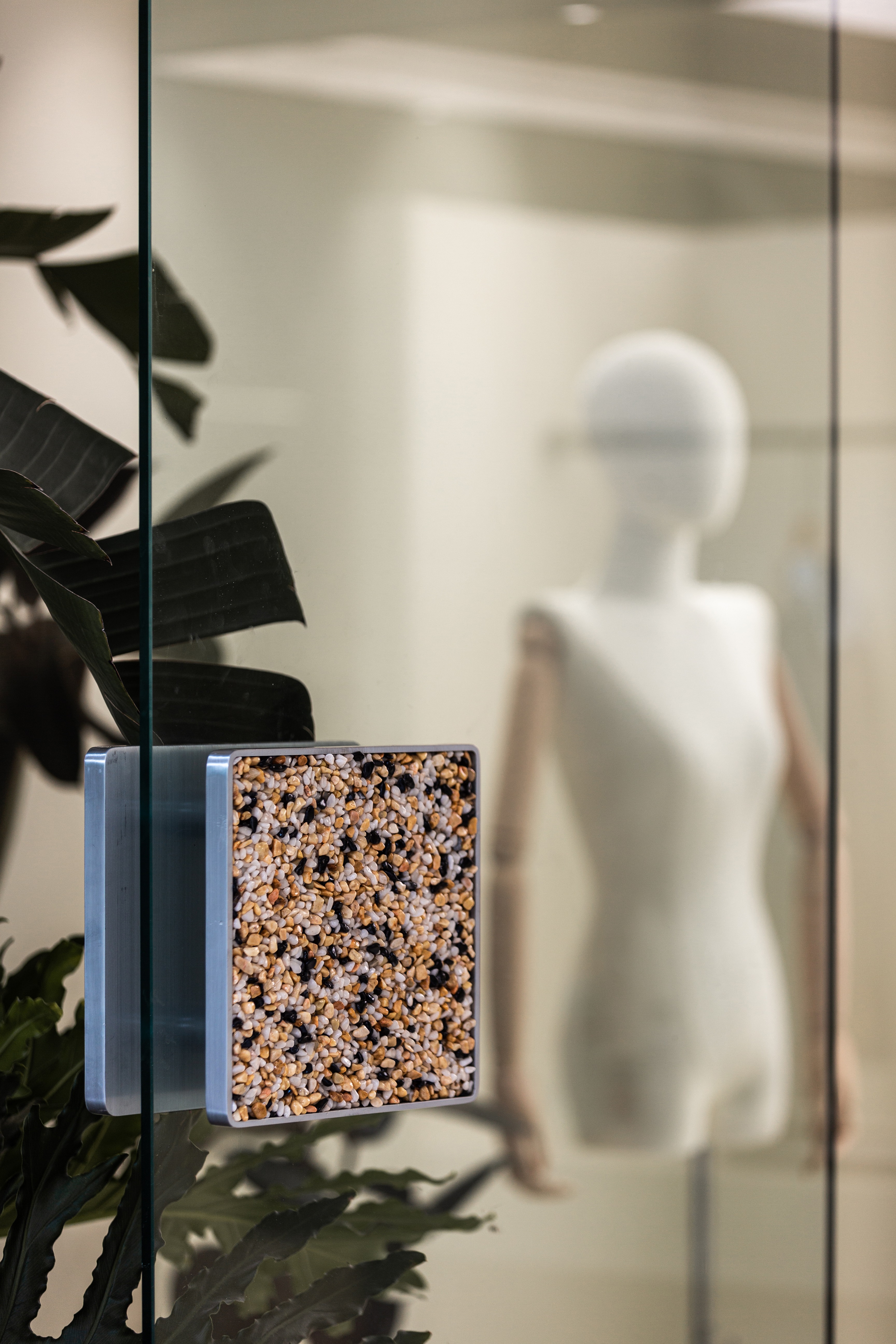 空间布局:将原有外墙内退,采用玻璃分隔内外的方式,既保证了视觉通透性又模糊了室内外的边界感,吧台从室外延伸至室内,集收银、打包与户外休闲功能于一体,绿植以点状式分布在室内外,引入自然,深化与自然共生的理念,客户的动线虽缩短,但在此增加了选衣搭配的趣味性,肌理漆由室外延伸至室内,使空间在色调与质感上更加整体。