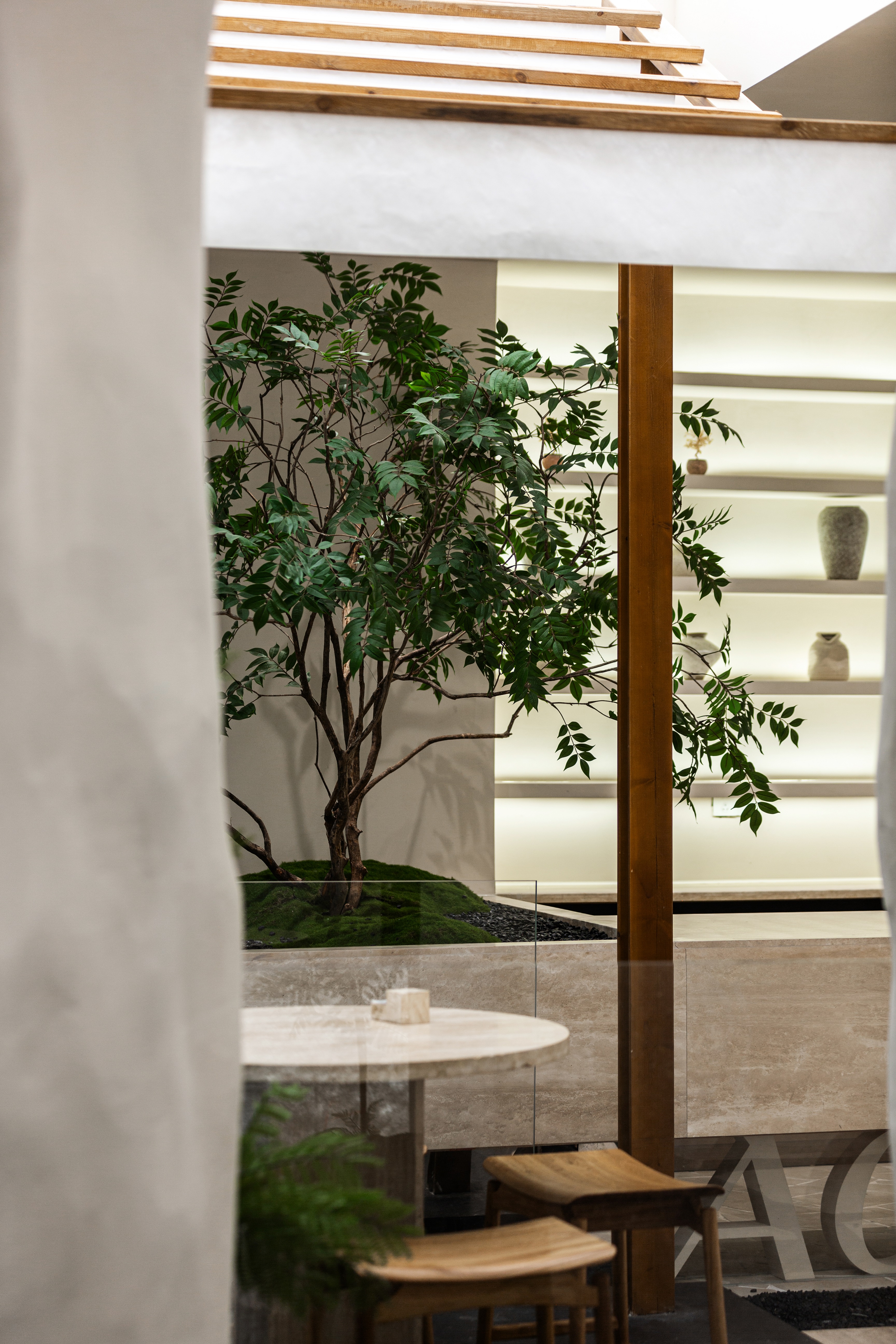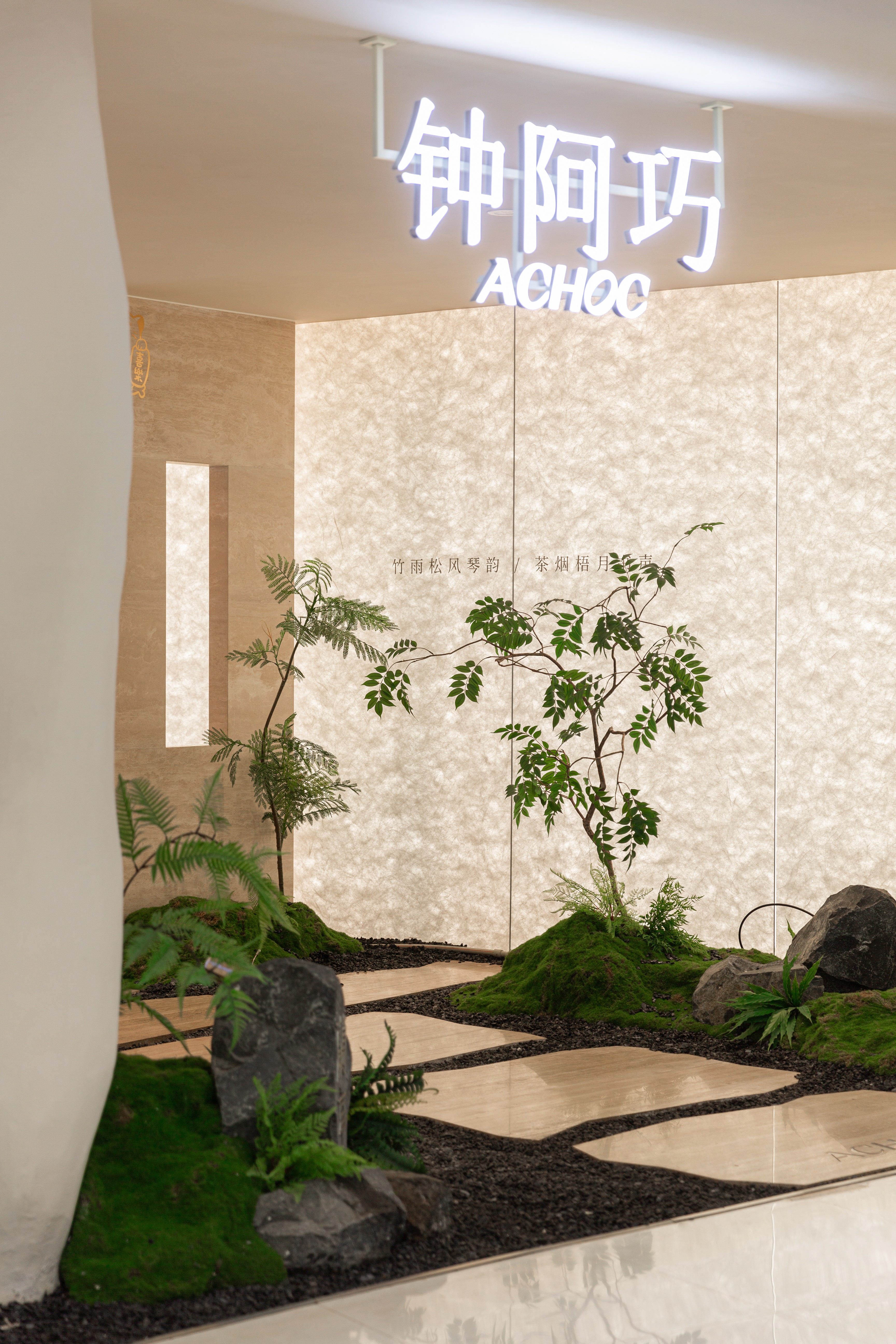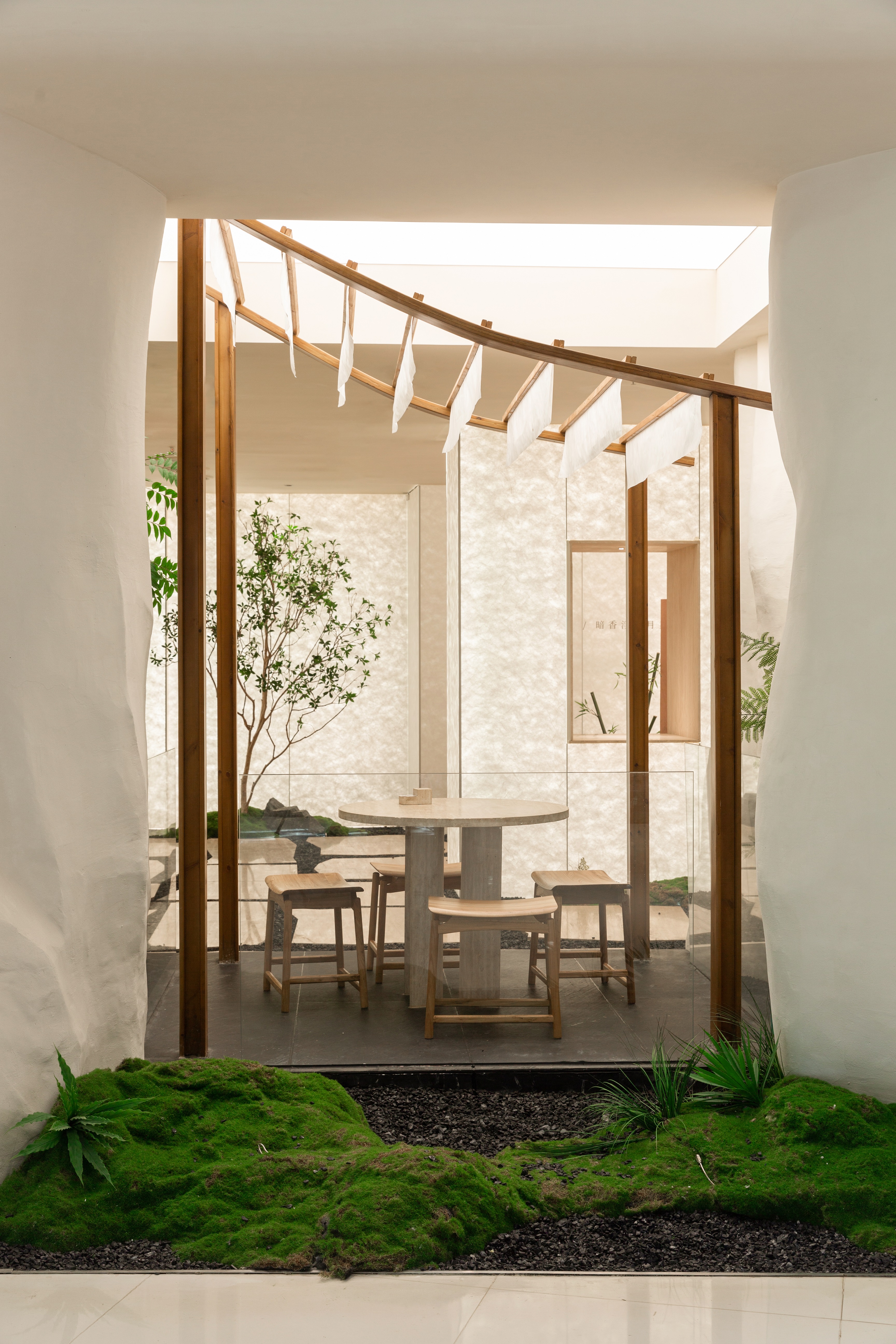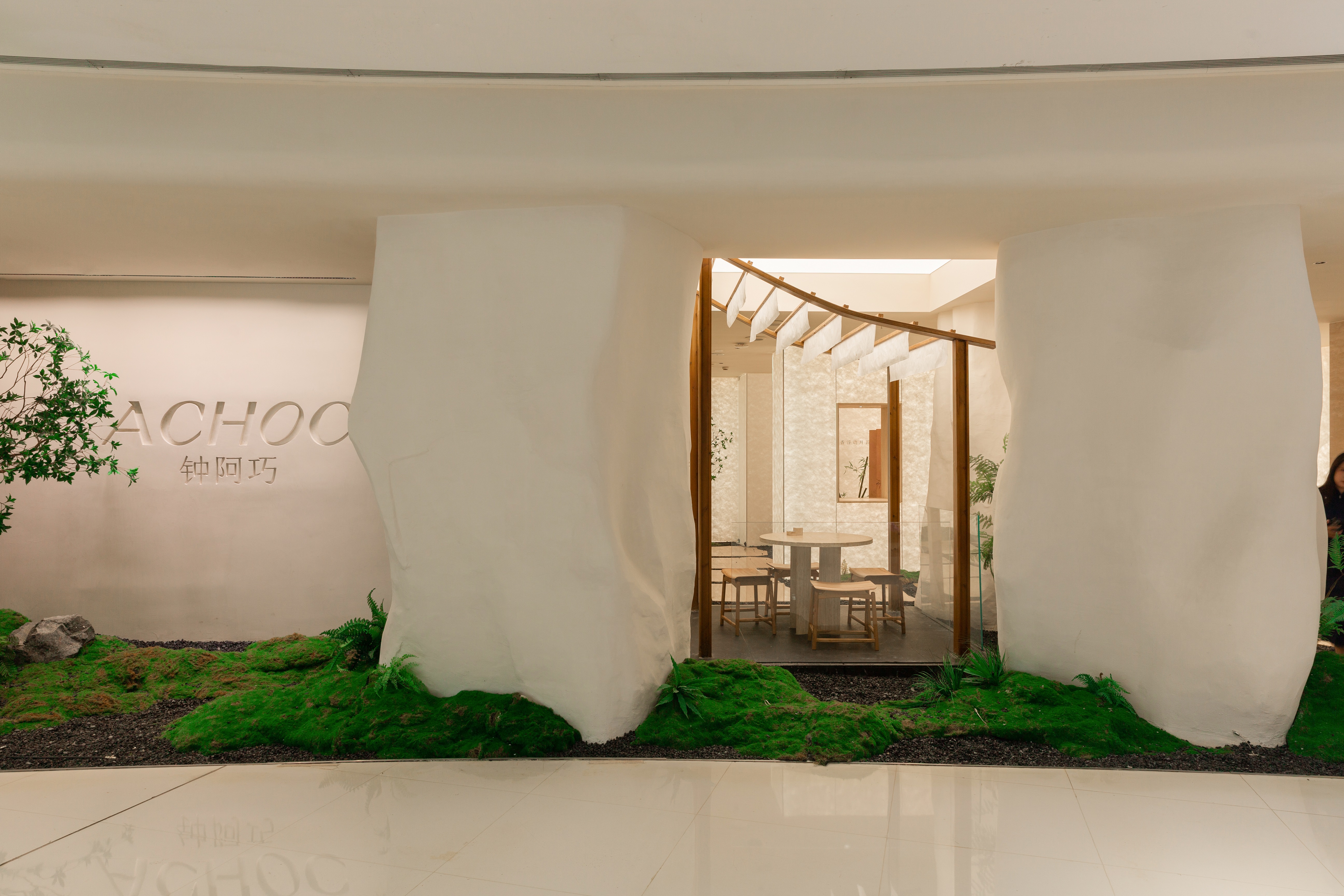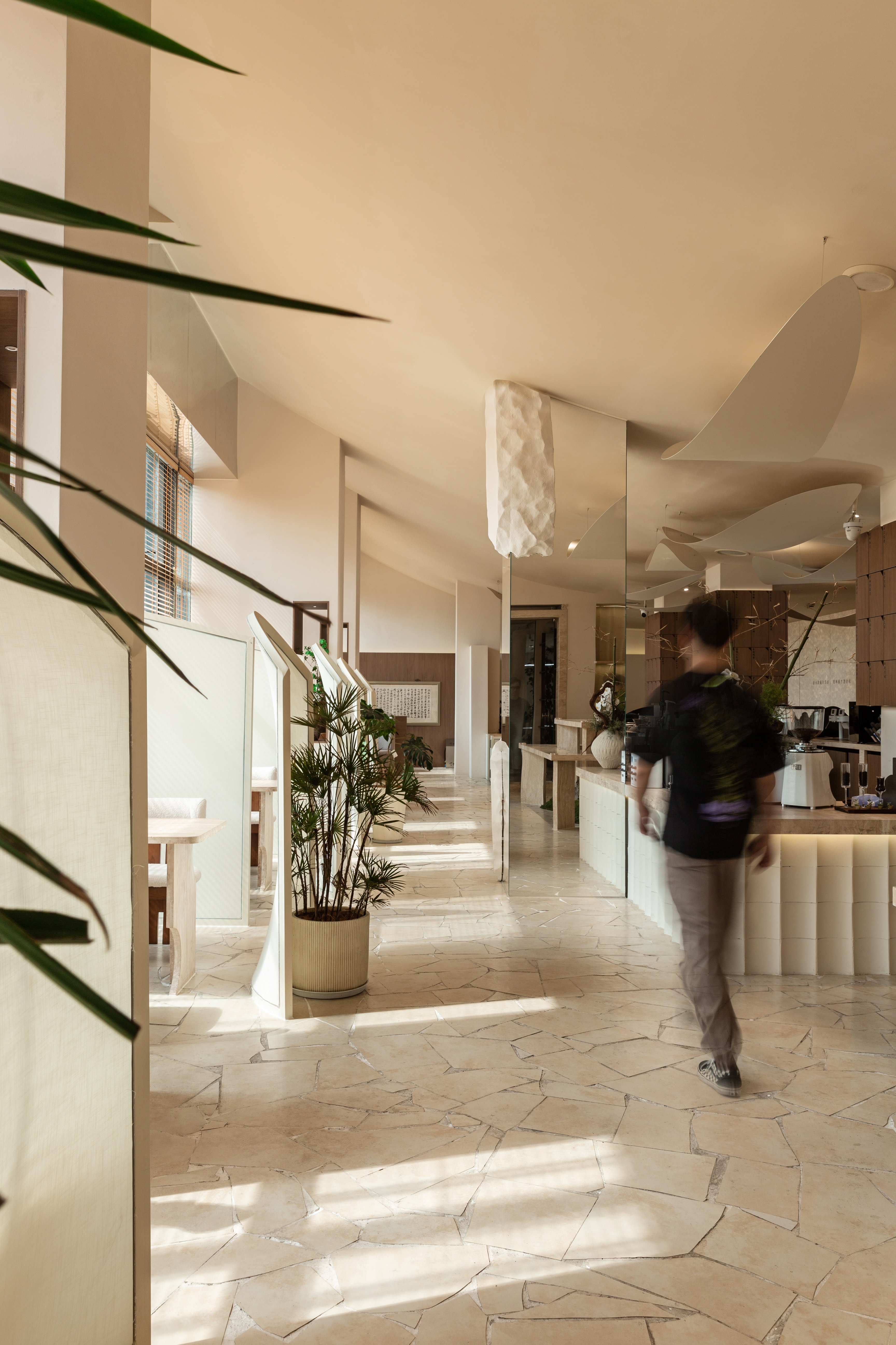空间意境:设计在品牌基因的解读,汲取东方、自然、松弛感的甜品茶饮的特征。我们将前厅释放出来,采用东方语境下的庭院方式作为内部空间和商场之间一段灰空间的连接,采用洞石、纸、木作为包裹纯粹的肌理,不失自然醒的同时凸显个性,而我们利用本就错综复杂的结构柱,用奶油质感的表面包裹,采用视觉符号性的表达。洞石质感的汀步围绕其自然铺设,牵引访客随动线游观入里。过程中或盘膝而坐,或亭下小憩,从而形成与场域与情绪缓慢舒展,塑造松弛平和。