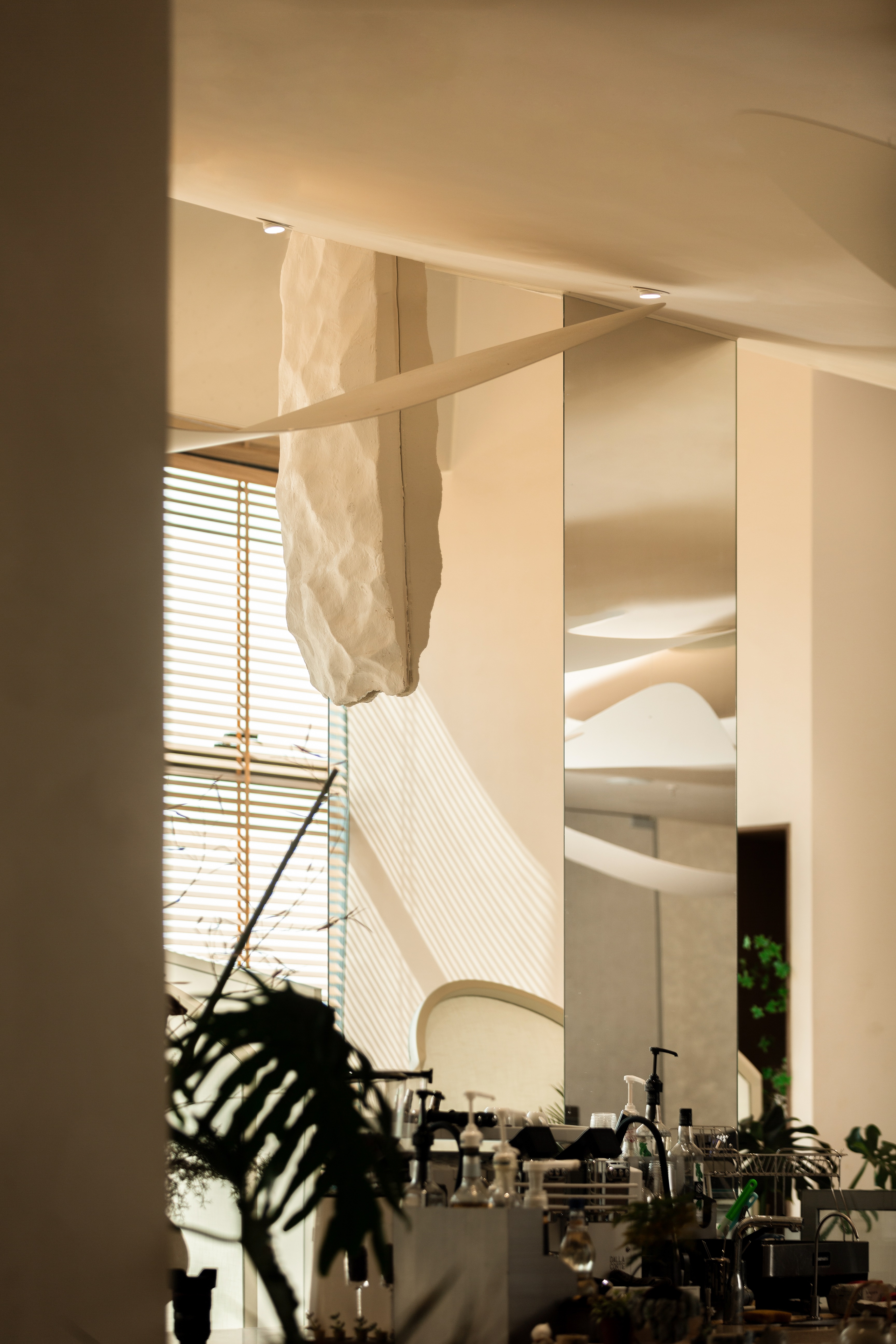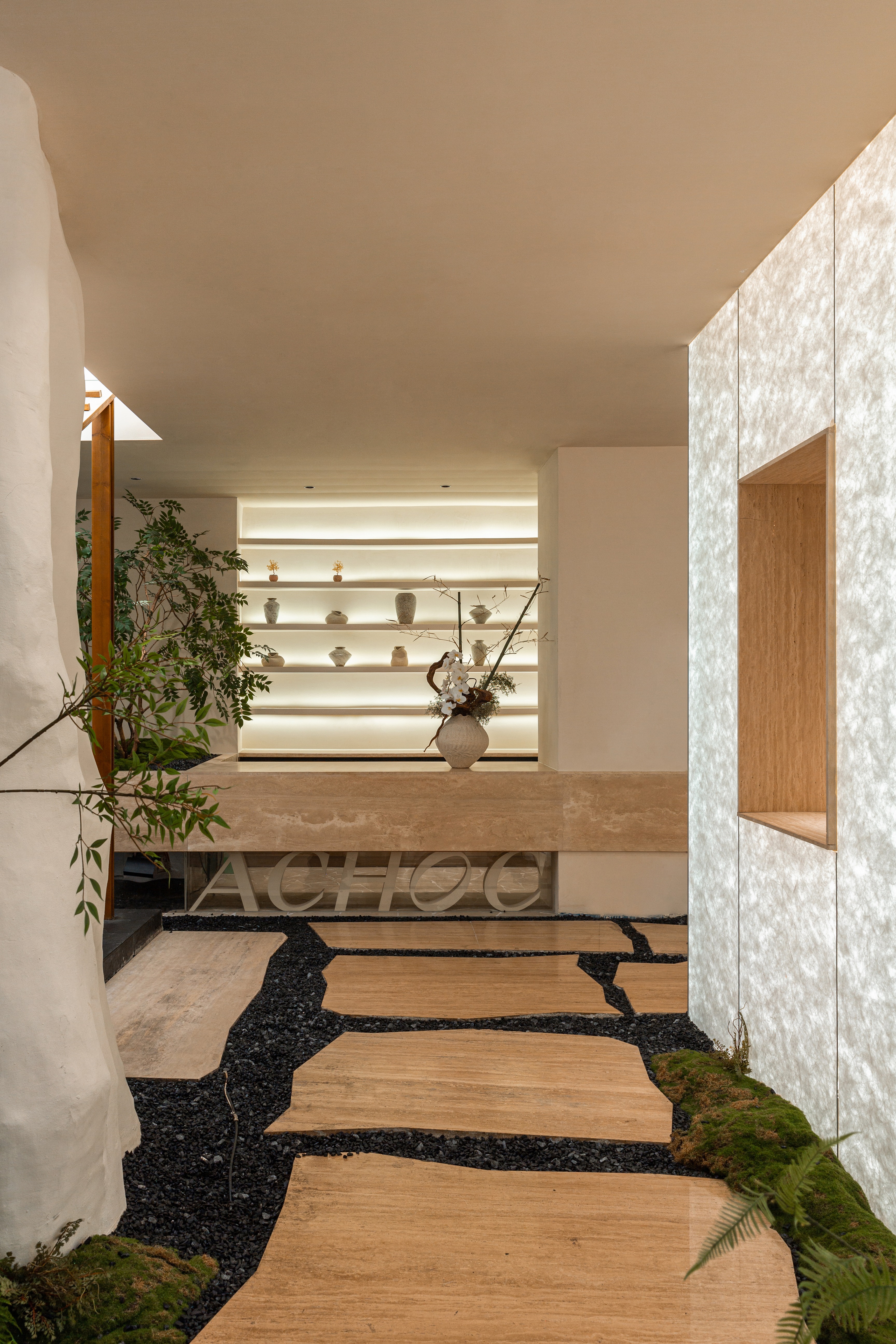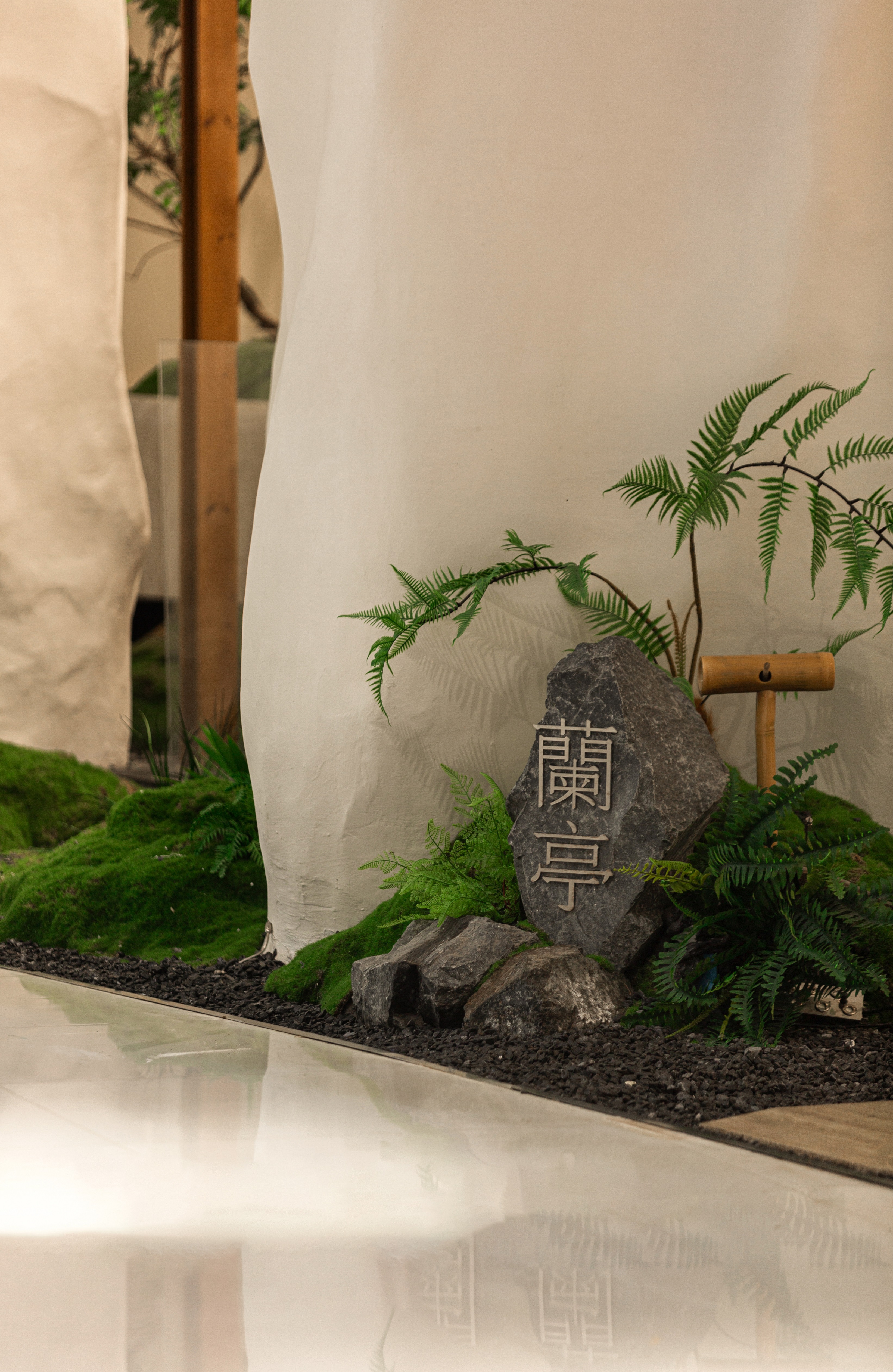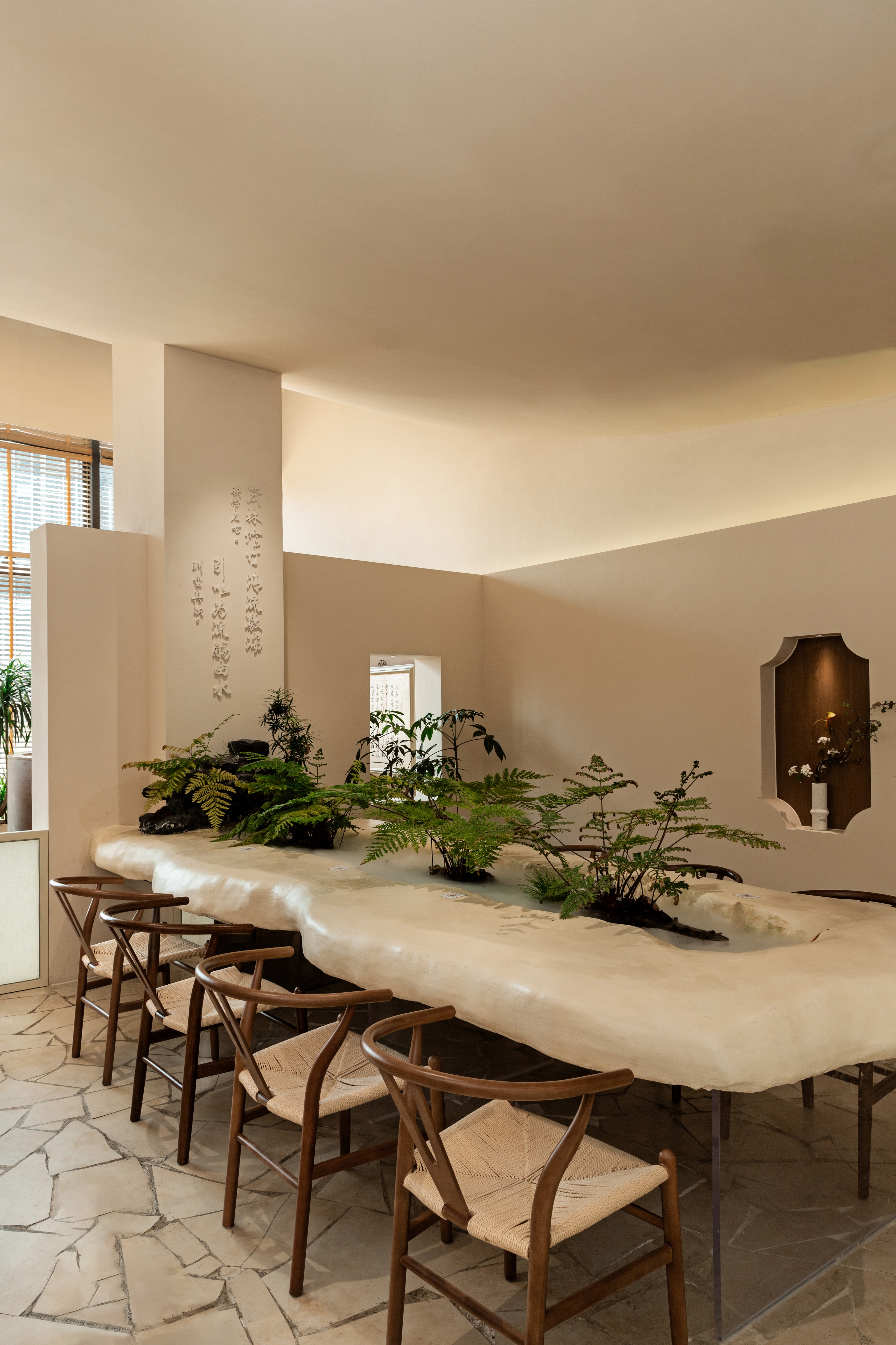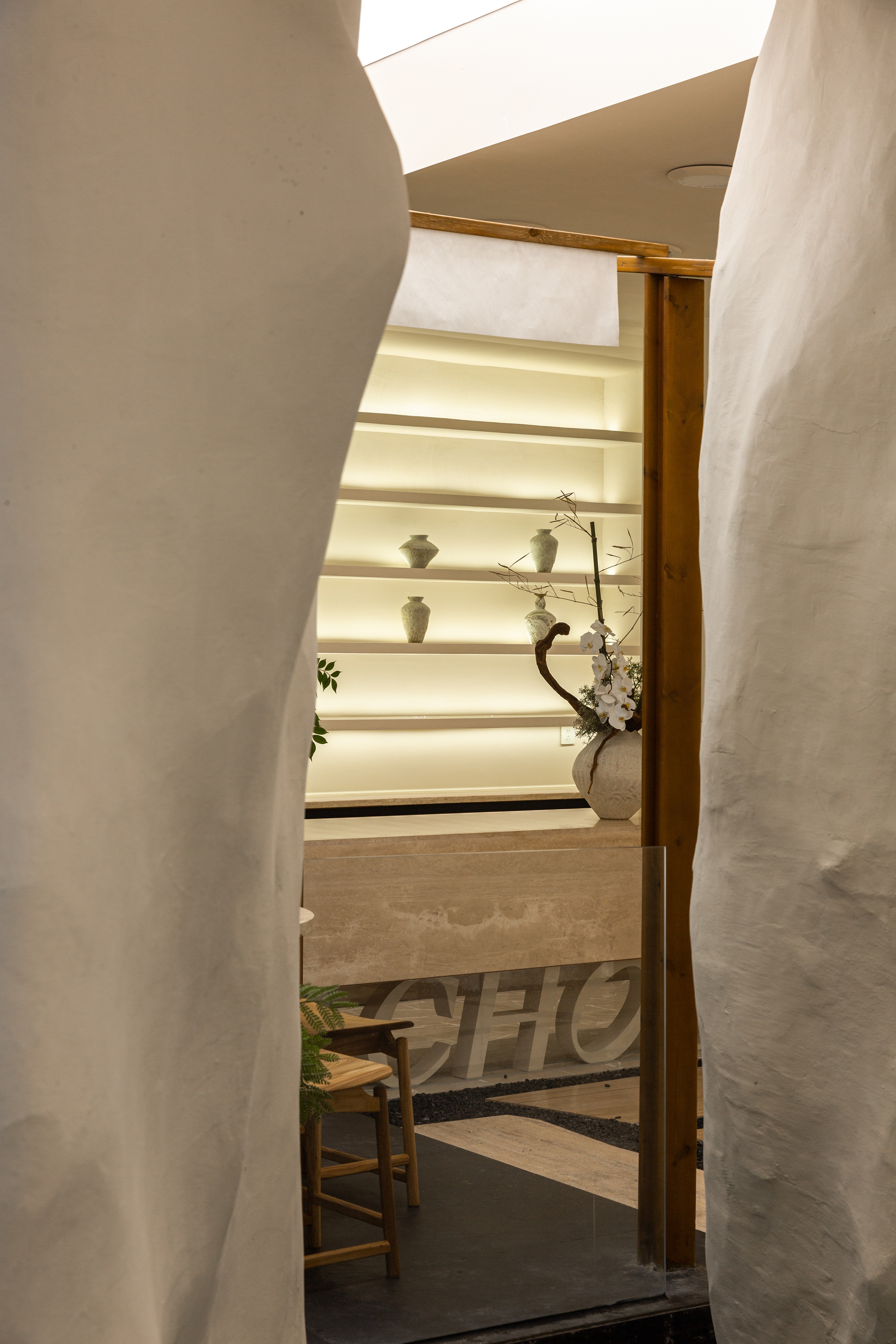 空间意境:设计在品牌基因的解读,汲取东方、自然、松弛感的甜品茶饮的特征。我们将前厅释放出来,采用东方语境下的庭院方式作为内部空间和商场之间一段灰空间的连接,采用洞石、纸、木作为包裹纯粹的肌理,不失自然醒的同时凸显个性,而我们利用本就错综复杂的结构柱,用奶油质感的表面包裹,采用视觉符号性的表达。洞石质感的汀步围绕其自然铺设,牵引访客随动线游观入里。过程中或盘膝而坐,或亭下小憩,从而形成与场域与情绪缓慢舒展,塑造松弛平和。