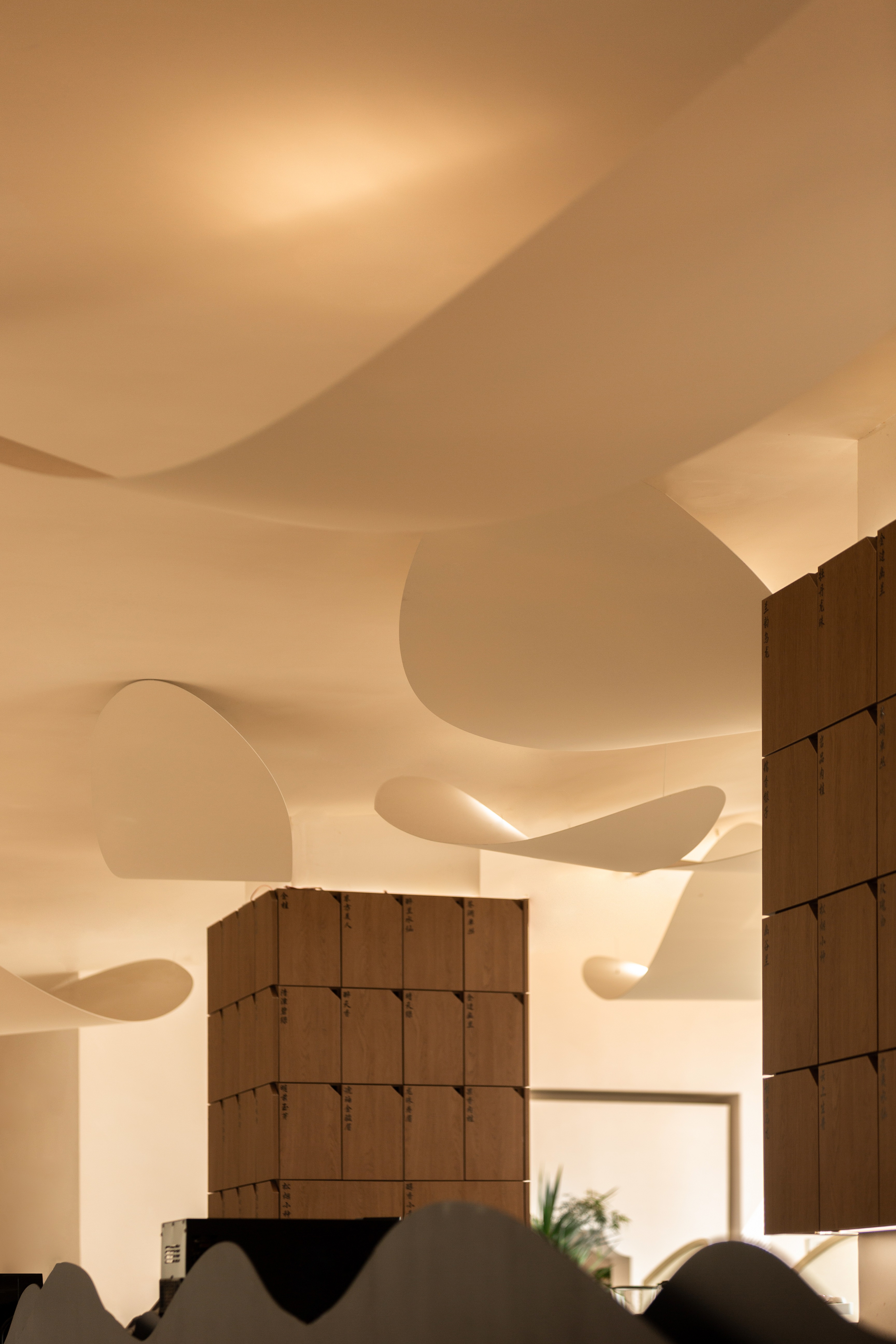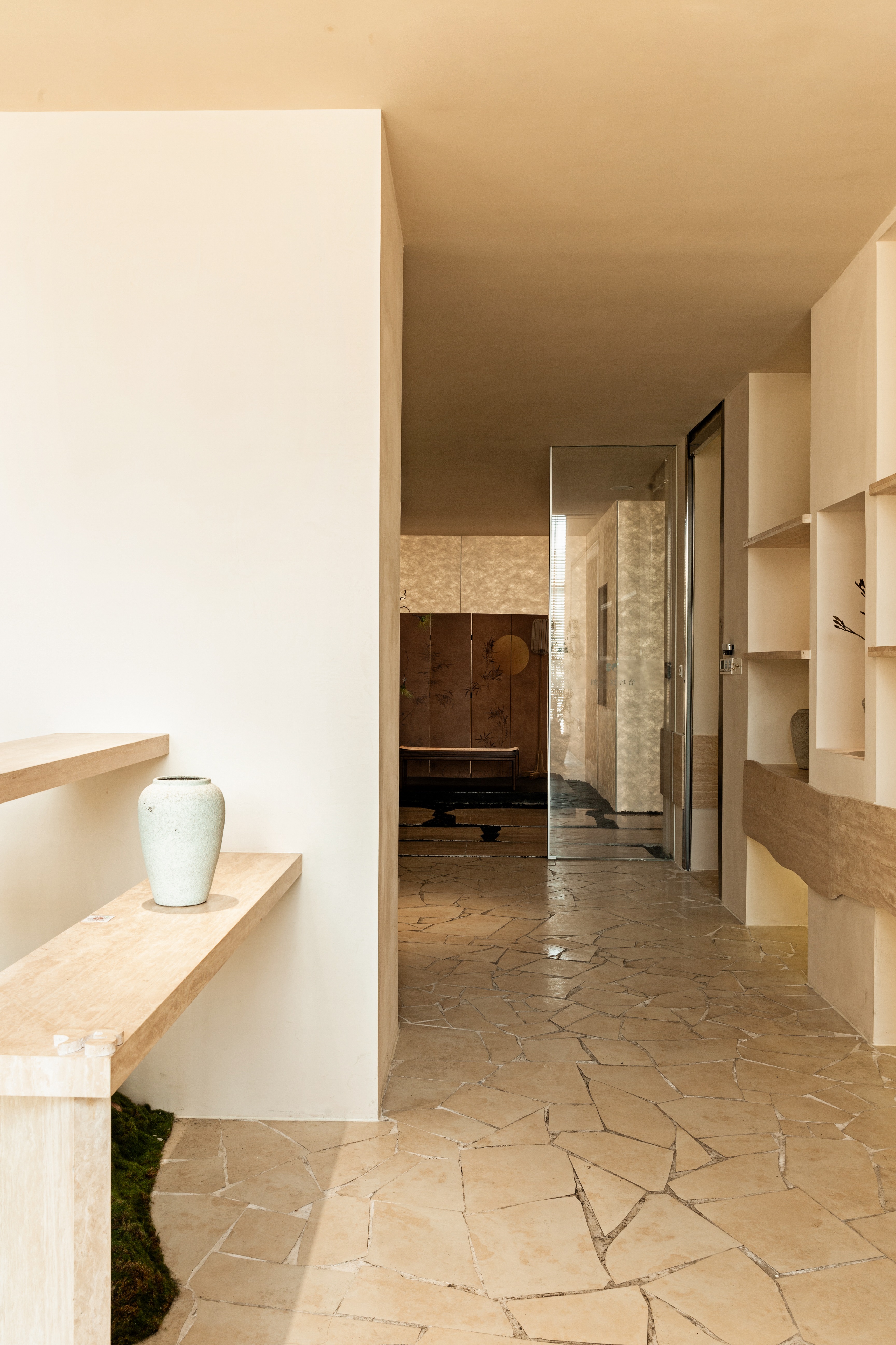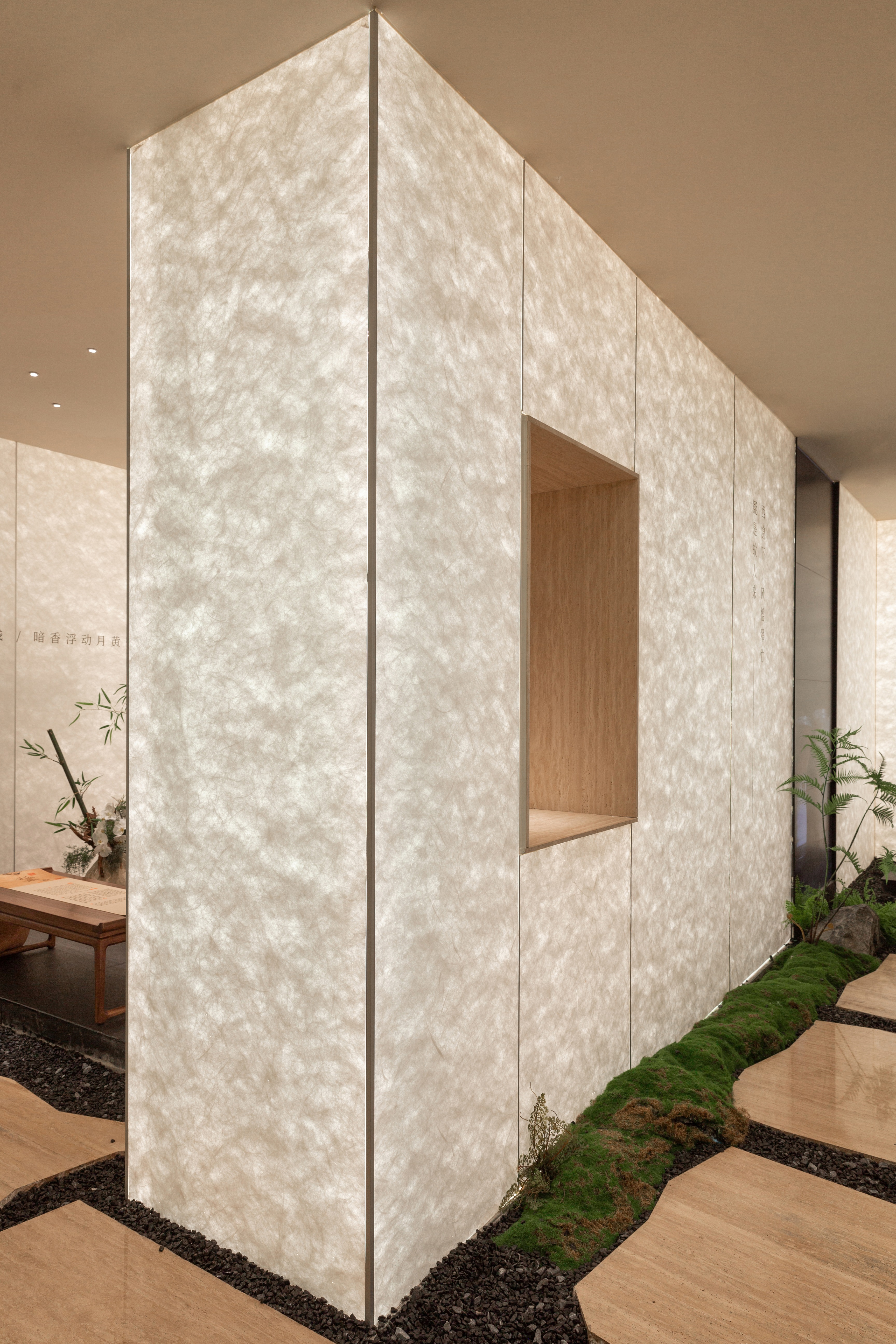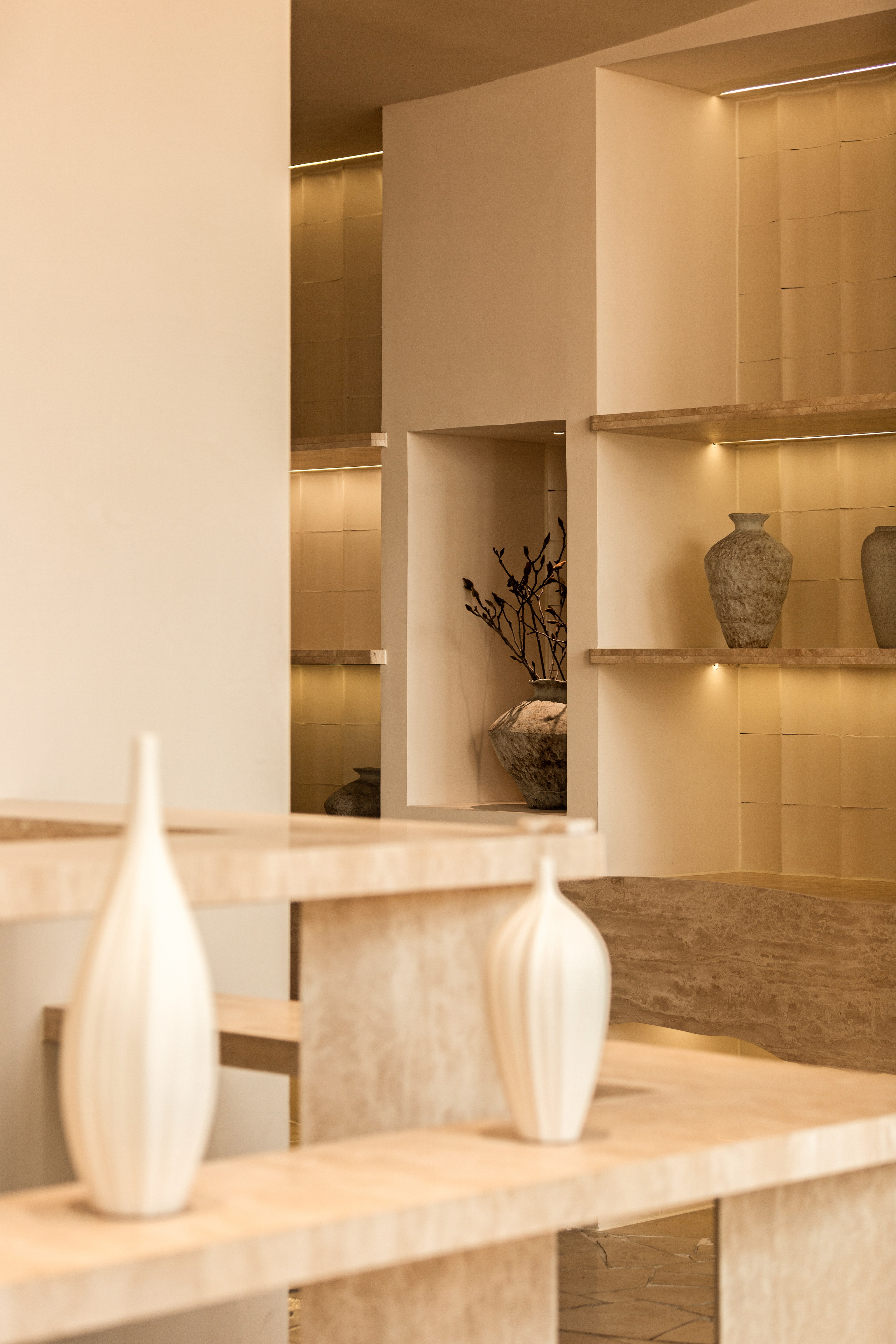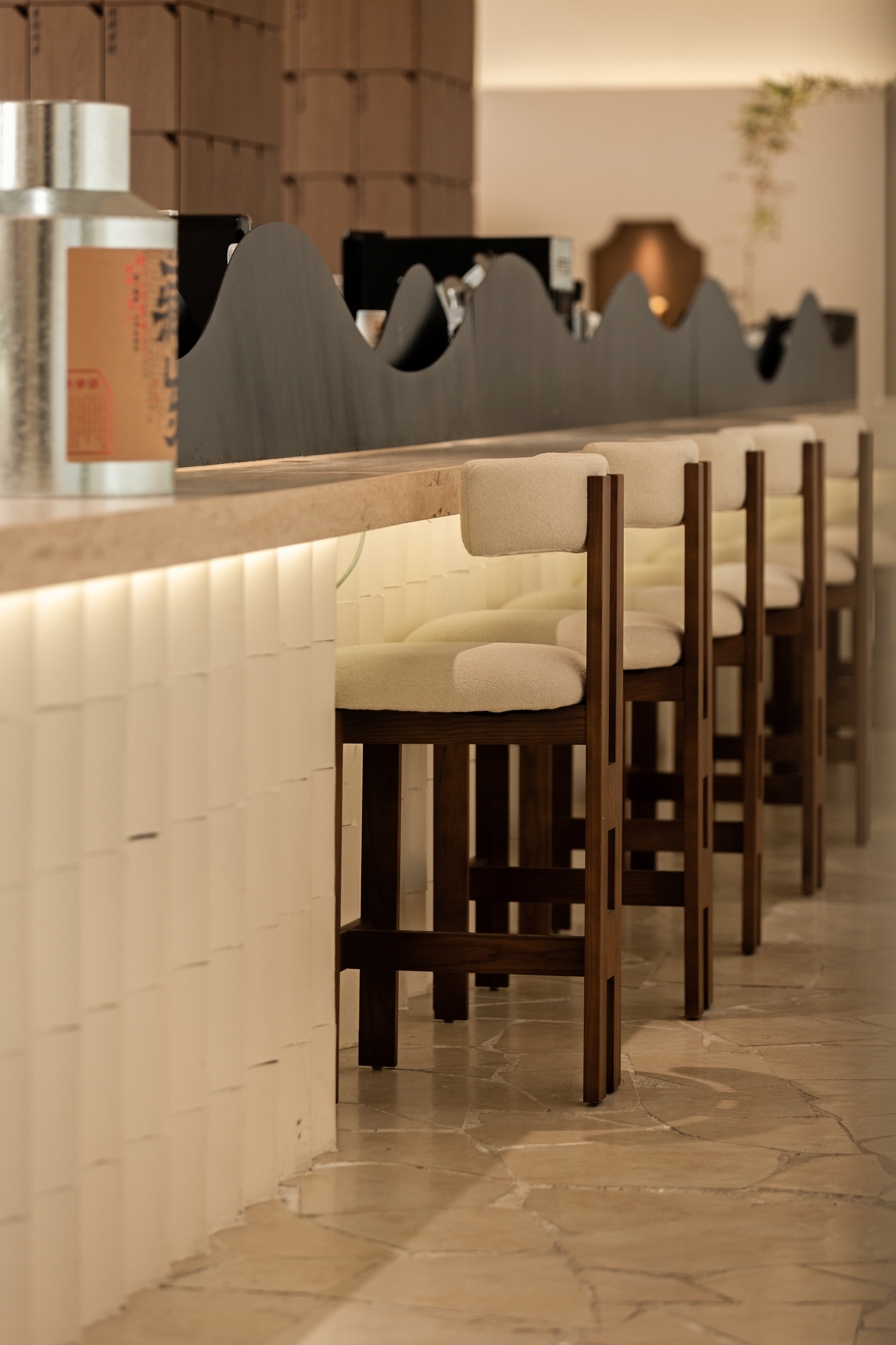 空间意境:设计在品牌基因的解读,汲取东方、自然、松弛感的甜品茶饮的特征。我们将前厅释放出来,采用东方语境下的庭院方式作为内部空间和商场之间一段灰空间的连接,采用洞石、纸、木作为包裹纯粹的肌理,不失自然醒的同时凸显个性,而我们利用本就错综复杂的结构柱,用奶油质感的表面包裹,采用视觉符号性的表达。洞石质感的汀步围绕其自然铺设,牵引访客随动线游观入里。过程中或盘膝而坐,或亭下小憩,从而形成与场域与情绪缓慢舒展,塑造松弛平和。
