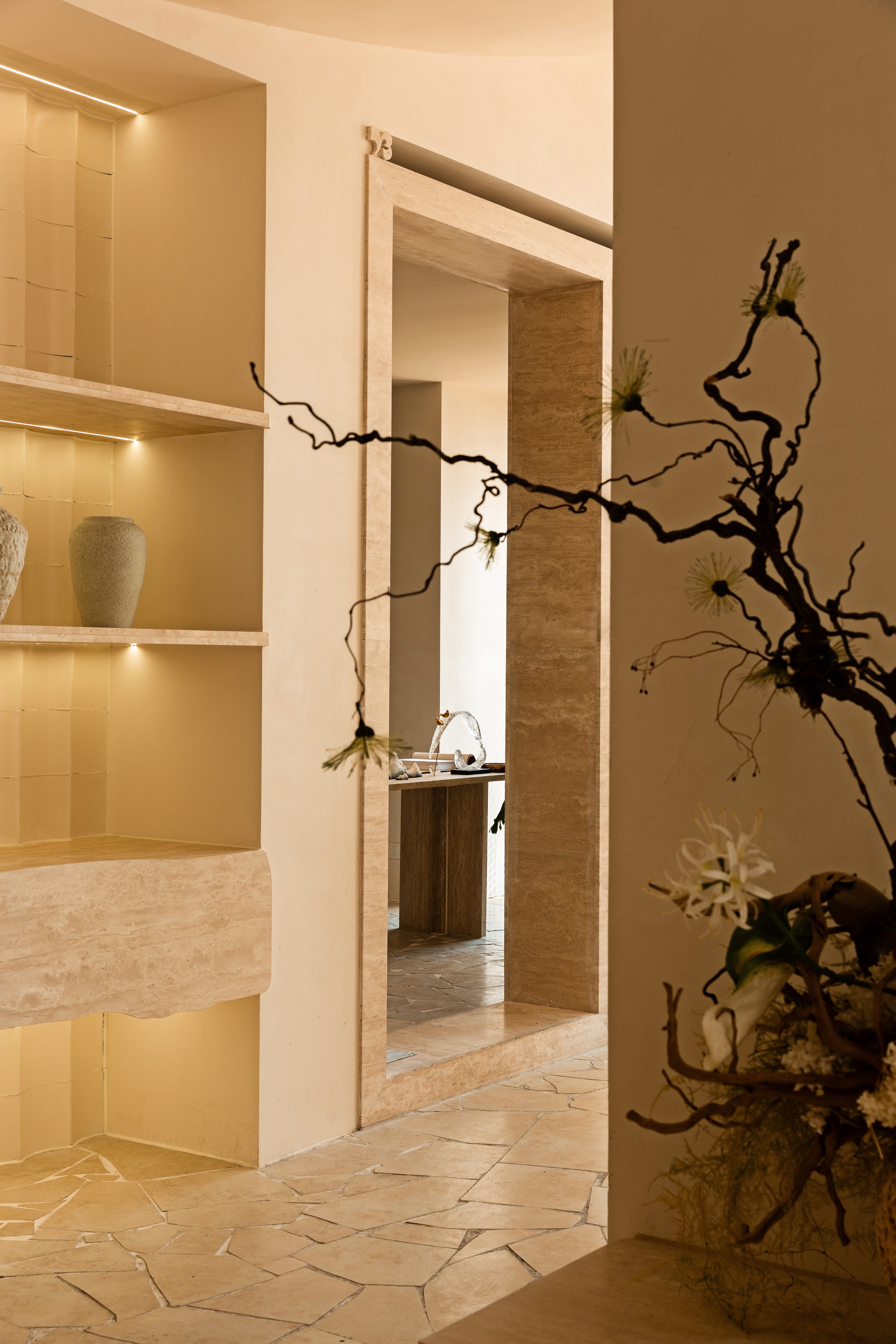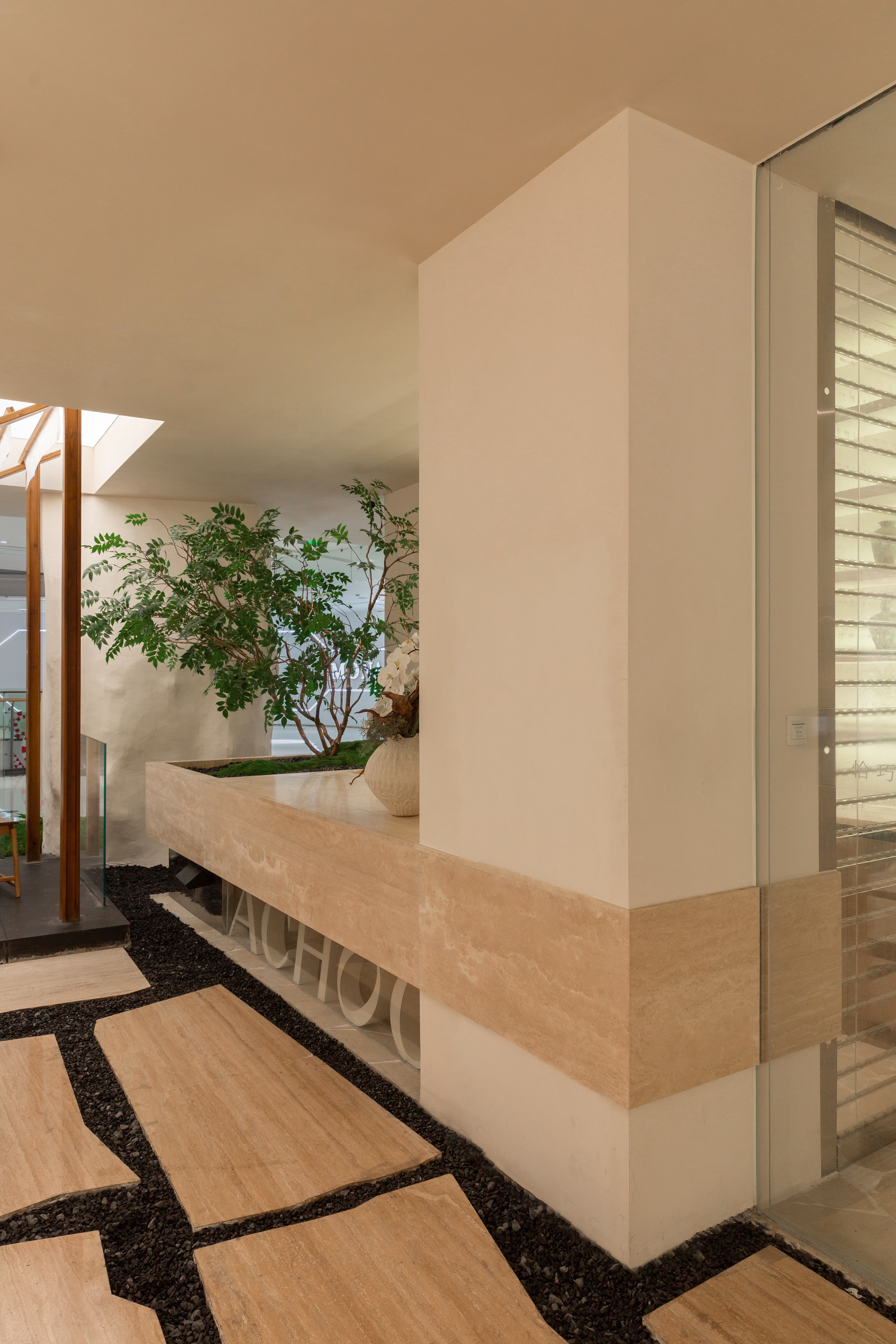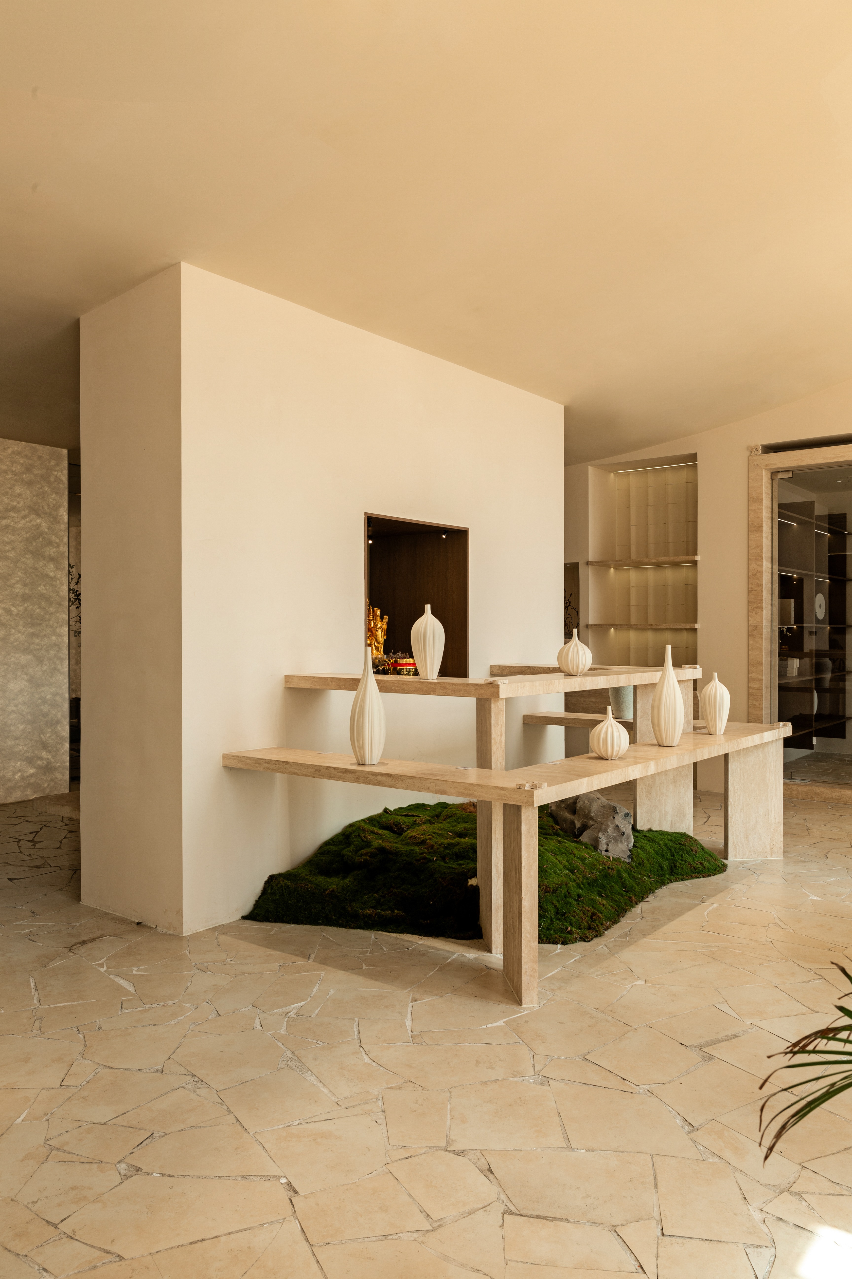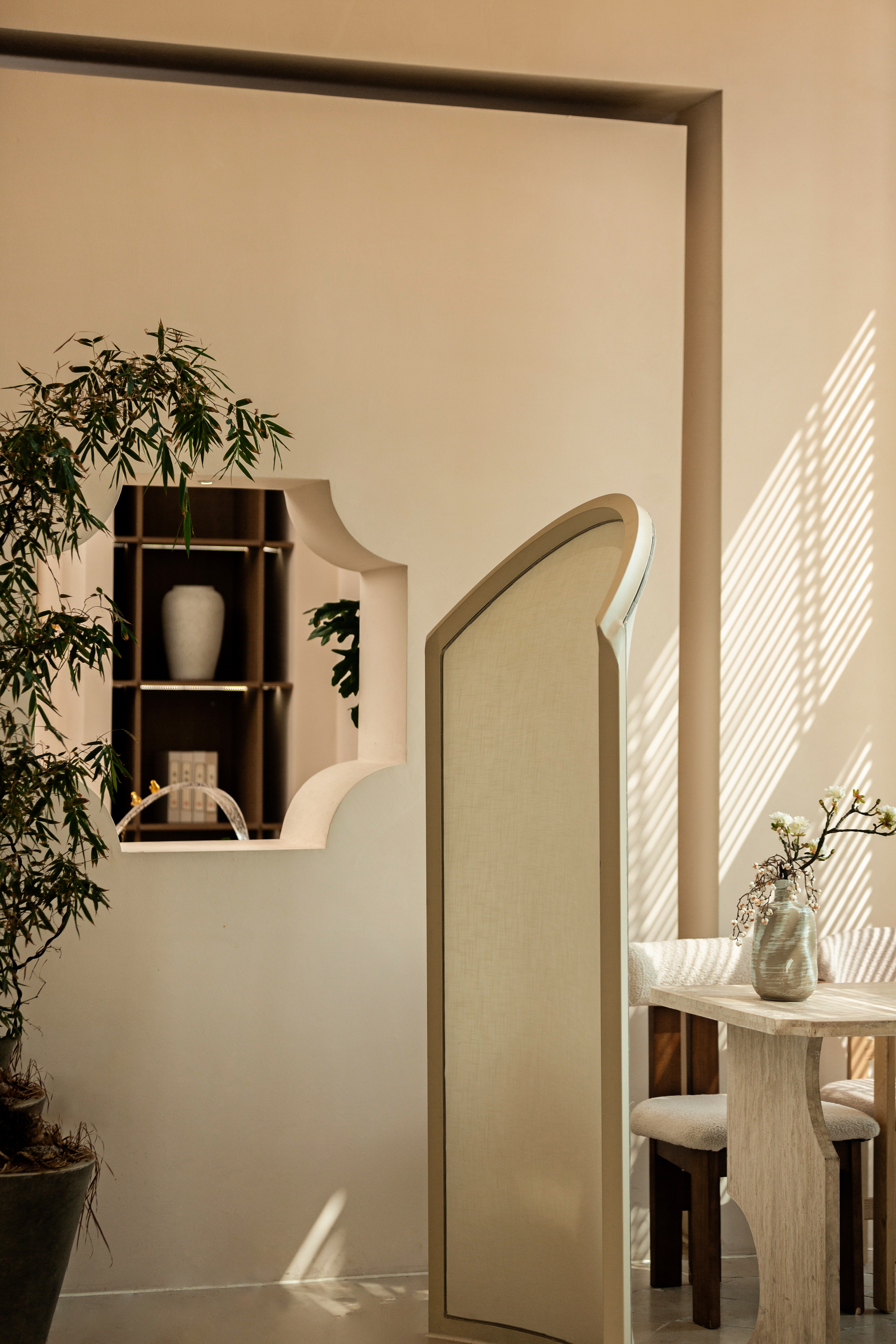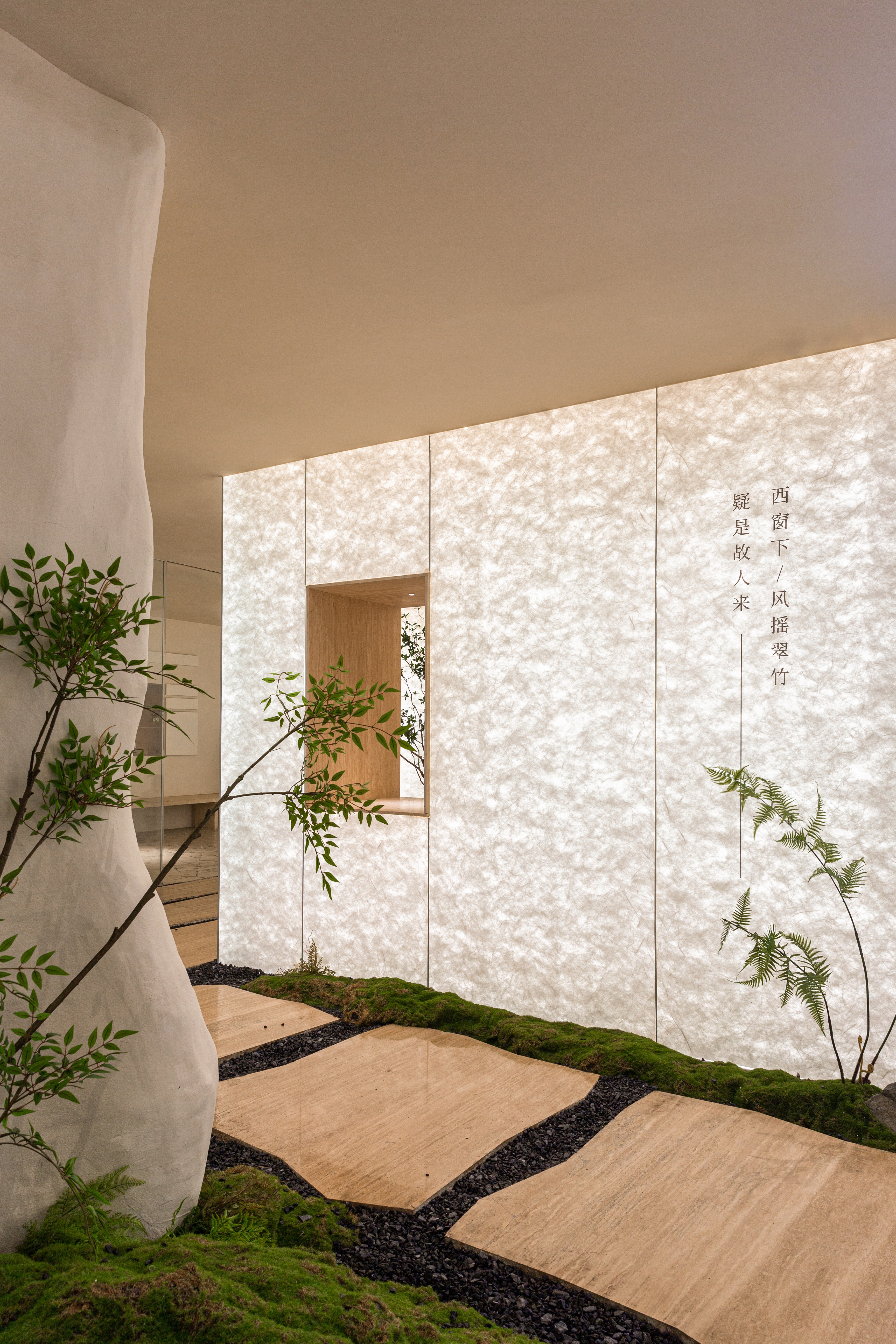 空间意境:设计在品牌基因的解读,汲取东方、自然、松弛感的甜品茶饮的特征。我们将前厅释放出来,采用东方语境下的庭院方式作为内部空间和商场之间一段灰空间的连接,采用洞石、纸、木作为包裹纯粹的肌理,不失自然醒的同时凸显个性,而我们利用本就错综复杂的结构柱,用奶油质感的表面包裹,采用视觉符号性的表达。洞石质感的汀步围绕其自然铺设,牵引访客随动线游观入里。过程中或盘膝而坐,或亭下小憩,从而形成与场域与情绪缓慢舒展,塑造松弛平和。
