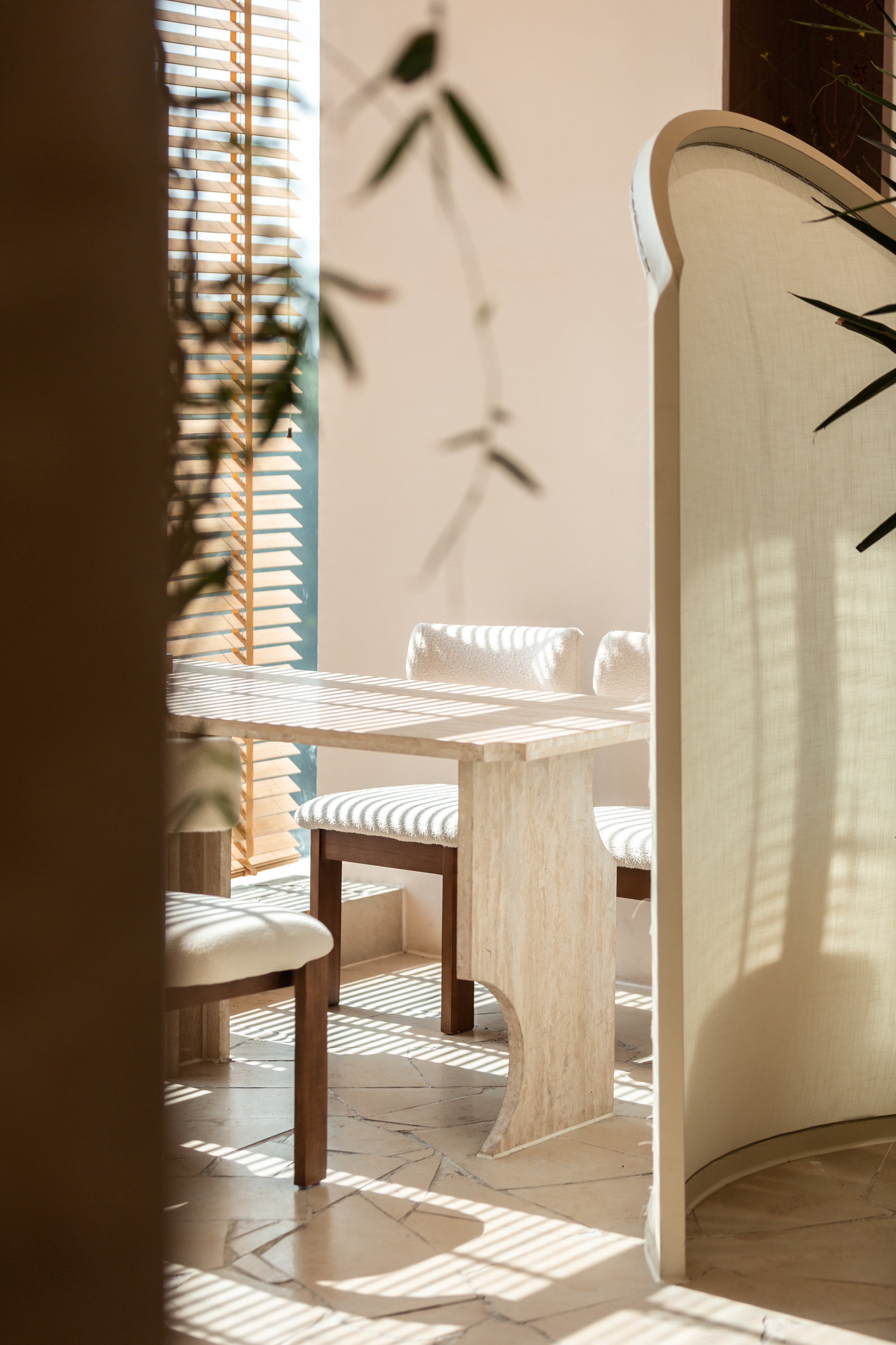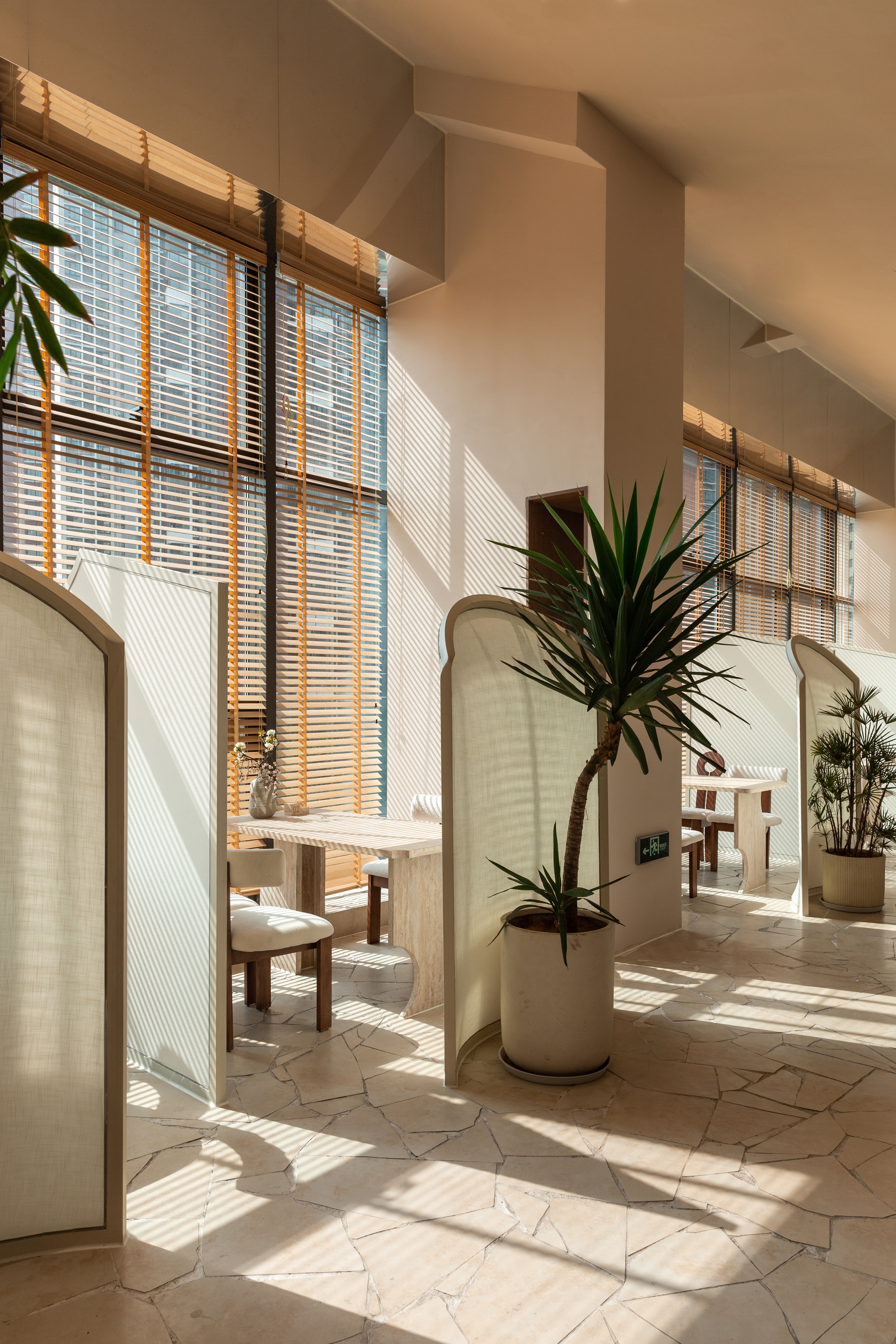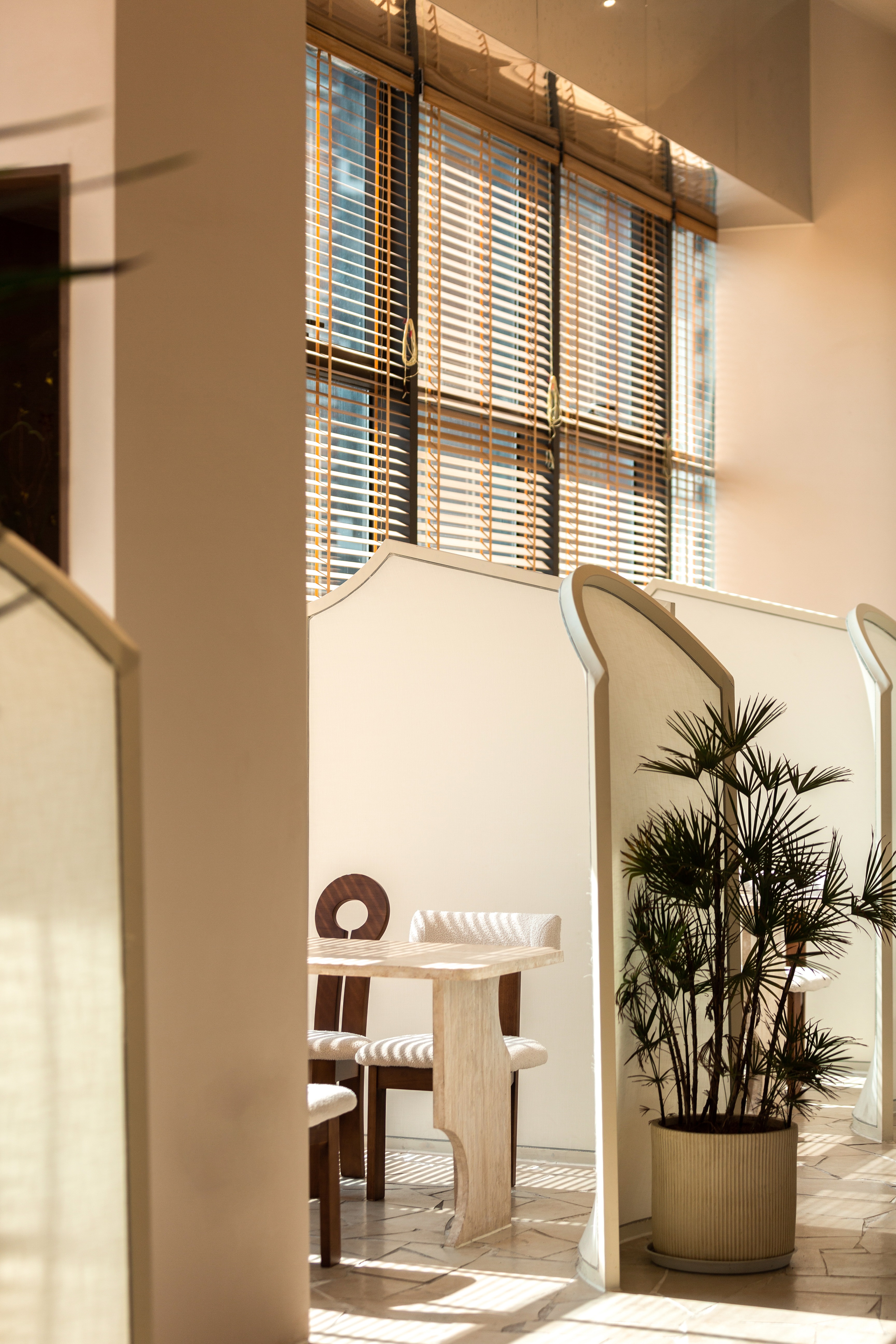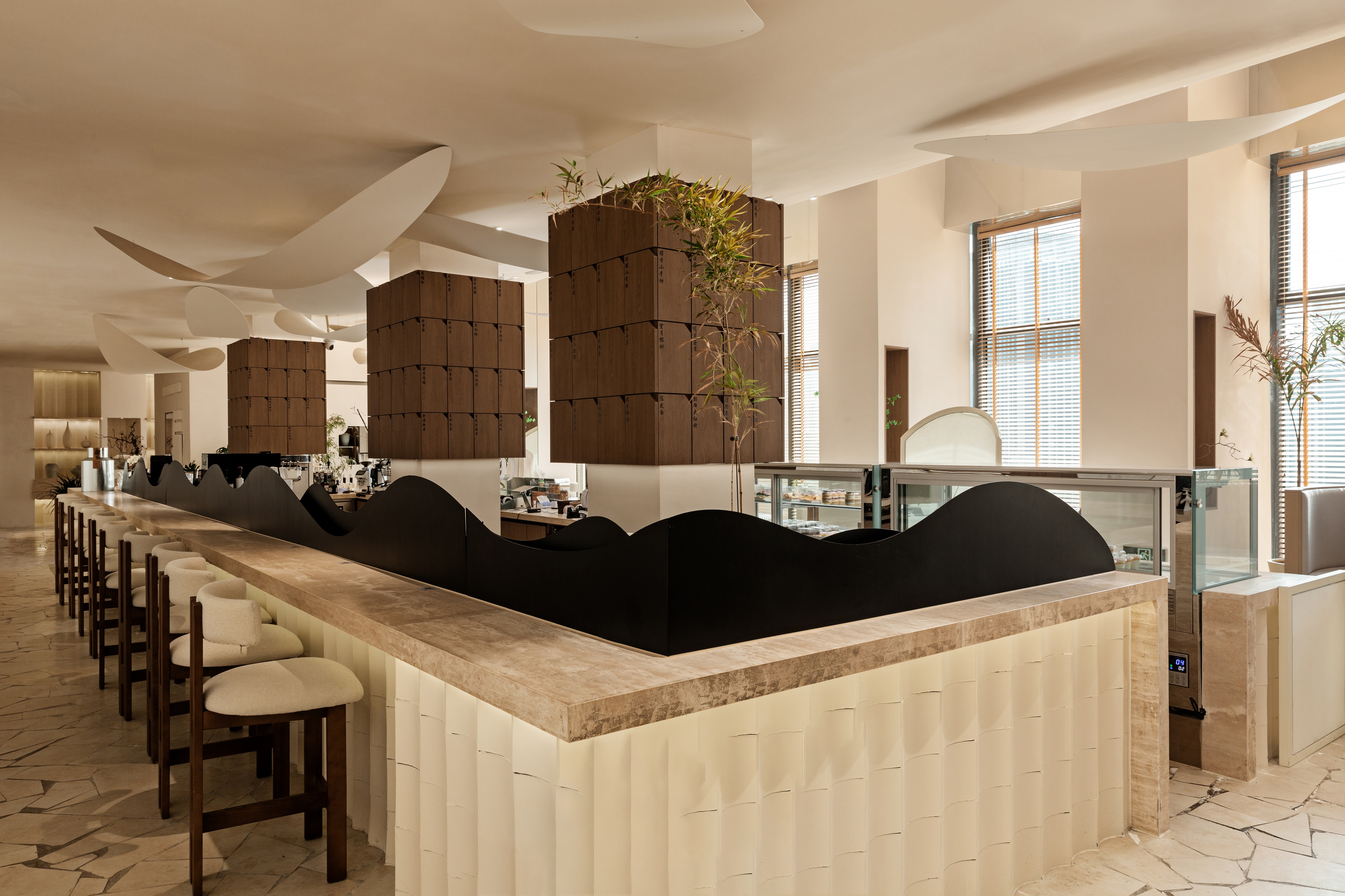 空间布局:空间的核心是前场一个复杂的结构组成的中央吧台,以及后场的甜品仓储区。我们引入石片通过手工喷漆的处理工艺作为吧台的贴面,使其匹配室内空间的调性。不同高度的吧台在承载休闲和操作的功能,同时也便中央区形成了一条回形的动线。我们设立适合不同人群休闲的桌椅组合形式,或敞开,或私密,由此也形成了场上不断变化的景观。阳光透过木质百叶洒入室内,尽显静谧且松弛的氛围。