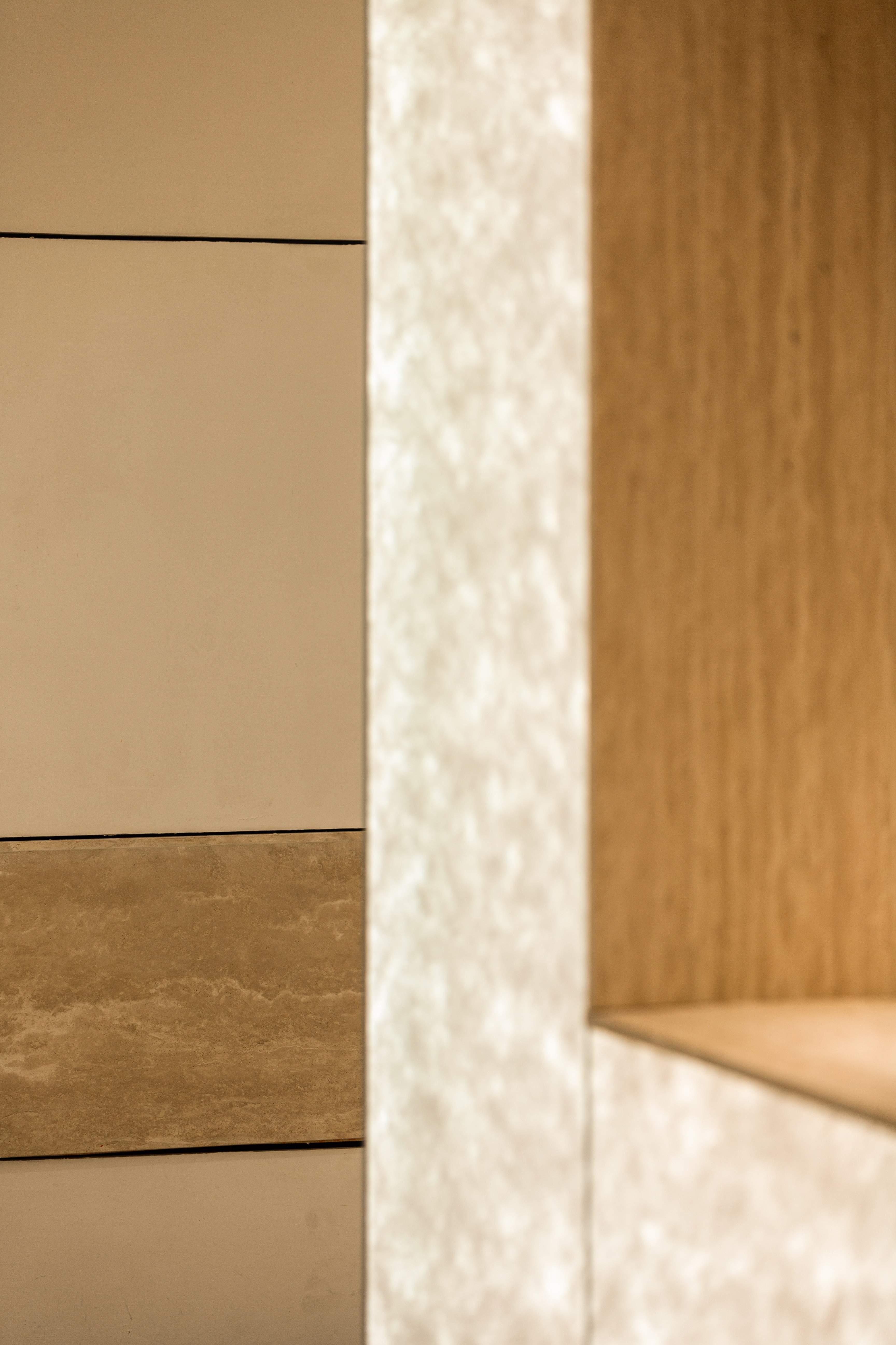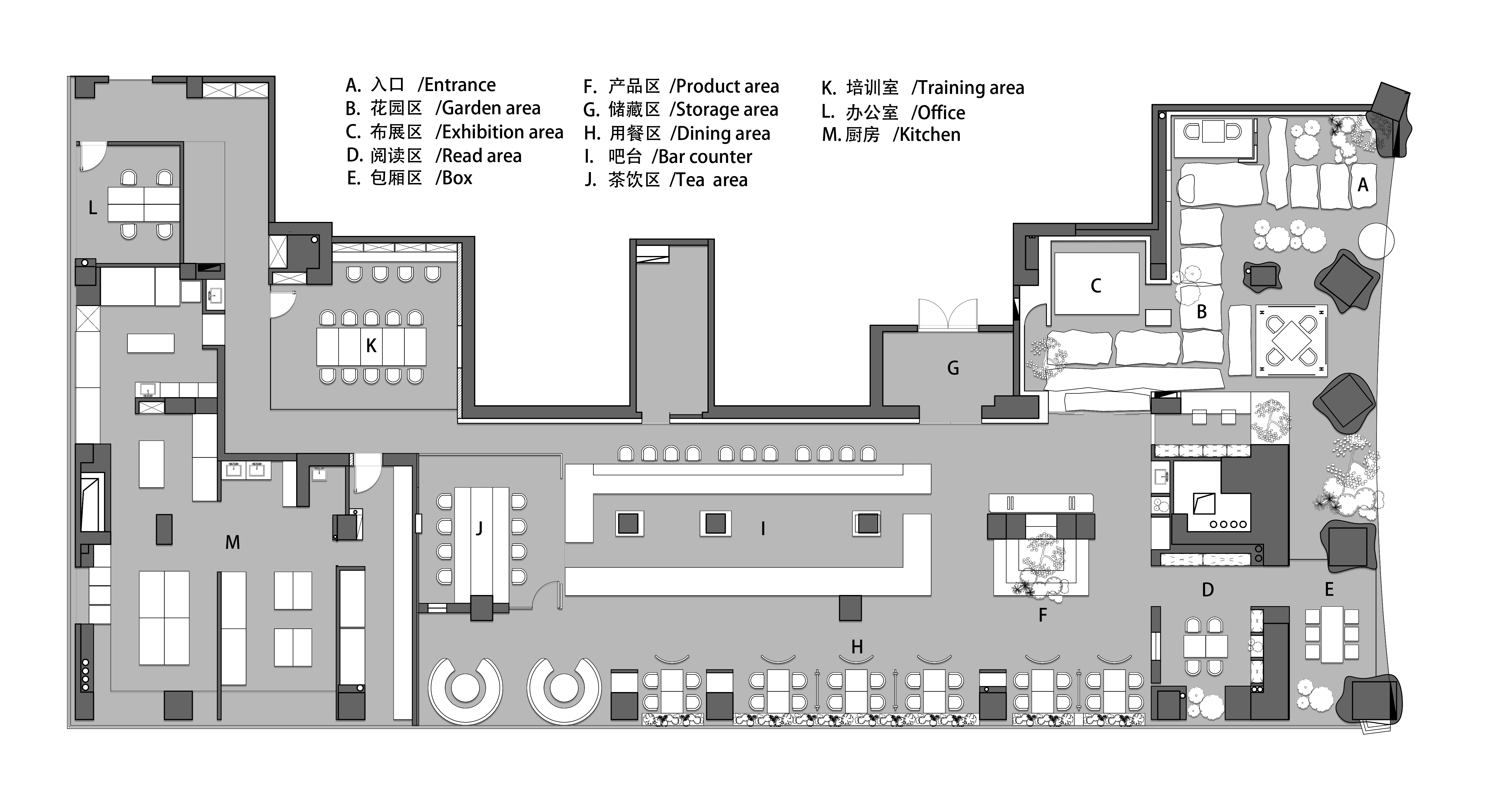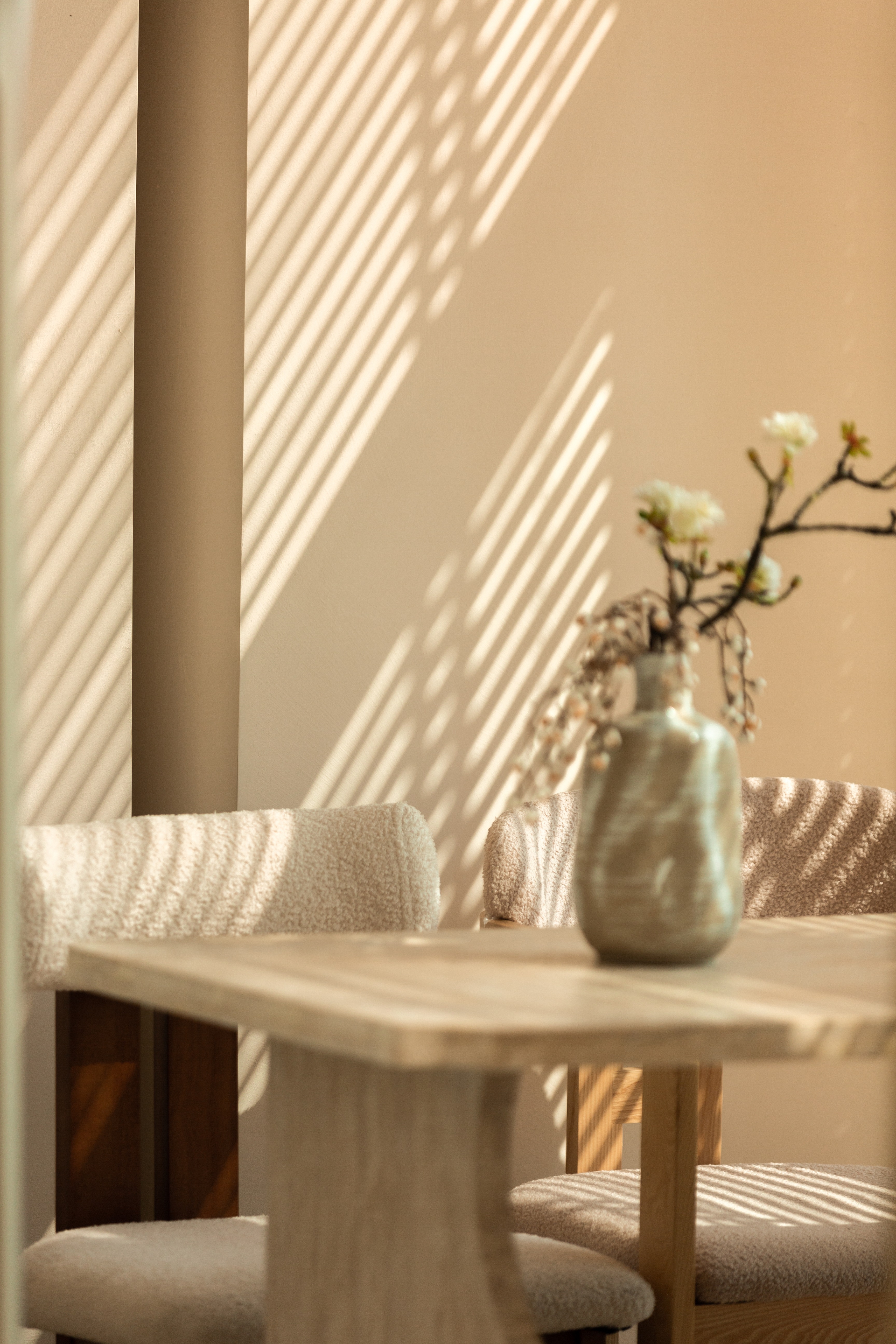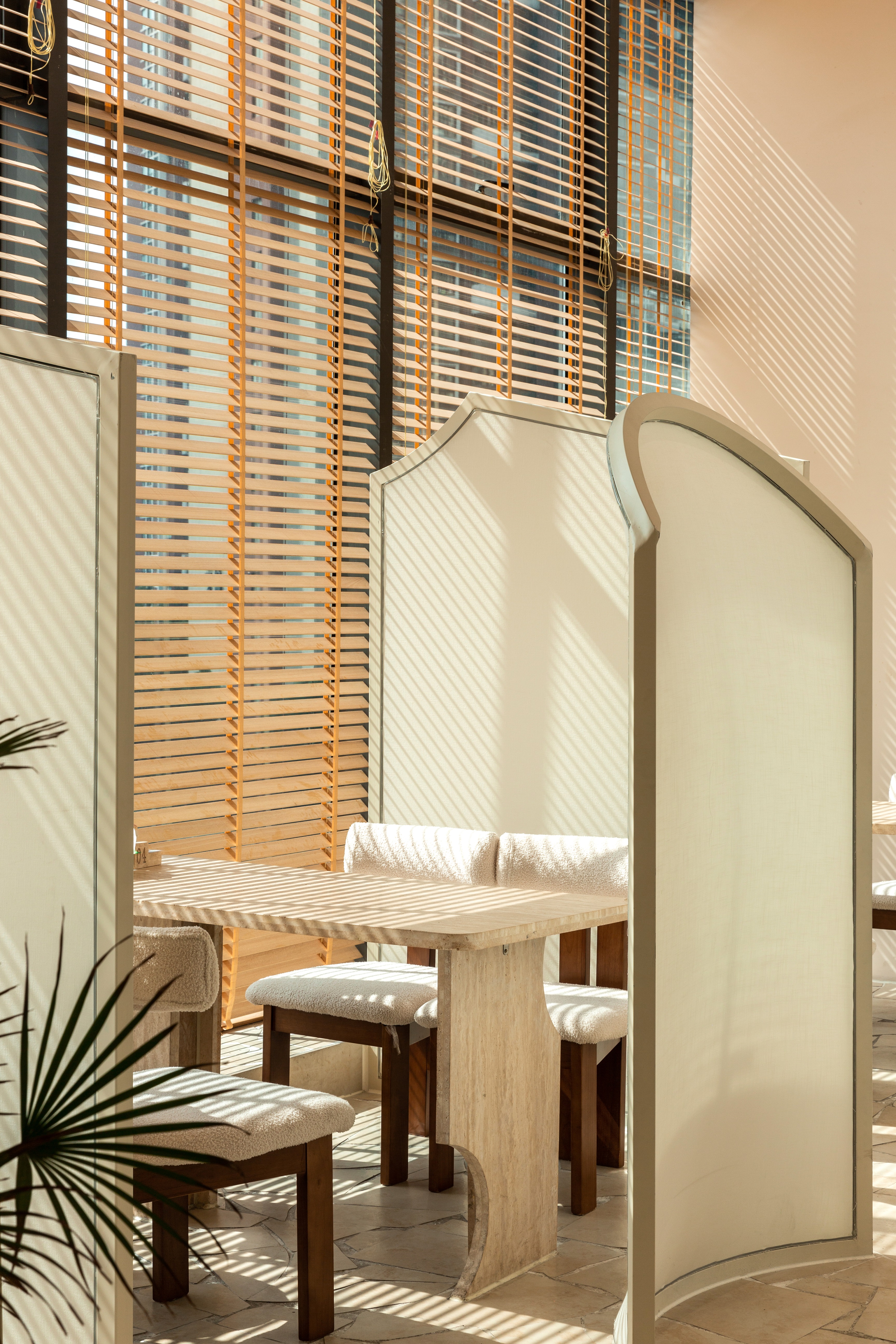 空间布局:空间的核心是前场一个复杂的结构组成的中央吧台,以及后场的甜品仓储区。我们引入石片通过手工喷漆的处理工艺作为吧台的贴面,使其匹配室内空间的调性。不同高度的吧台在承载休闲和操作的功能,同时也便中央区形成了一条回形的动线。我们设立适合不同人群休闲的桌椅组合形式,或敞开,或私密,由此也形成了场上不断变化的景观。阳光透过木质百叶洒入室内,尽显静谧且松弛的氛围。