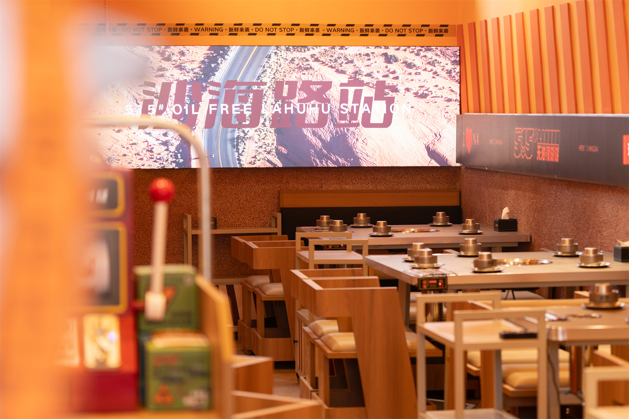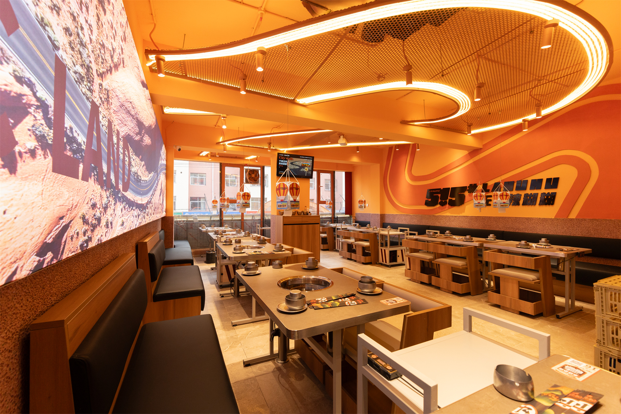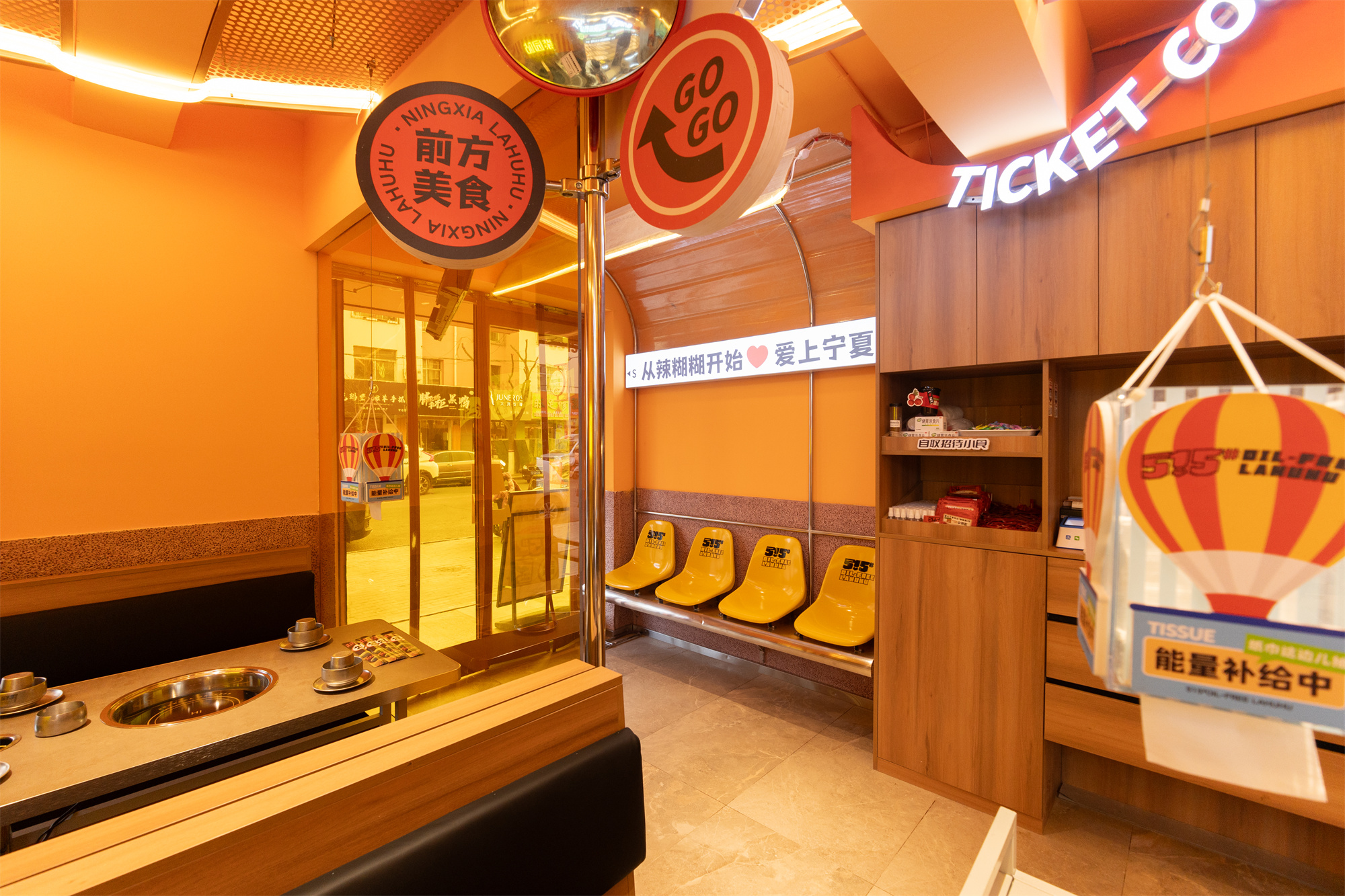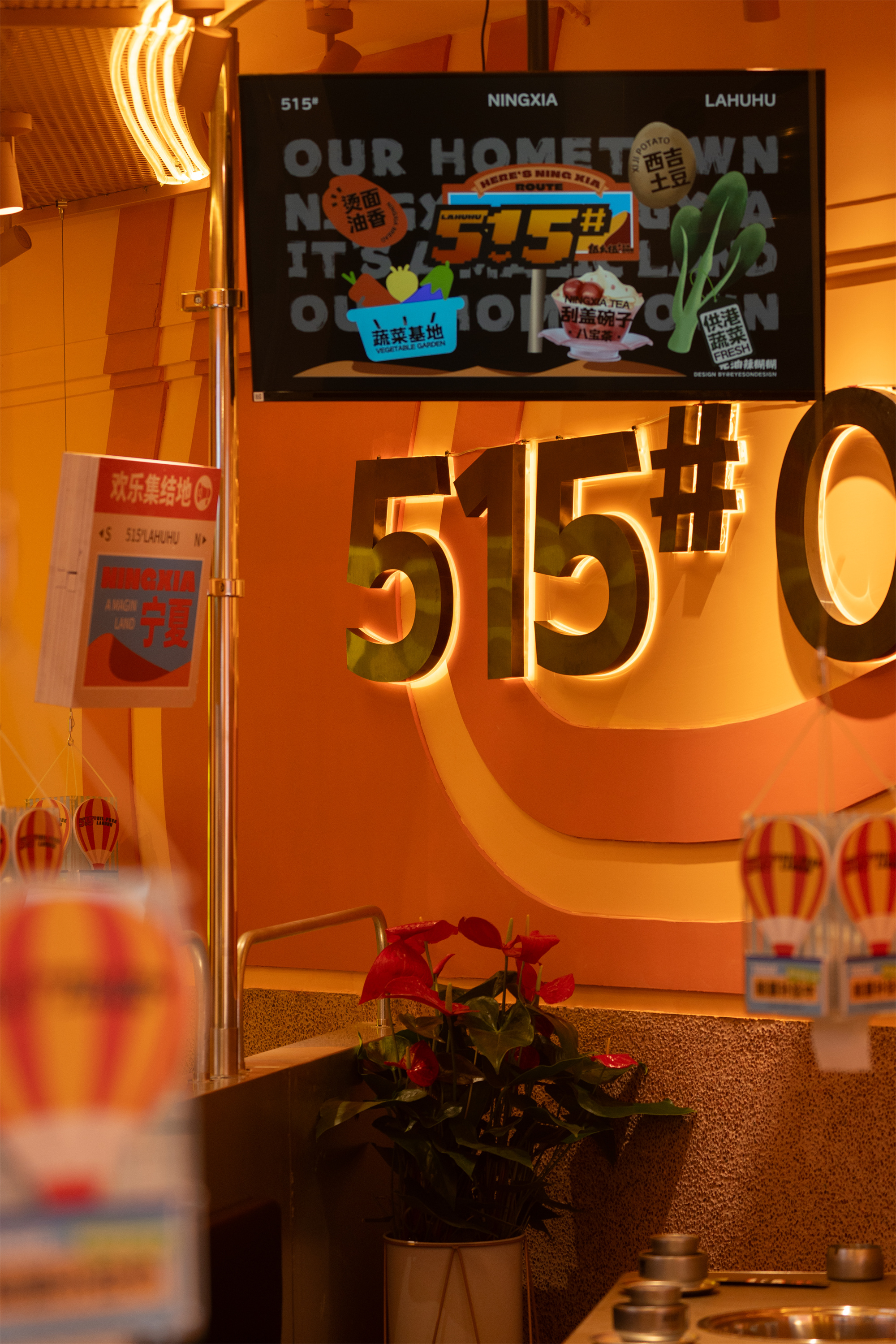 空间布局:我们在空间设计里,没有刻板的做宁夏文化,也没有煽情的植入情怀。而是把西北的公路文化代入空间,让它作为一个串联的纽带,不在情感上煽情扭捏,不在文化上杜撰,我们要做的是营造一个场域,一个可以让不同年龄段的人都可以在这里感受到热情,在空间里可以肆意欢乐的空间,这就是伍幺伍,我们用空间、设计、和味道来结合,让大家不同的欢乐都可以融合的地方。