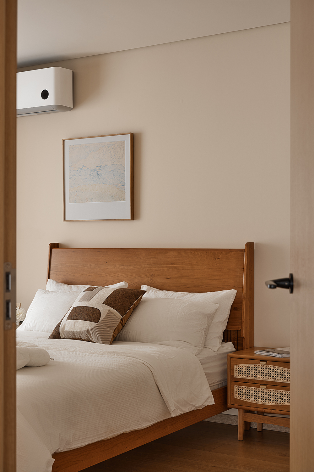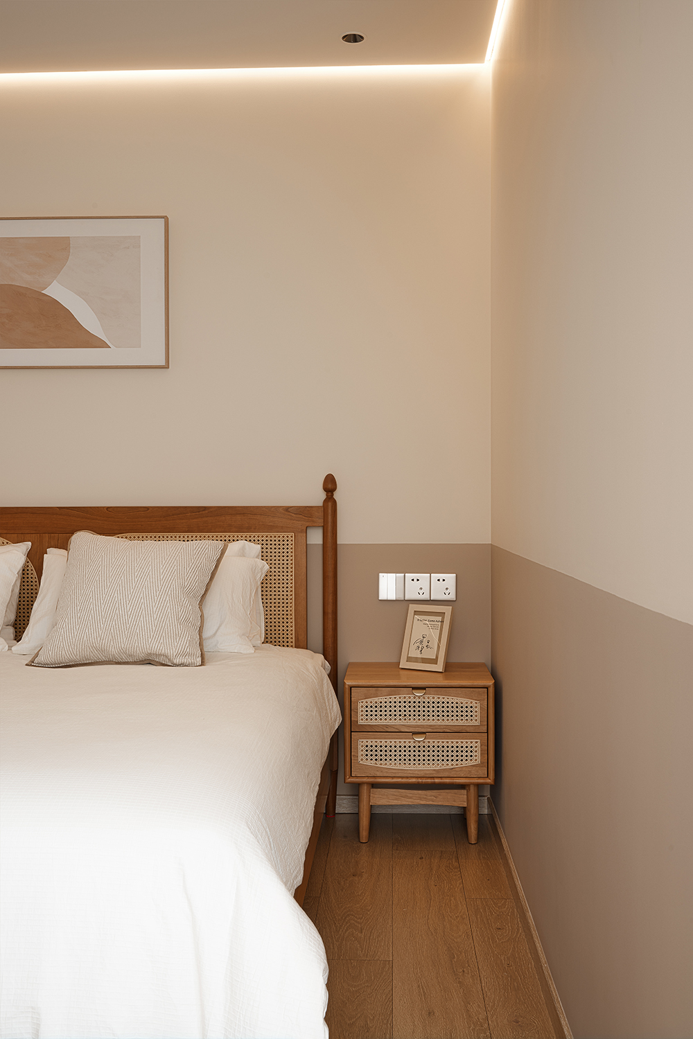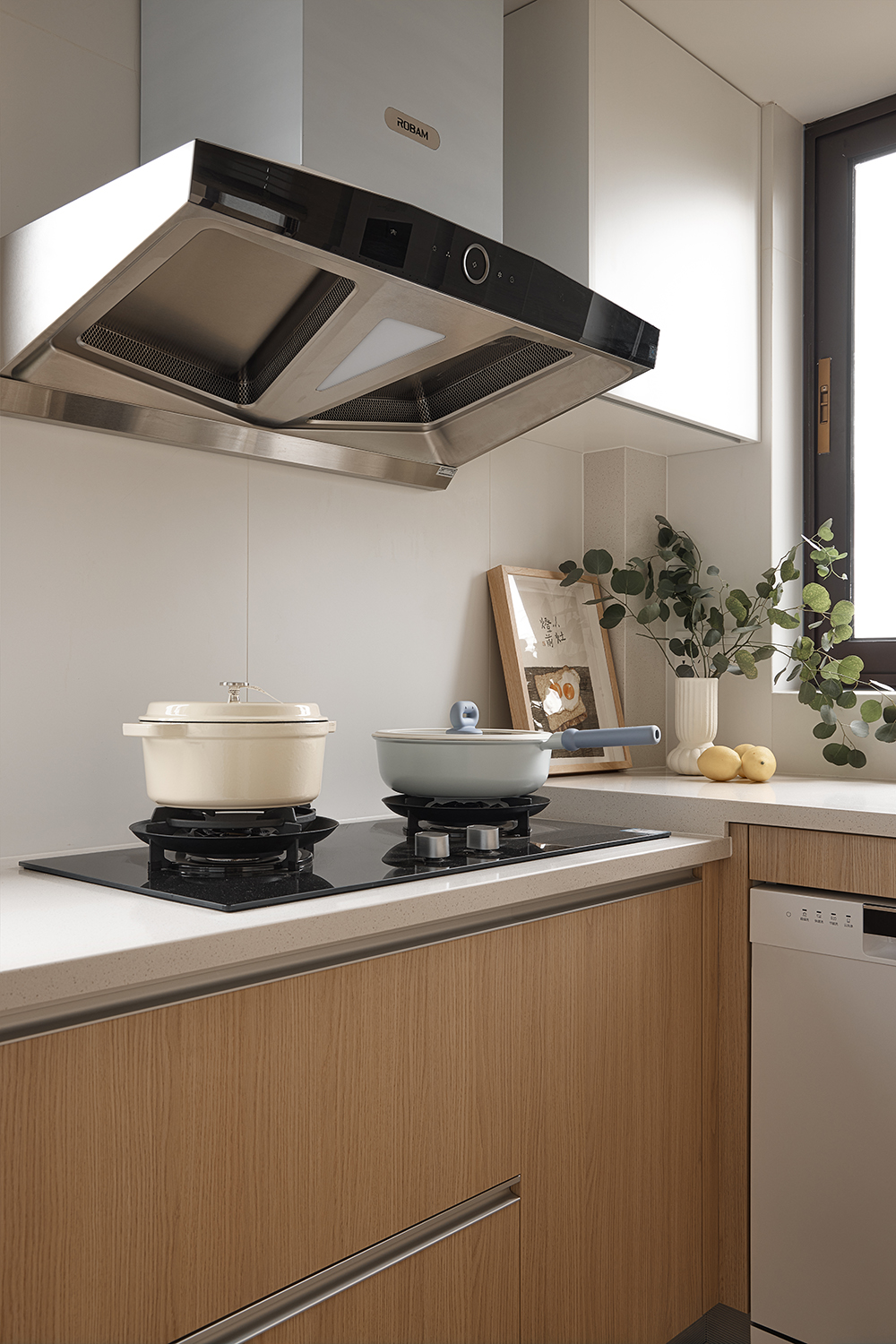 空间意境:通过灵活多变的空间布局与功能整合,实现了客餐厨一体化设计,增加了空间通透性和动线流畅性;色彩搭配温馨舒适,材质选择自然质朴与现代时尚相结合,营造出和谐统一的家居氛围;细节设计个性化且人性化,如高低台面厨房、洗碗机、壁龛收纳等,提升了使用的便捷性和舒适度;阳台落地窗设计将自然景观引入室内,完美融合了自然与室内空间,提升了家居品质和生活享受。