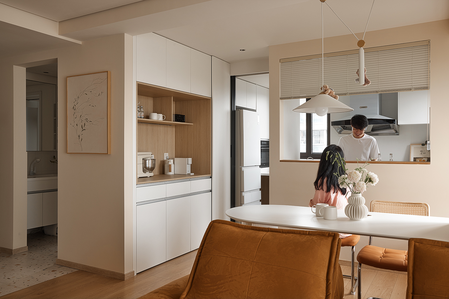 空间布局:布局设计:①进门右手边的墙体拆改后由三组储物柜围合成多面储物间,利用率极高。原始结构中没有明确的玄关区域,在进门的走道边定制了1.4米的超大鞋柜。面向客厅定制了一个小仓库,可以放置梯子、行李箱等大件物品,以后有需要时还可以放婴儿车。南面面向次卧的空间为次卧衣帽间,灵活多变,可以适应各种使用情况。②卫生间改变入口方向,动线更加合理,同时也实现干湿分离,保证淋浴和浴缸都有。③客餐厨一体的设计,将三个功能空间整合在一起增加空间通透性,同时也可以优化动线实现一体化的布局成为家庭空间的核心。④业主二人经常做饭,综合考虑了厨房的使用频率和实际需求后,我们将厨房外扩,不仅增加了操作台,算上餐厅的西厨柜,中西厨连通为P形布局,实用性大大加强。