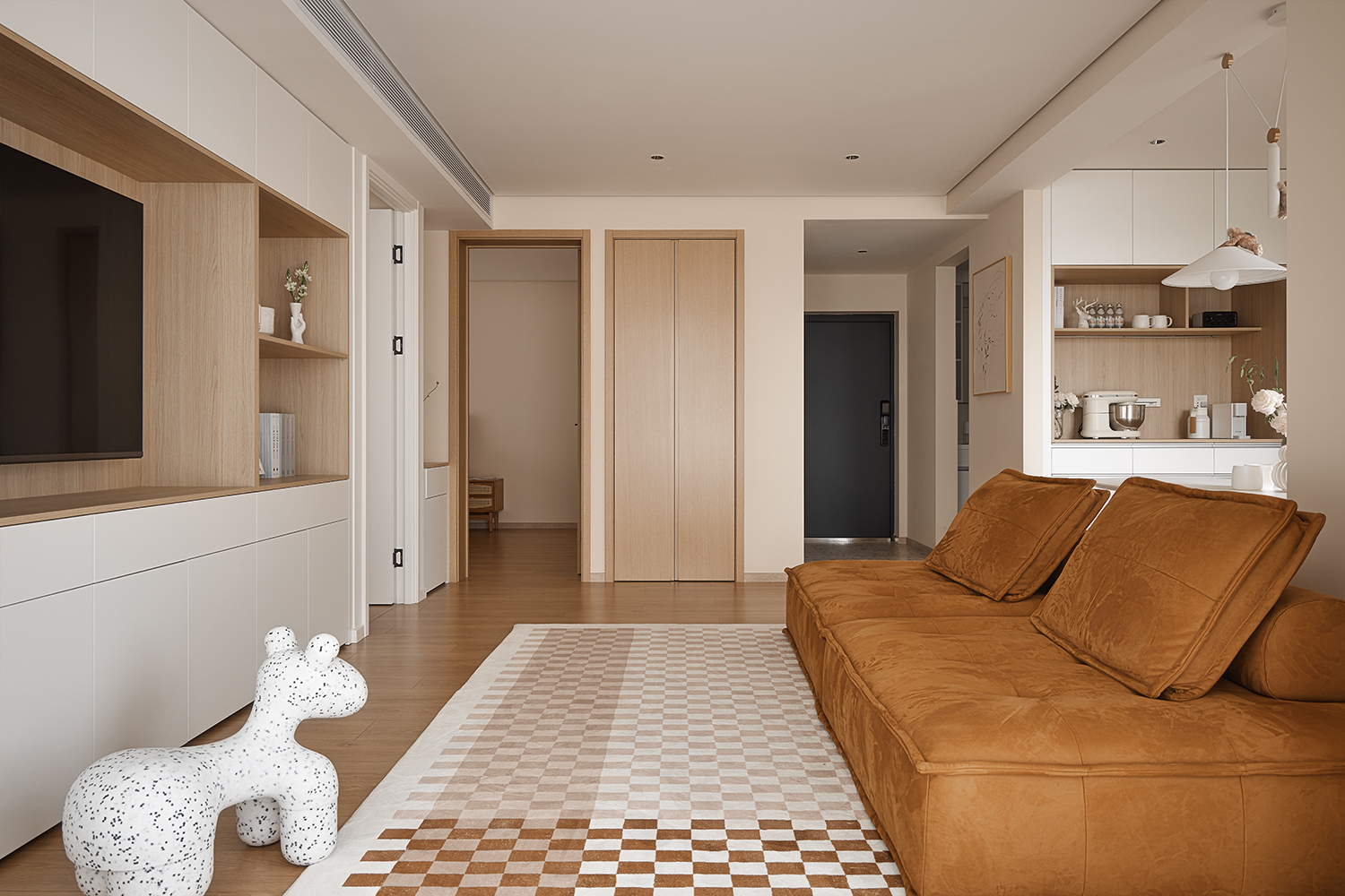 设计选材:在选材上,本案例展现了创新与低碳经济的完美结合。通过定制多面储物间、利用房门空间做展示柜,以及选用环保材料和高效能家电,如洗碗机、扫拖机器人等,提高了空间利用率和生活效率,同时减少了能耗和废弃物。此外,多功能家具的整合、自然光与通风的最大化、节水节能设备的选用,以及可持续材料的利用,如可活动金属衣架,进一步体现了低碳环保的设计理念,实现了绿色家居的目标。