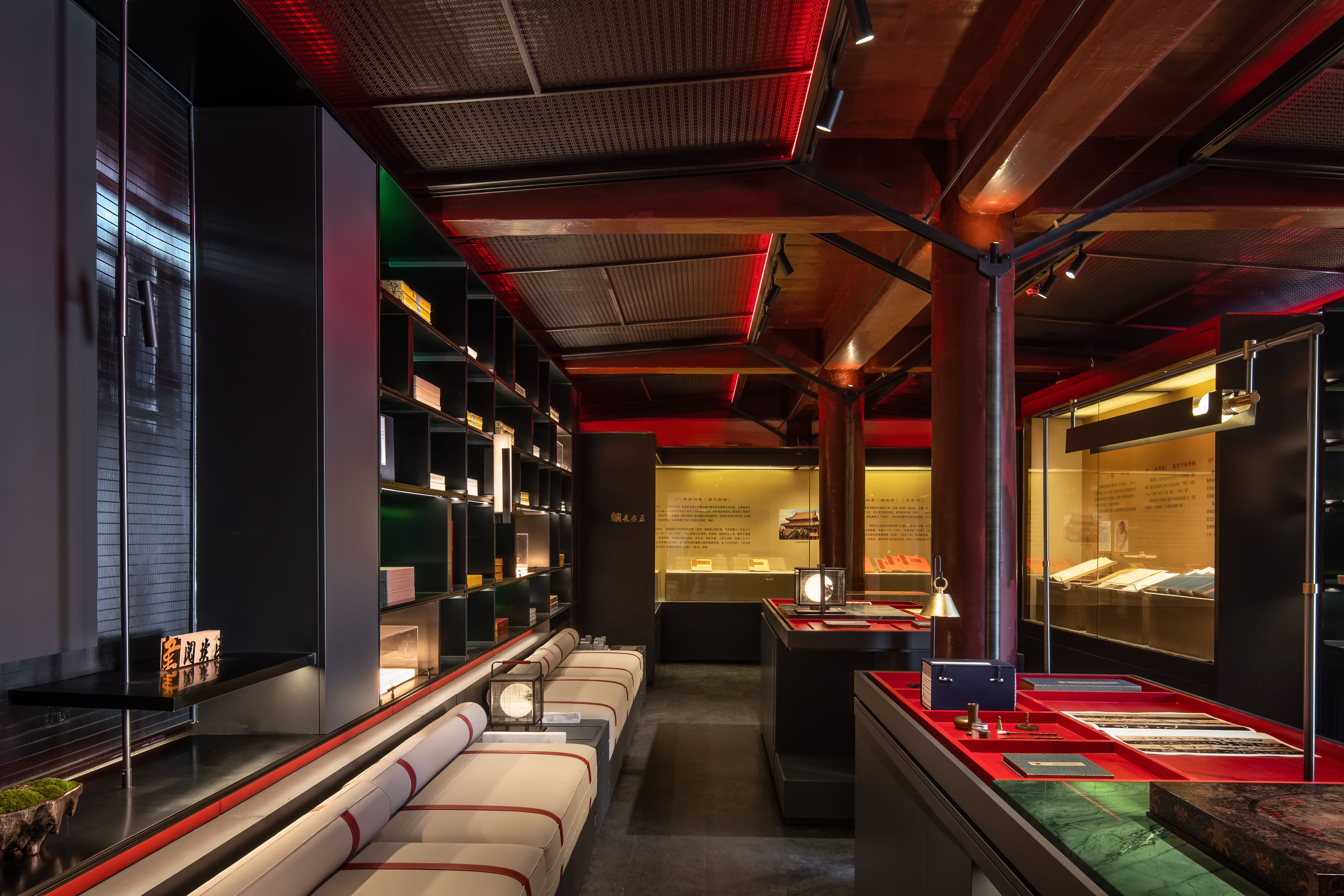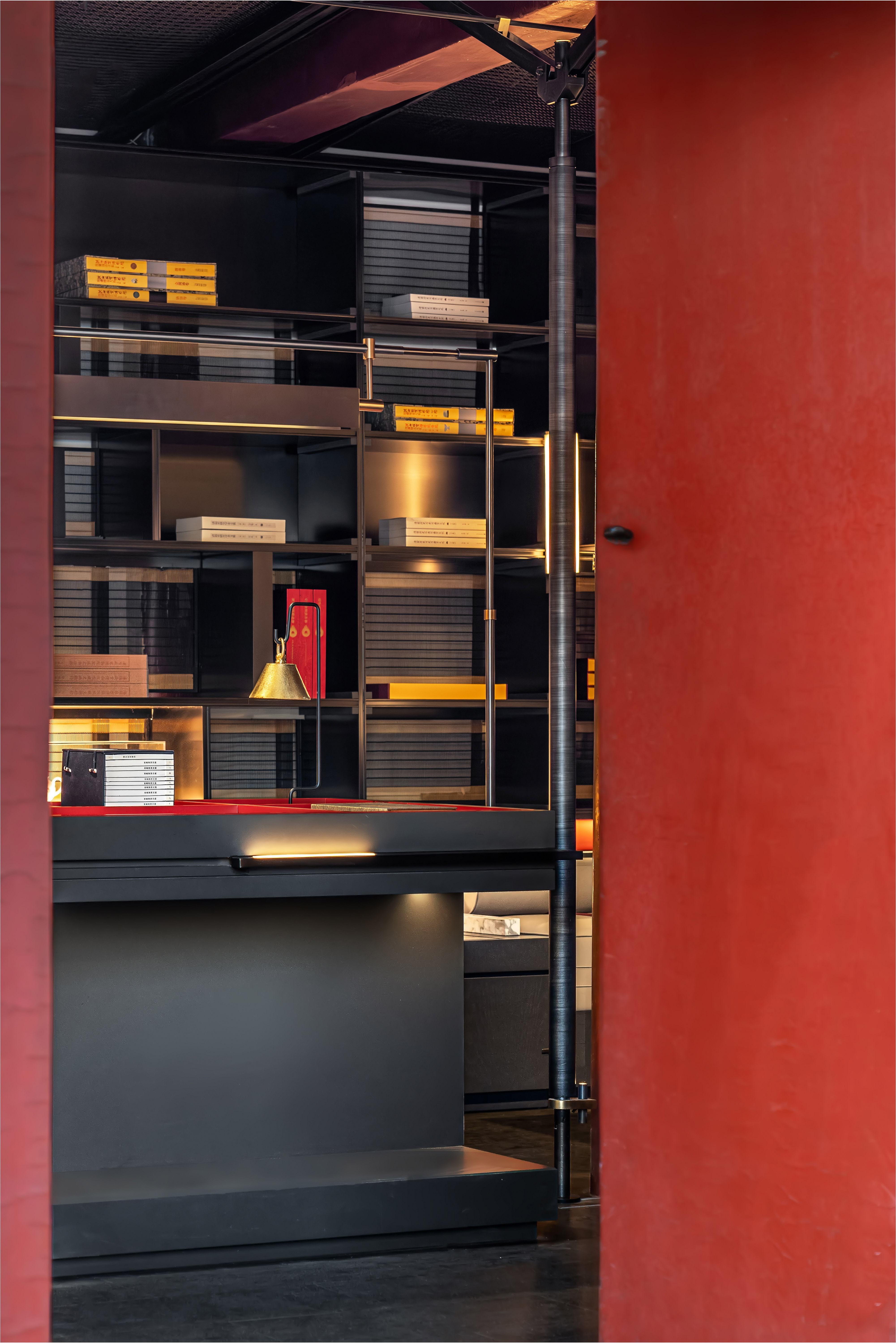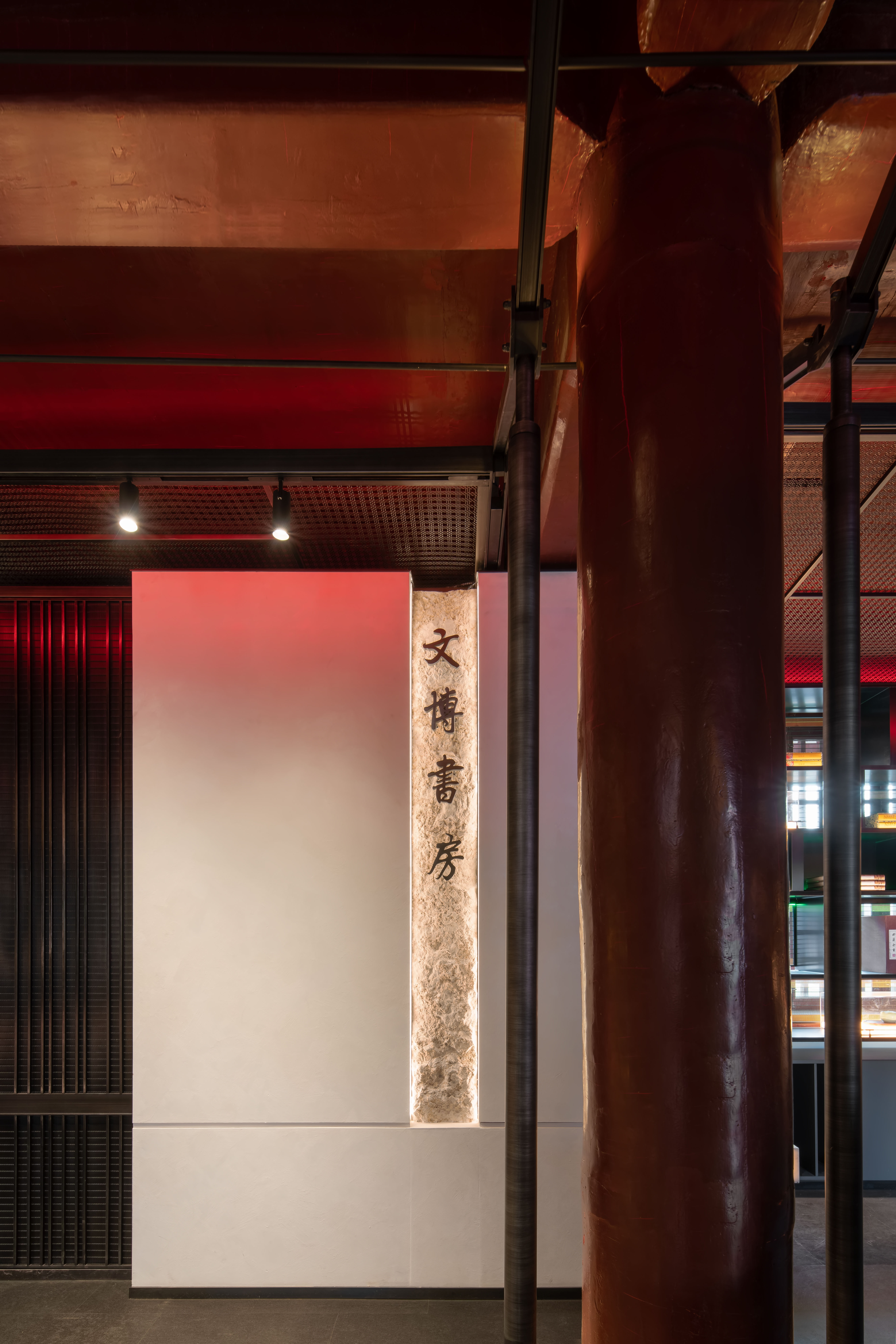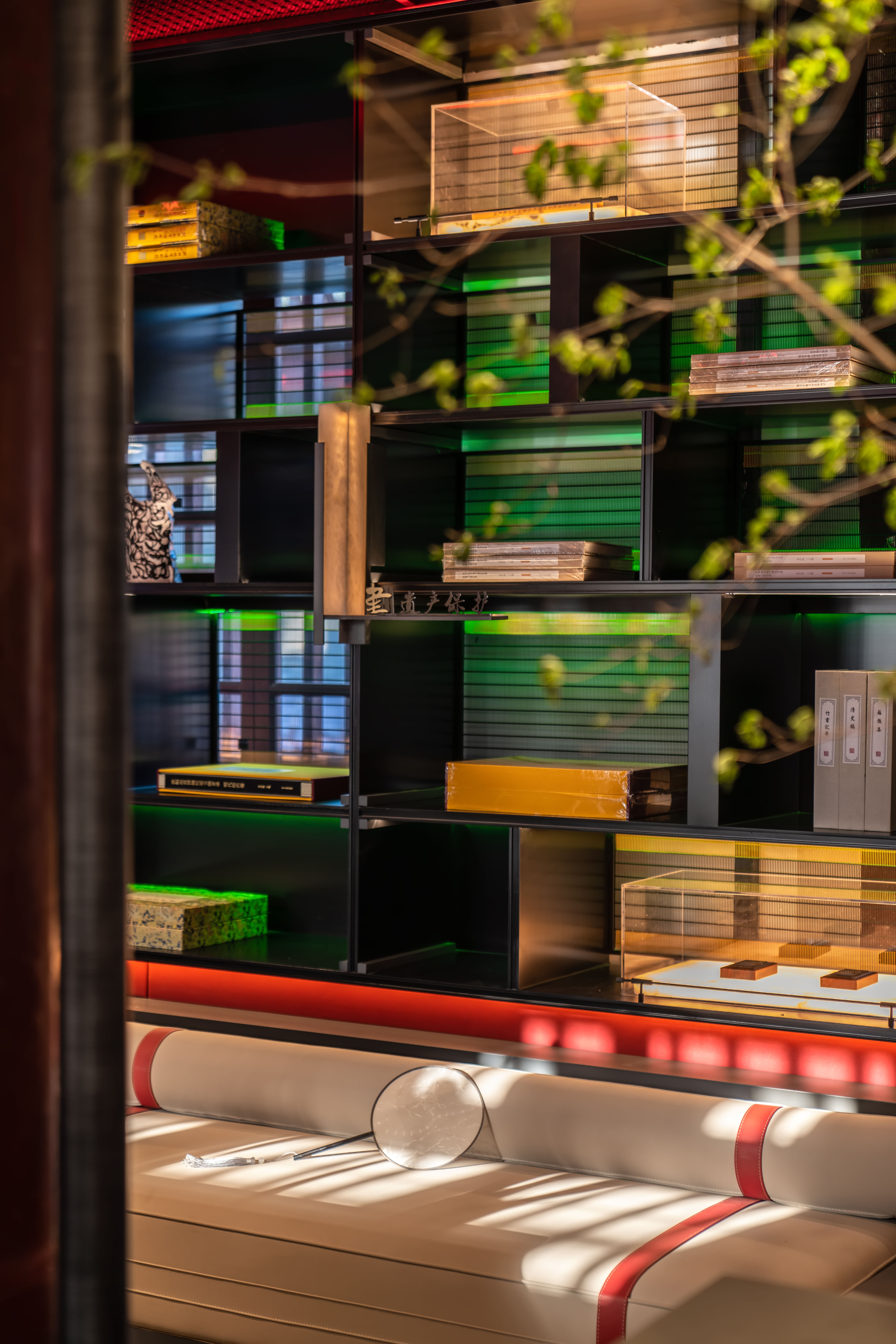 空间意境:故宫建筑色彩的延续与新的艺术形式打造主体颜色和材料(大漆红、孔雀绿/金属板、金属网、透光云石、羊毛粗布、书卷体的金属背网)。故宫建筑的一砖一瓦,一草一木,都有其深刻的内涵,为了遵从中国古建的传统文化,从文博书房的整体建筑布局到造型再到用料都极为考究,每种颜色的搭配也都做了深刻的研究。依照中国五行的逻辑,火为赤色,以示兴旺发达,青色即绿色,为木叶萌芽之色。同时结合存放乾隆年间《四库全书》的文溯阁,我们选取了大漆红和孔雀绿两种配色,以延续故宫皇家建筑的传统风格,达到和谐悦目的视觉效果。