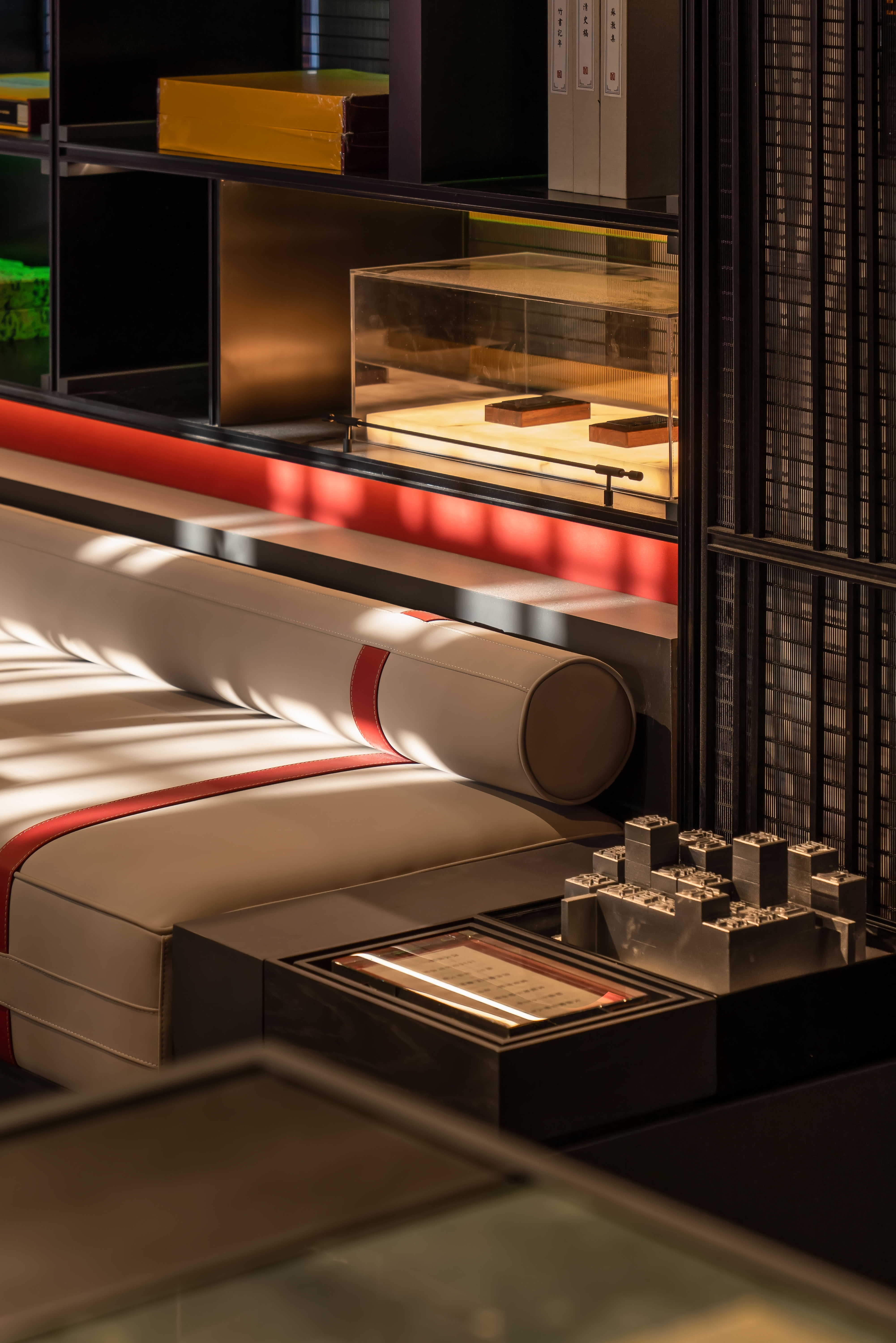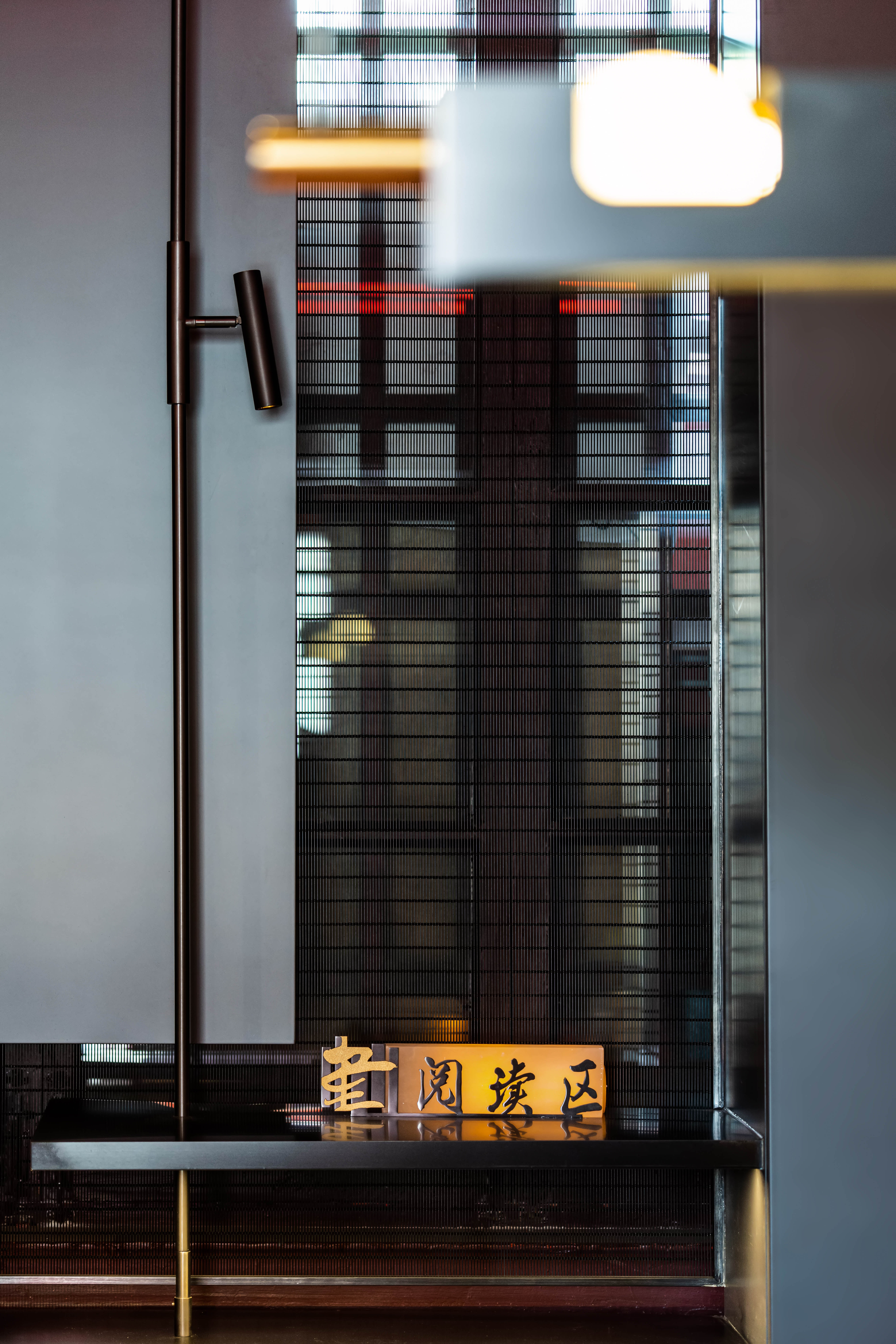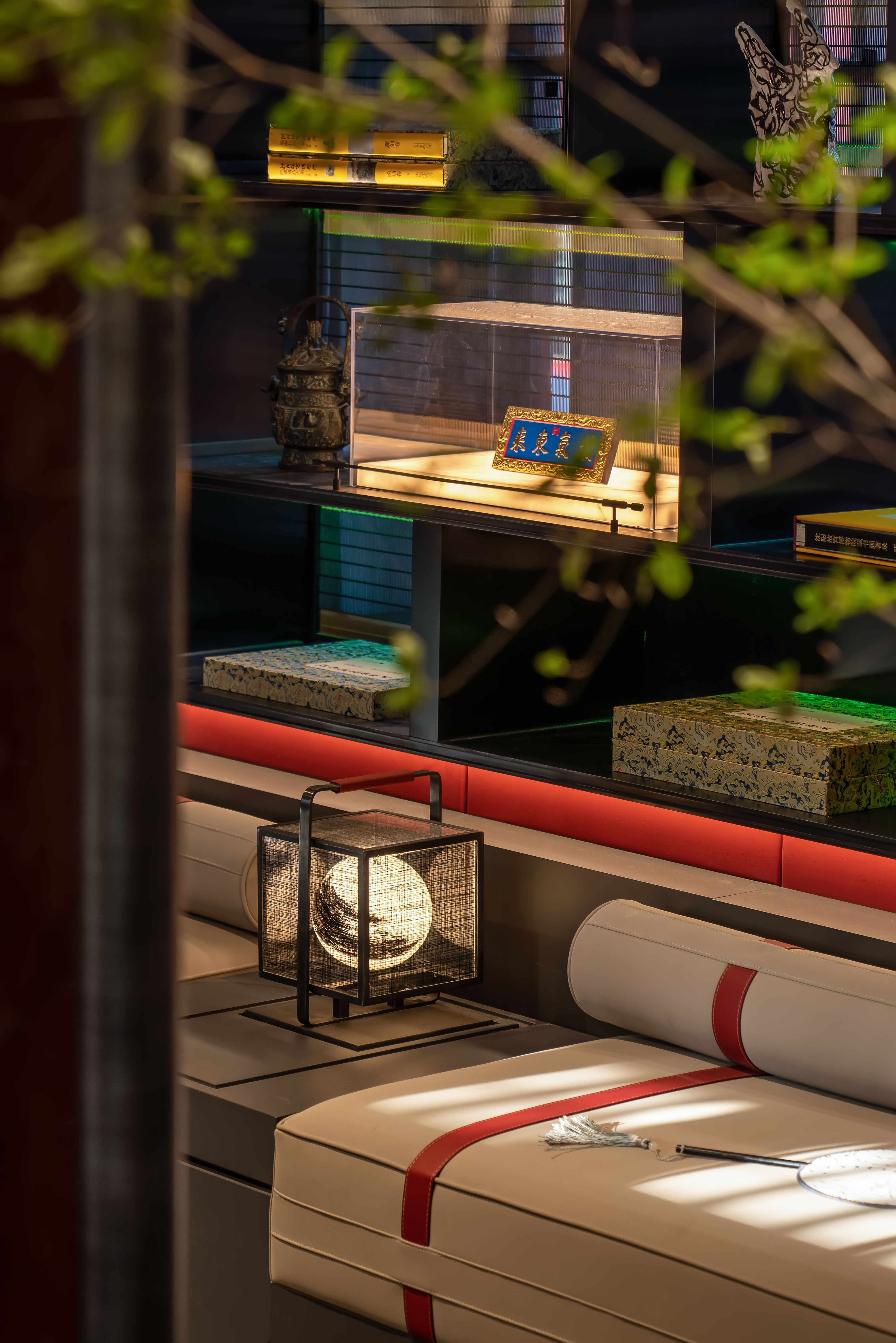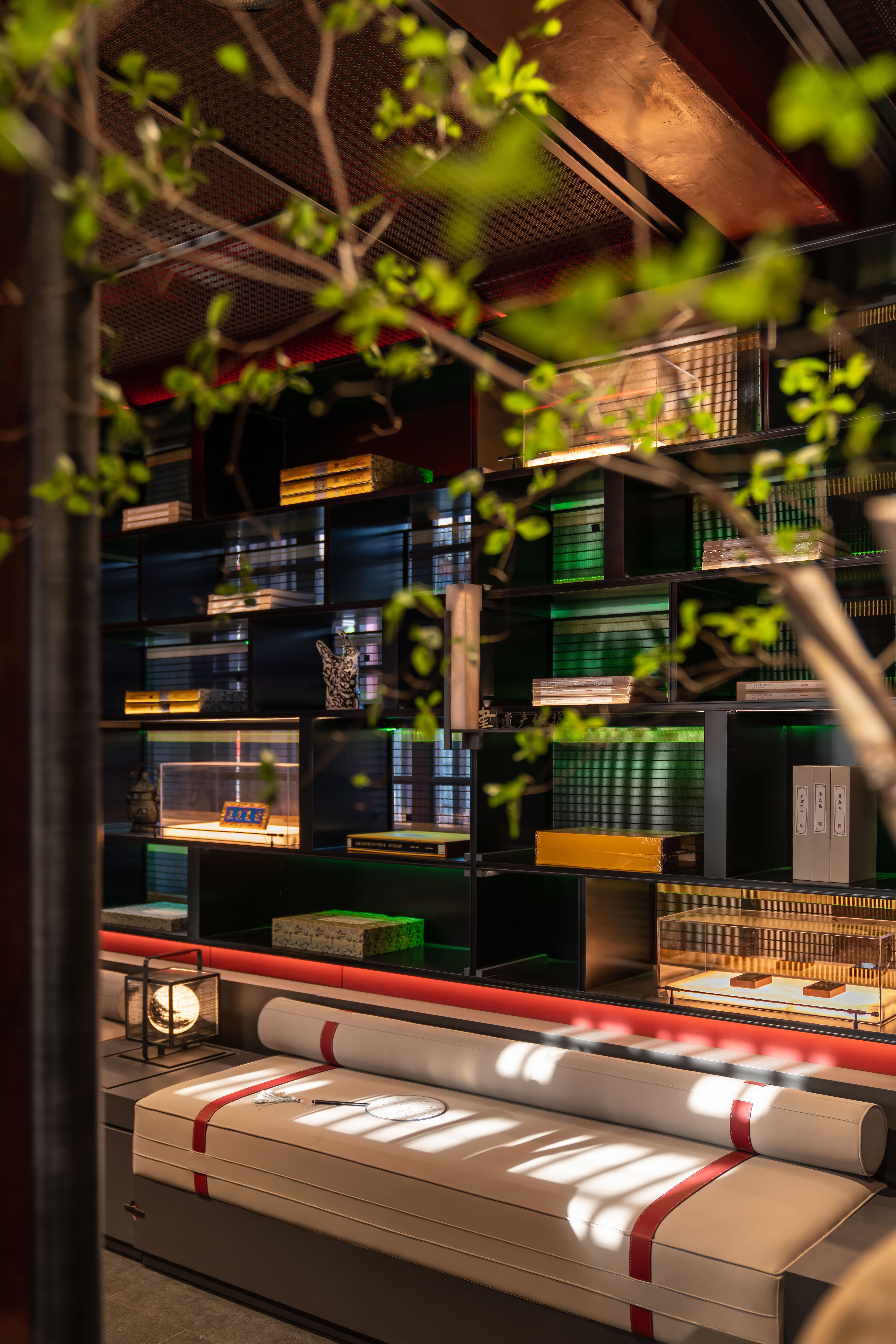 空间意境:故宫建筑色彩的延续与新的艺术形式打造主体颜色和材料(大漆红、孔雀绿/金属板、金属网、透光云石、羊毛粗布、书卷体的金属背网)。故宫建筑的一砖一瓦,一草一木,都有其深刻的内涵,为了遵从中国古建的传统文化,从文博书房的整体建筑布局到造型再到用料都极为考究,每种颜色的搭配也都做了深刻的研究。依照中国五行的逻辑,火为赤色,以示兴旺发达,青色即绿色,为木叶萌芽之色。同时结合存放乾隆年间《四库全书》的文溯阁,我们选取了大漆红和孔雀绿两种配色,以延续故宫皇家建筑的传统风格,达到和谐悦目的视觉效果。