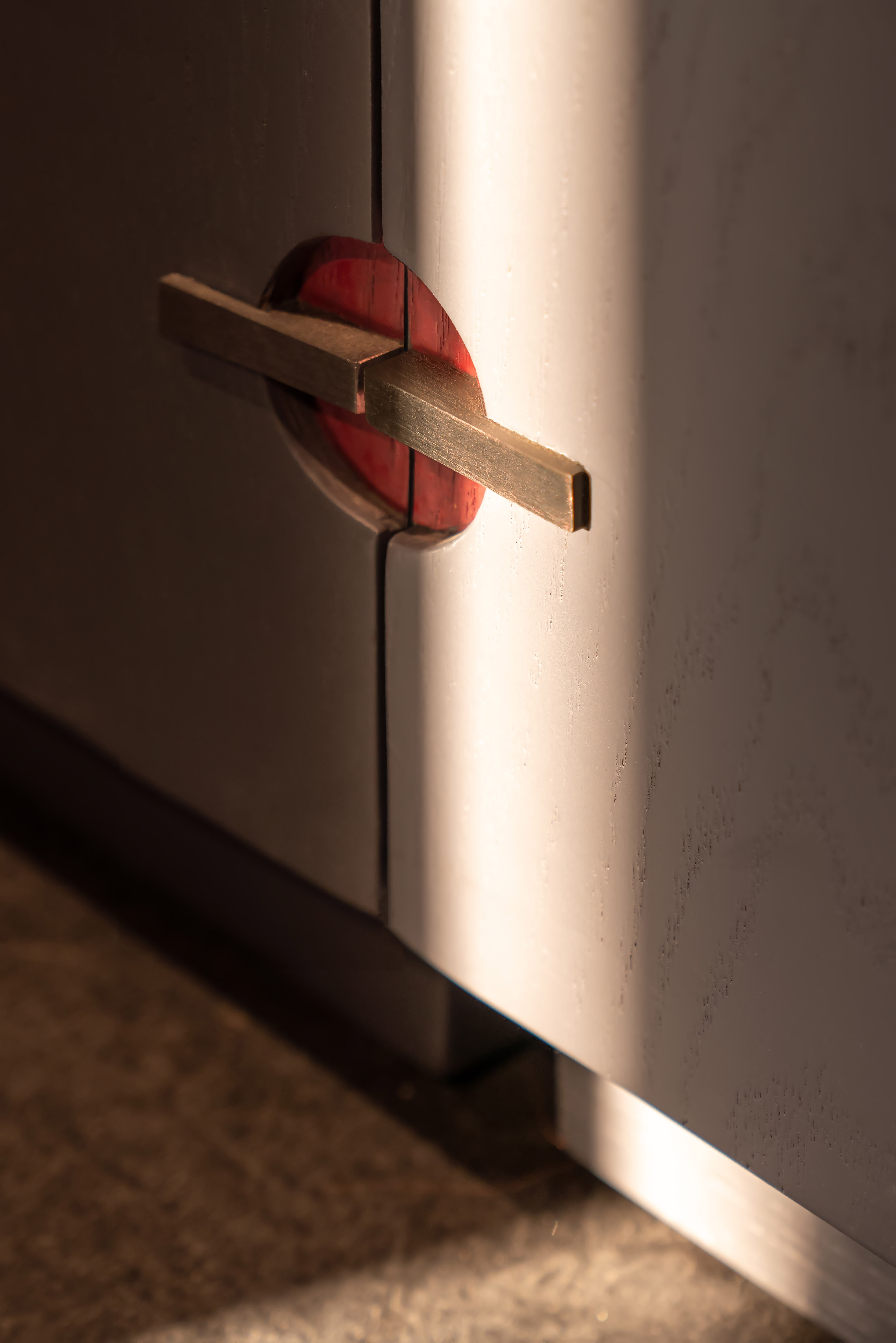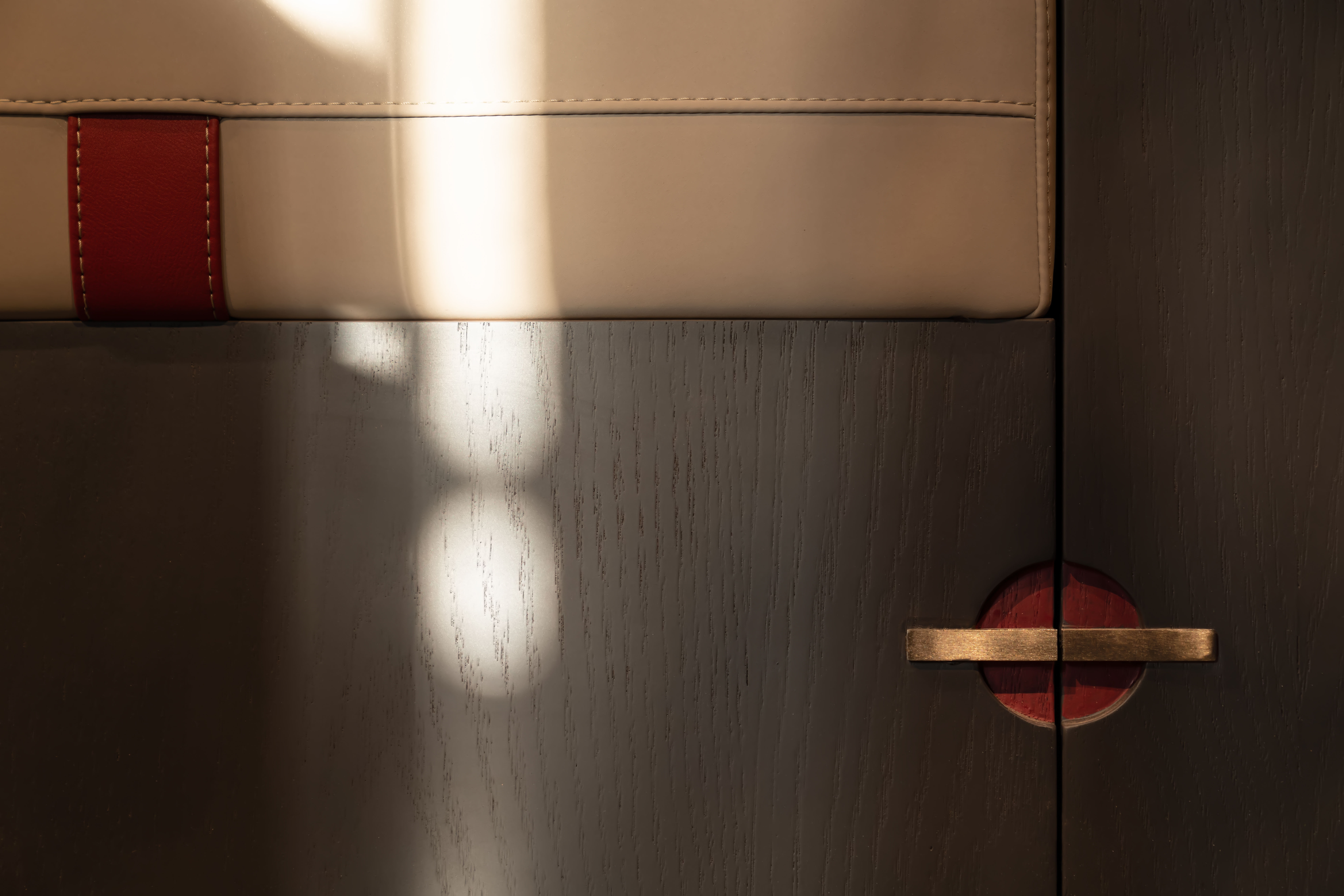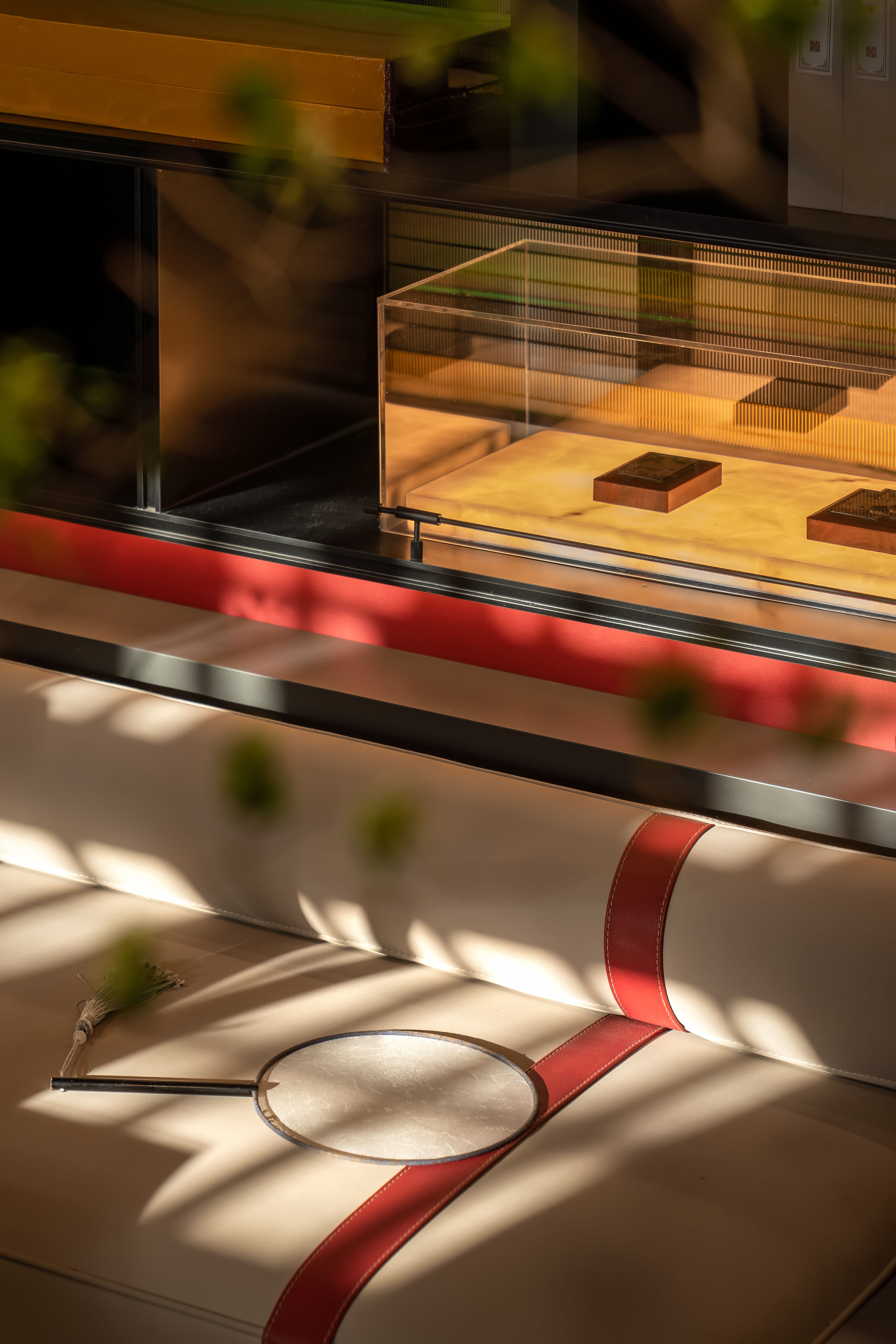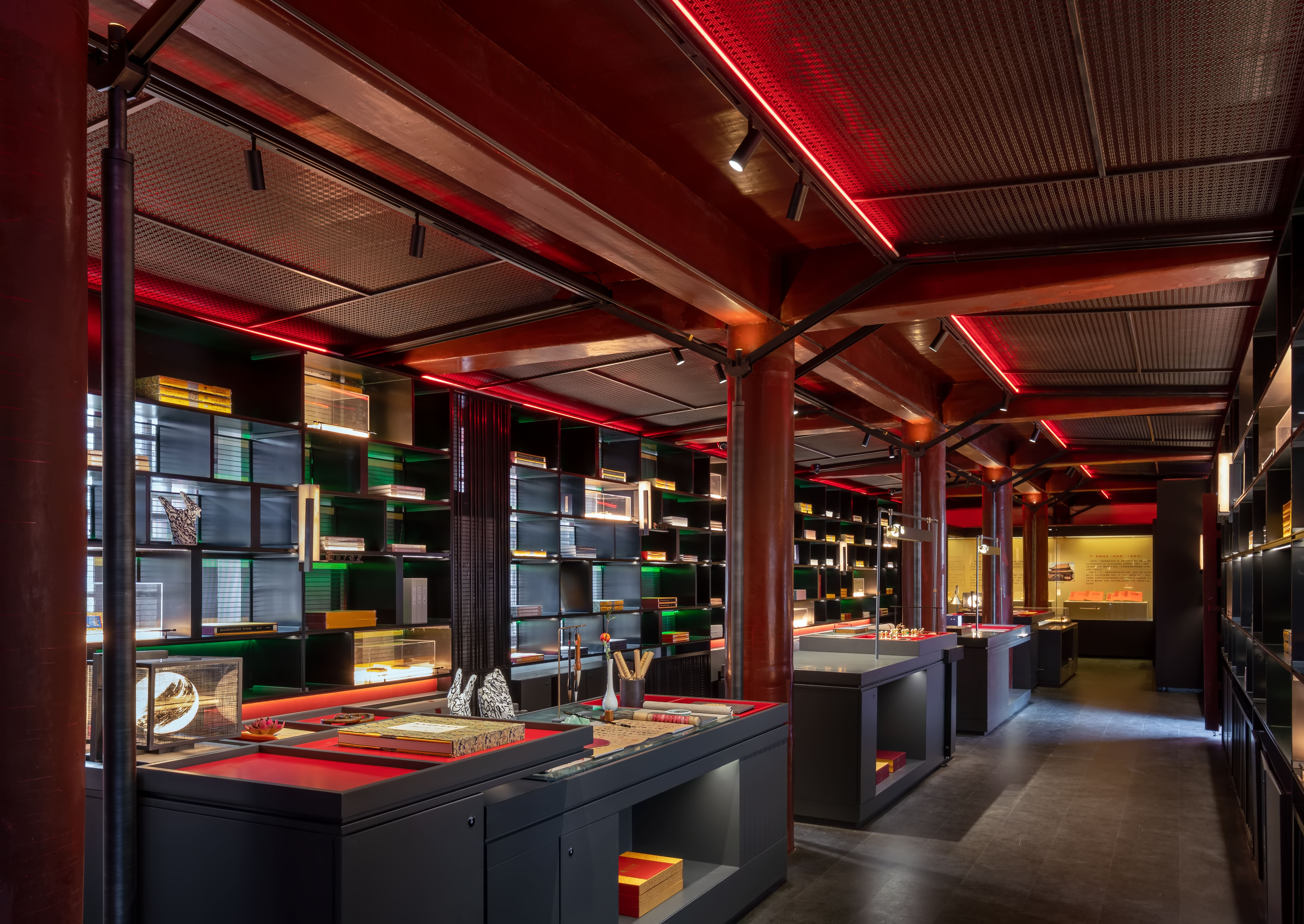 空间意境:故宫建筑色彩的延续与新的艺术形式打造主体颜色和材料(大漆红、孔雀绿/金属板、金属网、透光云石、羊毛粗布、书卷体的金属背网)。故宫建筑的一砖一瓦,一草一木,都有其深刻的内涵,为了遵从中国古建的传统文化,从文博书房的整体建筑布局到造型再到用料都极为考究,每种颜色的搭配也都做了深刻的研究。依照中国五行的逻辑,火为赤色,以示兴旺发达,青色即绿色,为木叶萌芽之色。同时结合存放乾隆年间《四库全书》的文溯阁,我们选取了大漆红和孔雀绿两种配色,以延续故宫皇家建筑的传统风格,达到和谐悦目的视觉效果。