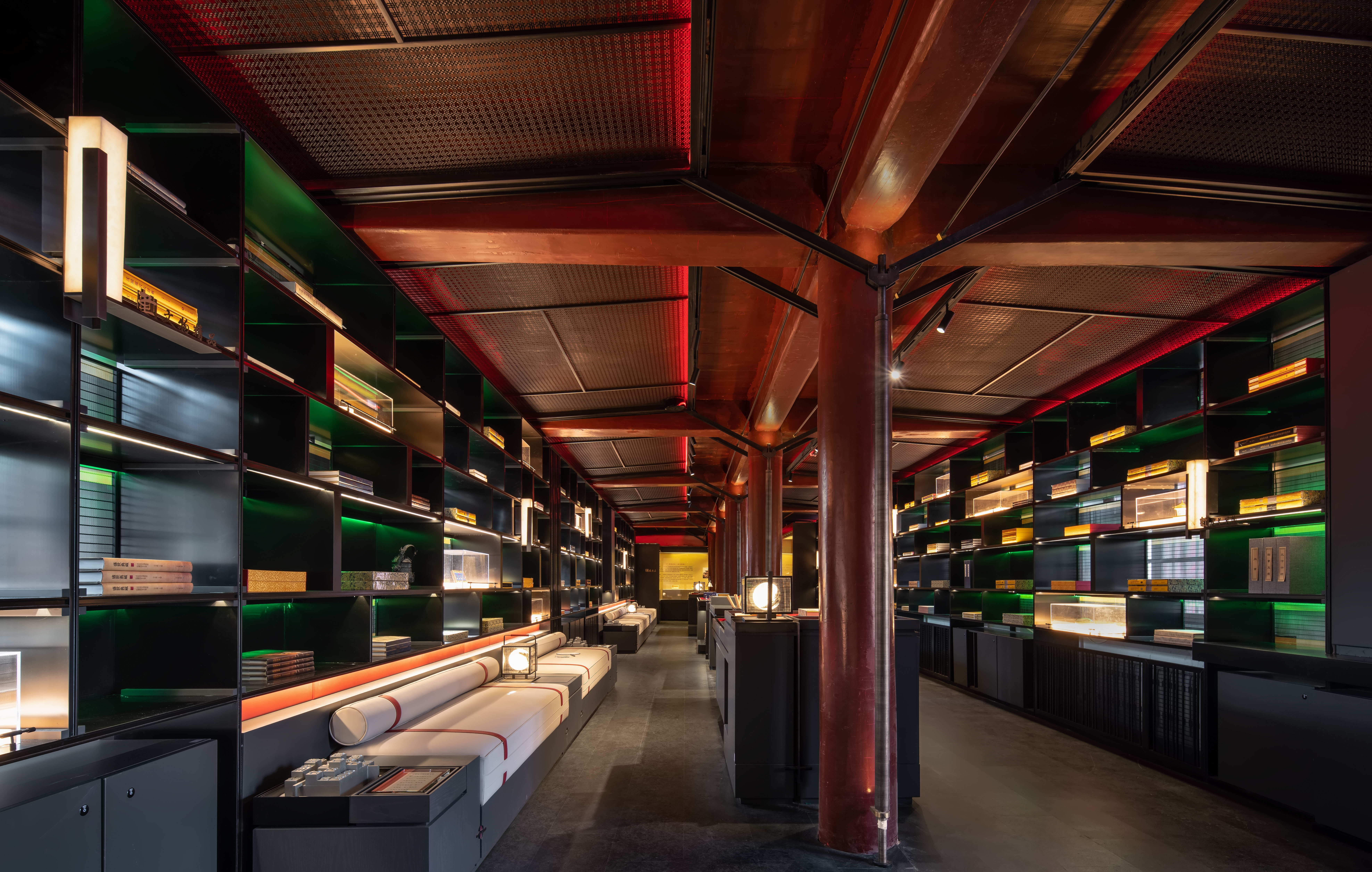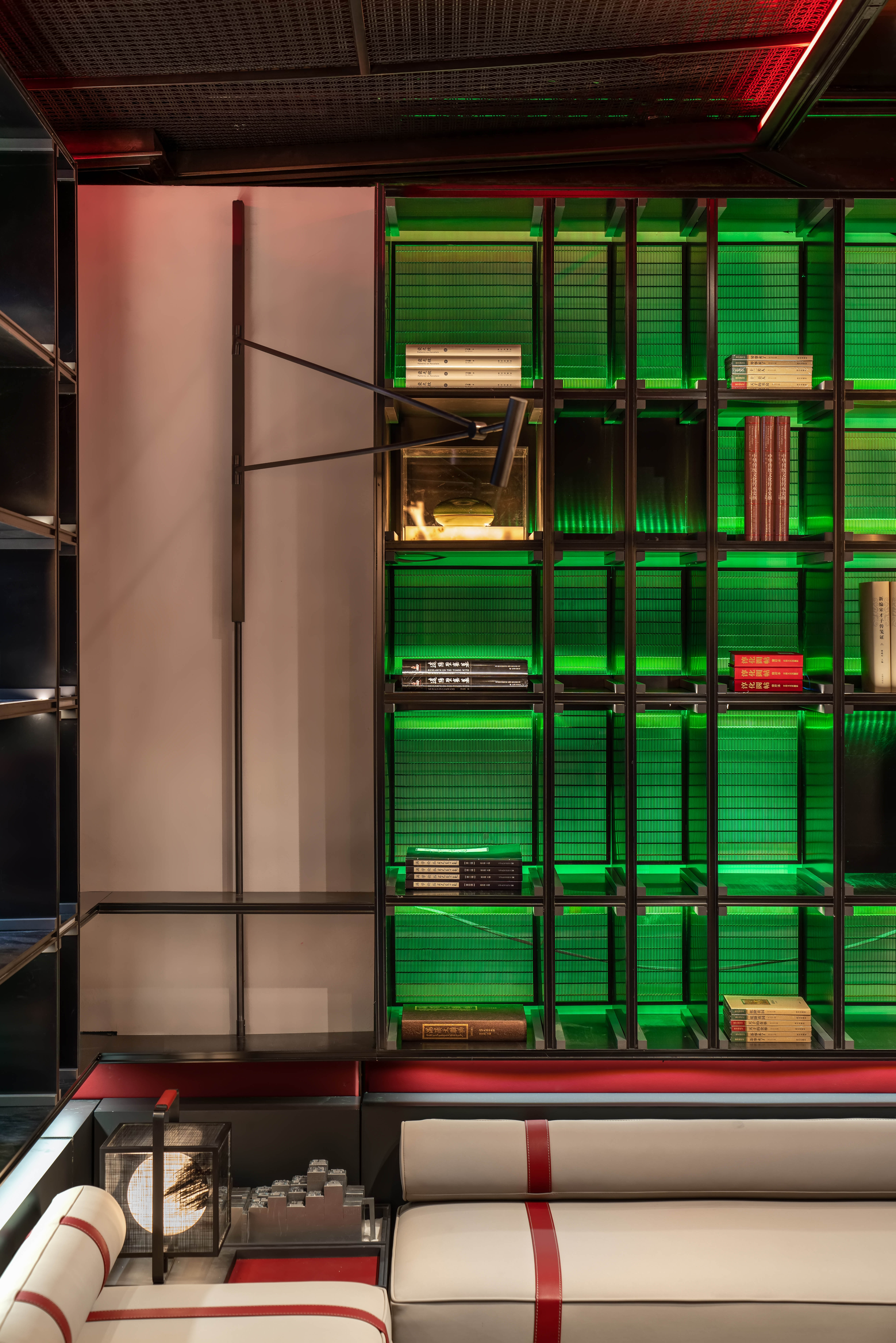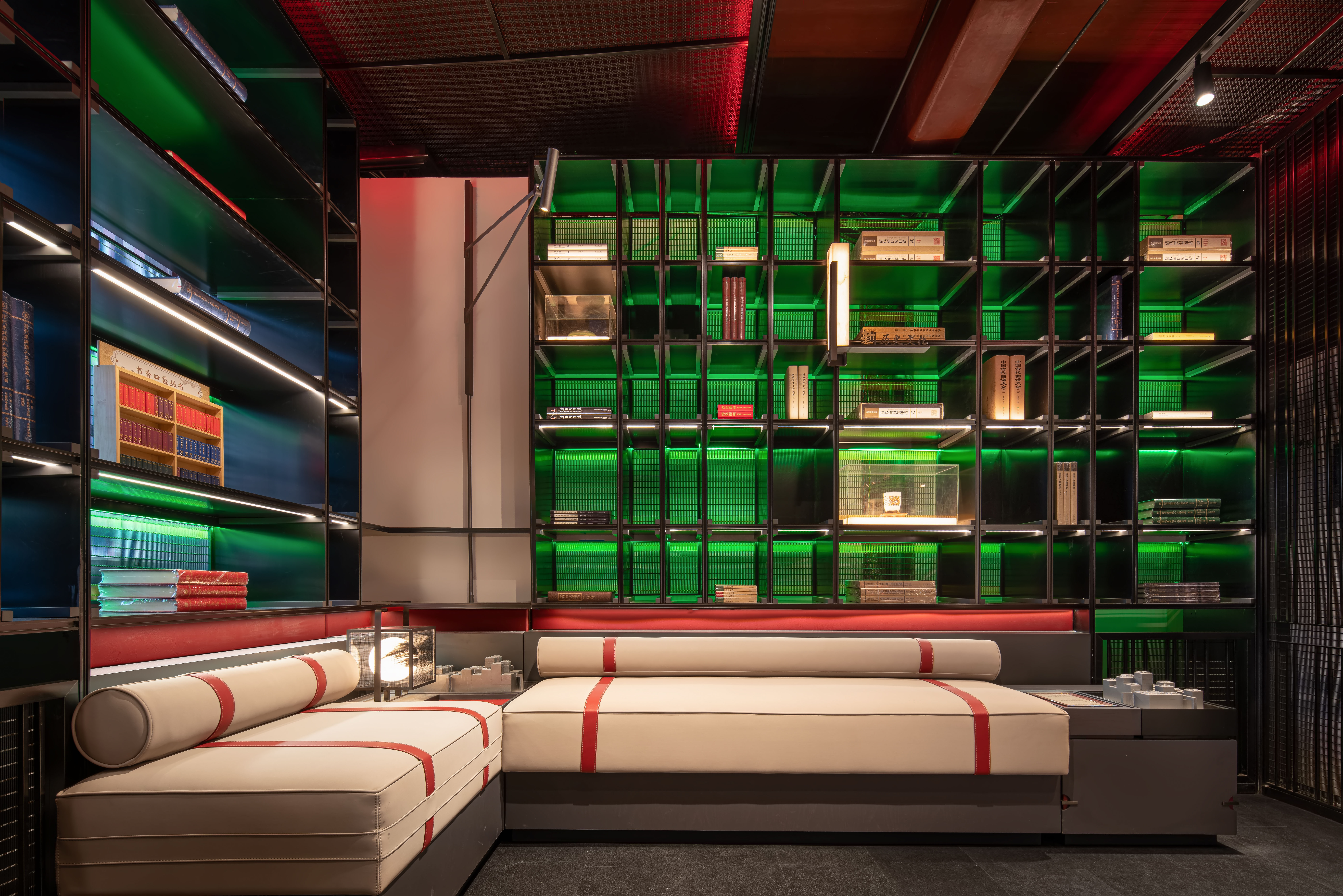 我们用了不同颜色的灯光系统来表达不同的情绪。全红色的灯光代表着故宫的红。红墙绿瓦,花枝楹梁,这是故宫给人的第一印象,故宫的色彩之美,令人心醉神往,走进文博书房,这满目的红,便是故宫最好的形象代言。红绿结合的灯光注入文化背景,应对下午这样一个容易困倦的时光,故宫的大漆红加上文溯阁的琉璃绿,色彩的两阶打开,加上色温的合理布局,形成一个非常轻松的氛围,和故宫的传统文化相连接。赛博蓝代表未来感。故宫是一个古代建筑,赛博朋克则是一个未来感十足的代表,我们希望两者从时间维度出发,让历史的建筑与未来的灯光在当下的时间线去碰撞,从而产生新的当代的情绪价值。 -