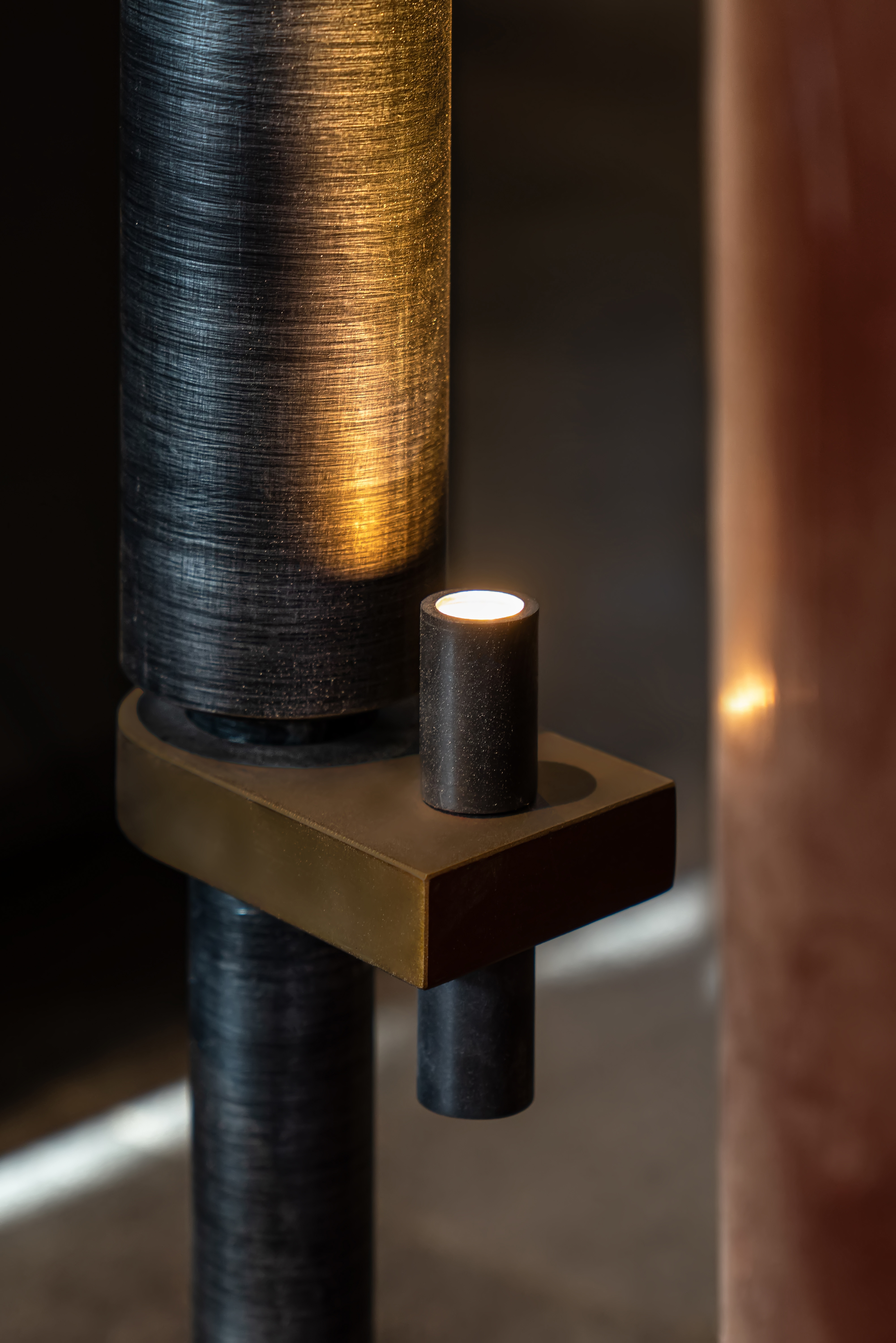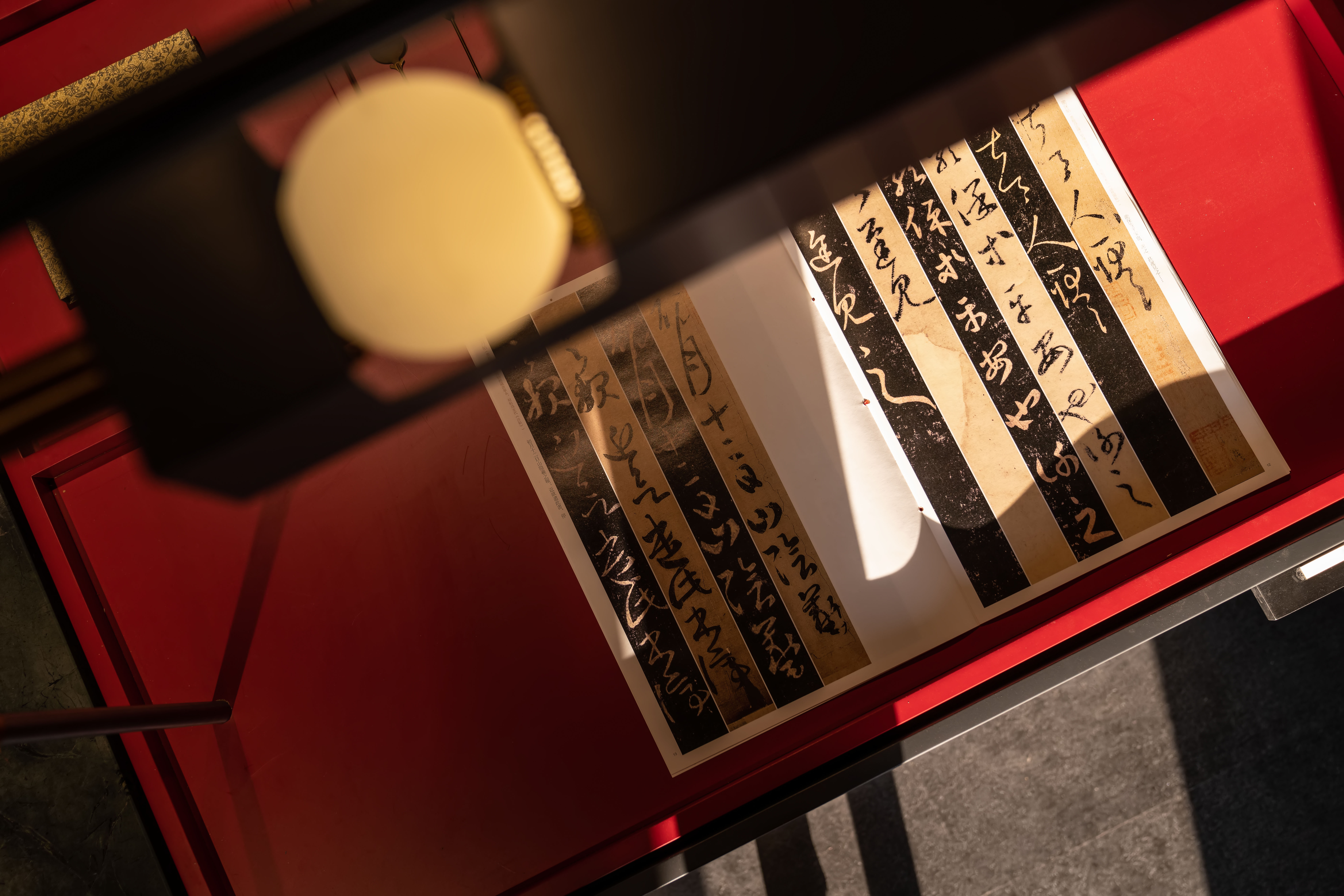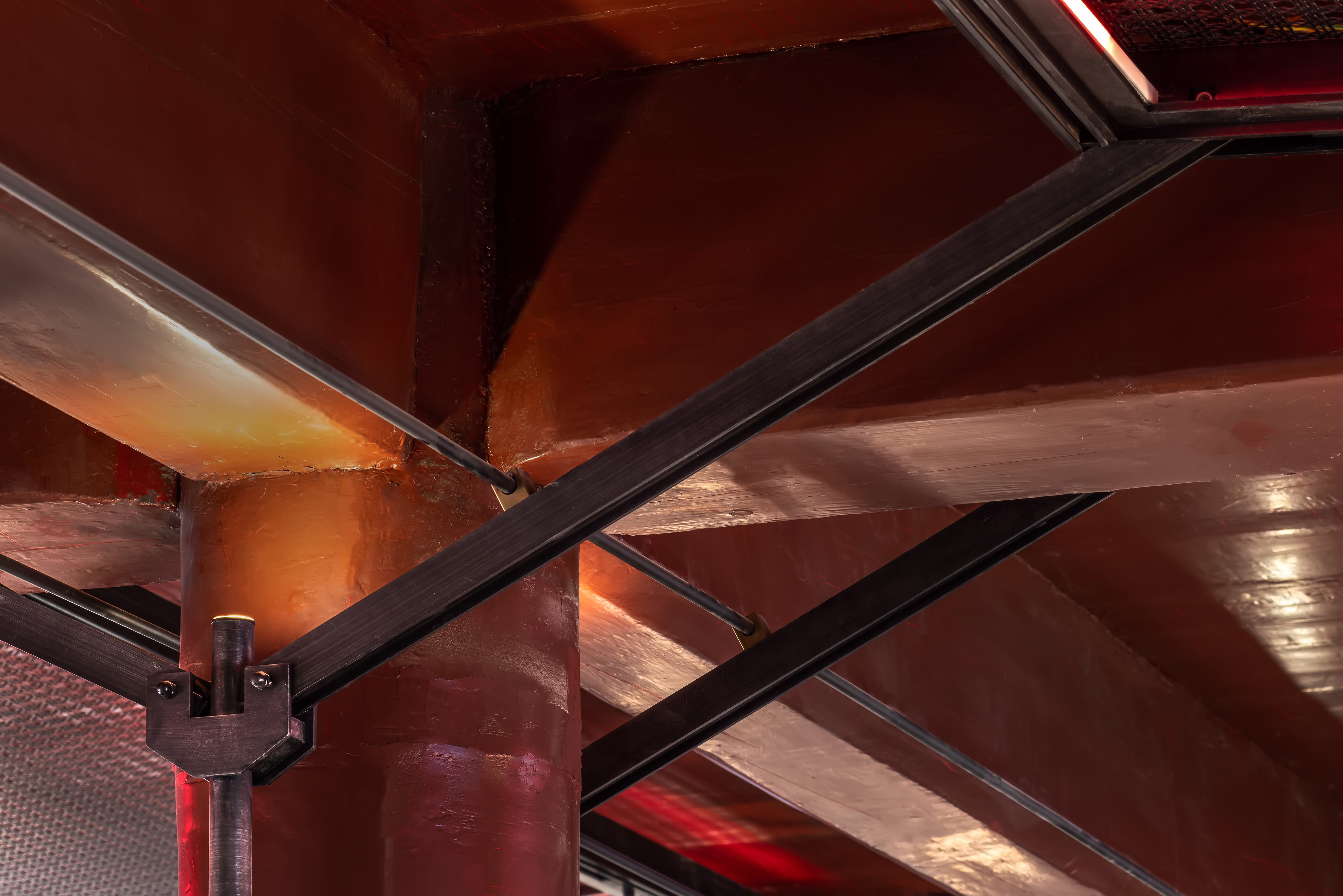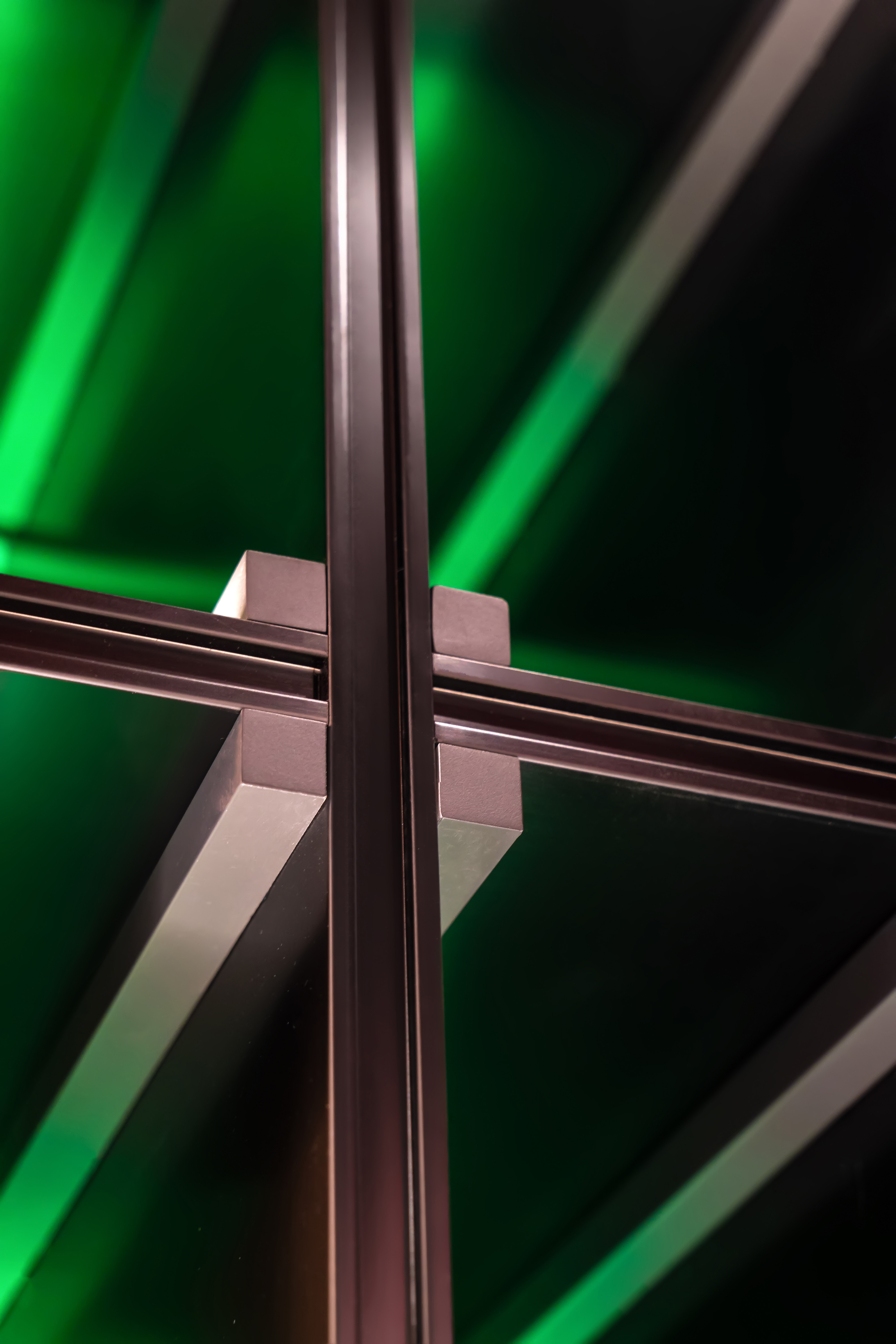 我们用了不同颜色的灯光系统来表达不同的情绪。全红色的灯光代表着故宫的红。红墙绿瓦,花枝楹梁,这是故宫给人的第一印象,故宫的色彩之美,令人心醉神往,走进文博书房,这满目的红,便是故宫最好的形象代言。红绿结合的灯光注入文化背景,应对下午这样一个容易困倦的时光,故宫的大漆红加上文溯阁的琉璃绿,色彩的两阶打开,加上色温的合理布局,形成一个非常轻松的氛围,和故宫的传统文化相连接。赛博蓝代表未来感。故宫是一个古代建筑,赛博朋克则是一个未来感十足的代表,我们希望两者从时间维度出发,让历史的建筑与未来的灯光在当下的时间线去碰撞,从而产生新的当代的情绪价值。 -