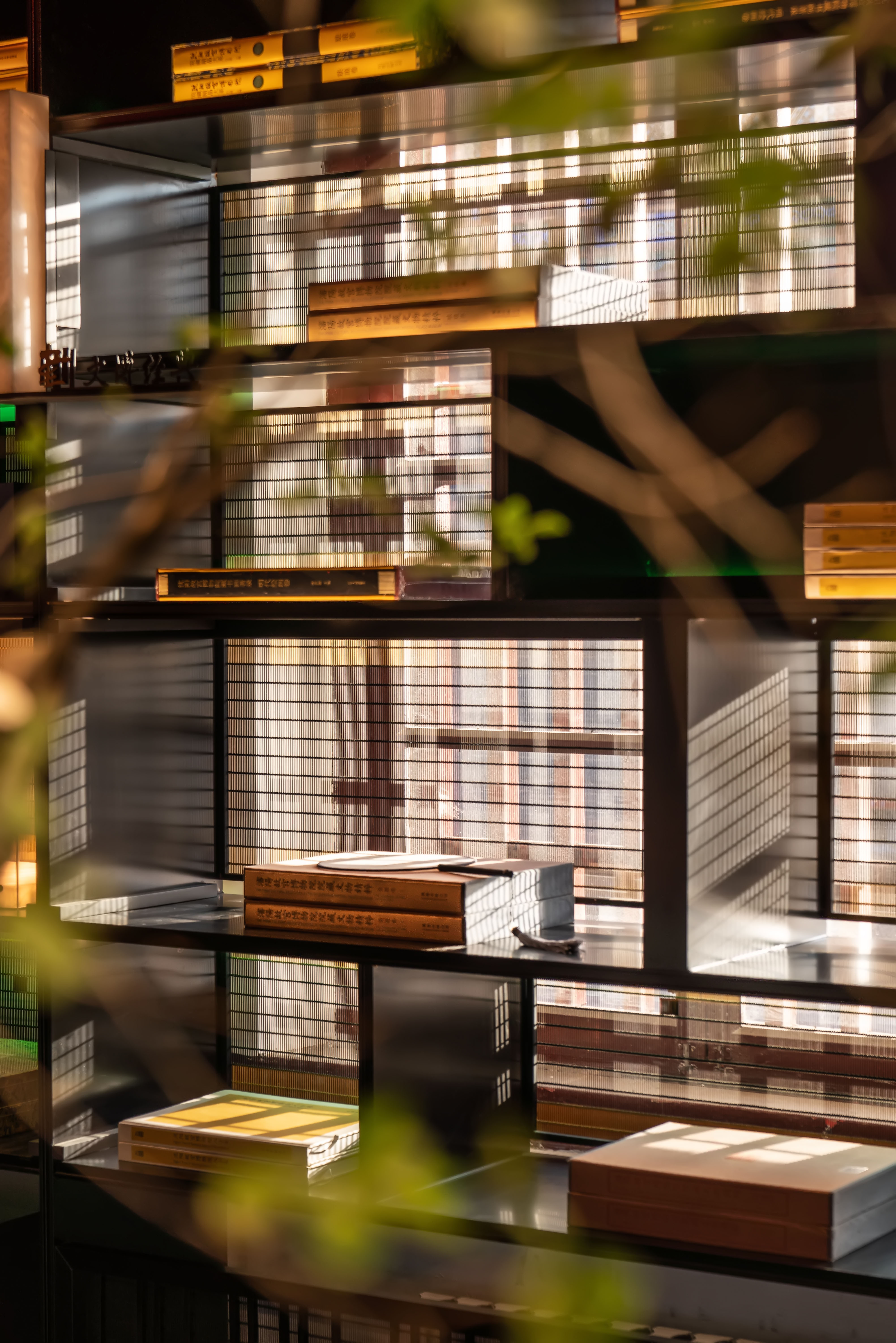 文博书房中所有书架都是采用无背板的设计,七间房的通风都是非常好的,对古建原有的采光和通风没有任何形式的破坏。书房里原本就藏了很多古籍,同时古建也需要自然的空气对流。我们选用金属网做背板,把整个书架背后开放,第一可以把外面的自然光线引进来,第二可以把空气的循环和对流加在一起,产生非常生态的环境,这样更有利于古建寿命的延续以及古董文物的保护。