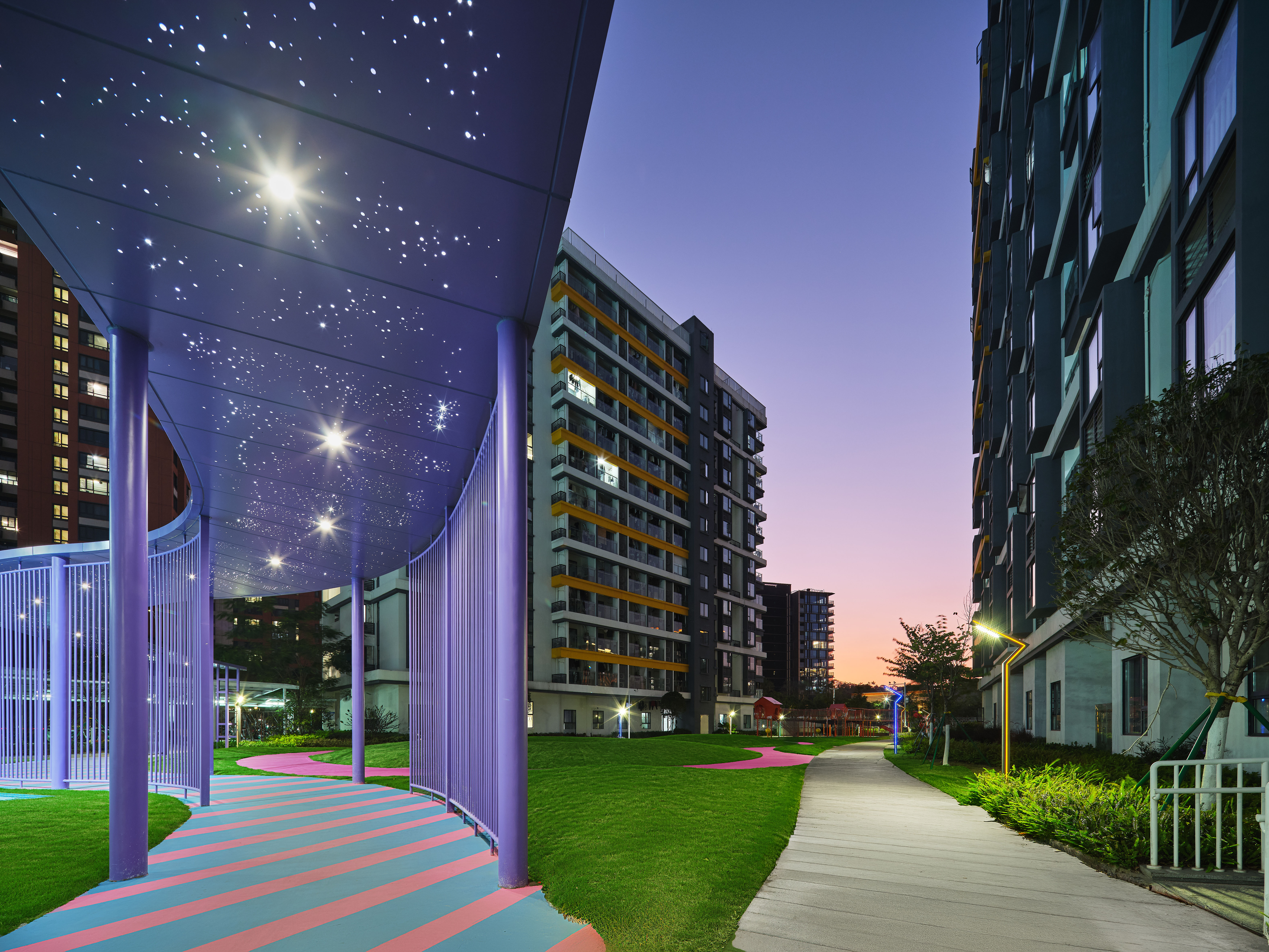紫色围栏和粉色小径上下呼应,通过色彩的运用增强了视觉艺术气息。绿色的草坪在整个场景起了中和的作用,营造出一种自然与艺术相辅相成的感觉。整体在功能性和美观性之间找到平衡,设想漫步在这条粉红色的小路上,感受正当时的宁静与美好。