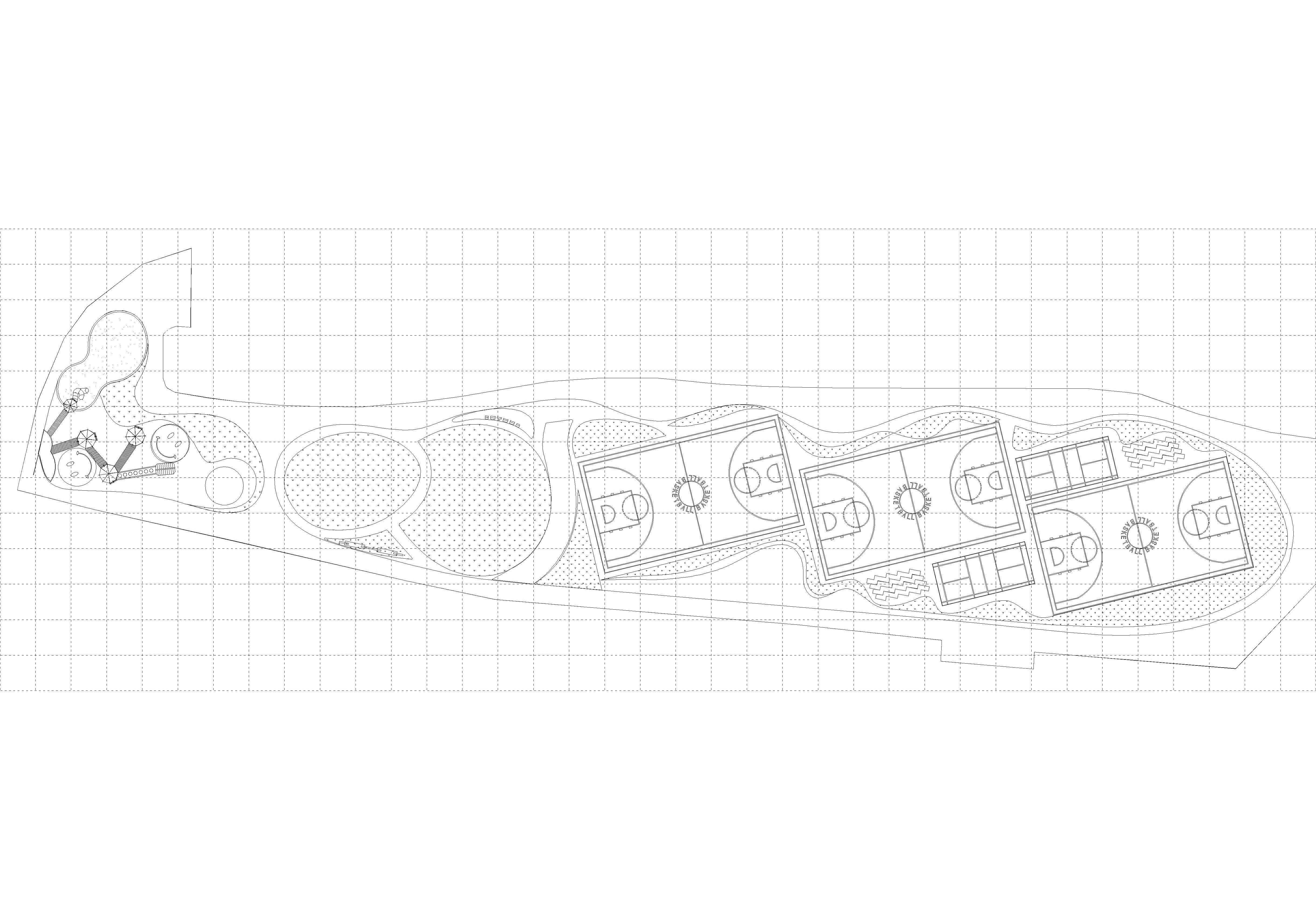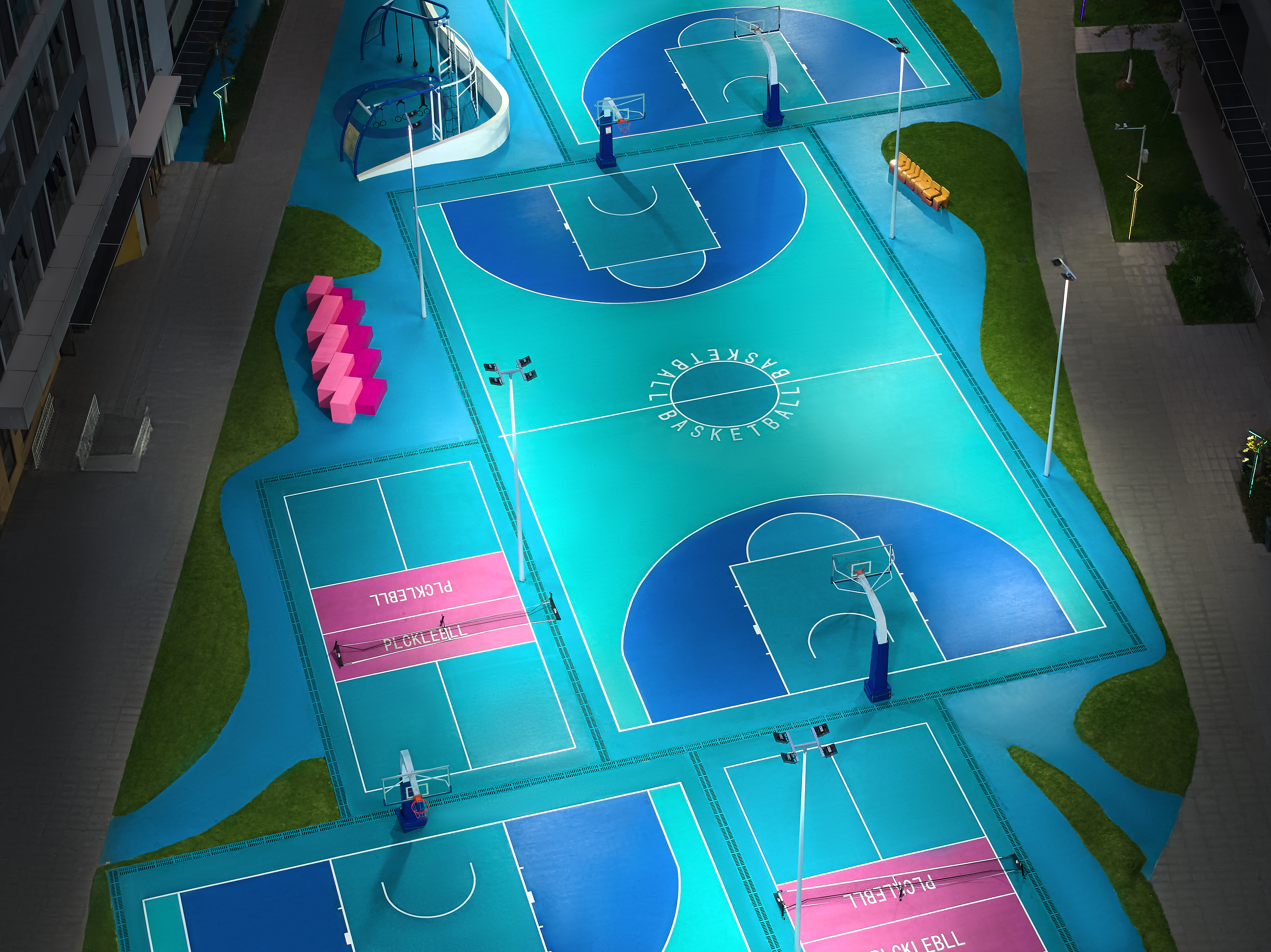 空间布局:甲方要求的功能是需要三个篮球场,两个匹克球场,休闲区以及连廊、儿童拓展区与景观相结合。根据现有的条件,横平竖直的方法占用面积大,影响消防通车,最后我们采用旋转30度的视角,刚好满足了三个篮球场和两个匹克球场的功能,同时还增加了看台。