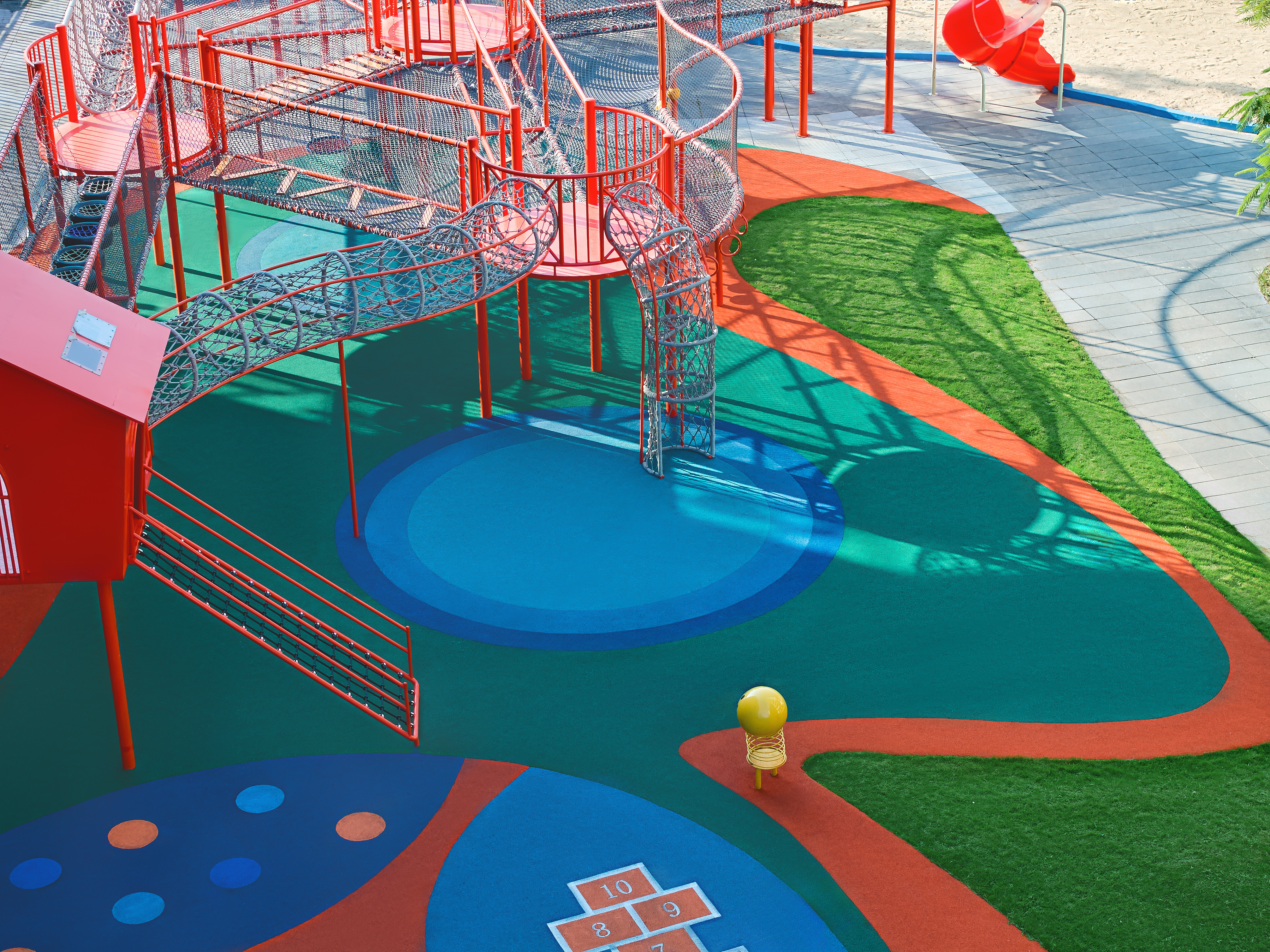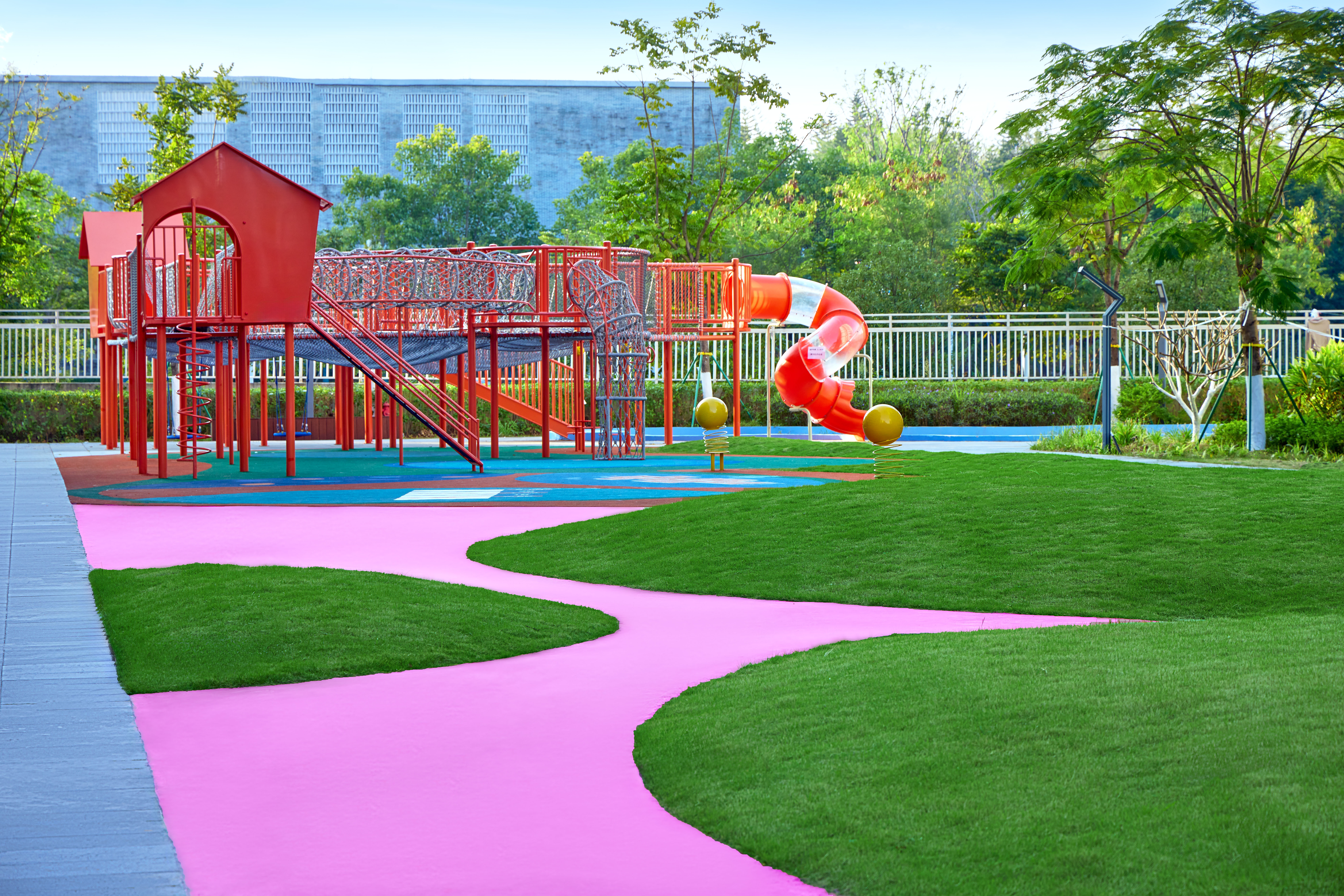 儿童拓展区有趣且富有创意,游乐设施采用了鲜艳的红色和橙色,吸引孩子们的注意力,并激发他们的想象力。滑梯和攀爬架的设计不仅提供了身体锻炼的机会,还鼓励孩子们进行探索和冒险。粉色的小径蜿蜒穿过绿色的草地,营造出一种轻松愉快的氛围。