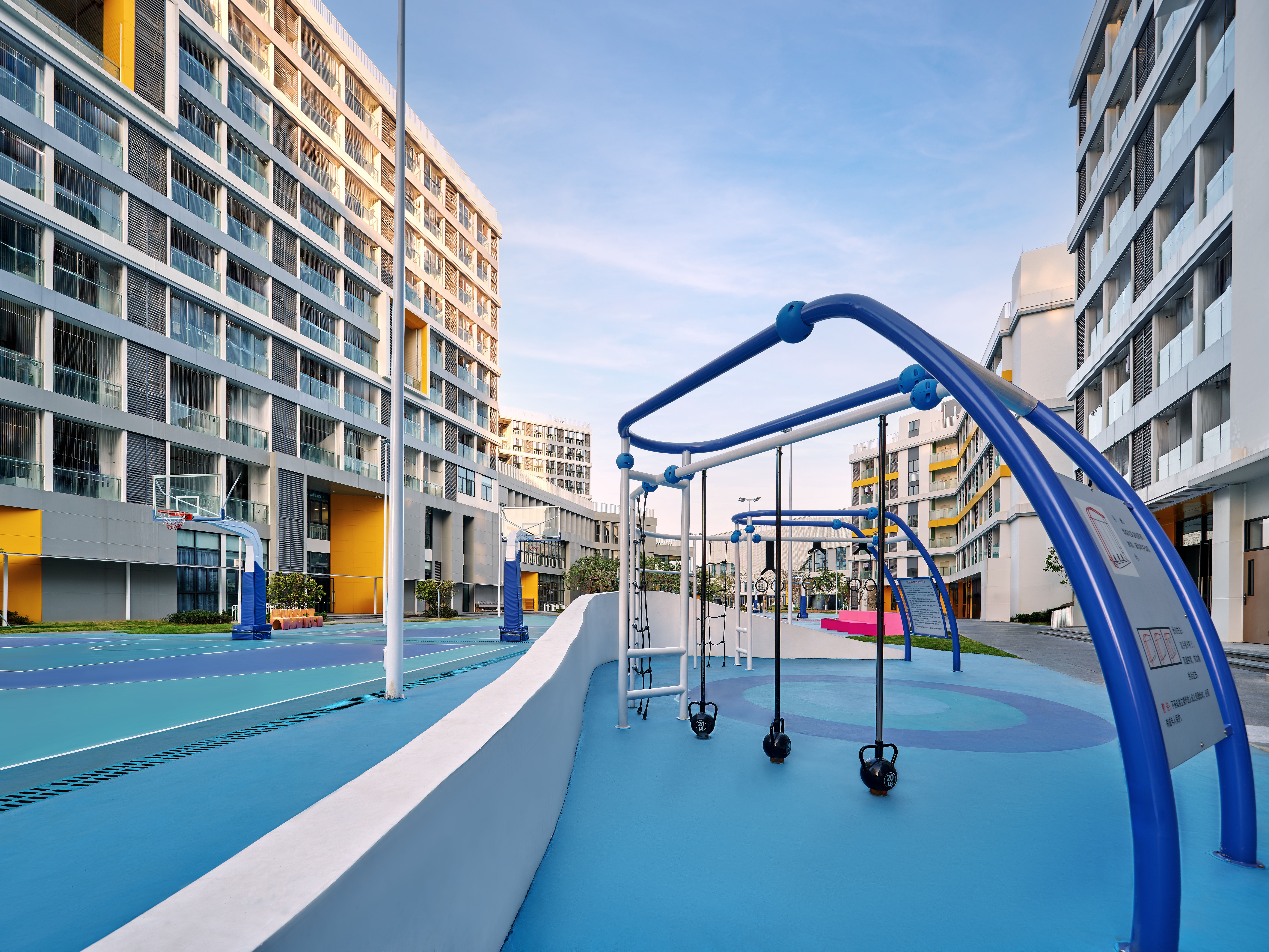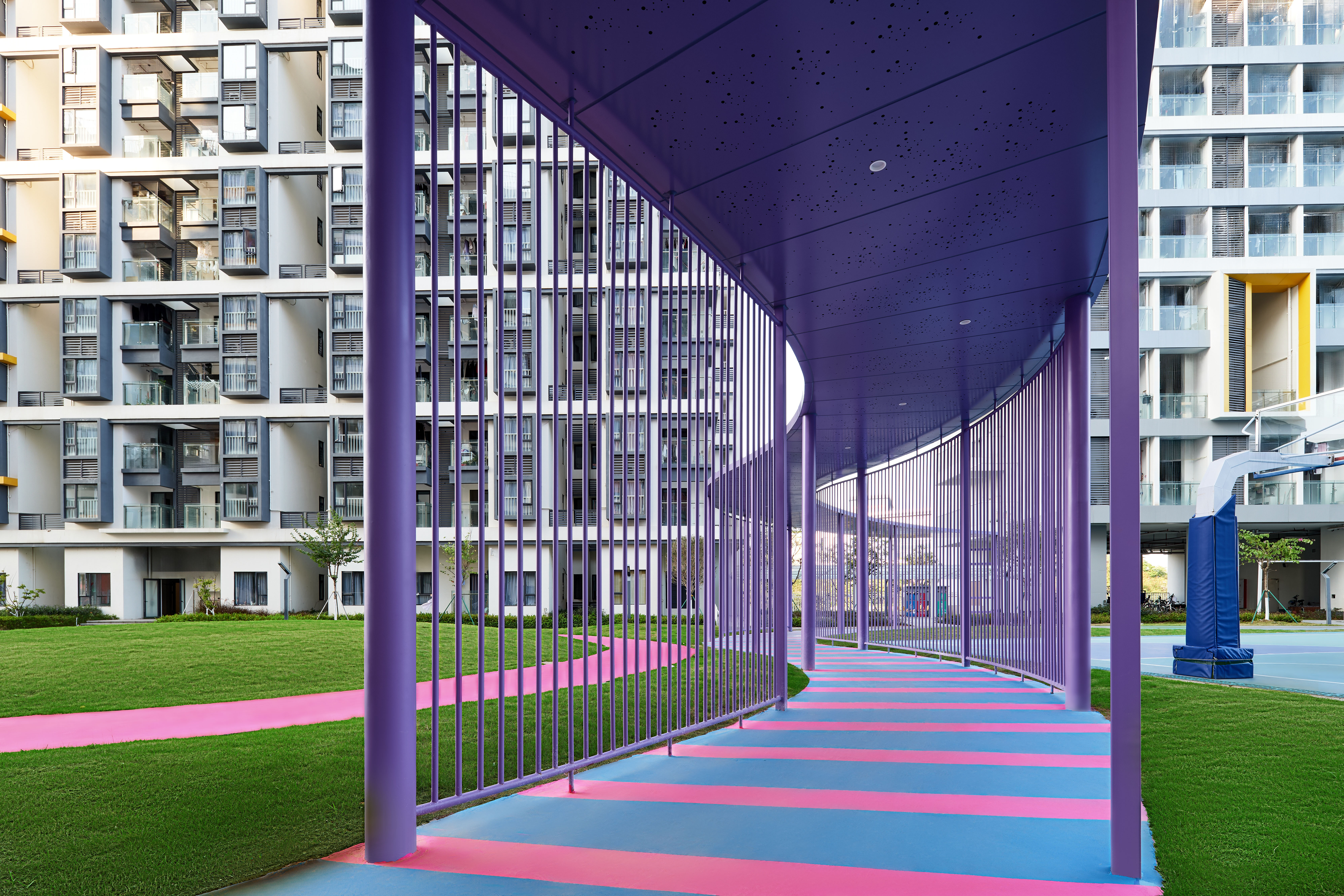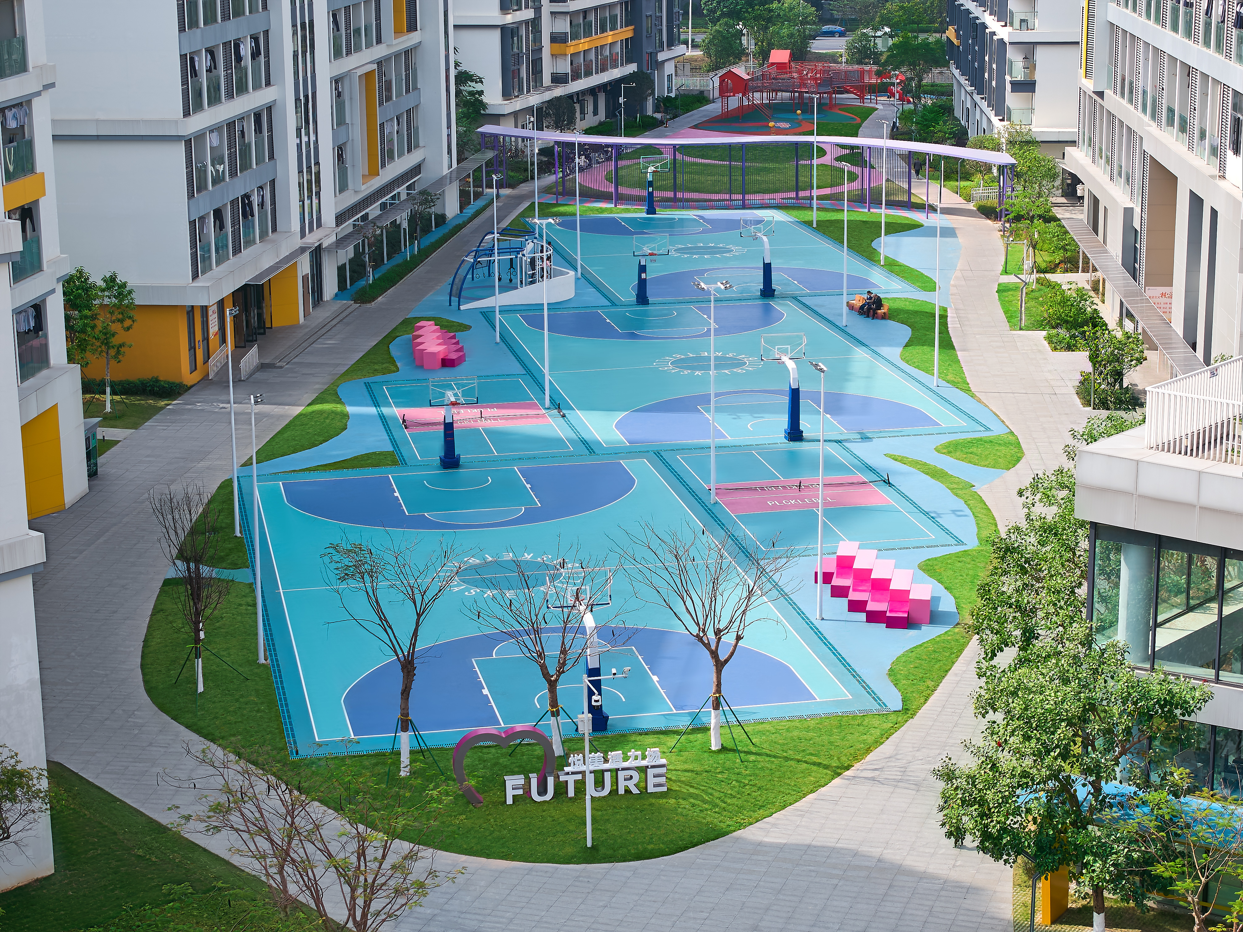 通过使用鲜艳的蓝色和粉色,活动场地不仅显得生动活泼,还能激发学生们的运动热情。周围的绿化和步道为学生提供了休息和放松的空间,同时也增强了整个区域的美观度。