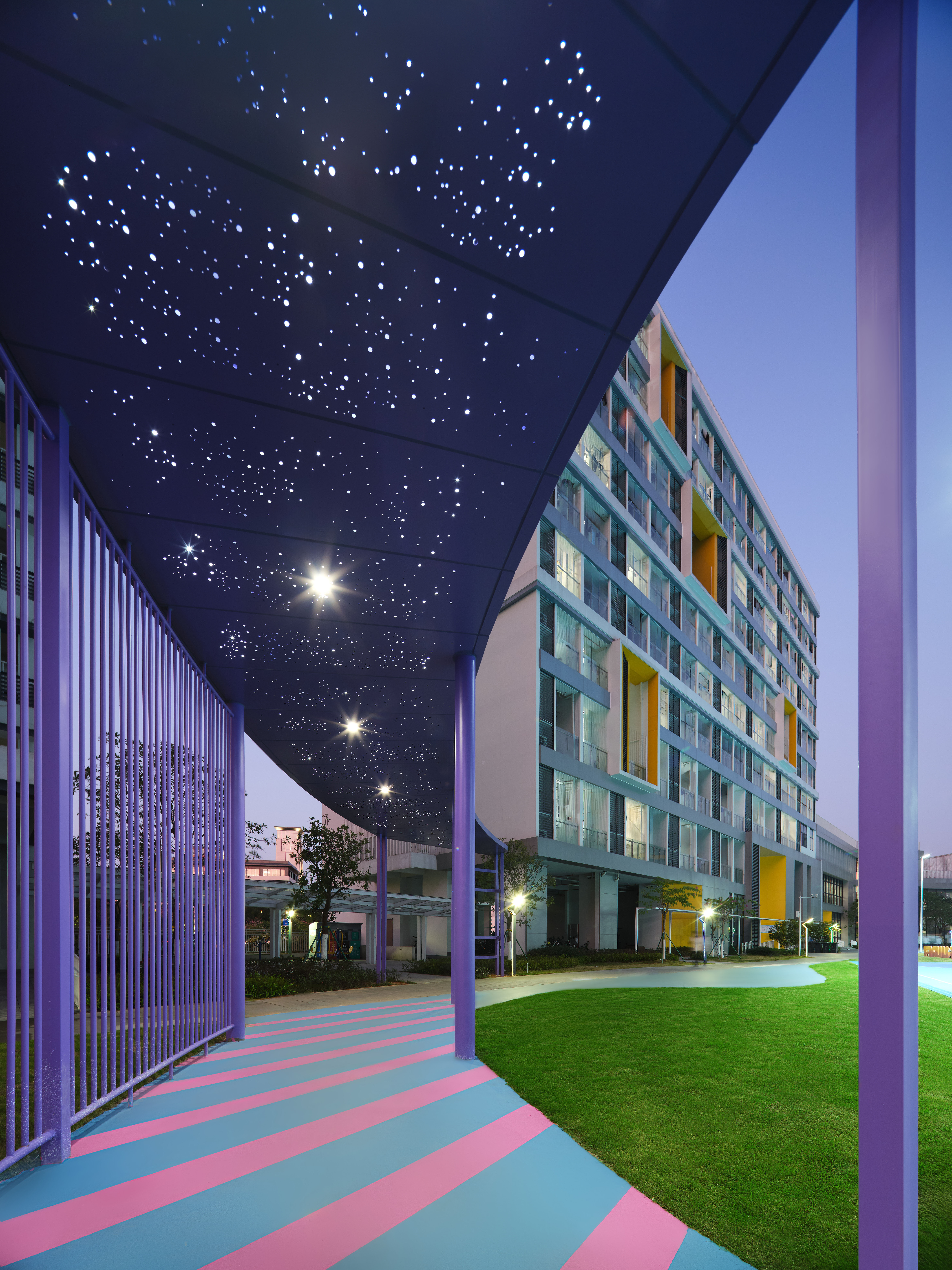 夜晚的时刻,整个球场从远处像银河星际又像蓝色大海、又如蓝色星空、同时具有未来科技感。每一处空间都是艺术与功能的完美结合,每一处细节都是对未来教育的美好期许。
