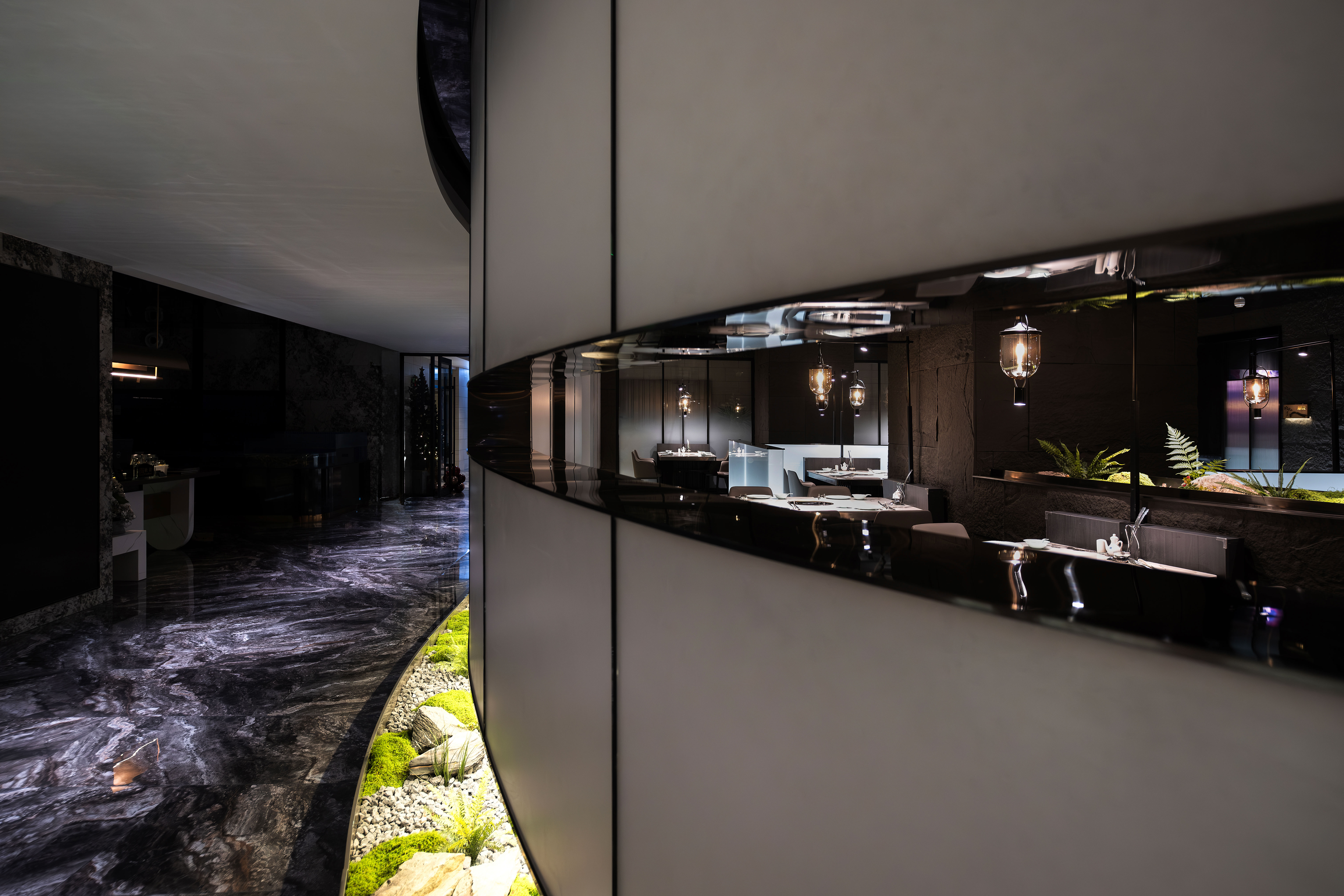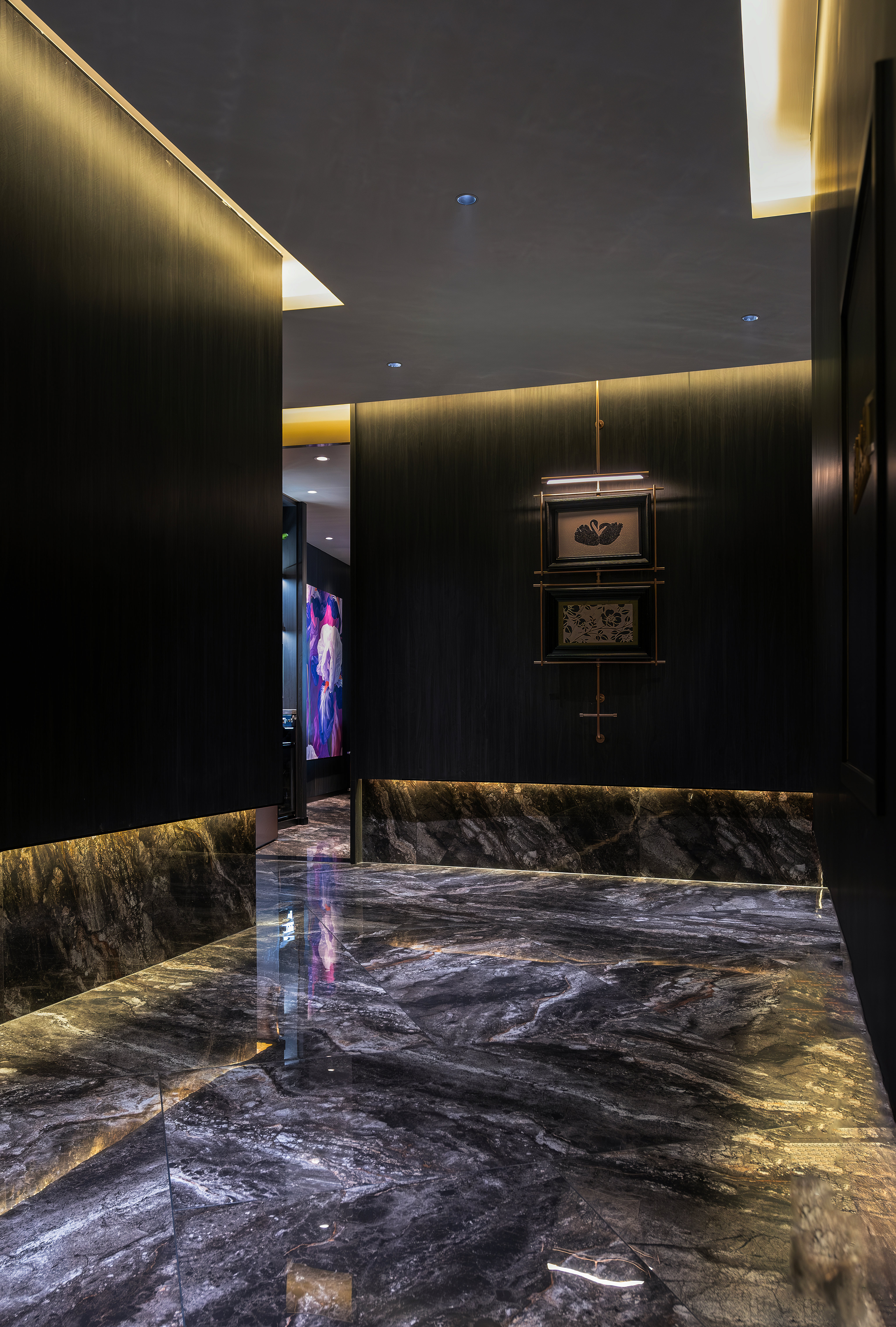 设计选材:生态金属碳晶板、环保冰珀板、深空灰蜂窝不锈钢、绢丝壁布、生态肌理艺术漆。