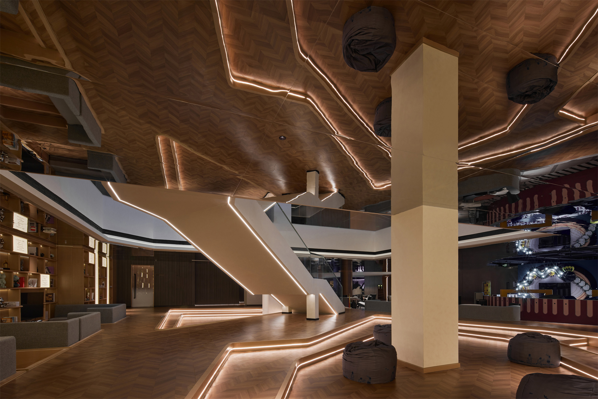 空间意境:一层提炼很多西安古城墙元素,融入到设计当中,二层休闲区设计休闲网红为主