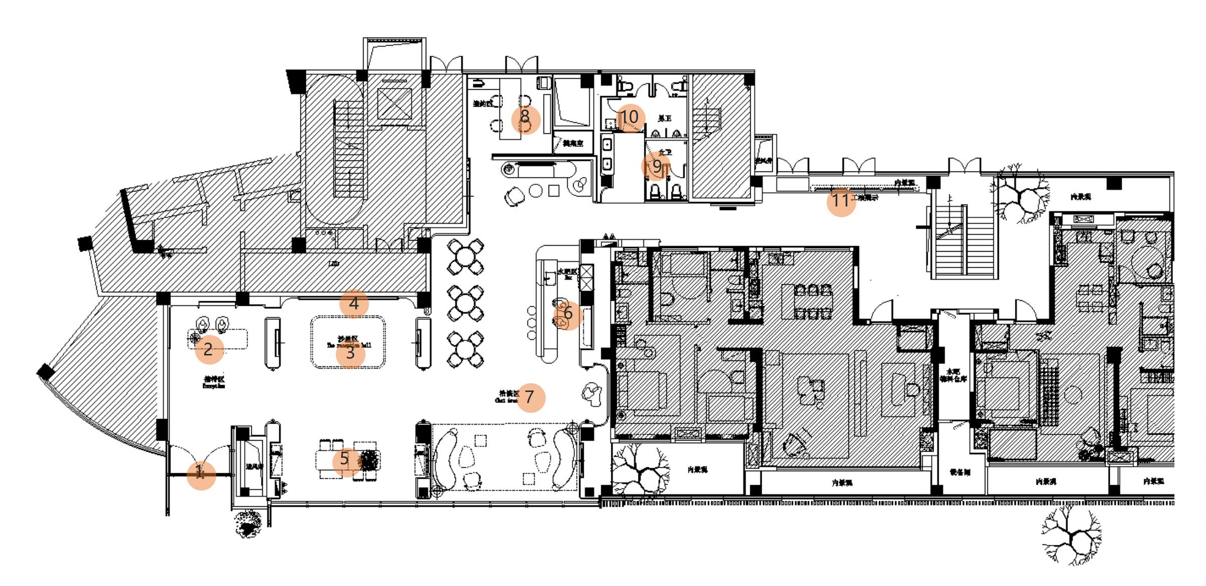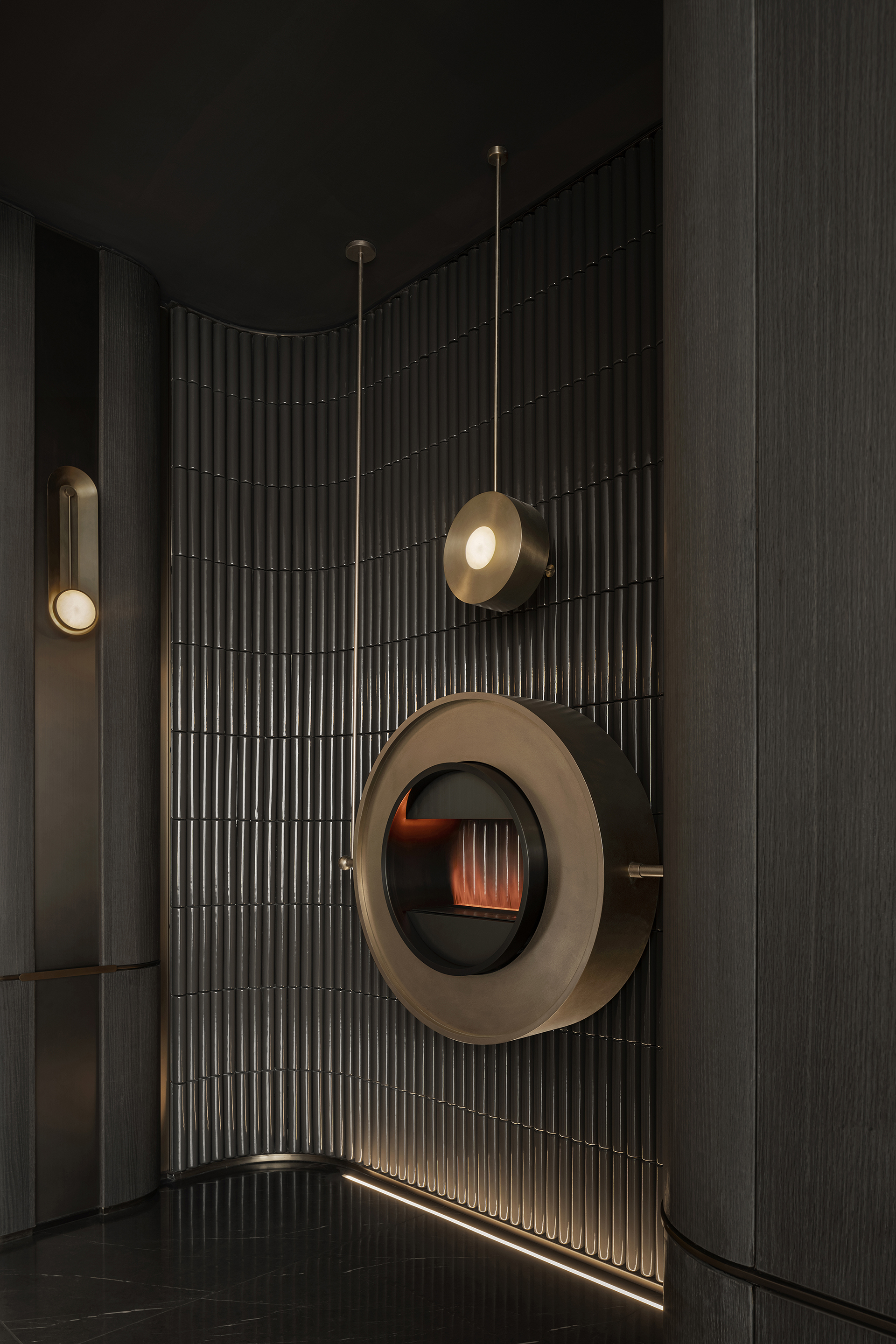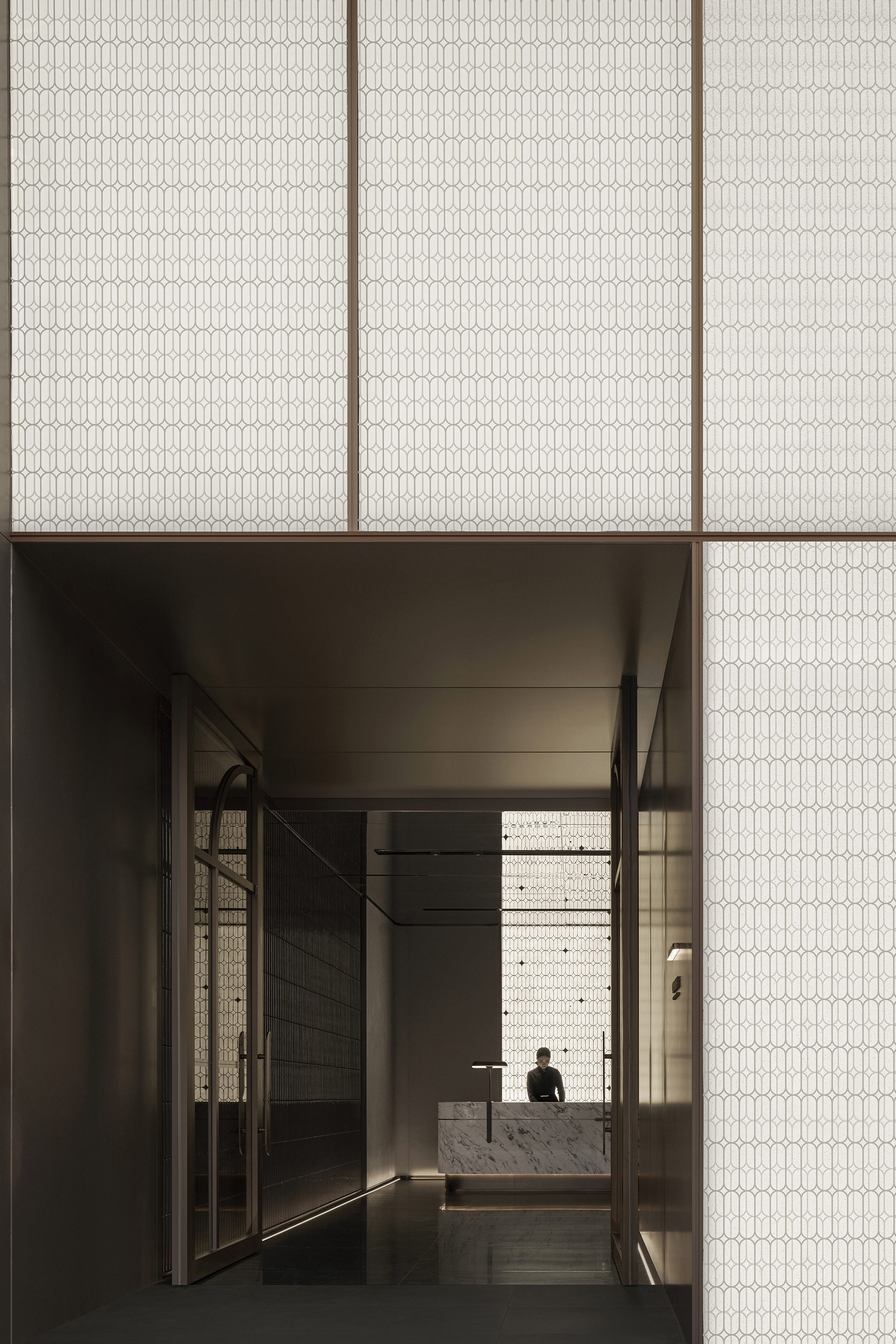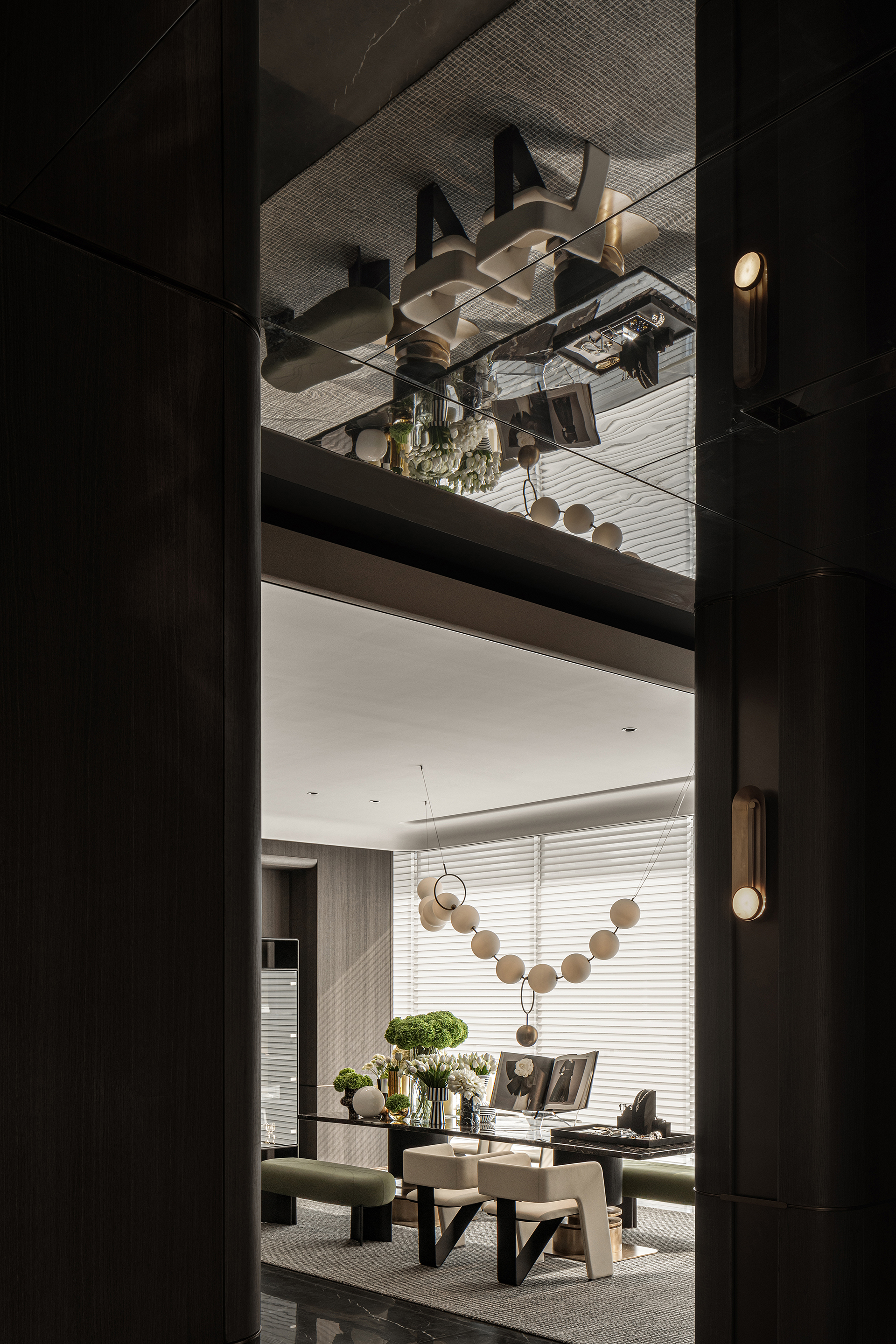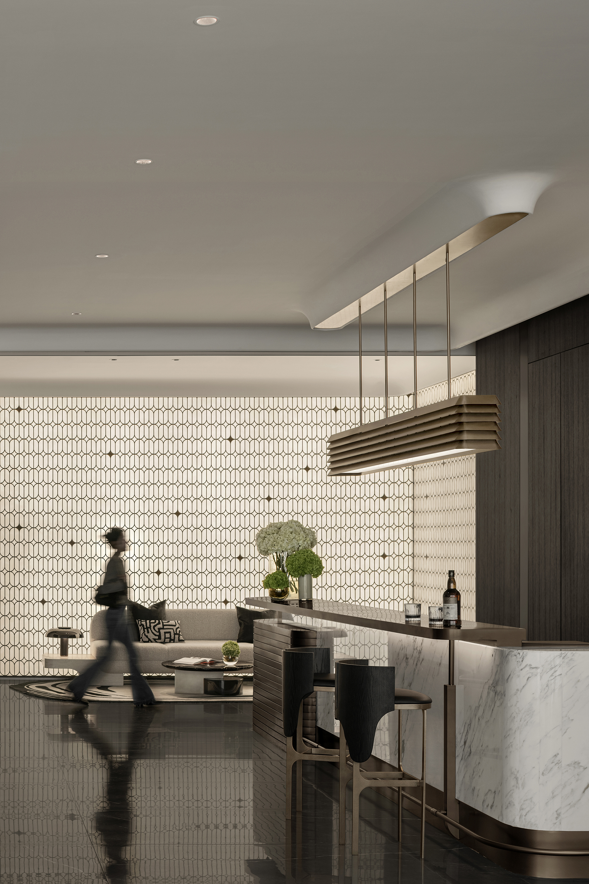 空间意境:接待大堂作为空间的开端,首要强调仪式感。大面积重复嵌套纹样的墙面,形成一幅立体的画作,入场即给人以强烈的视觉冲击,金色线条与之相组合,尽显奢潮的都市氛围。门仪礼序层层递入,大理石接待台宛如天然的水墨画,诗意中带着朦胧,轻盈的金属灯具与之相辅相成,多了份浪漫的格调。多功能区垂坠而下的灯具好似一串大型耀眼的珠宝,玻璃球般圆润造型,加以金属的折射,与柔和灯光进行奇妙交汇,拓展了场域的想象力。同时作为空间的艺术品,点缀了美丽和诗意。深入空间当中,木饰面的温润,结合中轴对称格局,形成空间的秩序感。洽谈区与水吧区相结合,打造为时尚与品质兼具的会所空间,通过简洁设计语言,融入艺术精神,展现了都市摩登生活方式。