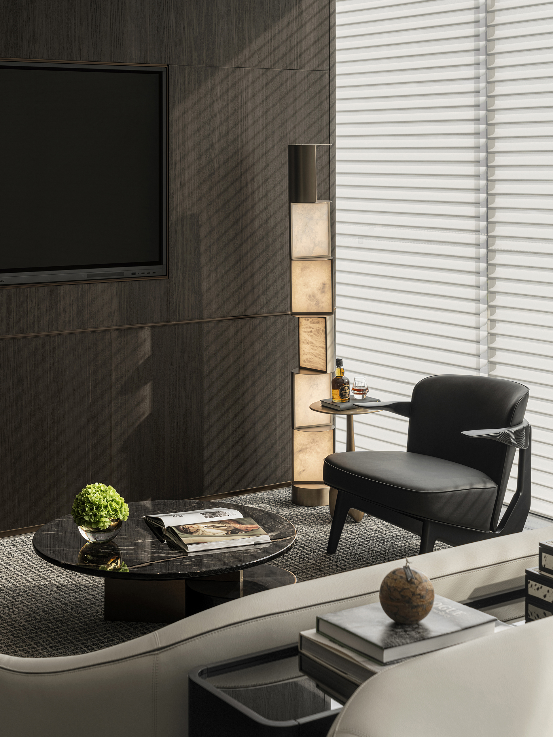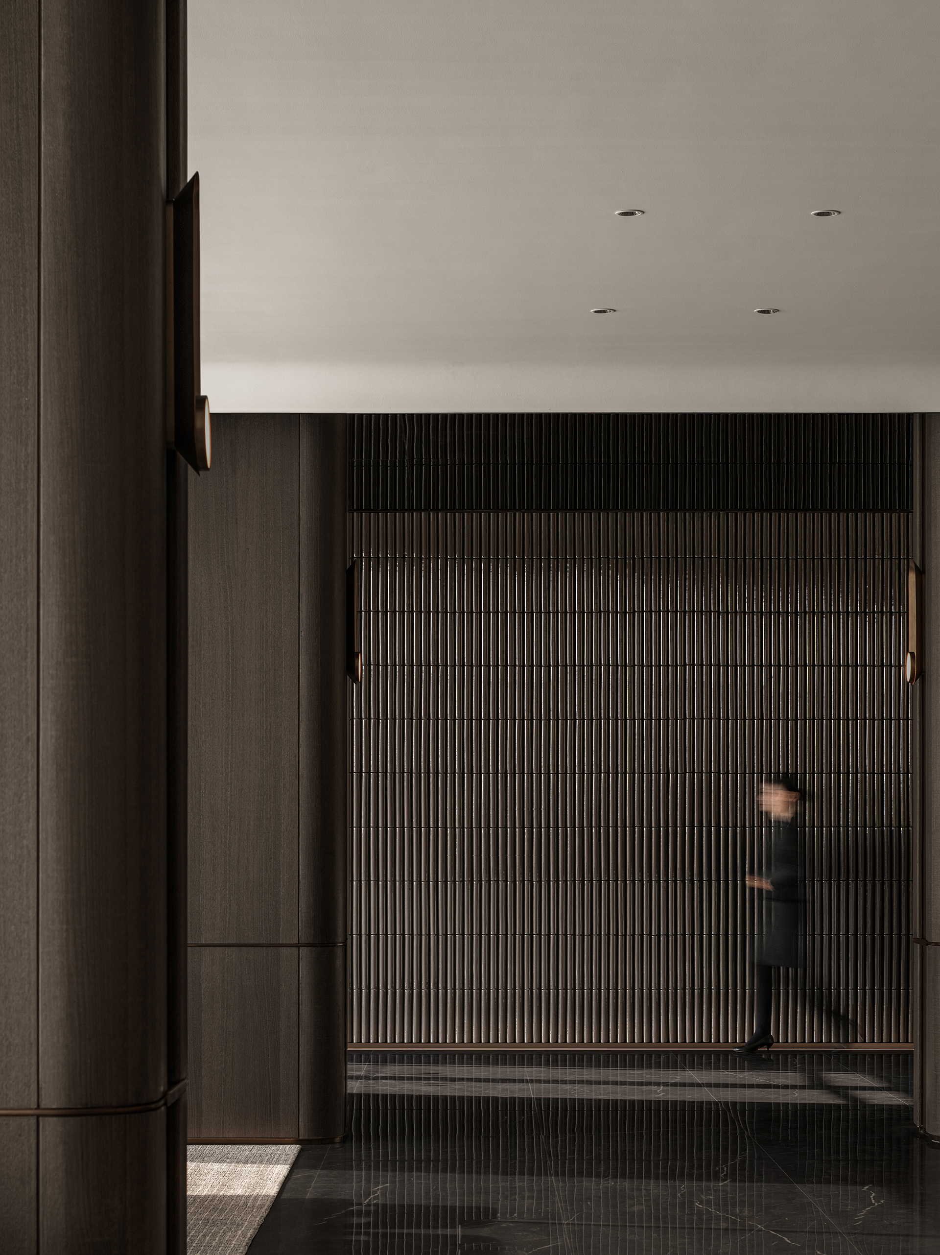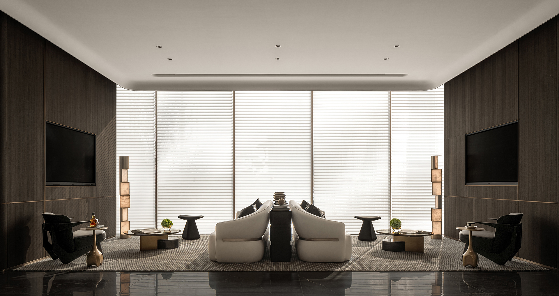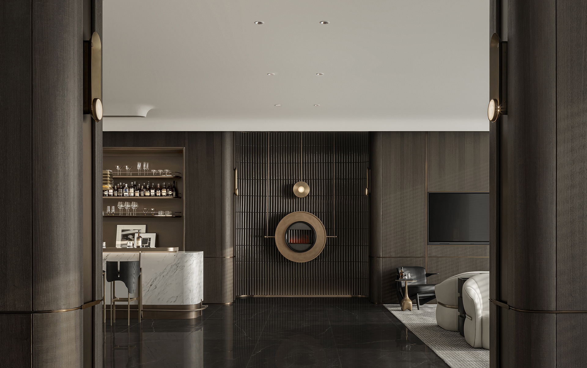 空间布局:深入空间当中,木饰面的温润,结合中轴对称格局,形成空间的秩序感。洽谈区与水吧区相结合,打造为时尚与品质兼具的会所空间,通过简洁设计语言,融入艺术精神,展现了都市摩登生活方式。