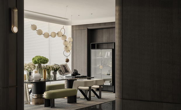 设计选材:茶几,皮革座椅,富于艺术造型的家具,在细节中体现高阶生活方式的考究。石材,金属,皮革等不同材质之间的碰撞,无声地体现出品质感。空间集商务,艺术,城市生活于一体,在这里连接艺术,连接生活。金属体块与大理石吧台的穿插,多重肌理质感碰撞融合,形成趣味的水吧台装置。大胆的装饰趣味增添了空间的戏剧感,重复嵌套纹样的墙面与前厅空间形成趣味映衬。临窗而坐的洽谈区,通过穿插其中的岛台,形成对称布局,透光自然光的引入,形成净透空间。米色,墨黑,以及灰色的结合,让整体气质充满着雅致,而金属元素及艺术品点缀其中,不经意展示出大都会的时尚气息。