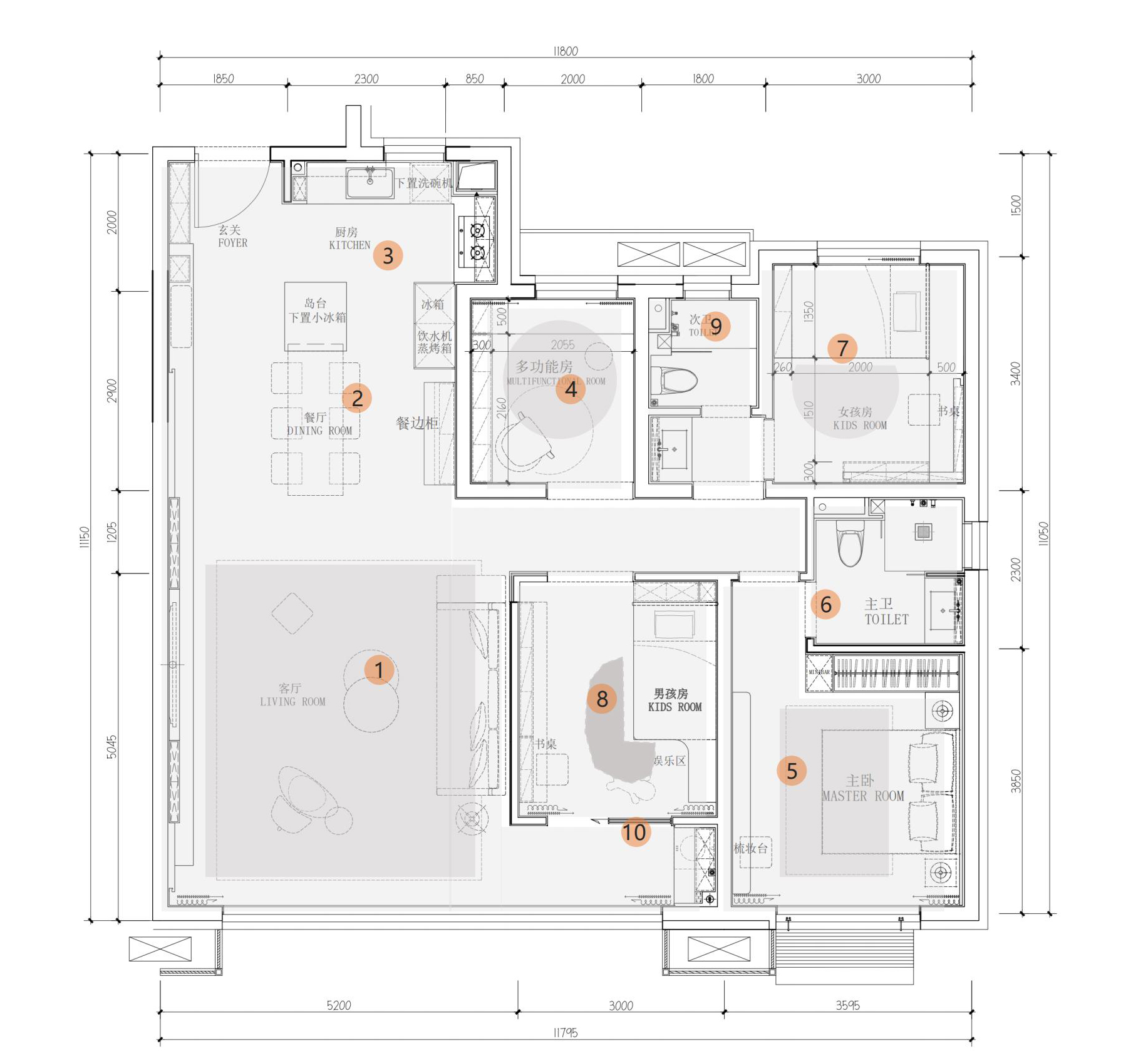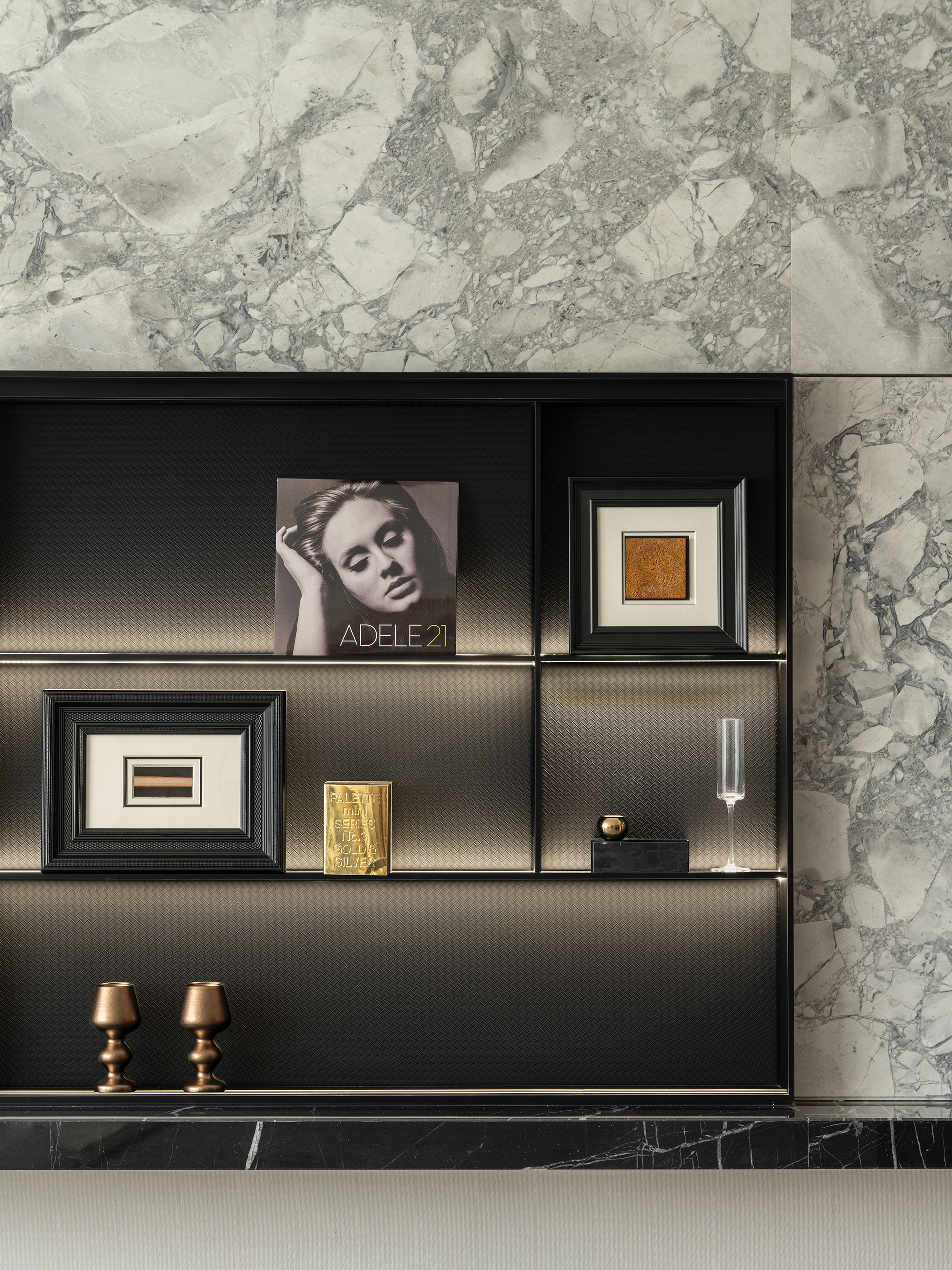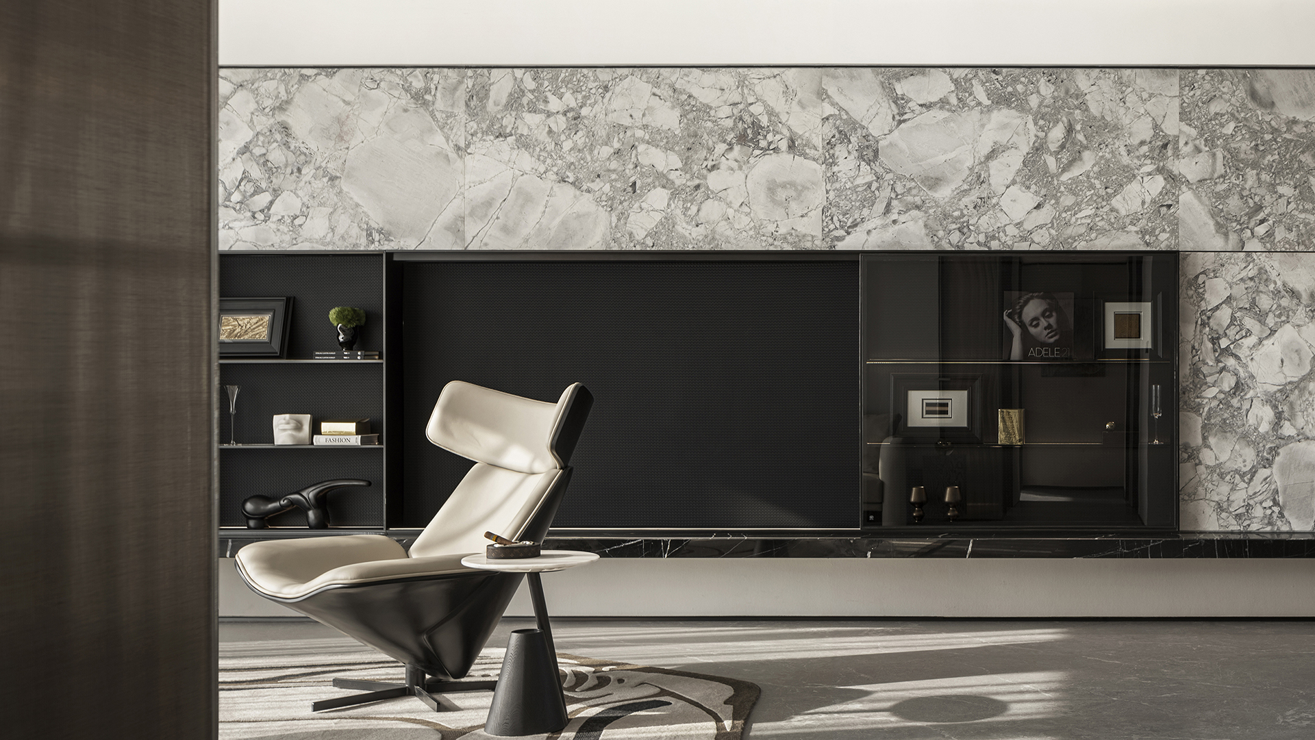 项目定位:客厅,承载了家庭的温暖以及欢聚的快乐。中央如同一个漂浮的小岛,柔软舒适的皮质沙发和大理石弧形茶几围合其中,陷于躺椅当中,伴随着暖阳,沉浸于宁静的时光,仿佛可以听到岁月的荡漾声。