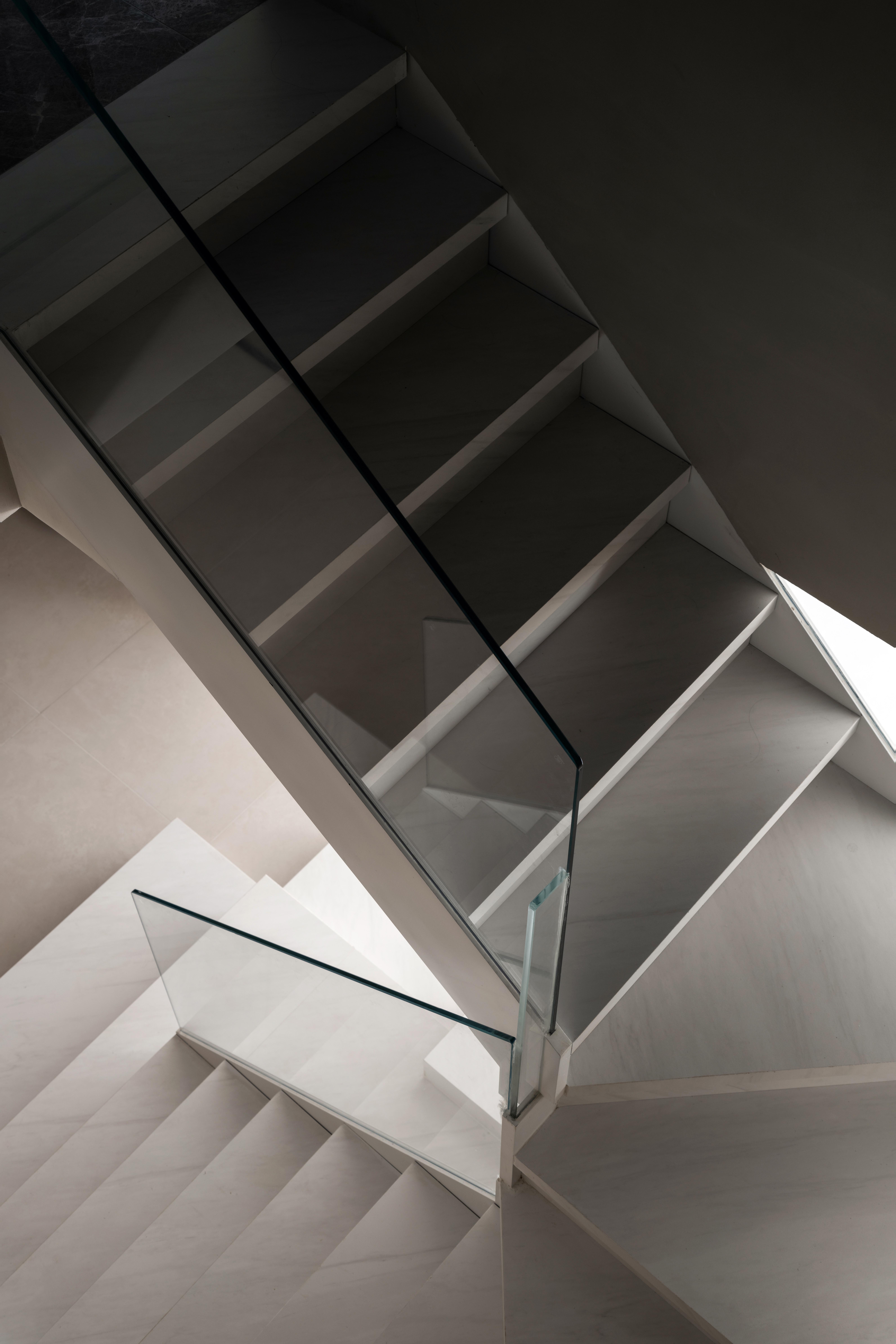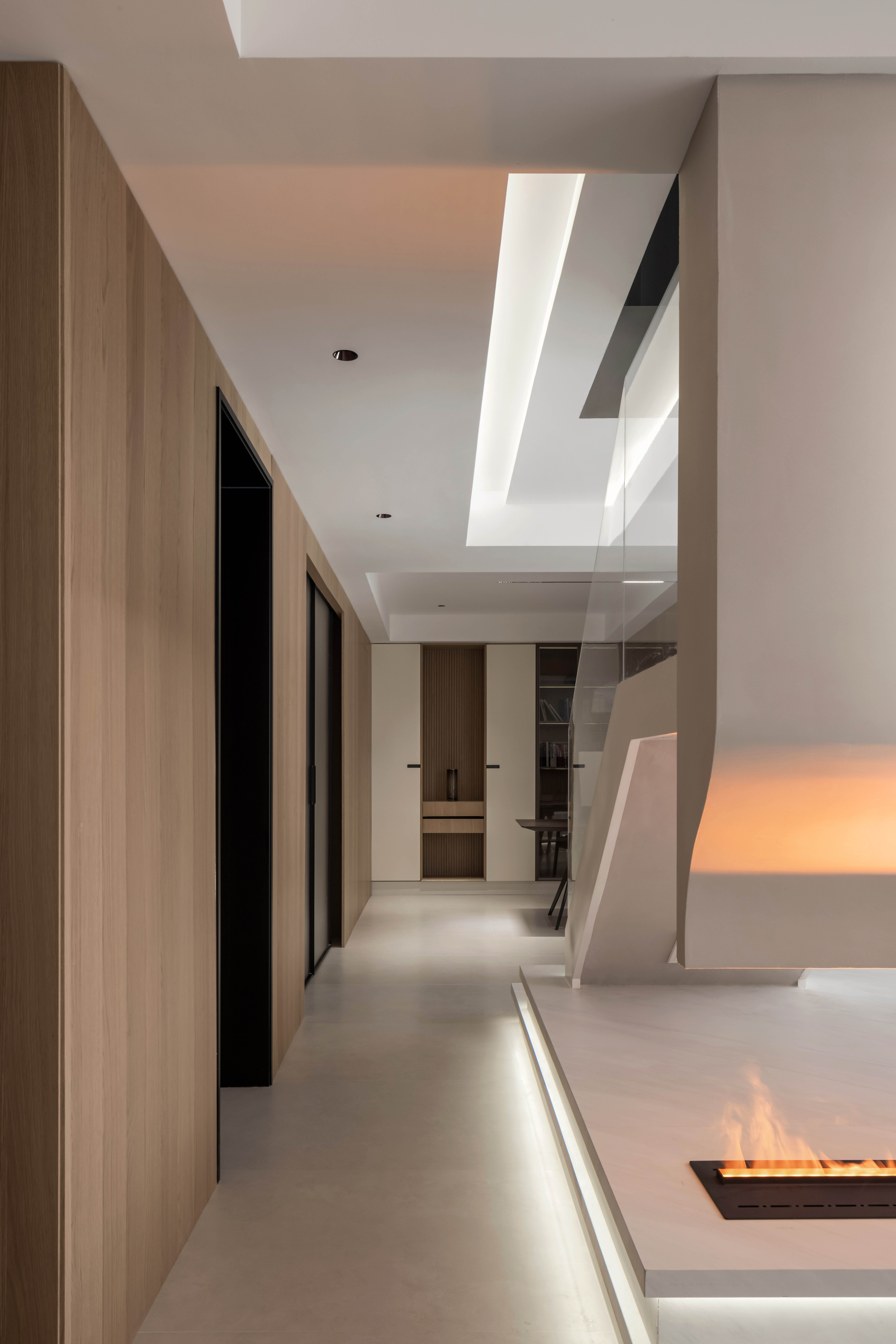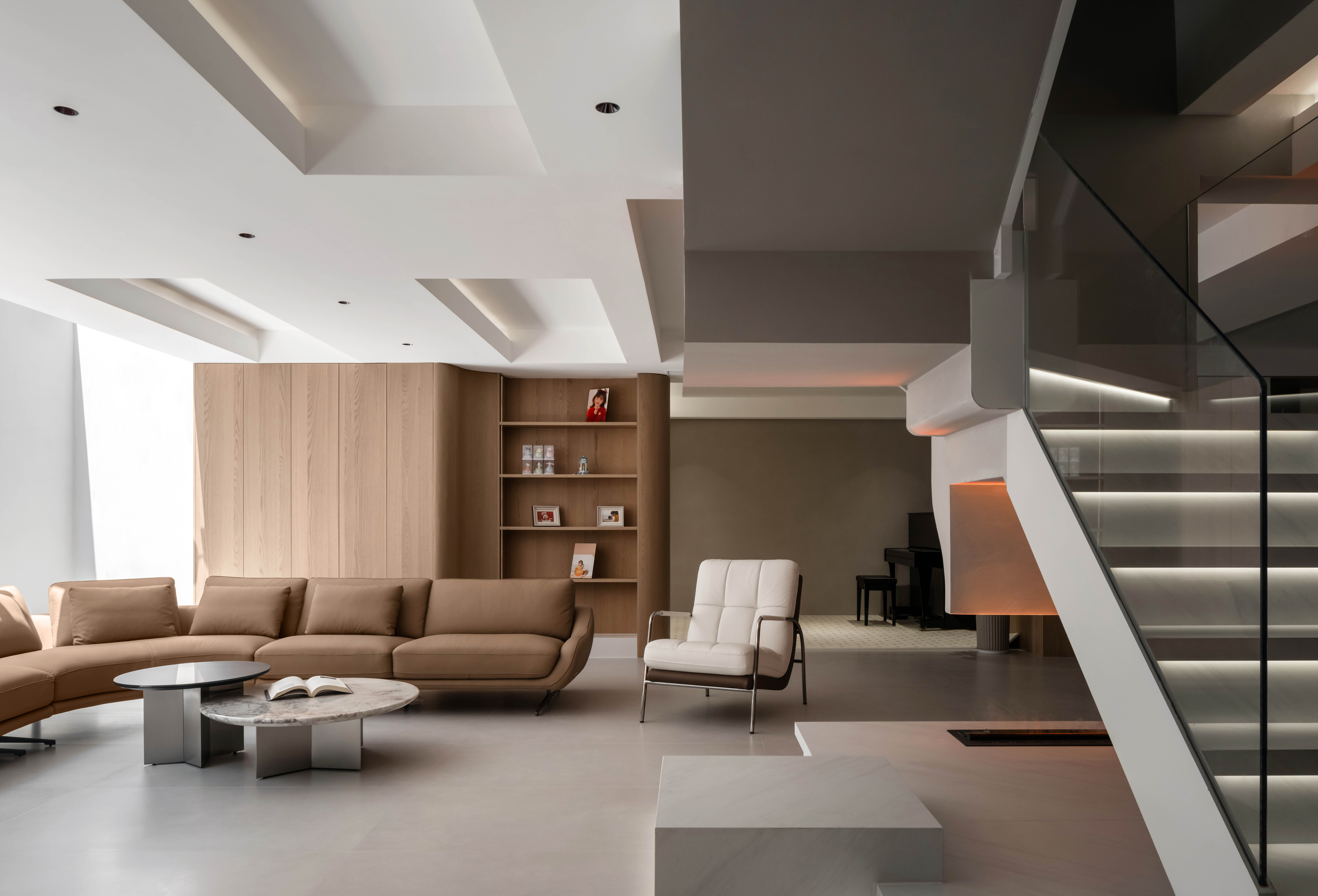 楼梯运用钢结构制作,可更加灵活塑造楼梯造型,下方悬空,有悬浮感,搭配超白玻璃扶手,增加通透性。利用楼梯下方开敞空间设计曲线壁炉造型,增加设计感的同时也让空间更有温度,使人与人在空间的交互更加生动。