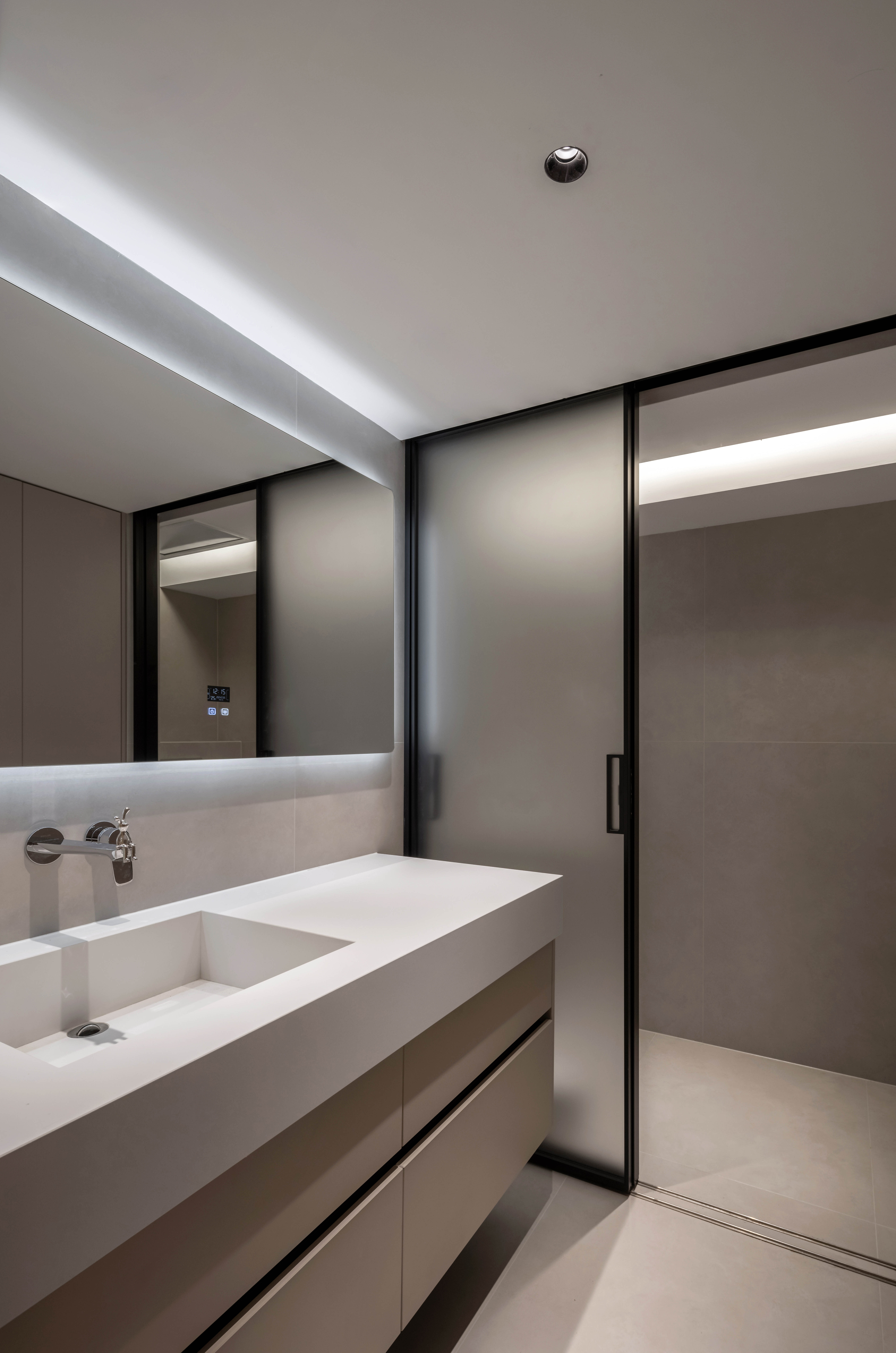 卫生间与书房相邻,采用隐形门的形式进入,从外部看不影响整体美观。一体台盆的设计搭配灯光,更具质感。入墙式龙头增加高级感的同时,也方便台面清洗。