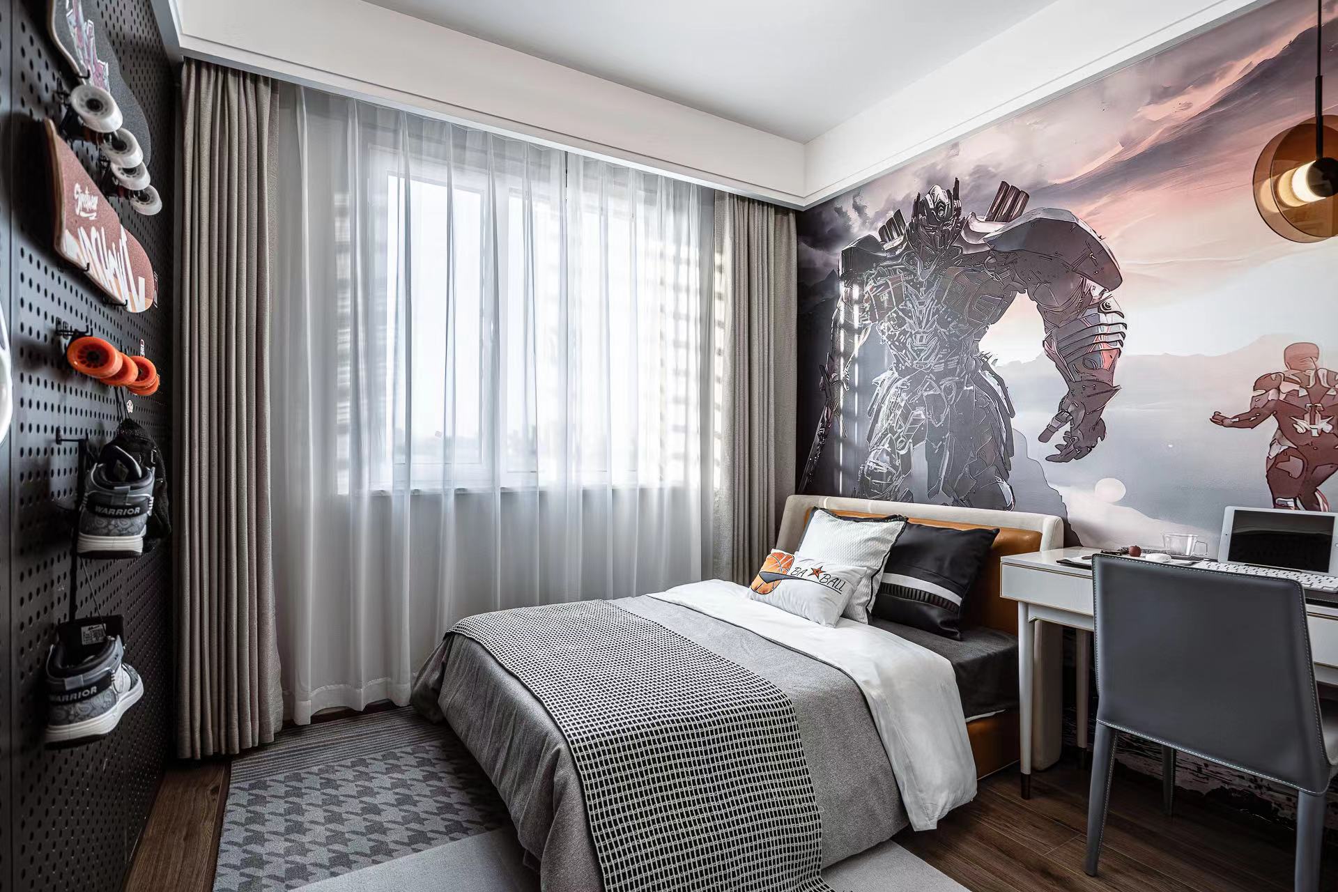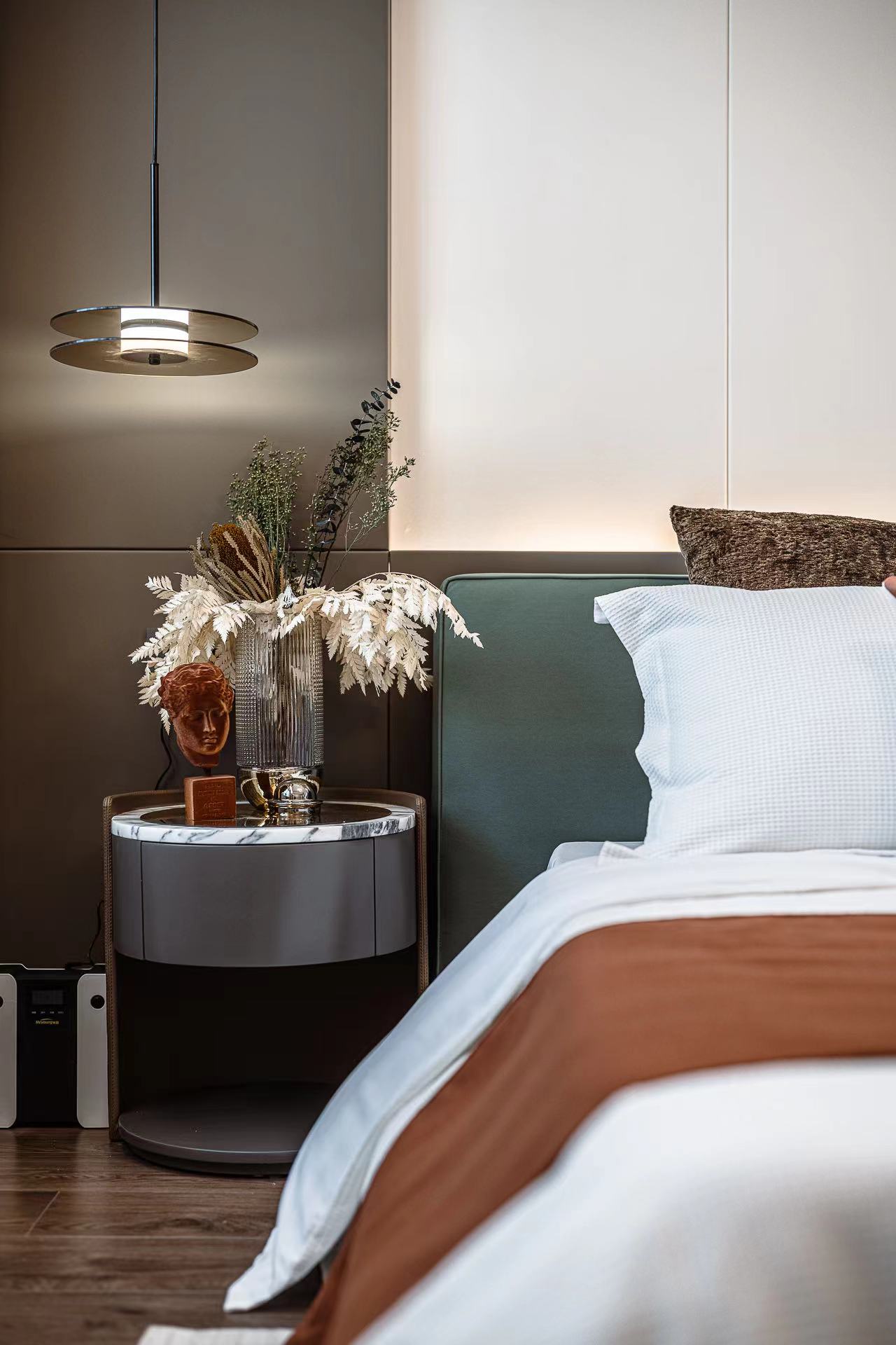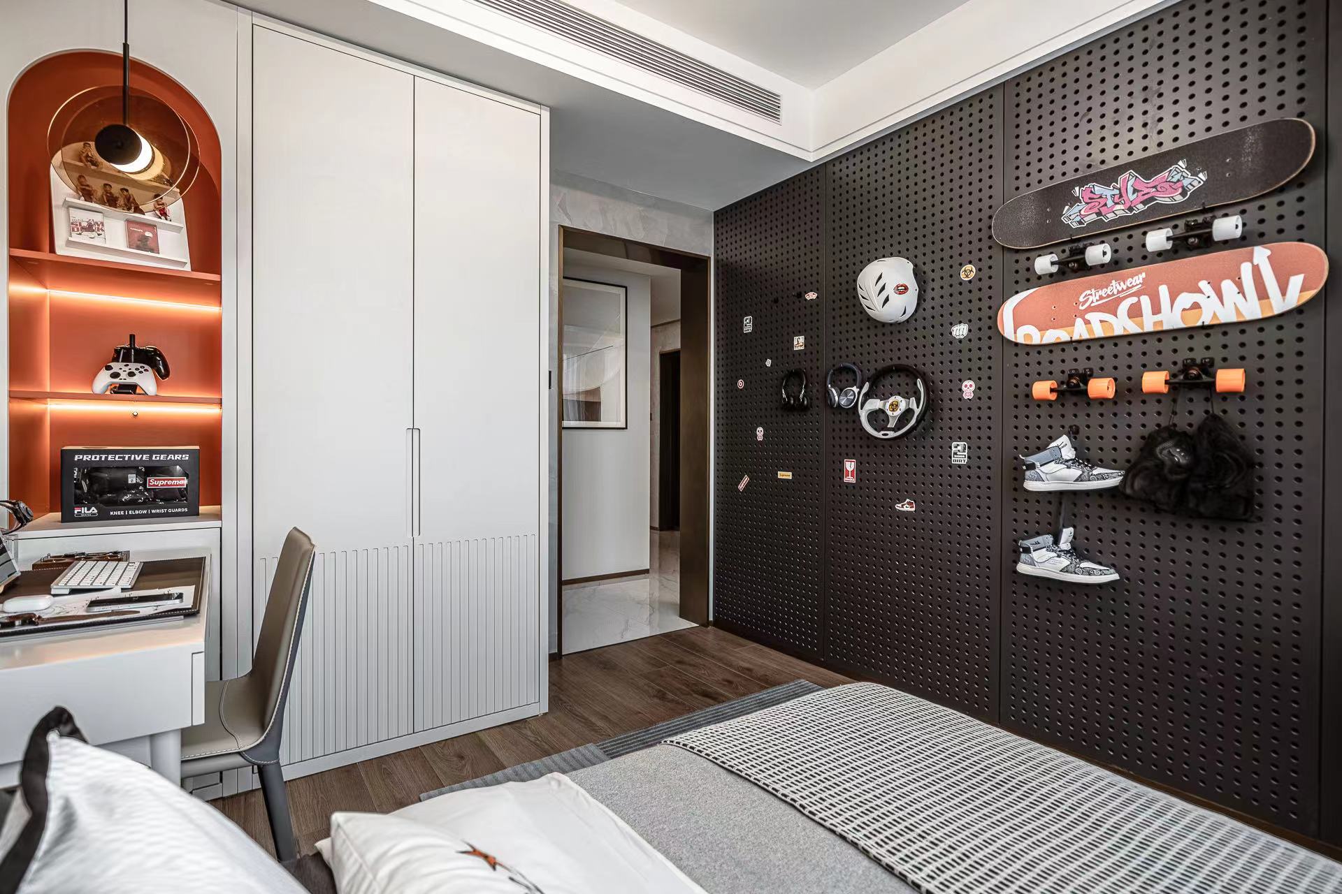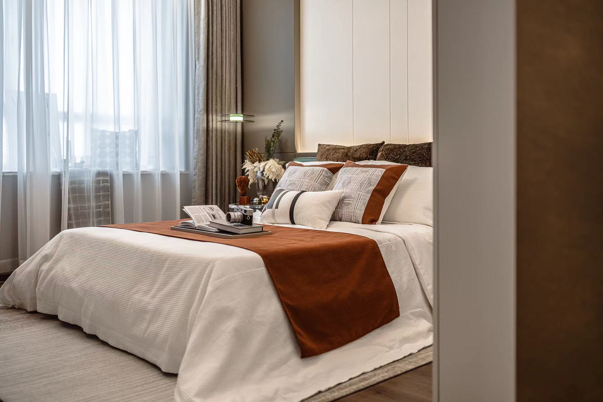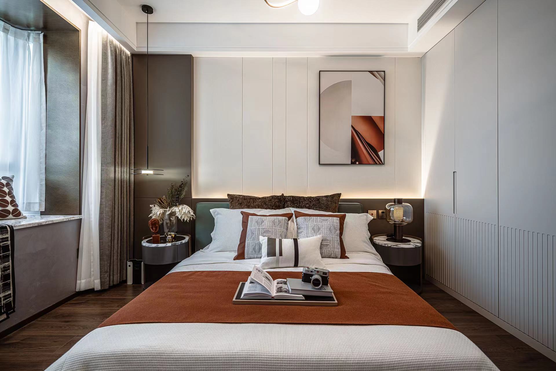 卧室注重舒适性,柔软的床品搭配温馨的灯光,营造出宁静的睡眠环境。背景墙采用独特的纹理设计,增添艺术感。