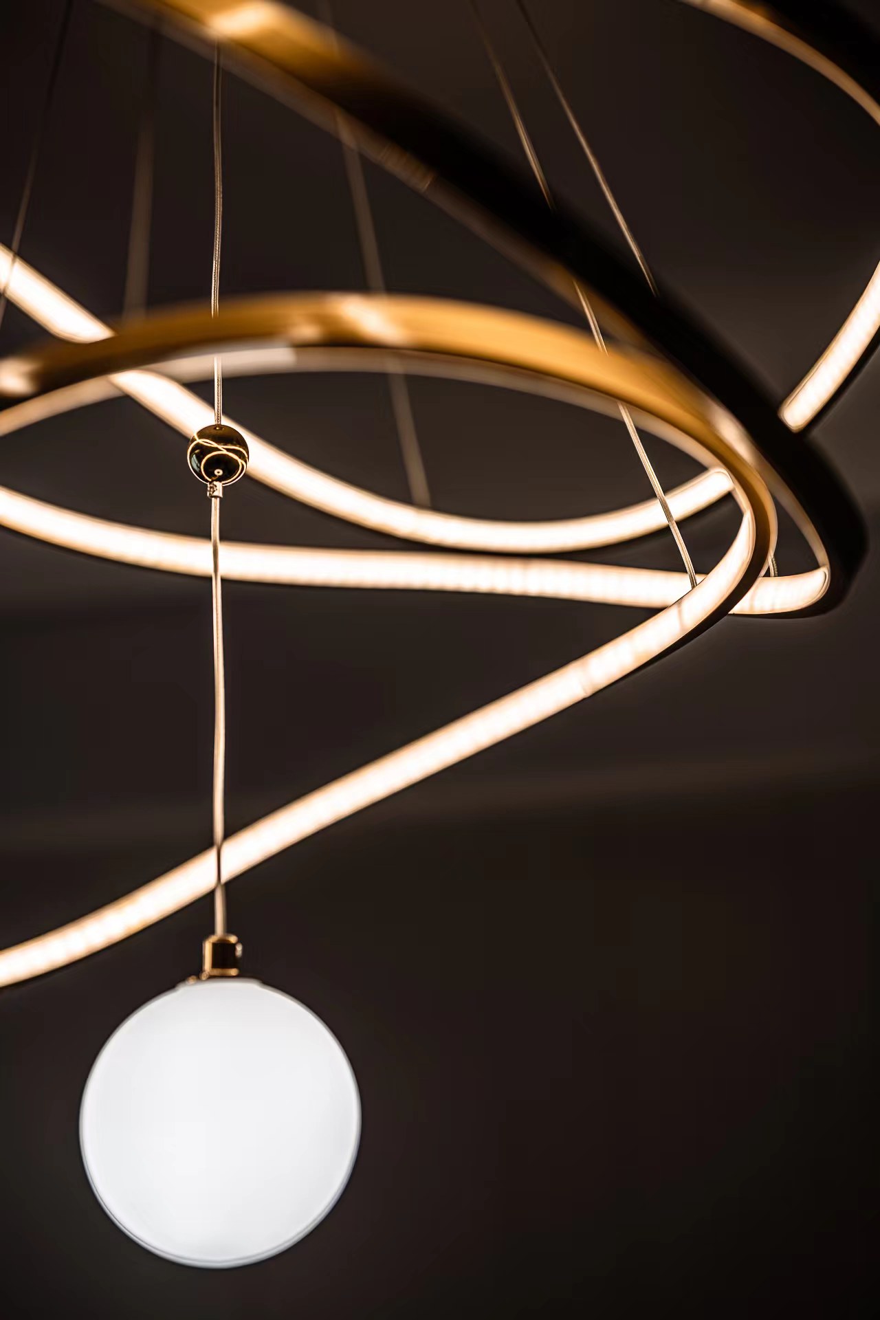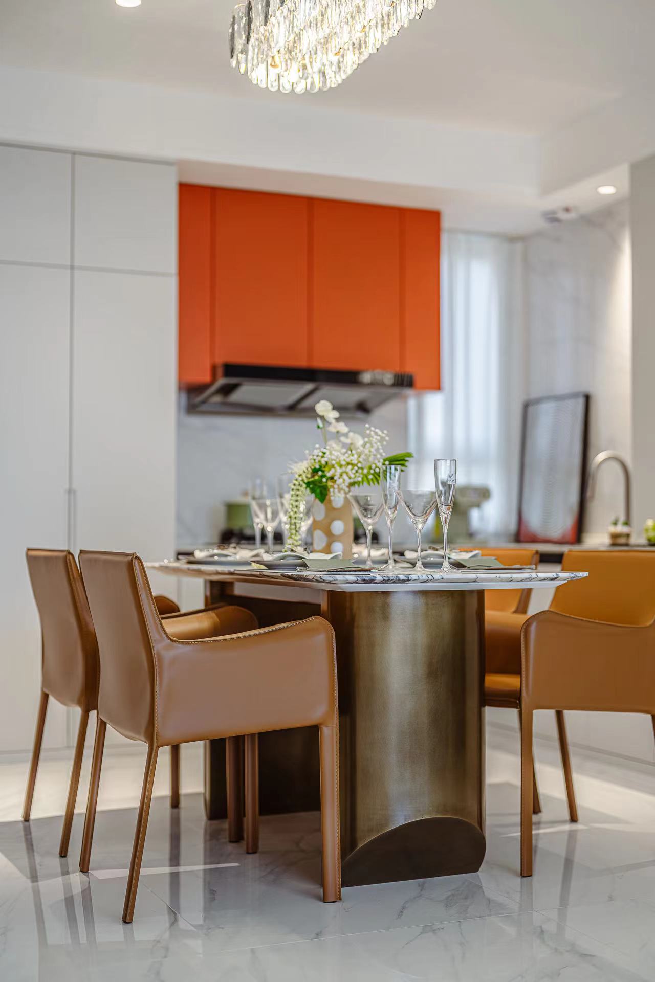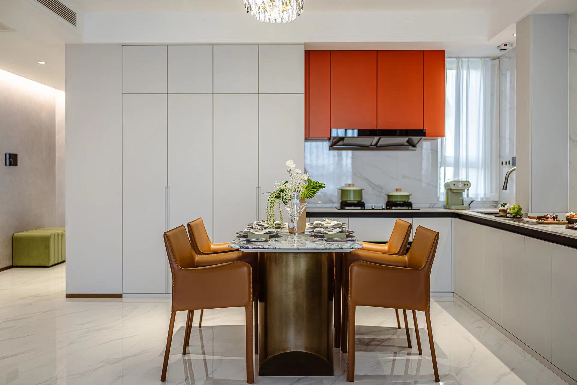 餐厅区域,精致的吊灯与简约的餐桌椅组合,展现出独特的品味。开放式厨房,配备高端的电器设备,兼具美观与实用。