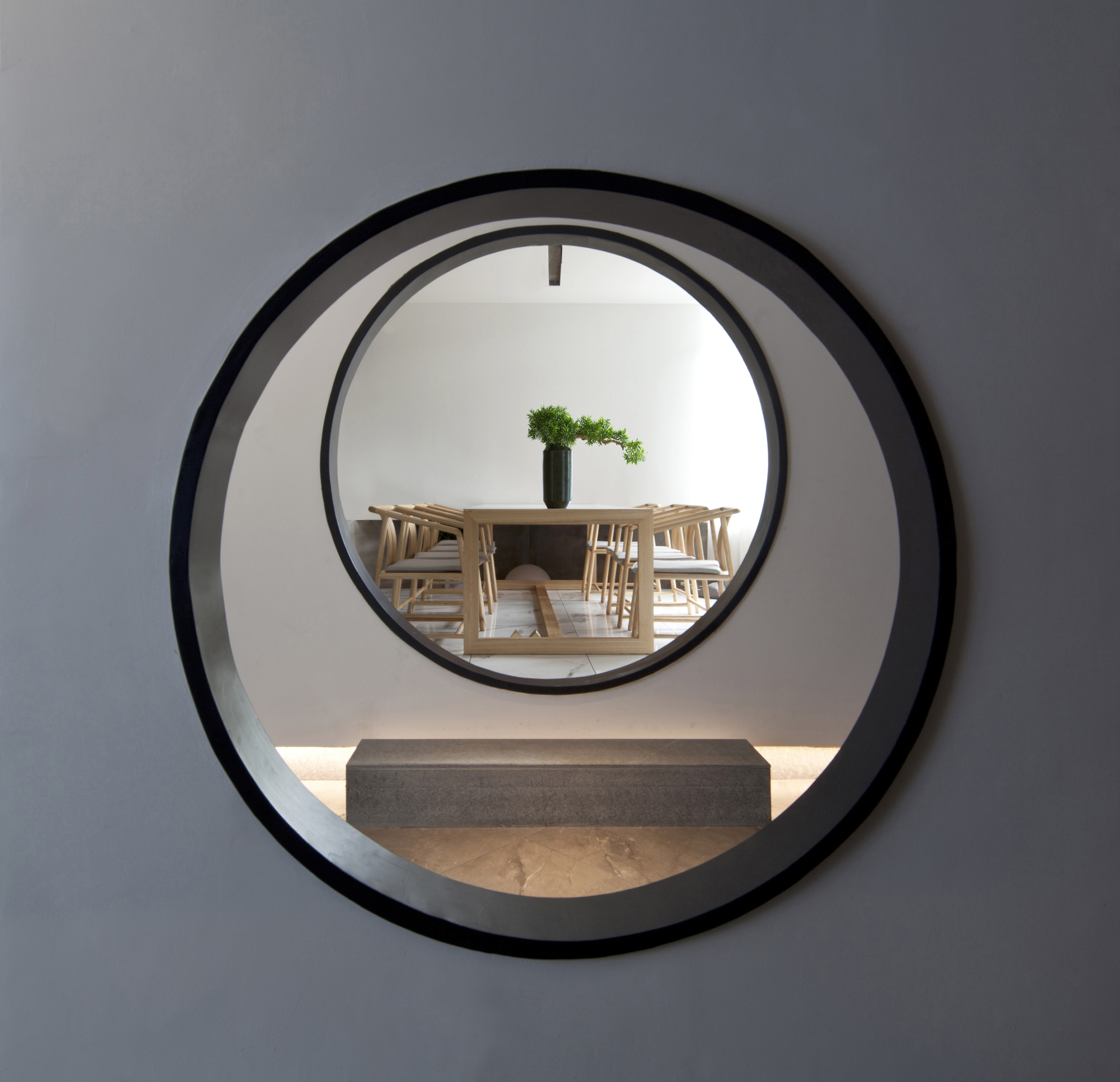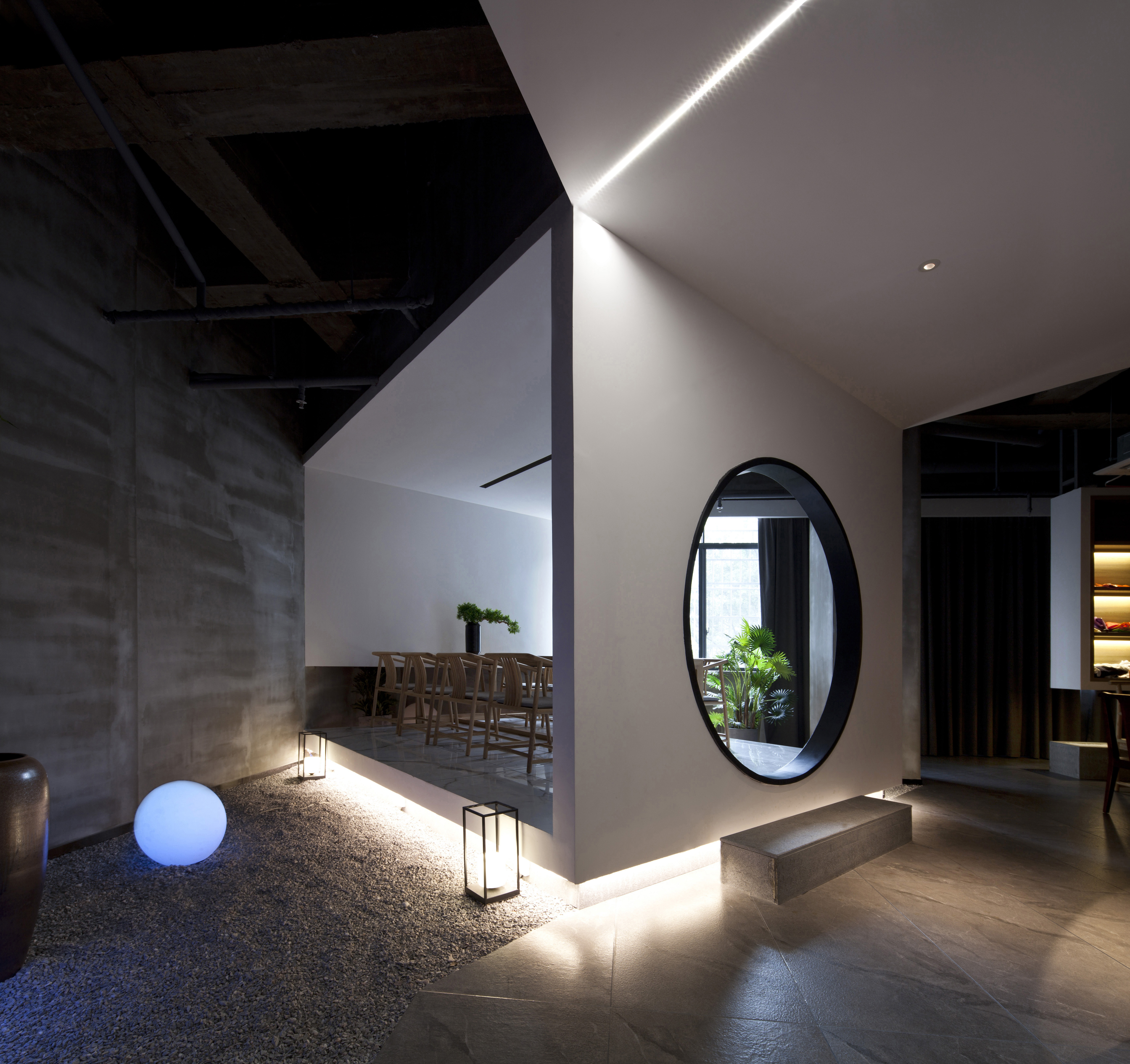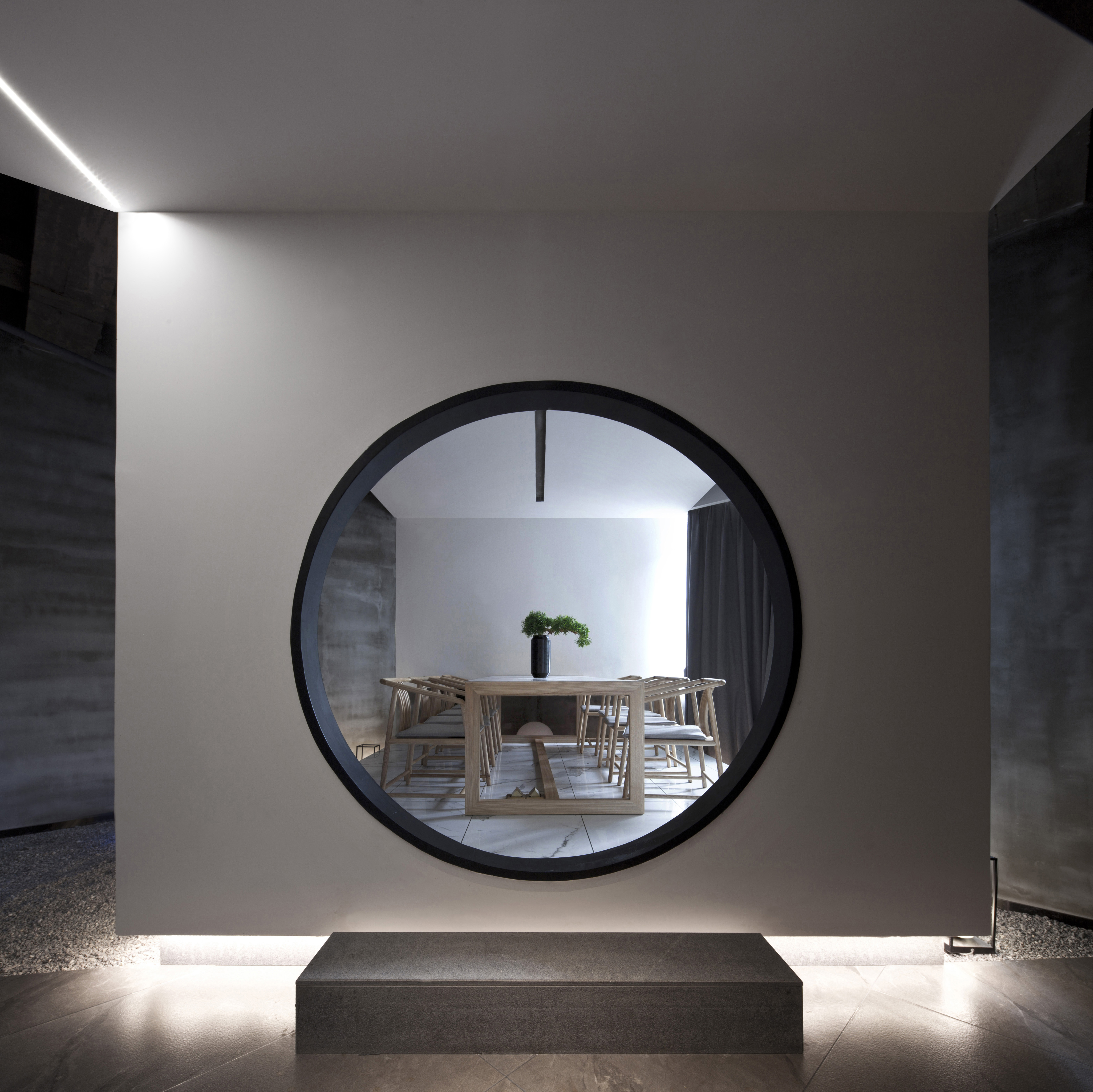 方案汇报室:钻石形状的方案汇报室抬高300MM,尊贵无比,跨过中国传统建筑元素“框景”的圆拱门洞,这里将是设计团队演绎设计理念的舞台。