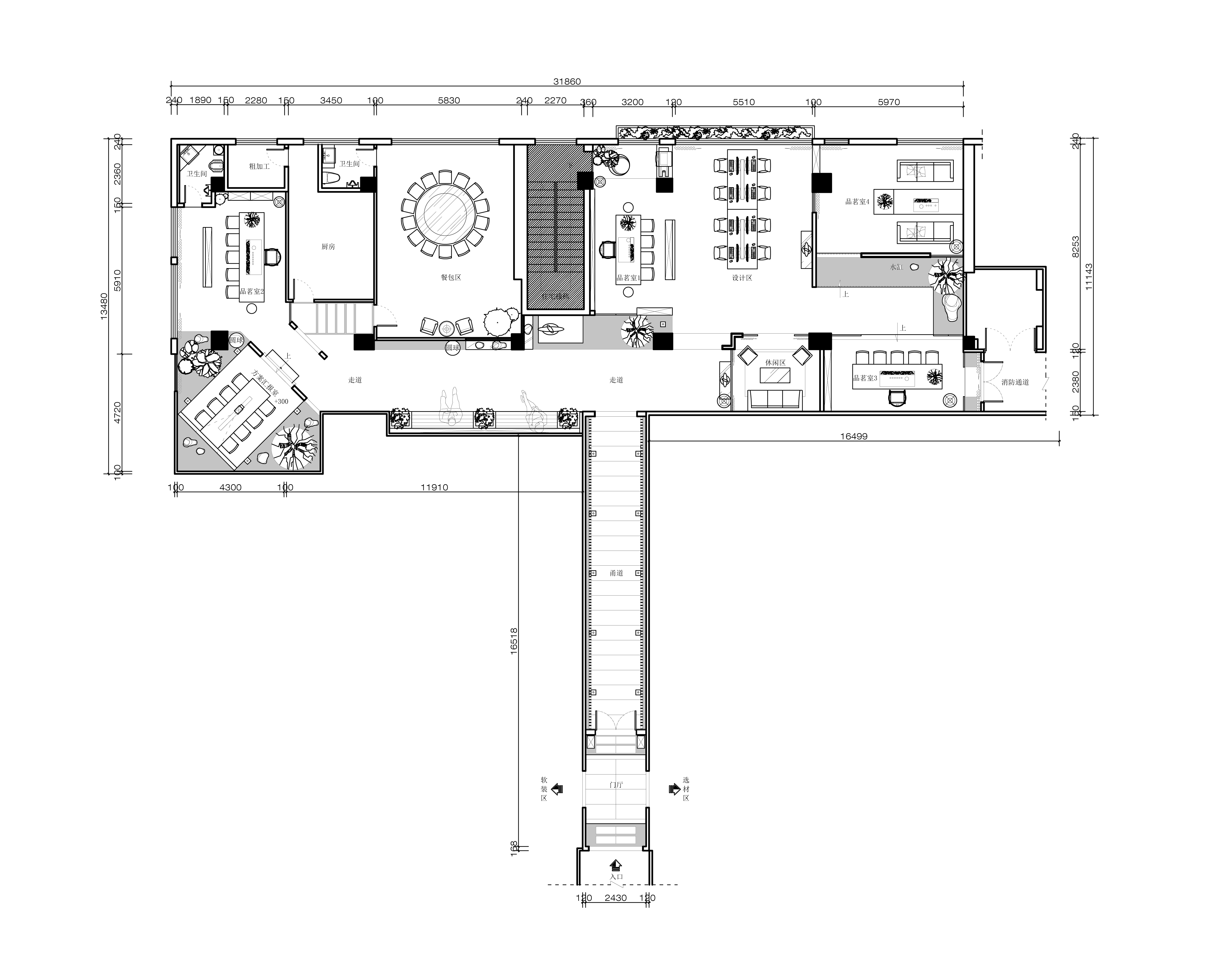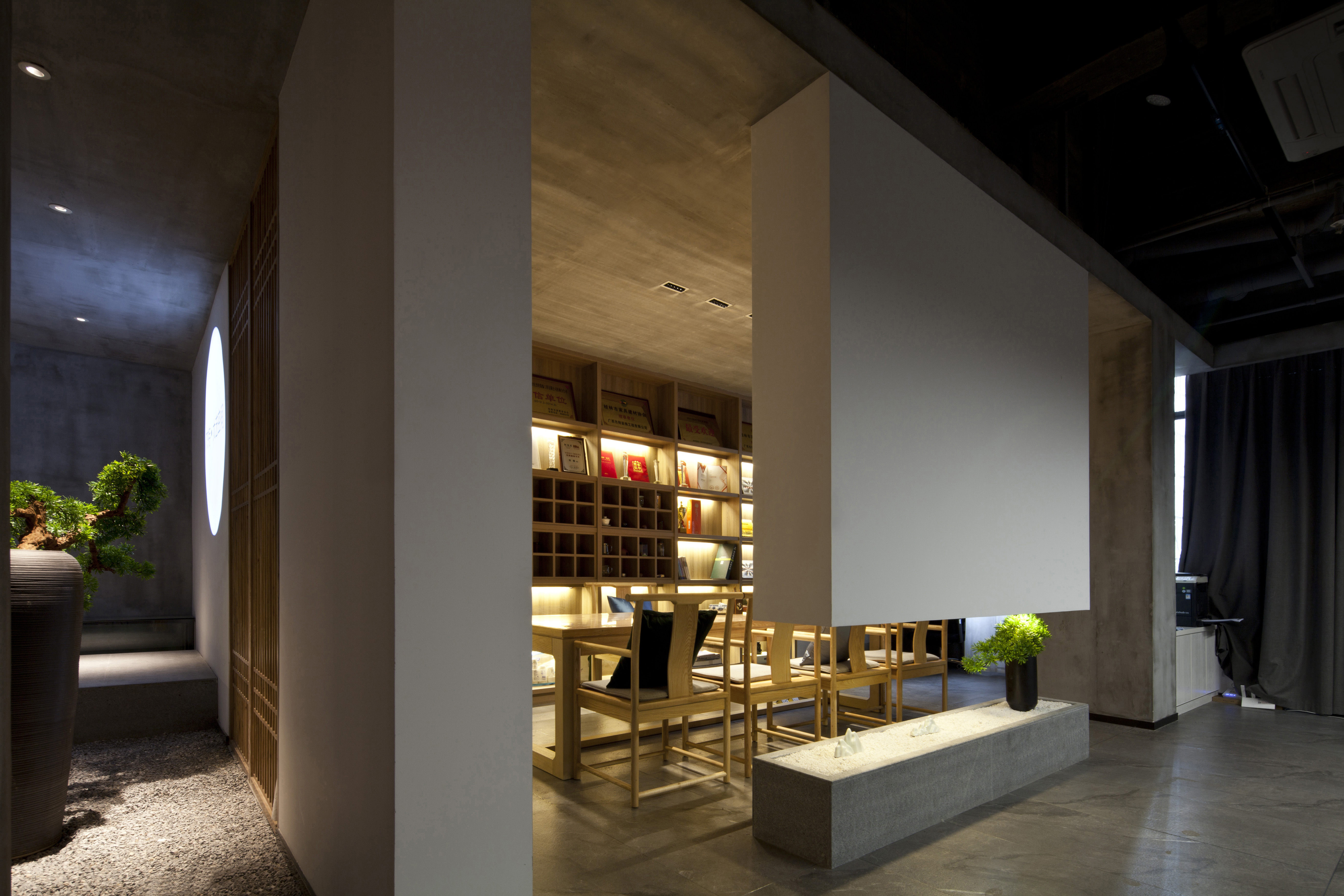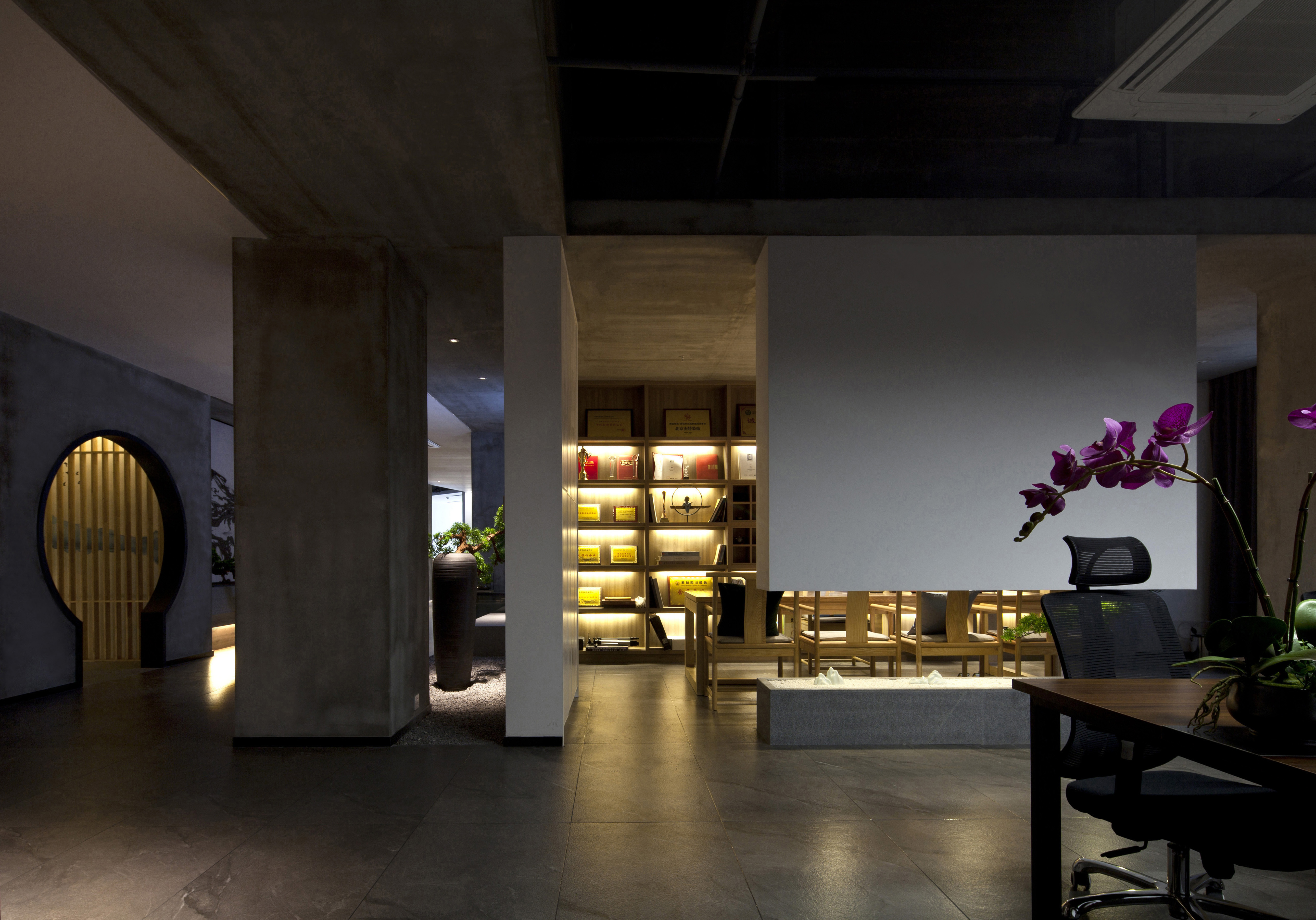 走道、开放办公区、品茗室:犹抱琵琶半遮面,隔而不断,保证品茗区的私密性。