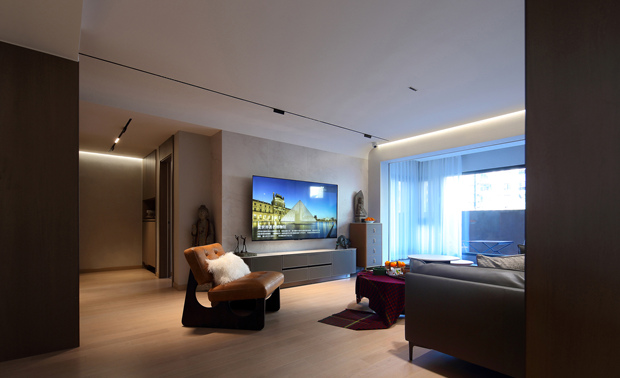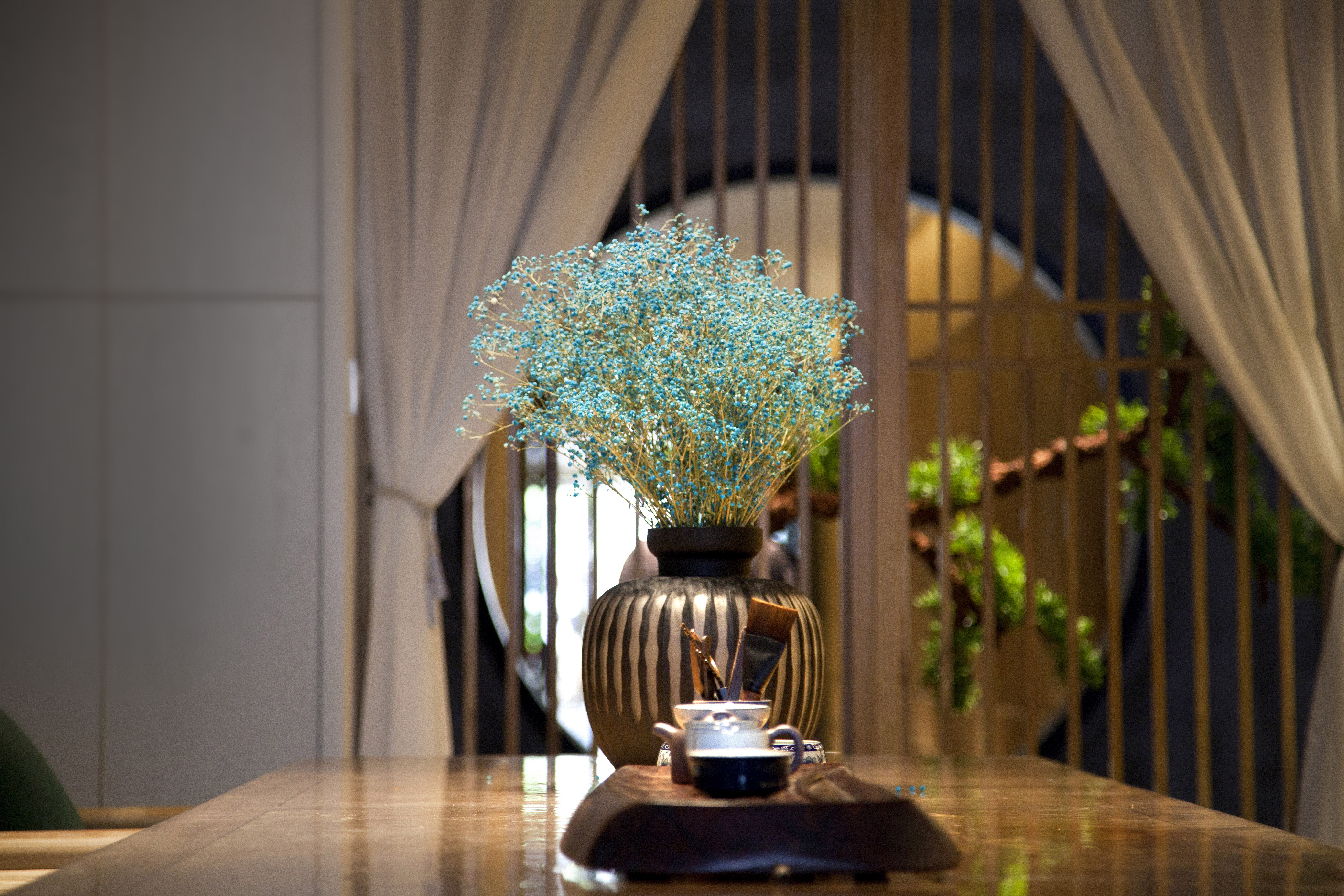 空间布局:空间划分上,运用了中国文化的“隔”、“障”、“框”、“透”等手法来分隔组合空间,同时紧密结合功能需求进行分区,整体视觉流畅,半遮半掩隔而不断,避免了空间设计中的死角区域,保证空间之间的通透性和独立性以及连贯性,犹抱琵琶半遮面,提炼后的中式传统元素为空间增添些许文化意蕴和趣味,禅意无边。
