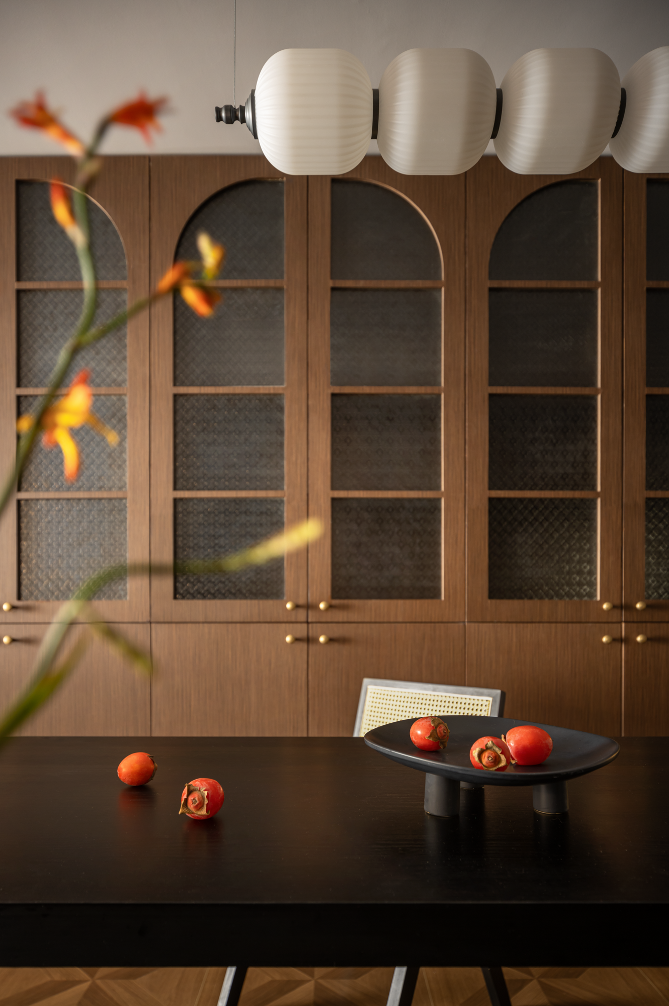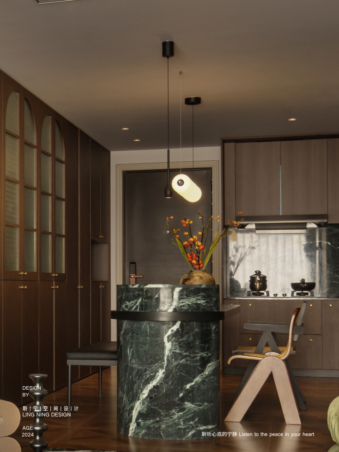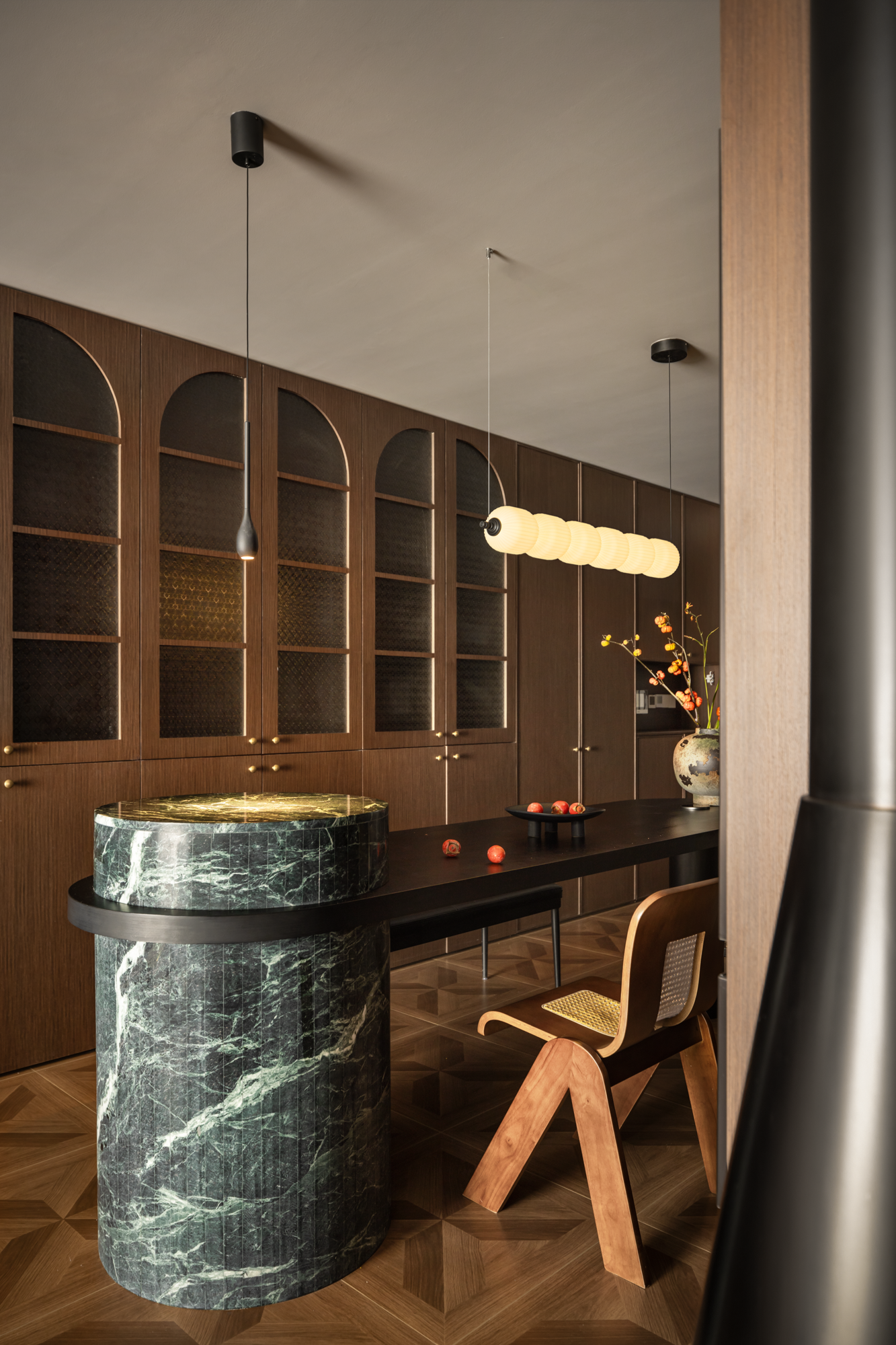选择了胡桃木与复古的艺术玻璃作为主要中古氛围的基调,这不仅体现了自然材质的温暖质感,更是对追溯时光,文化底蕴的一种致敬。