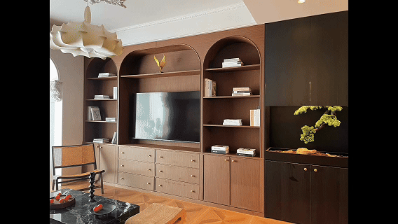 电视墙柜体不但大幅提升了收纳功能,而且有效地平衡了空间中的深色系色调。拱形弧度是经典的古风元素。