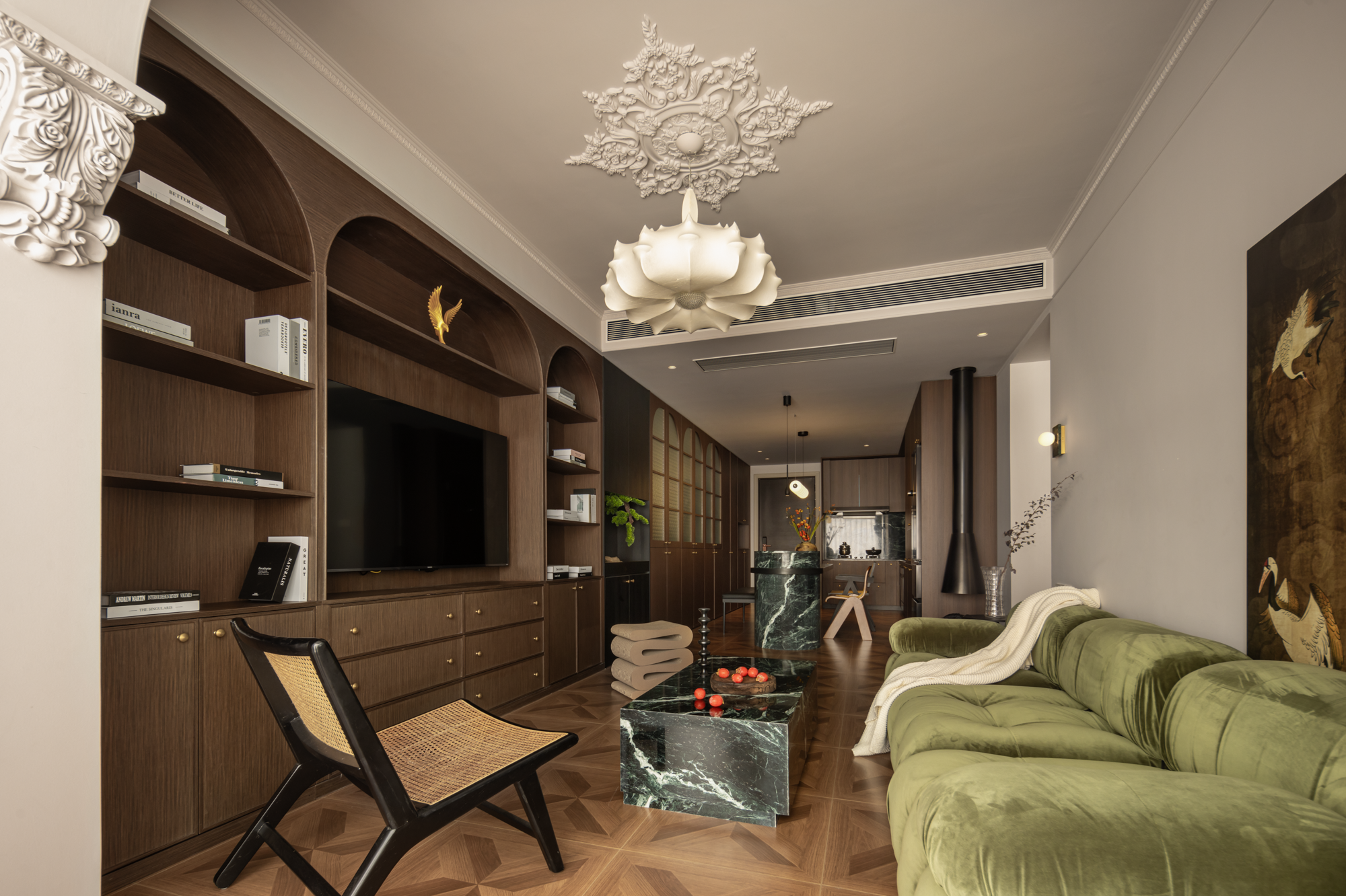 打破了传统的客厅文化,摈弃了传统电视柜的布局,用中古的开放式书柜十电视柜,其独特的复古韵味和浓郁的文化气,它不仅仅是家具,更是一种情感的释出,一种生活的态度。